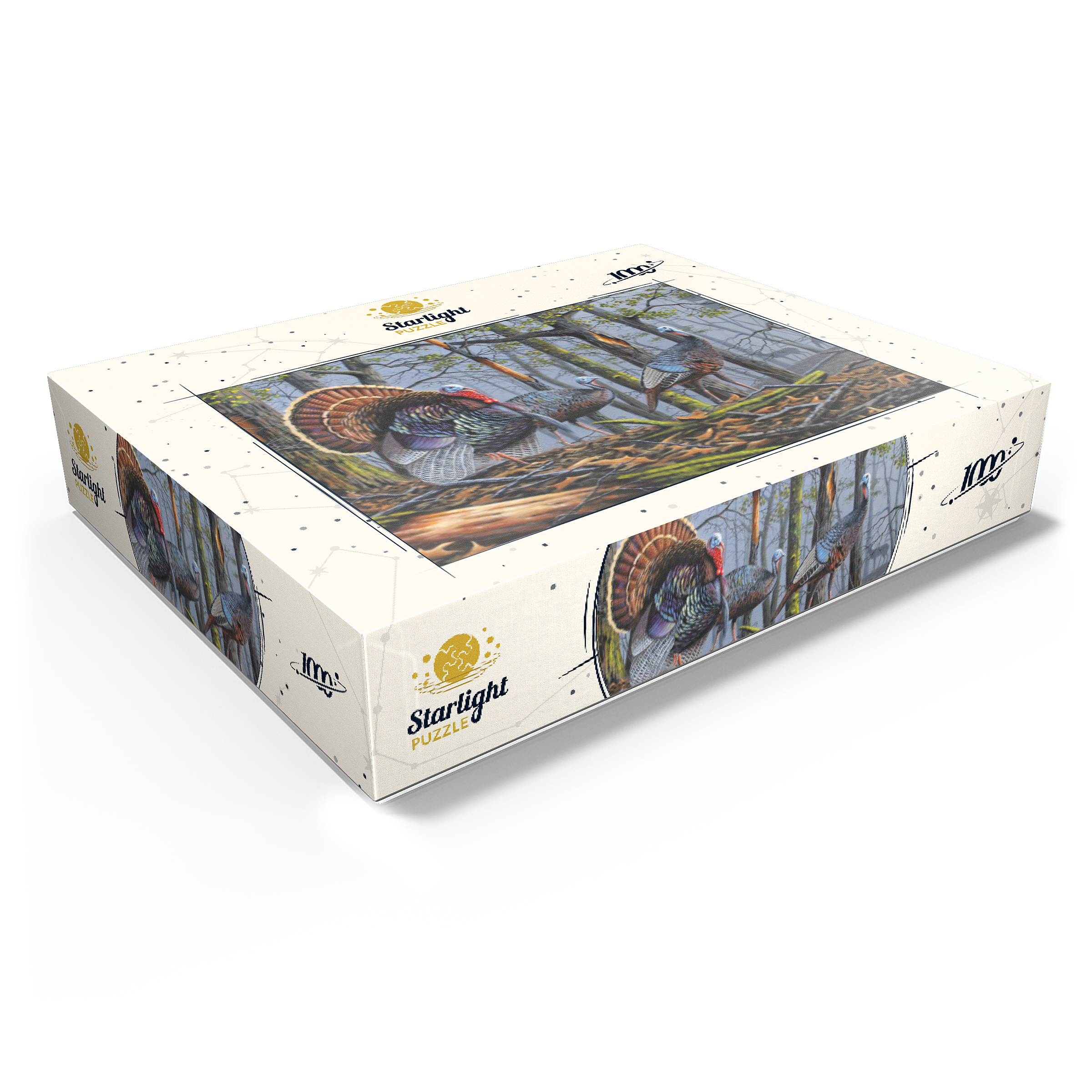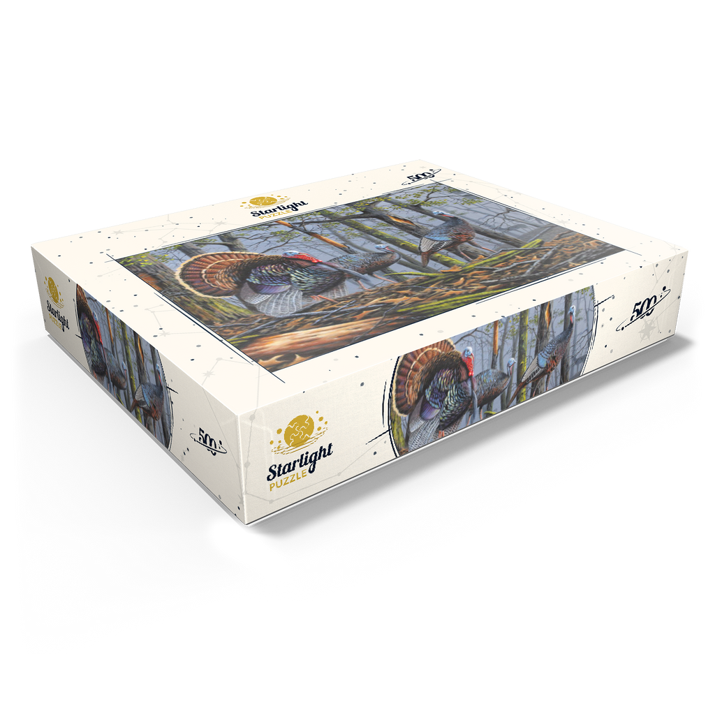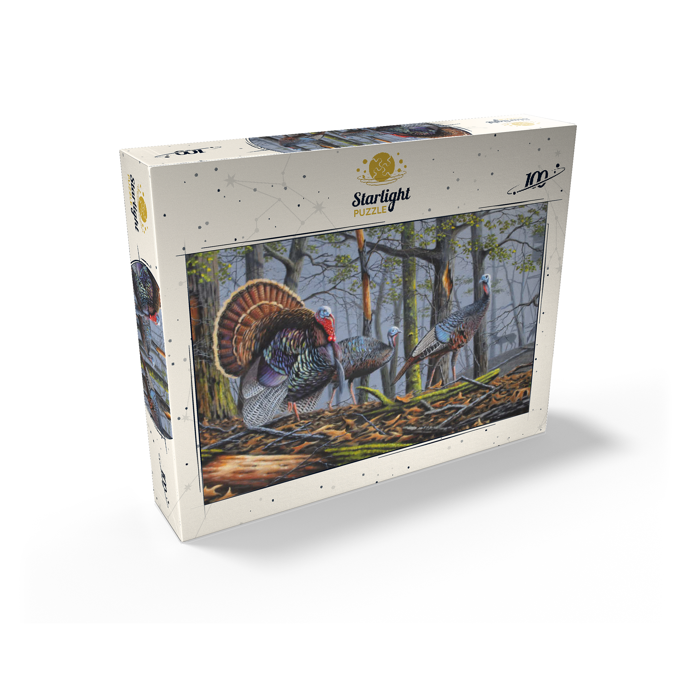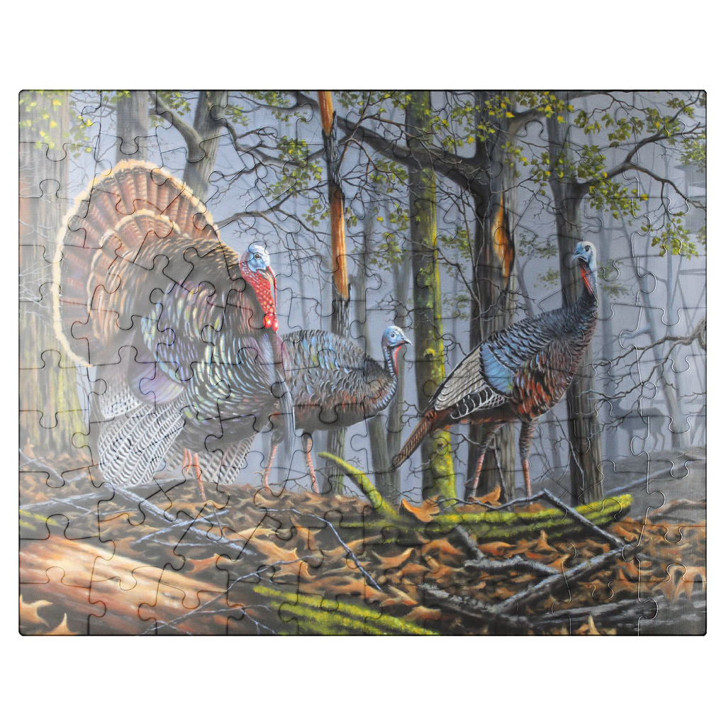 This vibrant forest scene captures a group of Wild Eastern Turkeys (Meleagris gallopavo silvestris) in their natural habitat on a misty morning. The dominant tom displays his iridescent plumage with pride, while two hens forage nearby among fallen leaves and moss-covered logs. Bare trees rise from the forest floor, their silhouettes blending into the foggy backdrop, where distant deer and a hunting stand subtly emerge. The setting evokes the quiet beauty of North American hardwood forests in late fall, showcasing the turkey's natural behavior and environment with striking detail.