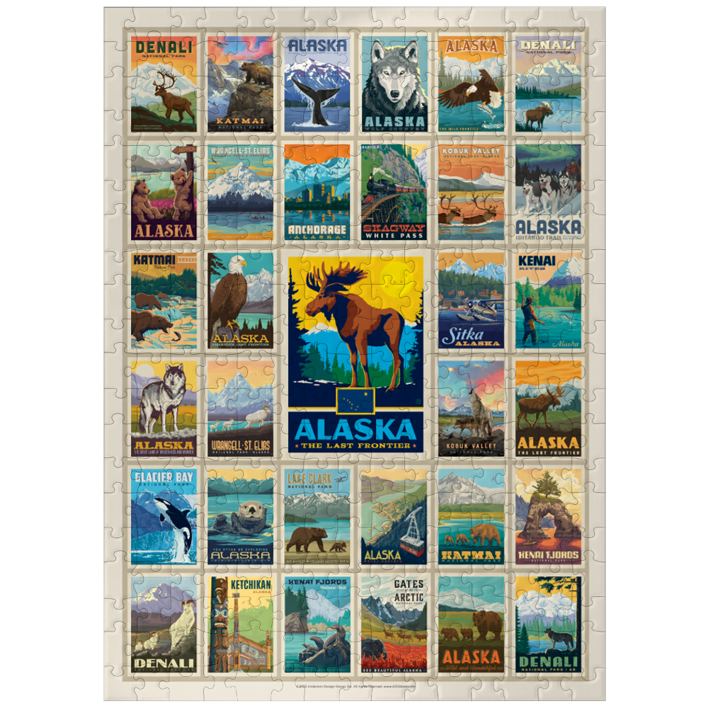 Anderson Design Group has gathered 33 of the most popular Alaska poster designs to celebrate the unparalleled beauty and wildness of the -Last Frontier-, each capturing the breathtaking scenery and unique character of this remarkable state.
