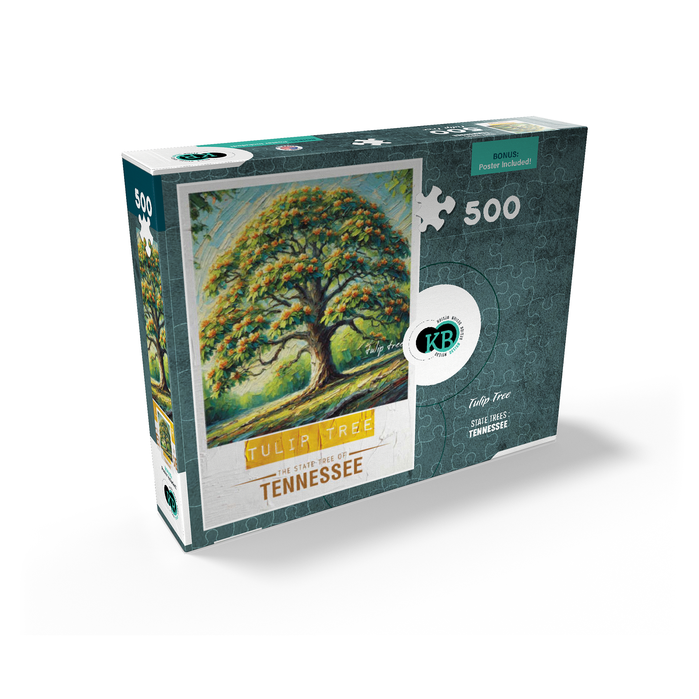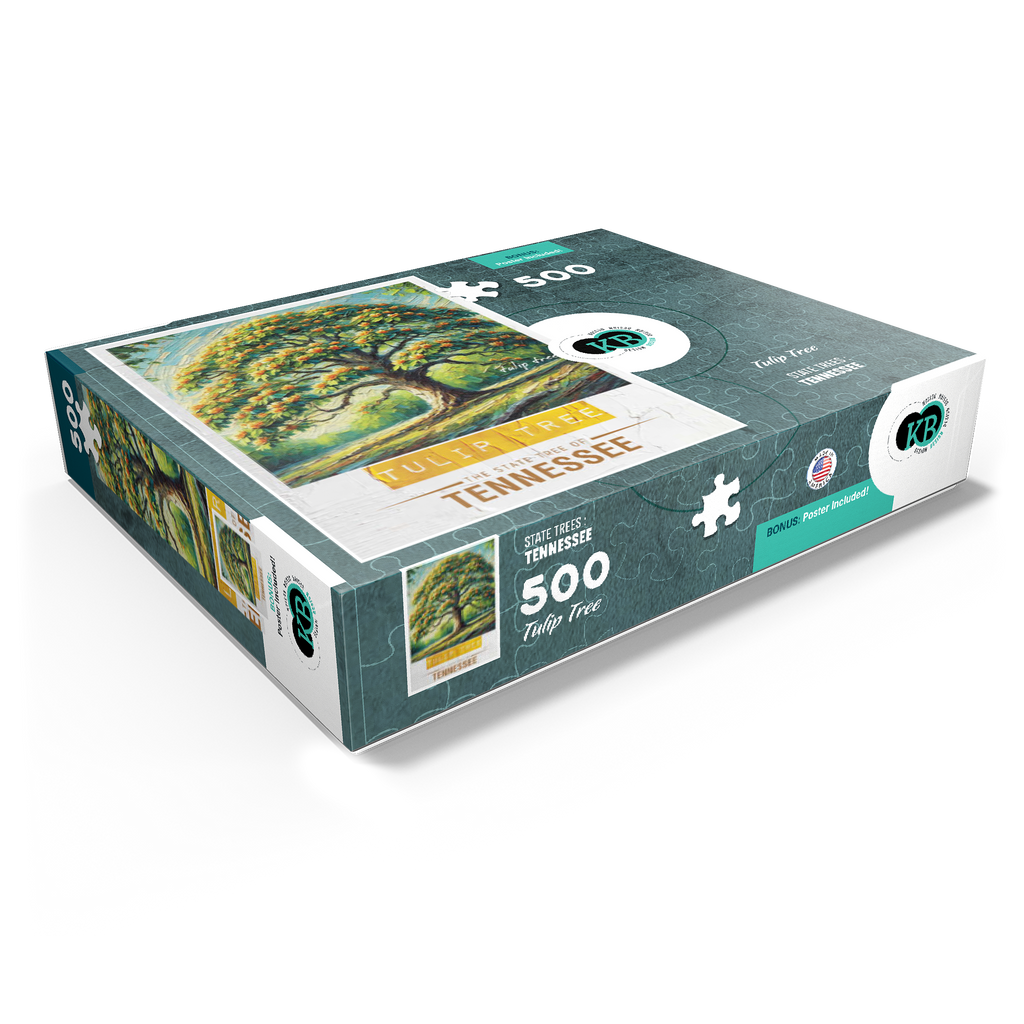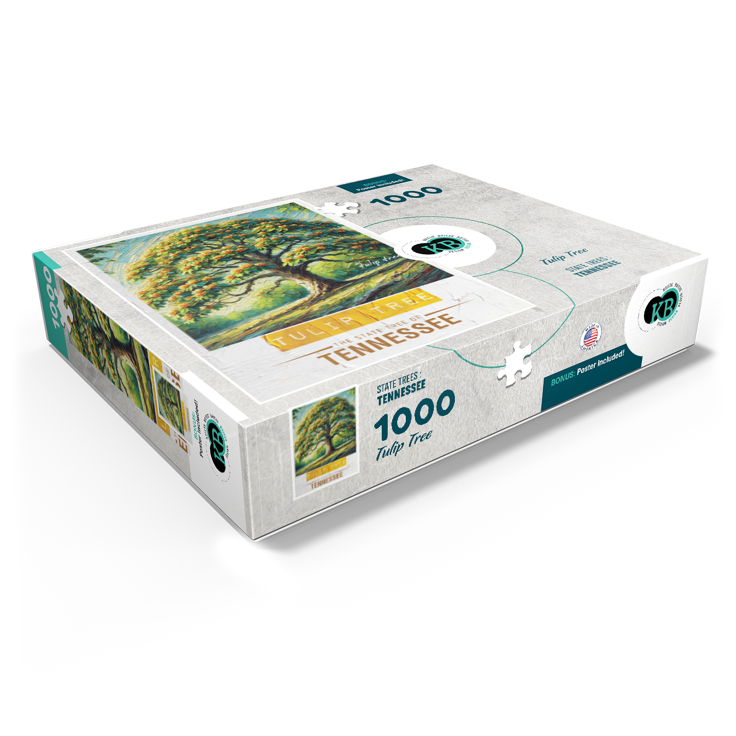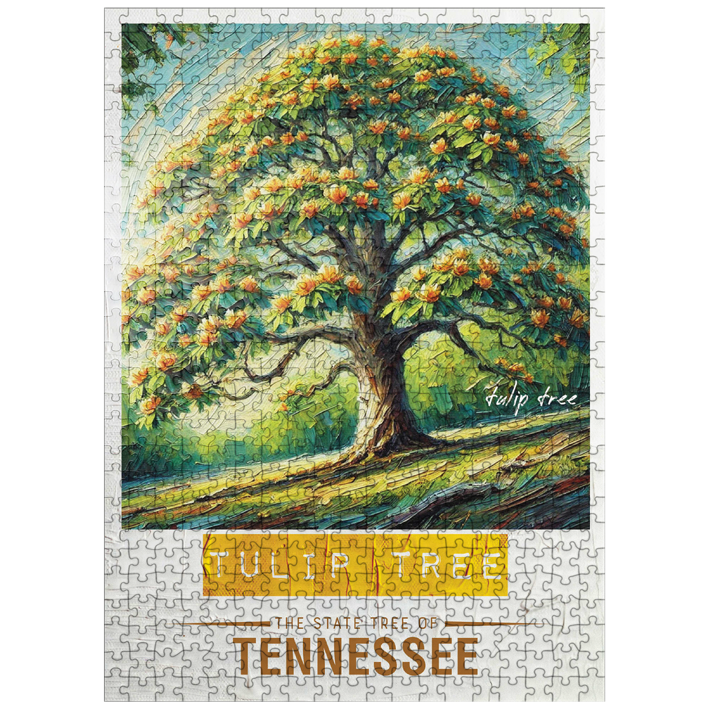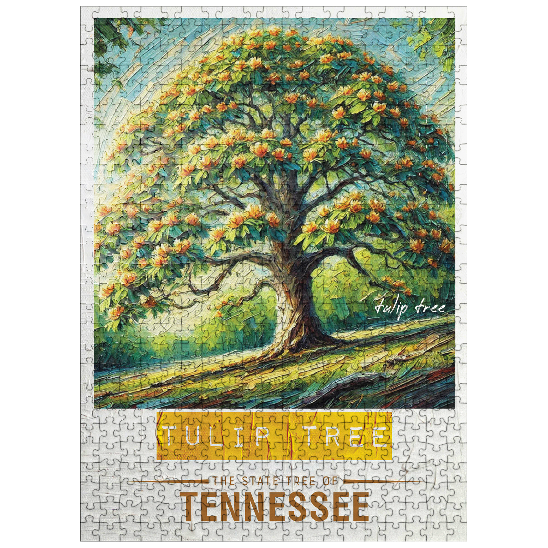 The state tree of Tennessee is the tulip tree (Liriodendron tulipifera), also known as the tulip poplar, designated in 1947. This tall, fast-growing tree is known for its distinctive tulip-shaped flowers, which bloom in late spring with yellow and orange petals. Its strong, lightweight wood was historically used by pioneers for building log cabins and canoes. The tulip tree thrives throughout Tennessee, providing habitat for wildlife and adding beauty to the landscape. It symbolizes strength, resilience, and the state's rich natural heritage. The State Trees collection is a unique way to show your state pride! Choose your state, or pick your favorite tree from the collection and watch it come to life. This would make a great gift for a fellow out-of-state puzzle-lover. Go on an 'adventure across the country' and collect them all!