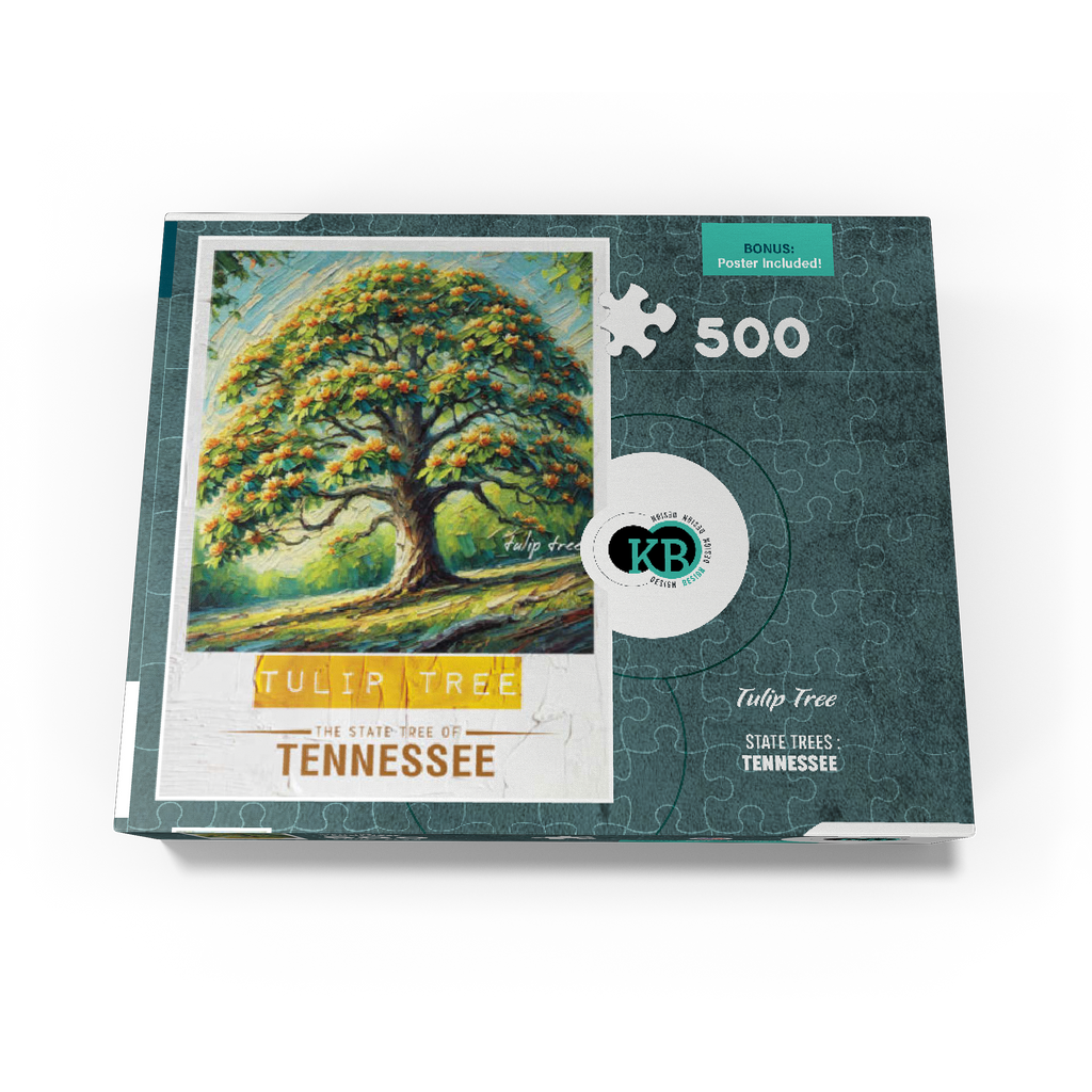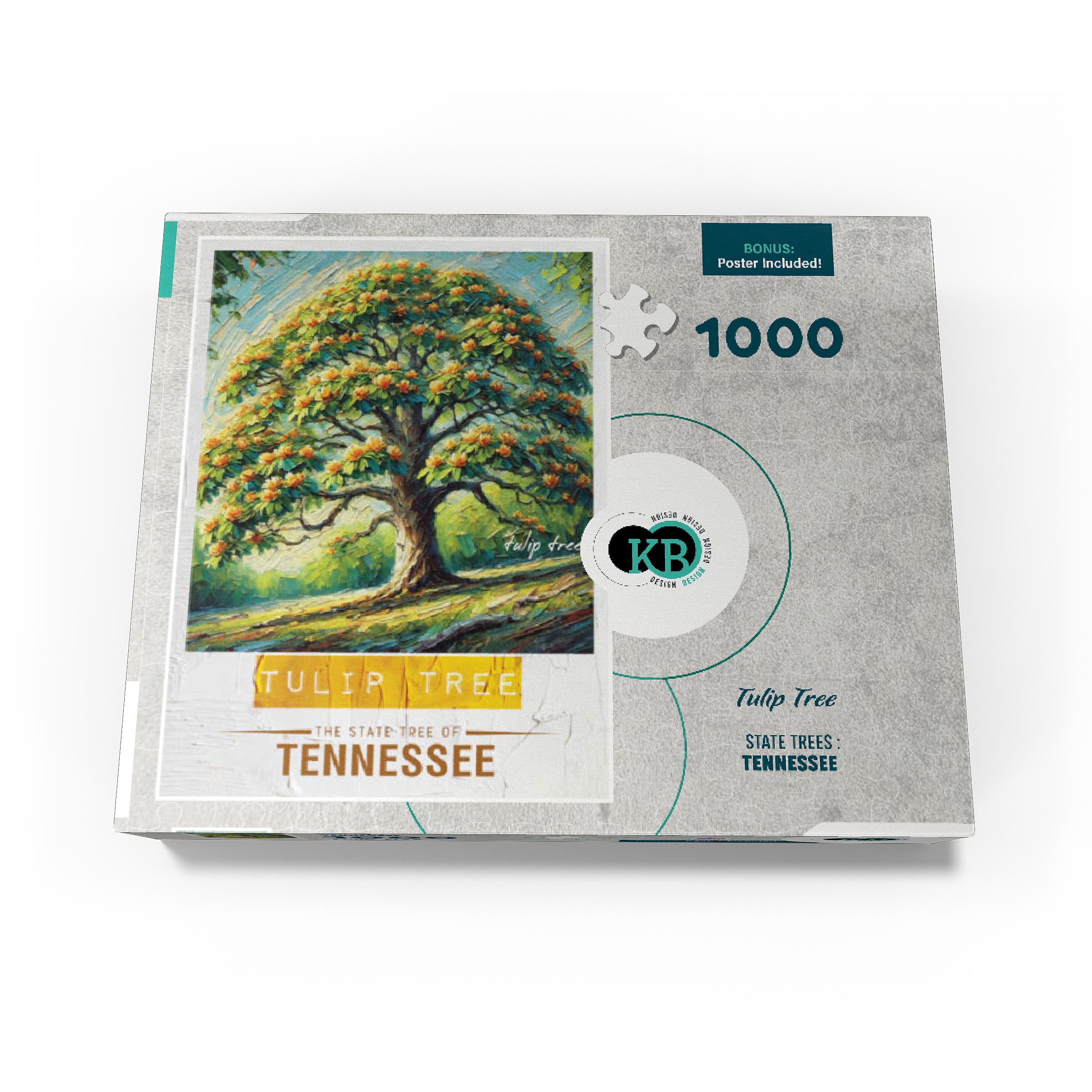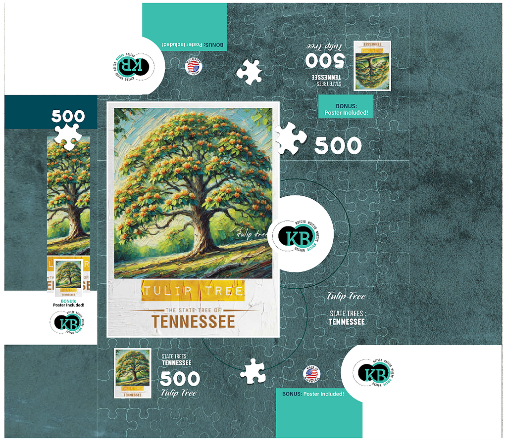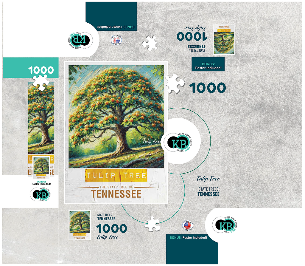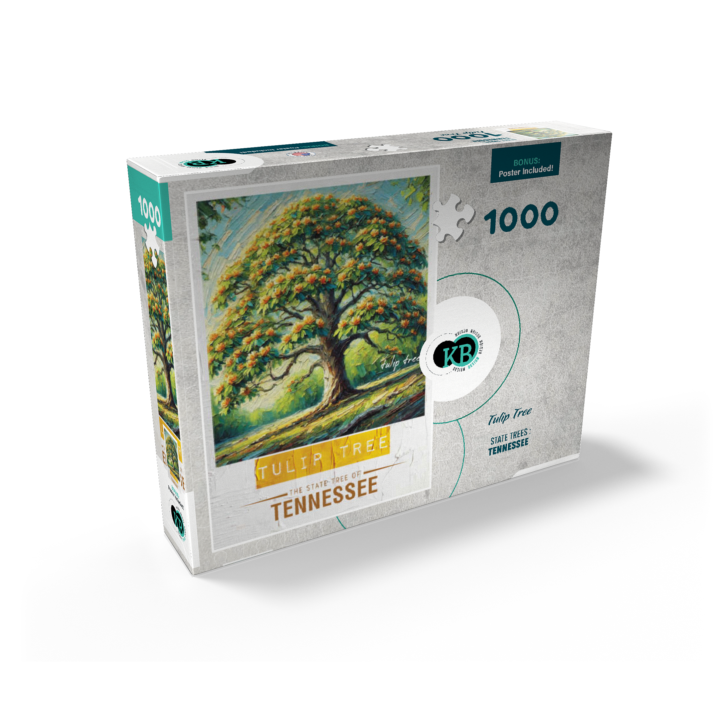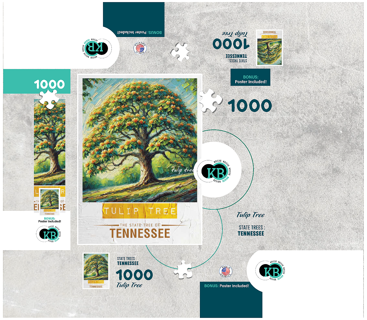 The state tree of Tennessee is the tulip tree (Liriodendron tulipifera), also known as the tulip poplar, designated in 1947. This tall, fast-growing tree is known for its distinctive tulip-shaped flowers, which bloom in late spring with yellow and orange petals. Its strong, lightweight wood was historically used by pioneers for building log cabins and canoes. The tulip tree thrives throughout Tennessee, providing habitat for wildlife and adding beauty to the landscape. It symbolizes strength, resilience, and the state's rich natural heritage. The State Trees collection is a unique way to show your state pride! Choose your state, or pick your favorite tree from the collection and watch it come to life. This would make a great gift for a fellow out-of-state puzzle-lover. Go on an 'adventure across the country' and collect them all!
