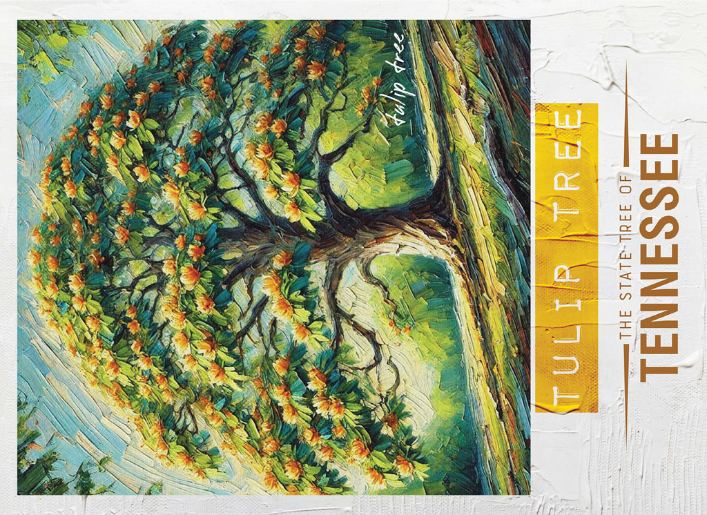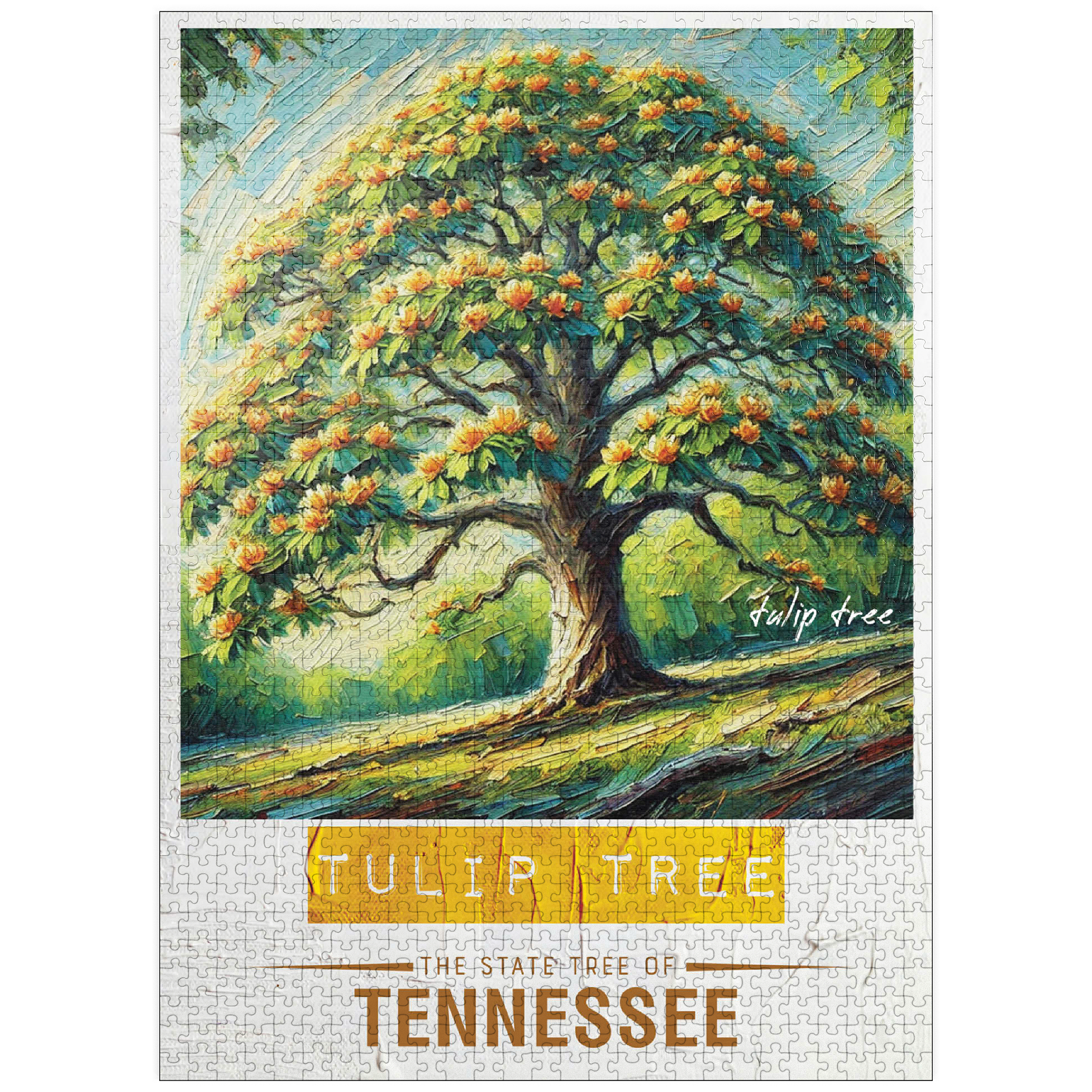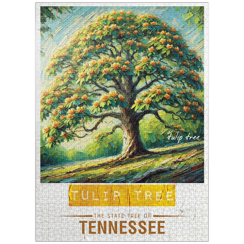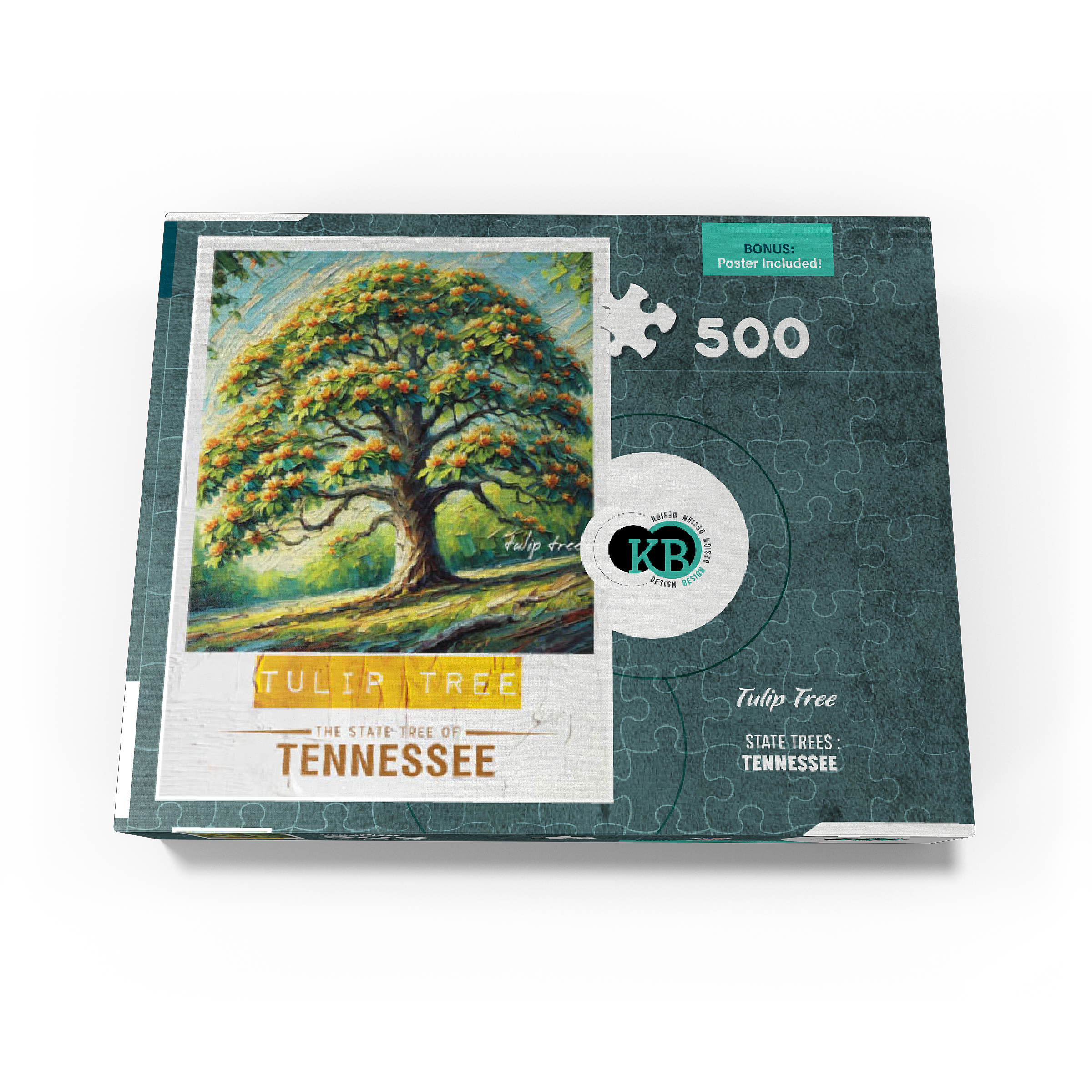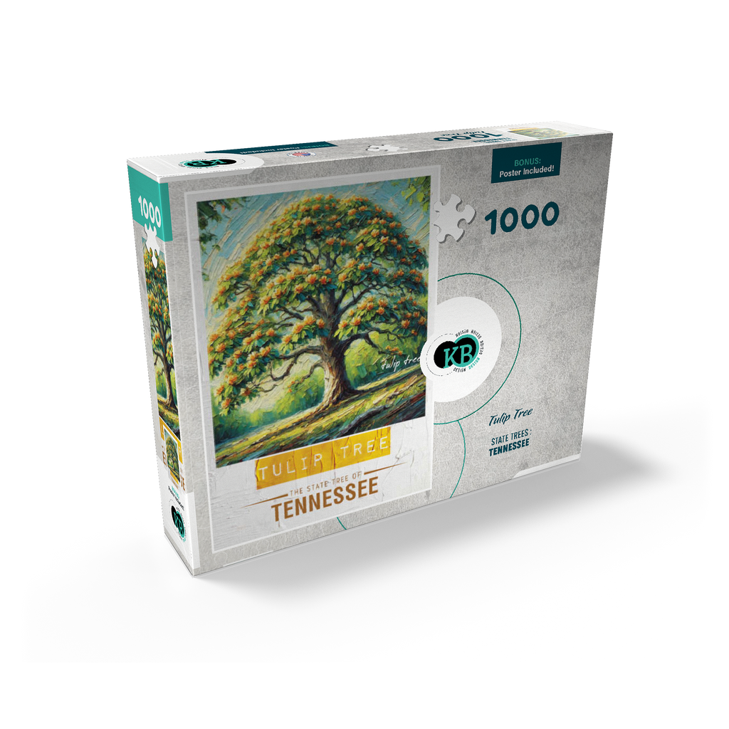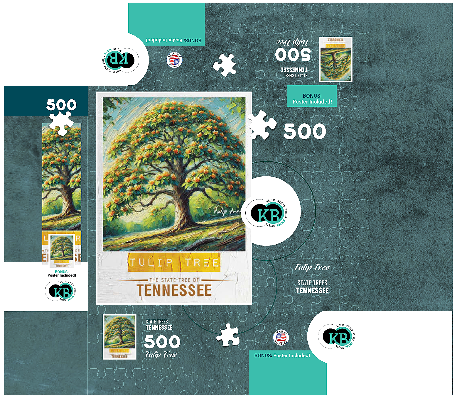 The state tree of Tennessee is the tulip tree (Liriodendron tulipifera), also known as the tulip poplar, designated in 1947. This tall, fast-growing tree is known for its distinctive tulip-shaped flowers, which bloom in late spring with yellow and orange petals. Its strong, lightweight wood was historically used by pioneers for building log cabins and canoes. The tulip tree thrives throughout Tennessee, providing habitat for wildlife and adding beauty to the landscape. It symbolizes strength, resilience, and the state's rich natural heritage. The State Trees collection is a unique way to show your state pride! Choose your state, or pick your favorite tree from the collection and watch it come to life. This would make a great gift for a fellow out-of-state puzzle-lover. Go on an 'adventure across the country' and collect them all!