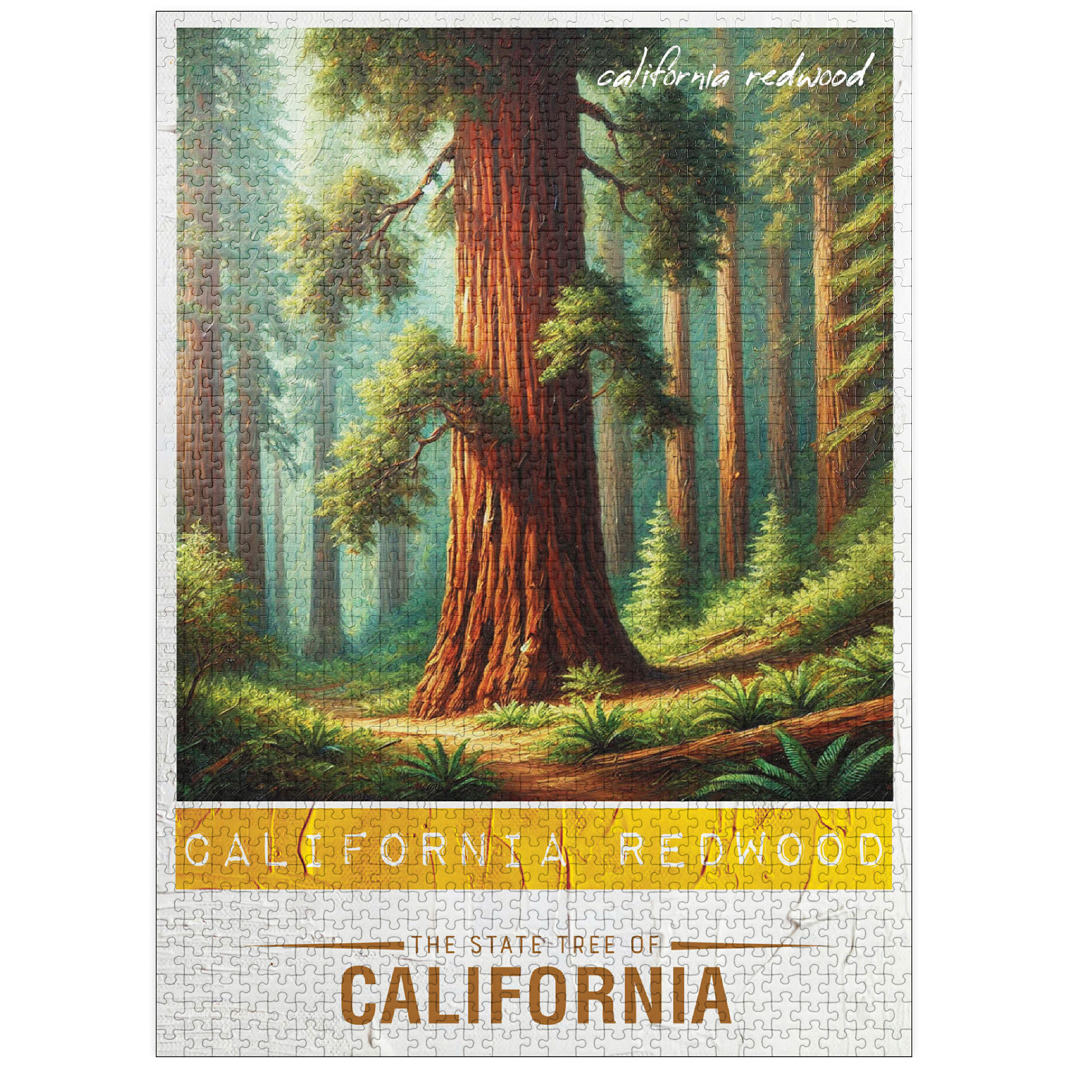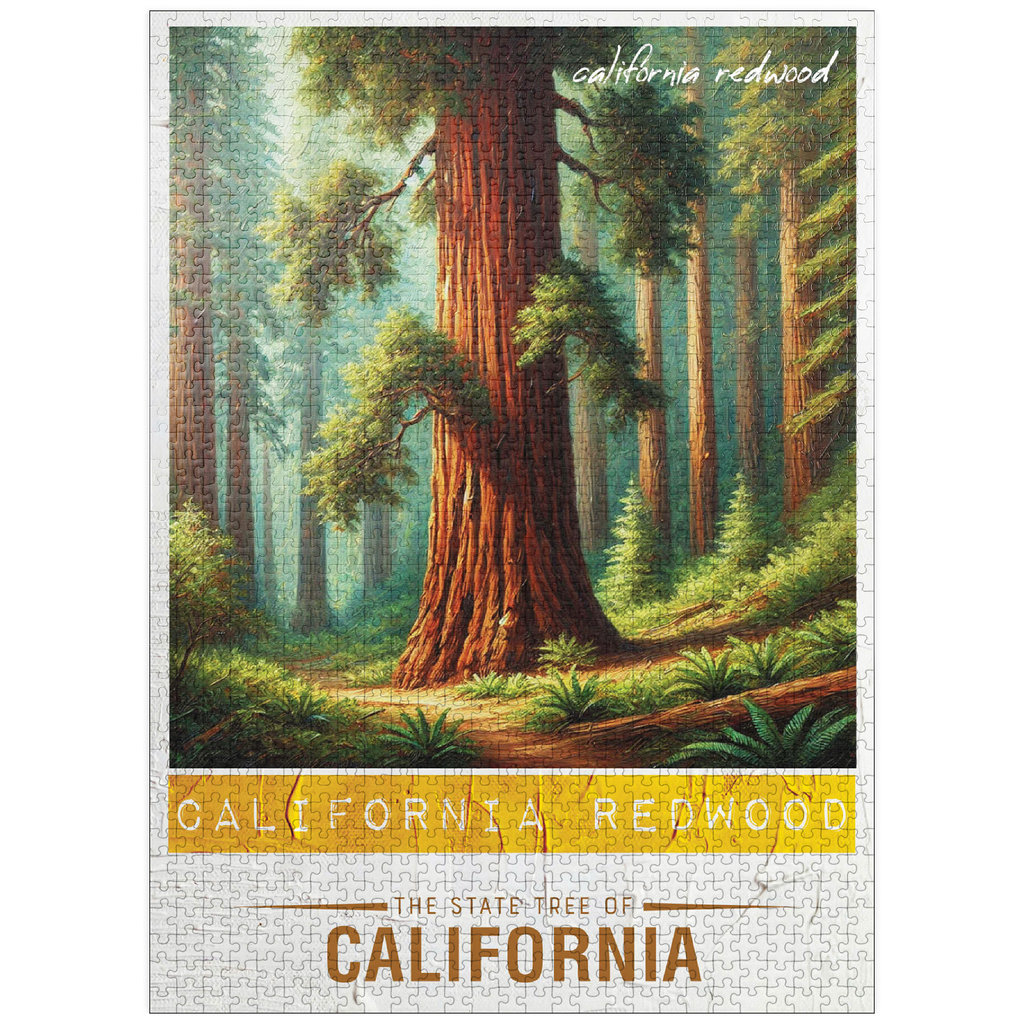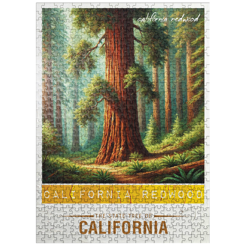 The California redwood, officially known as the coast redwood (Sequoia sempervirens), is one of California's state trees, designated in 1937. These majestic evergreens are the tallest trees in the world, reaching heights over 350 feet. They thrive along the foggy northern California coast and can live for more than 2,000 years. Their thick, fire-resistant bark and rapid growth make them resilient, and they provide vital habitat for wildlife. The State Trees collection is a unique way to show your state pride! Choose your state, or pick your favorite tree from the collection and watch it come to life. This would make a great gift for a fellow out-of-state puzzle-lover. Go on an 'adventure across the country' and collect them all!