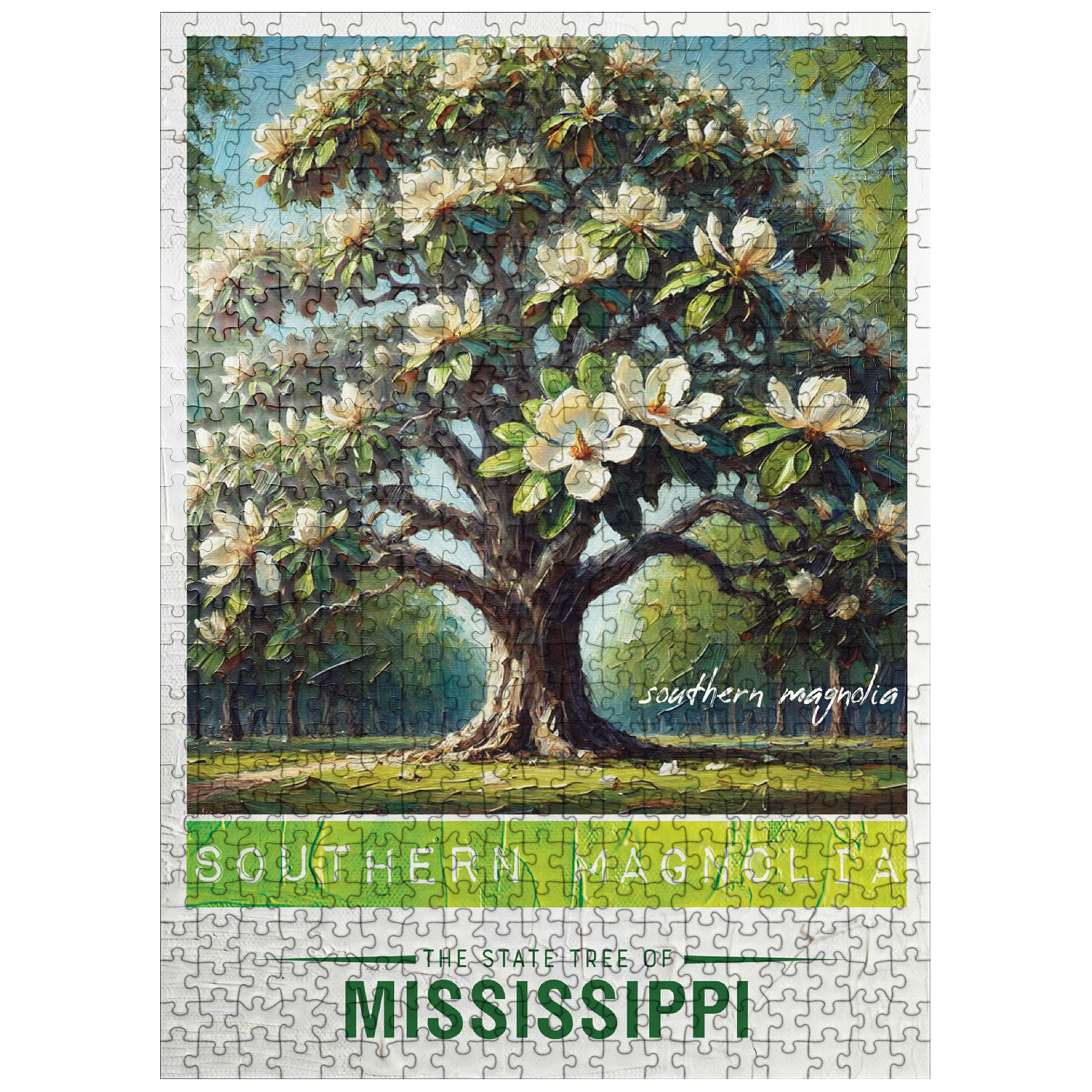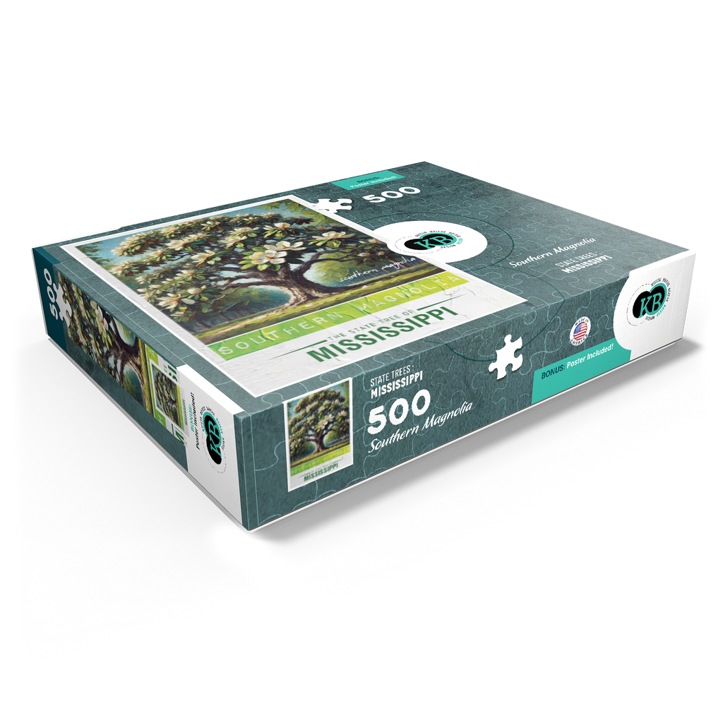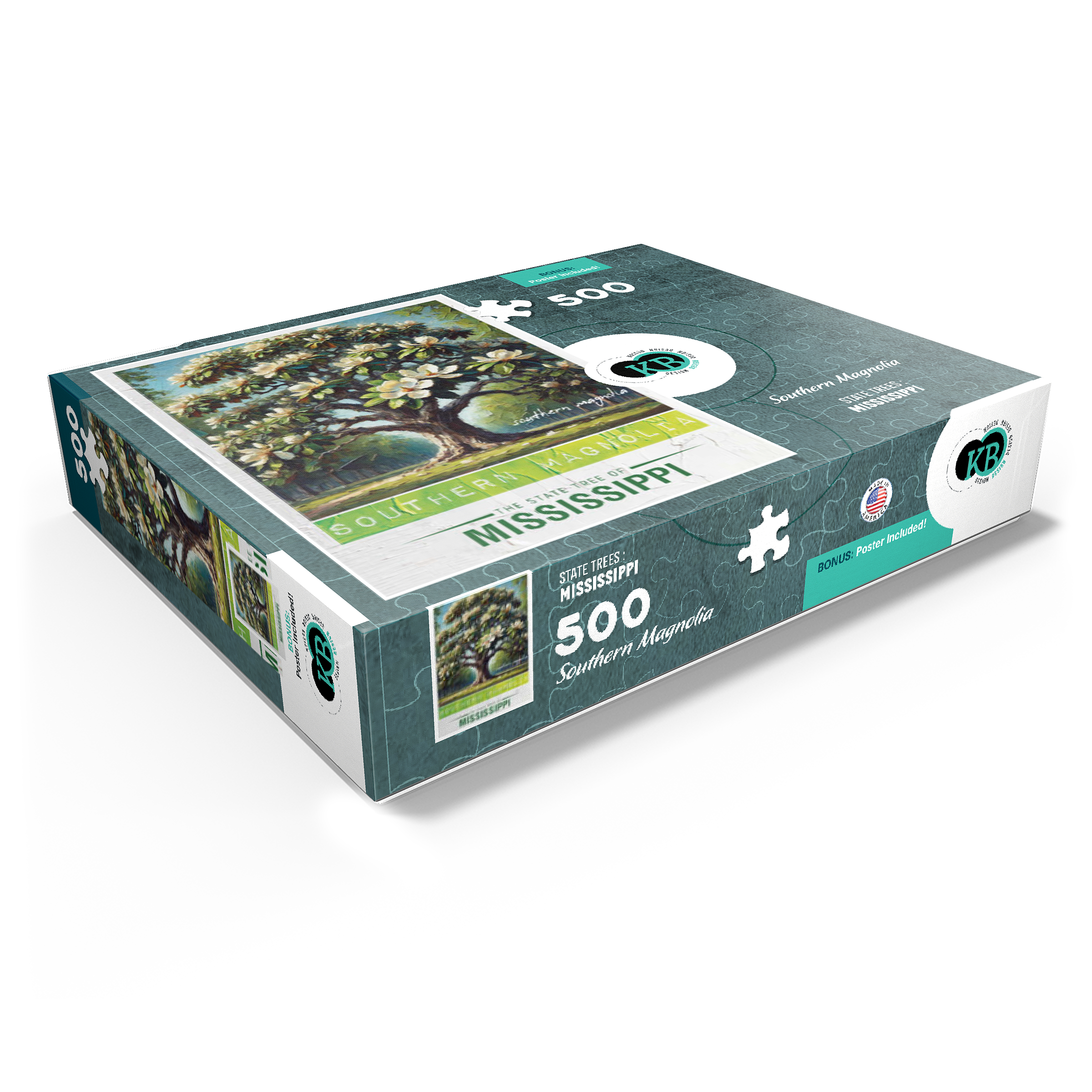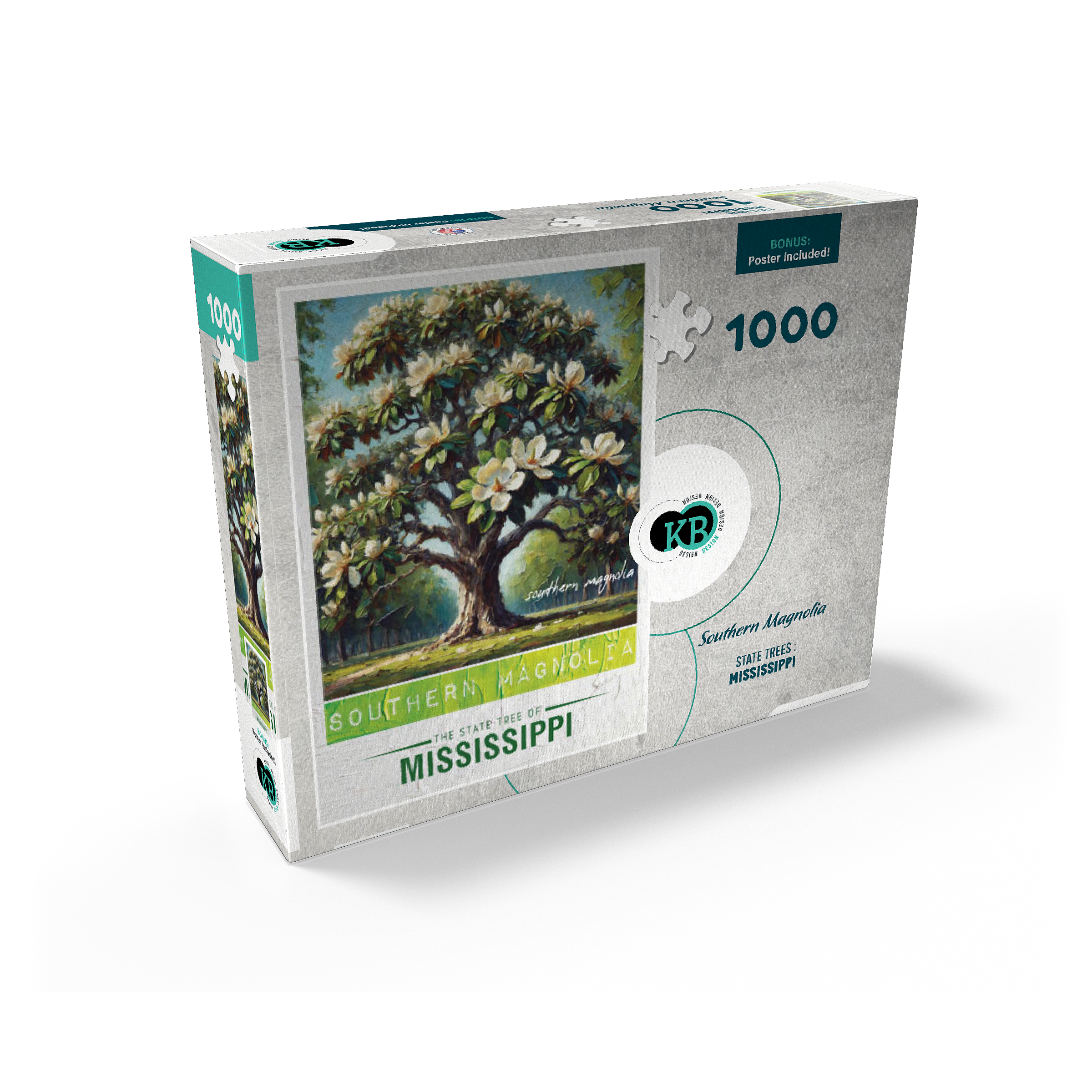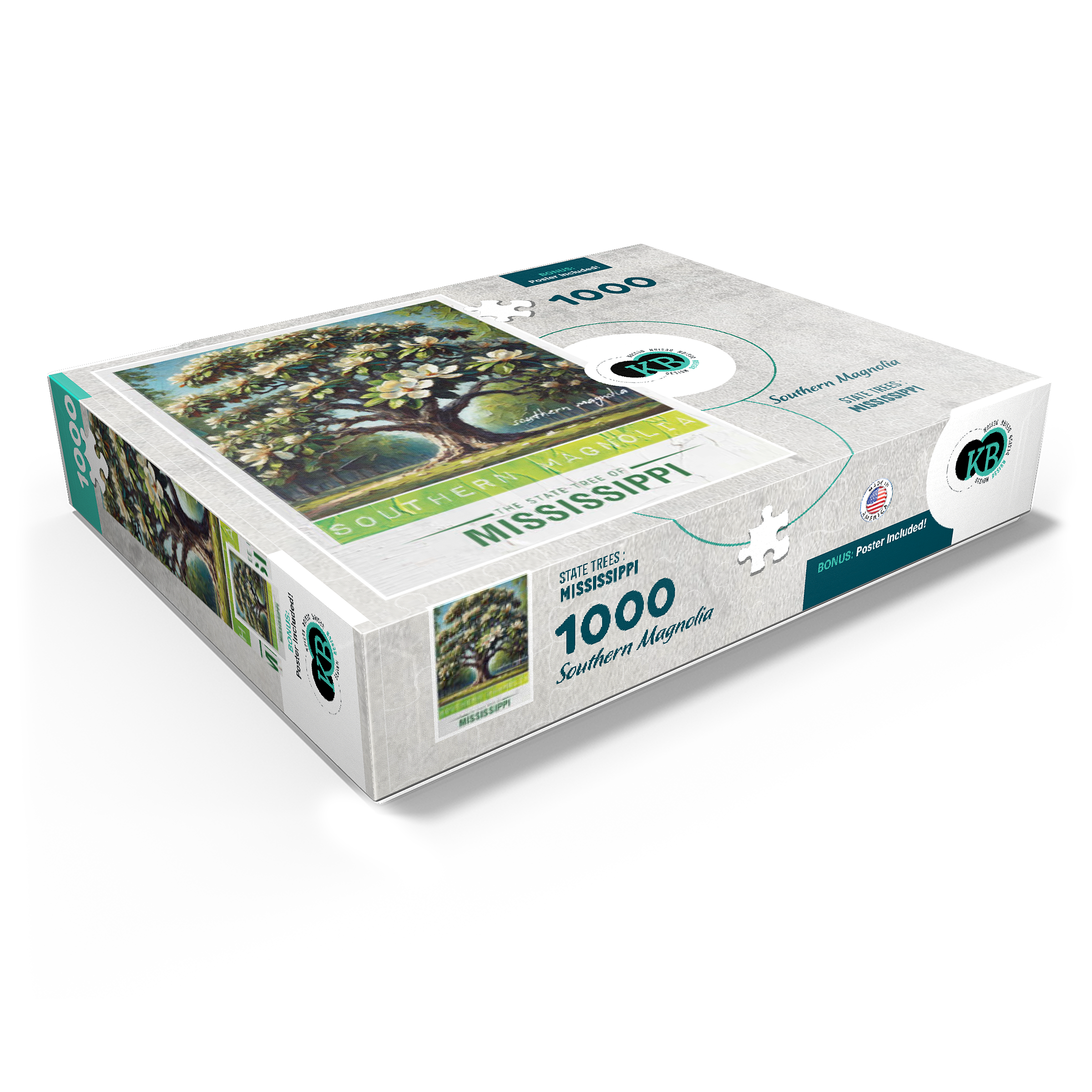 The state tree of Mississippi is the southern magnolia (Magnolia grandiflora), designated in 1938. Known for its large, fragrant white flowers and glossy evergreen leaves, this iconic tree thrives in the warm, humid climate of the South. Southern magnolias are commonly planted as ornamental trees and are a symbol of beauty and strength. Their wood is used for furniture and construction, while their flowers attract pollinators. The tree represents Mississippi's rich natural heritage and Southern charm. The State Trees collection is a unique way to show your state pride! Choose your state, or pick your favorite tree from the collection and watch it come to life. This would make a great gift for a fellow out-of-state puzzle-lover. Go on an 'adventure across the country' and collect them all!