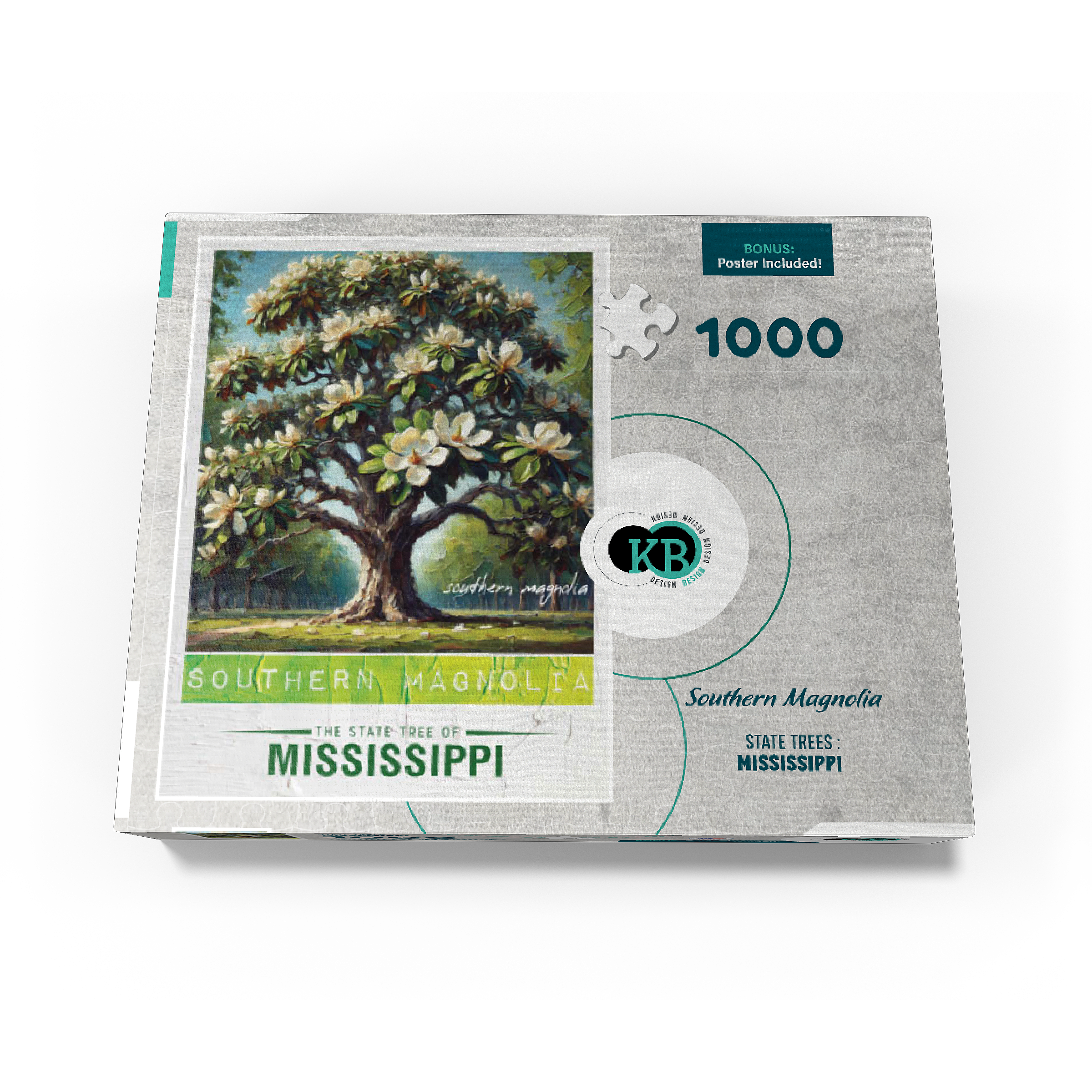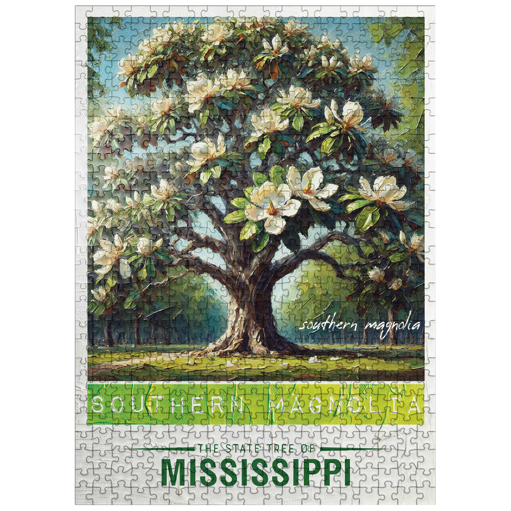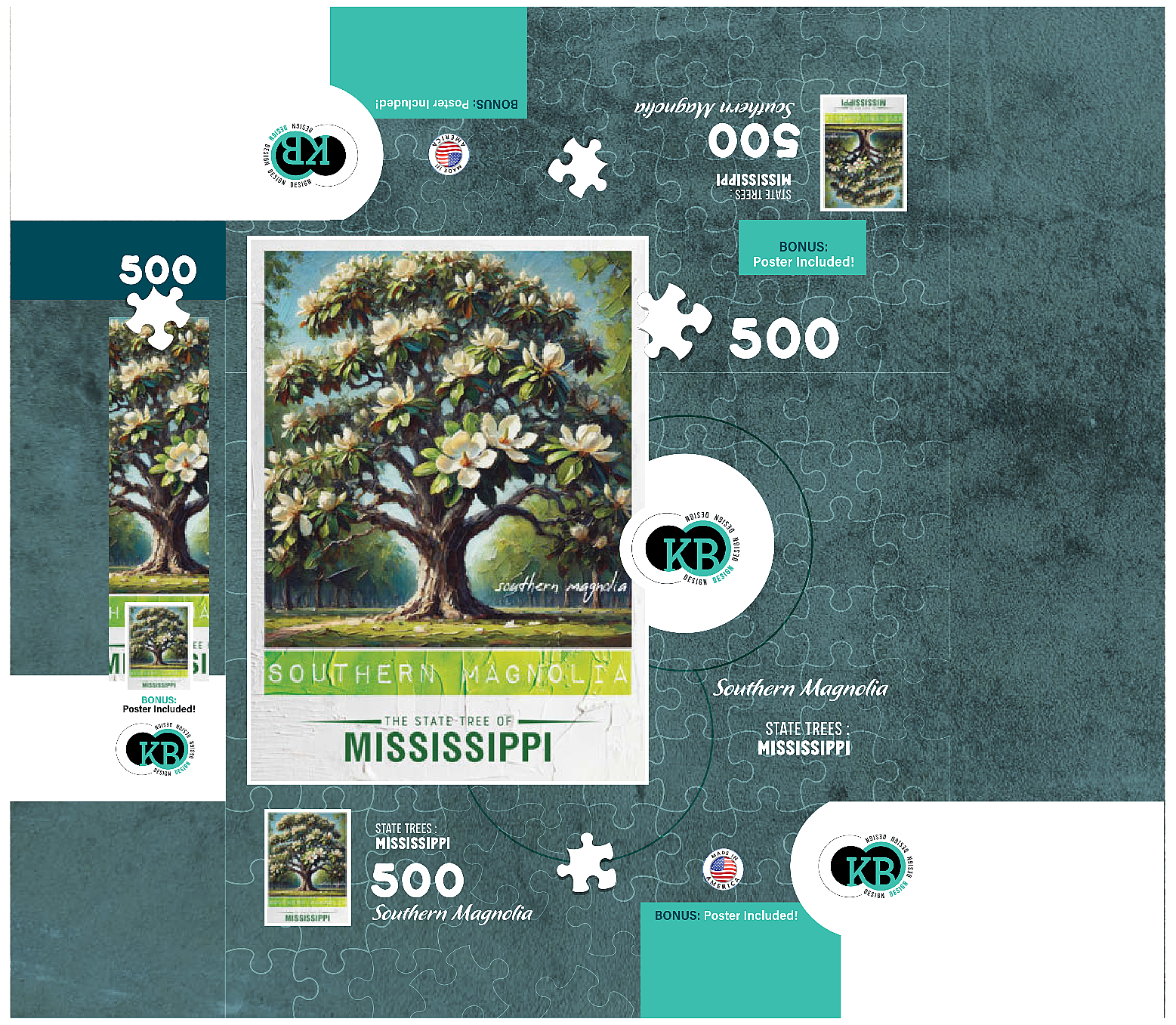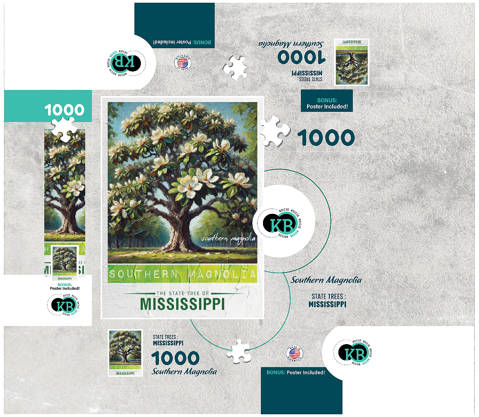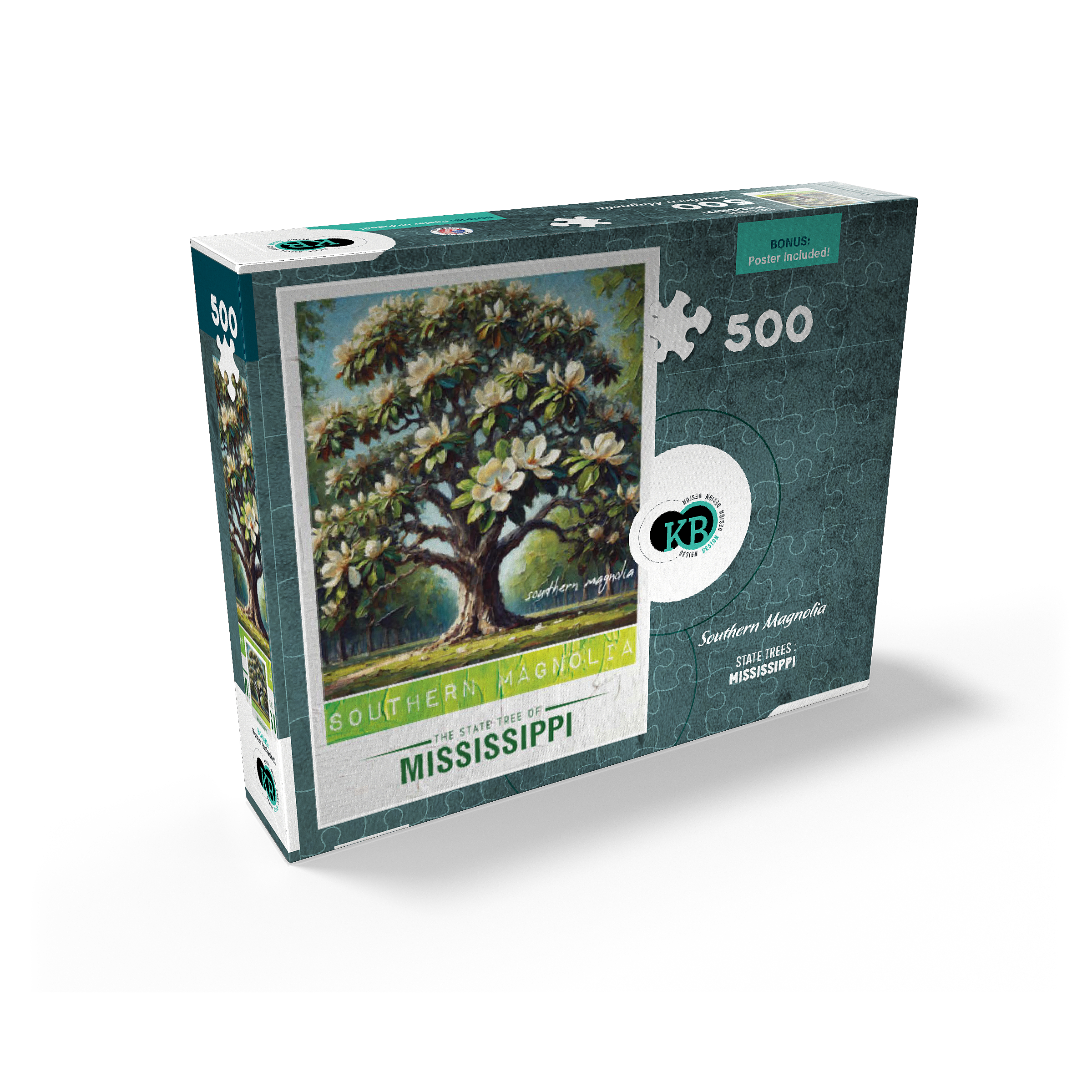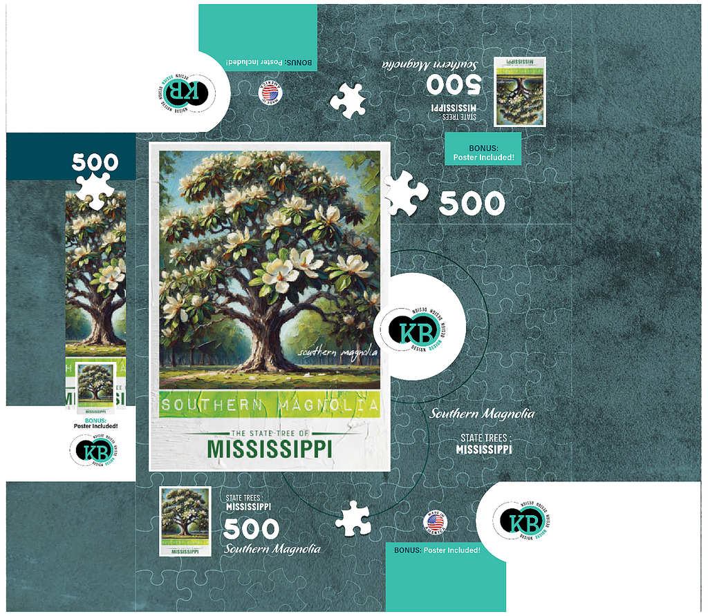 The state tree of Mississippi is the southern magnolia (Magnolia grandiflora), designated in 1938. Known for its large, fragrant white flowers and glossy evergreen leaves, this iconic tree thrives in the warm, humid climate of the South. Southern magnolias are commonly planted as ornamental trees and are a symbol of beauty and strength. Their wood is used for furniture and construction, while their flowers attract pollinators. The tree represents Mississippi's rich natural heritage and Southern charm. The State Trees collection is a unique way to show your state pride! Choose your state, or pick your favorite tree from the collection and watch it come to life. This would make a great gift for a fellow out-of-state puzzle-lover. Go on an 'adventure across the country' and collect them all!