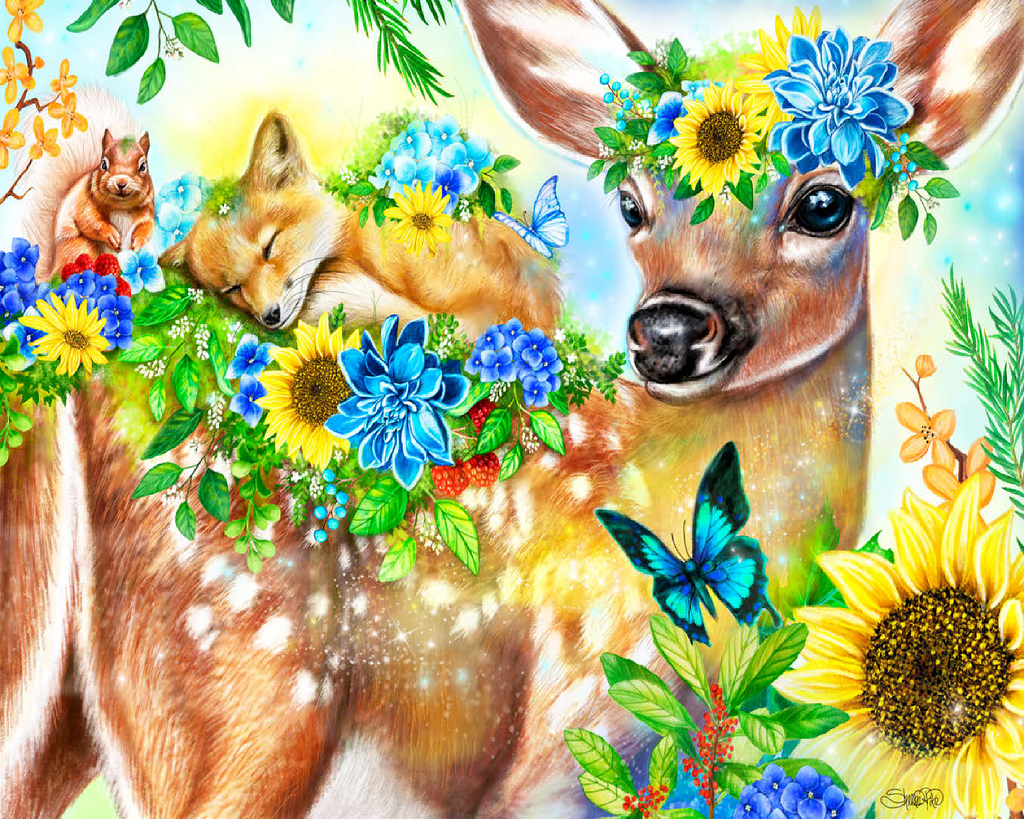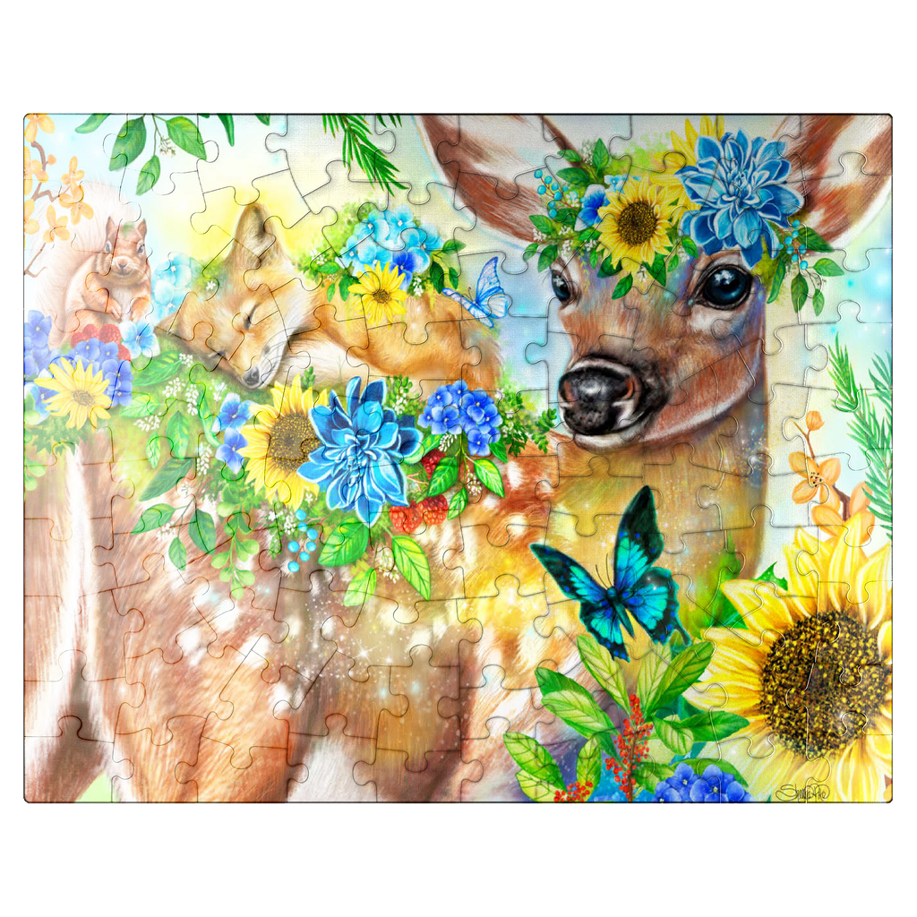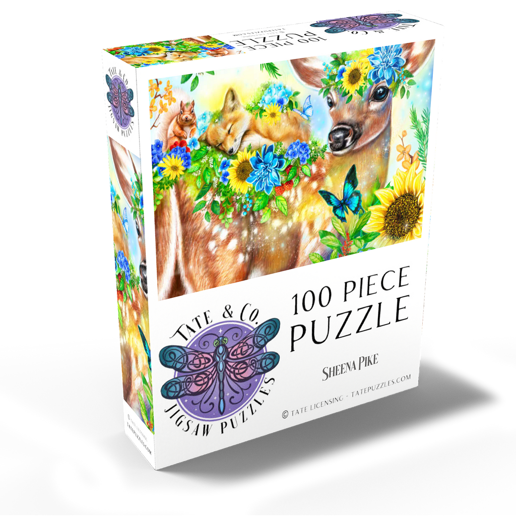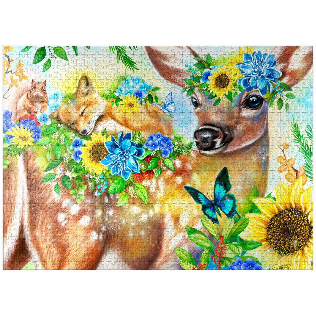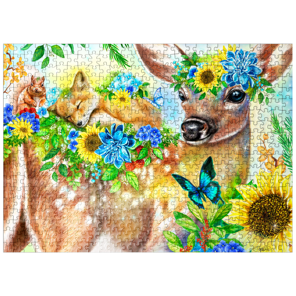 Dive into a cheerful woodland adventure with Sheena Pike's captivating artwork of a sweet fawn and its sleepy baby fox and happy squirrel friends. This vibrant nature scene, filled with colorful flowers and greenery, makes for a perfect cozy puzzle that spreads happiness.