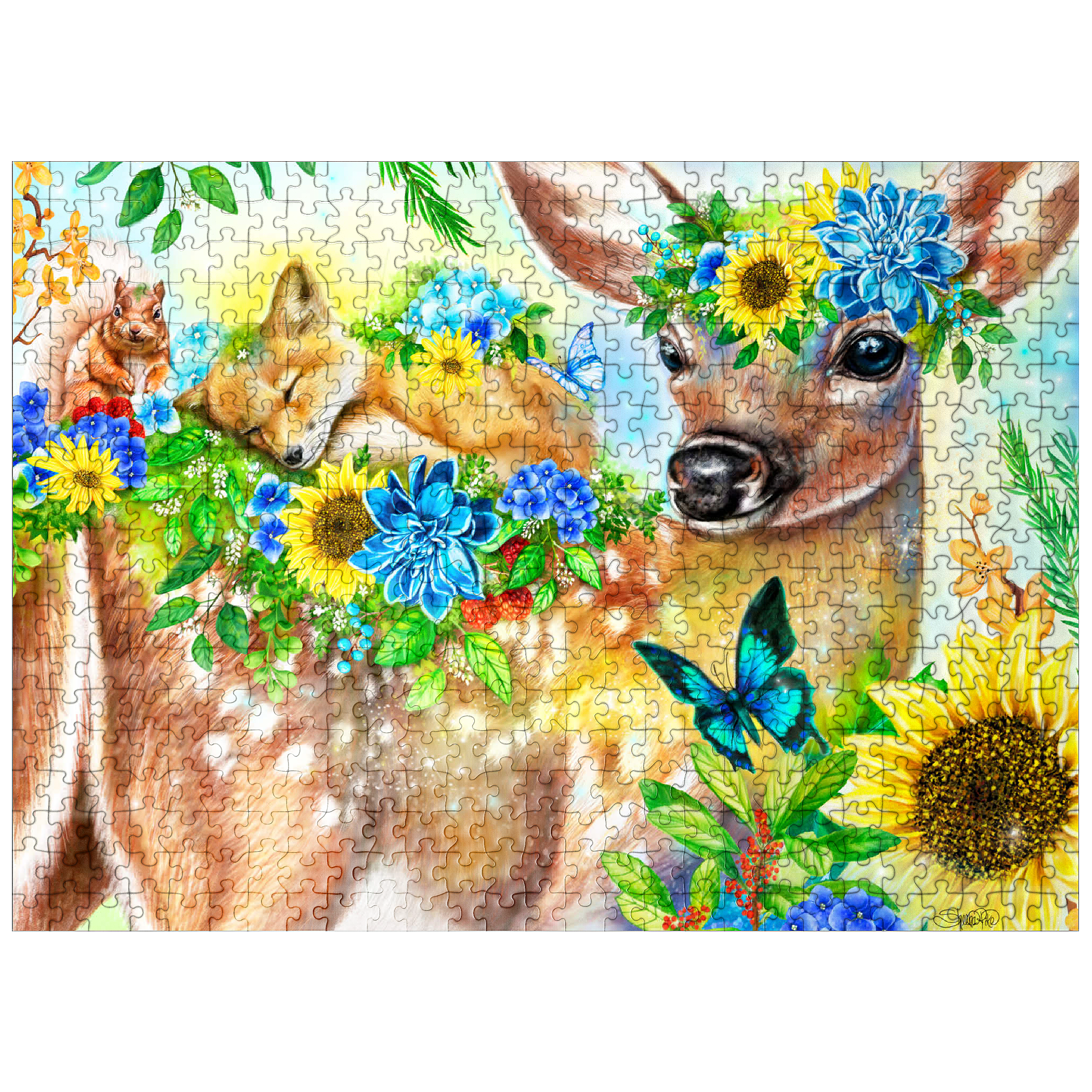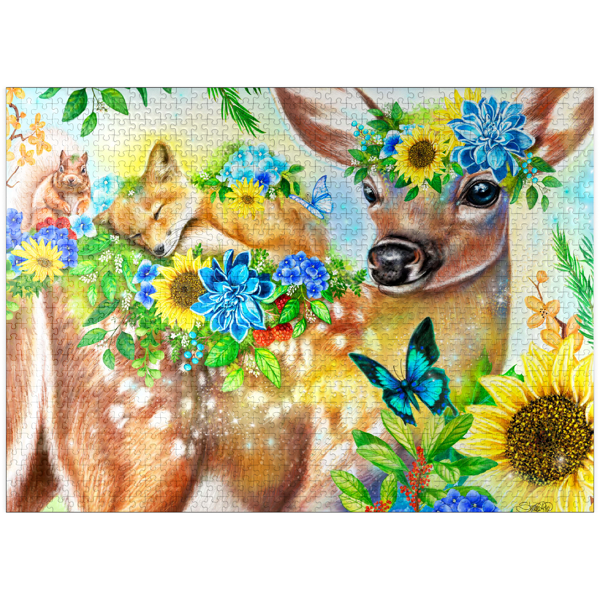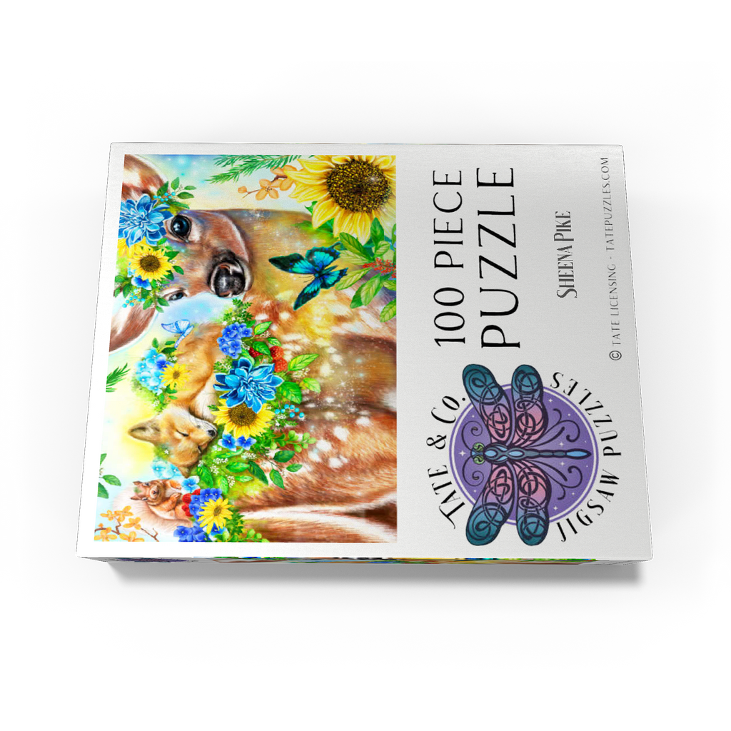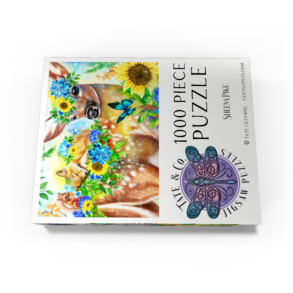 Dive into a cheerful woodland adventure with Sheena Pike's captivating artwork of a sweet fawn and its sleepy baby fox and happy squirrel friends. This vibrant nature scene, filled with colorful flowers and greenery, makes for a perfect cozy puzzle that spreads happiness.
