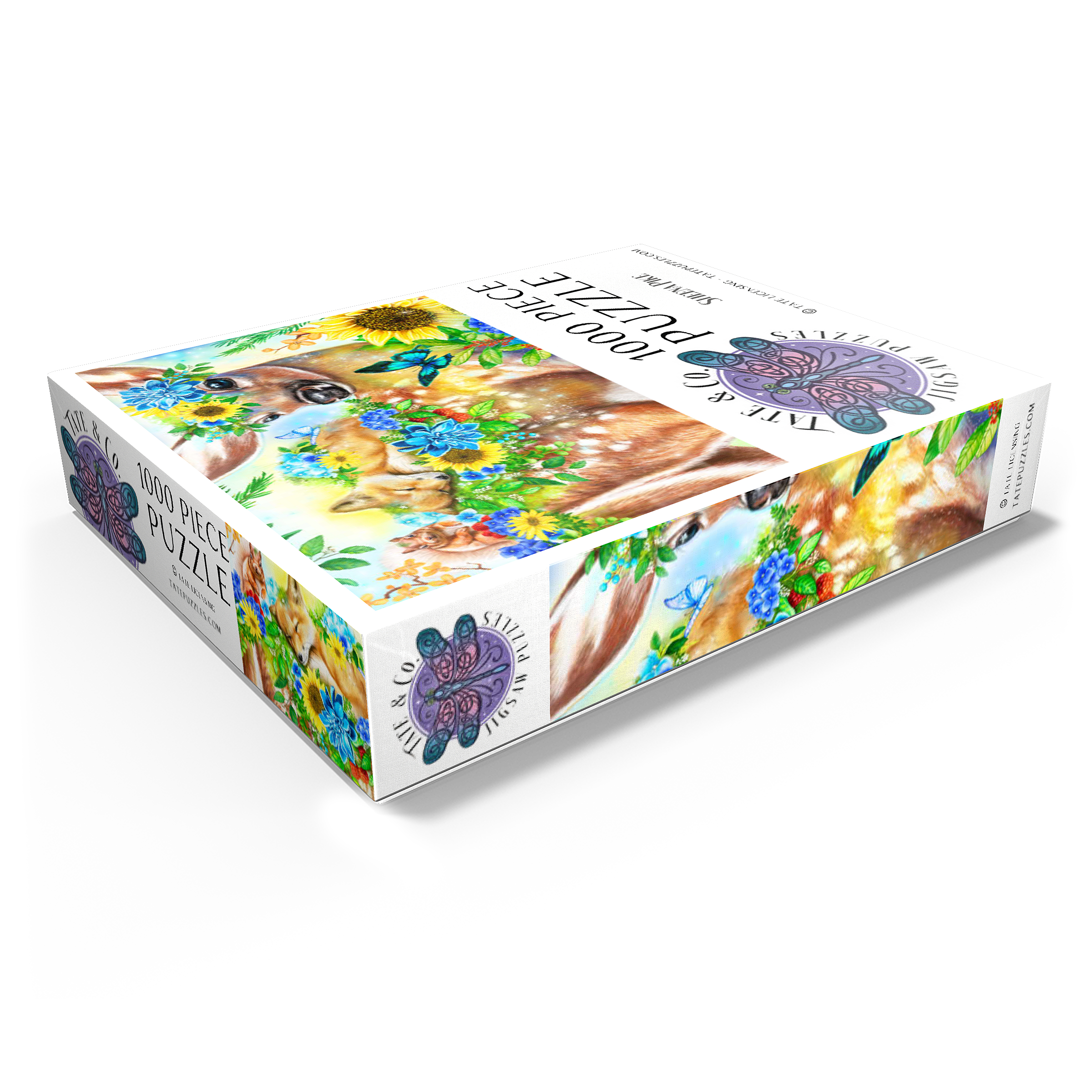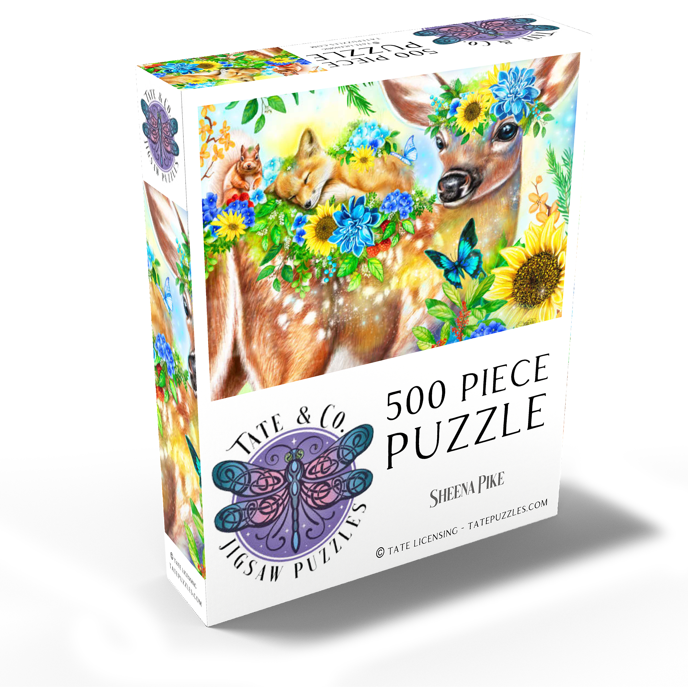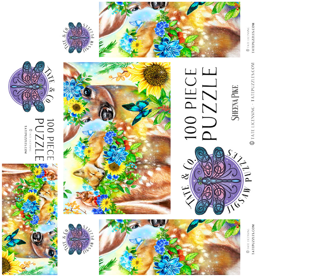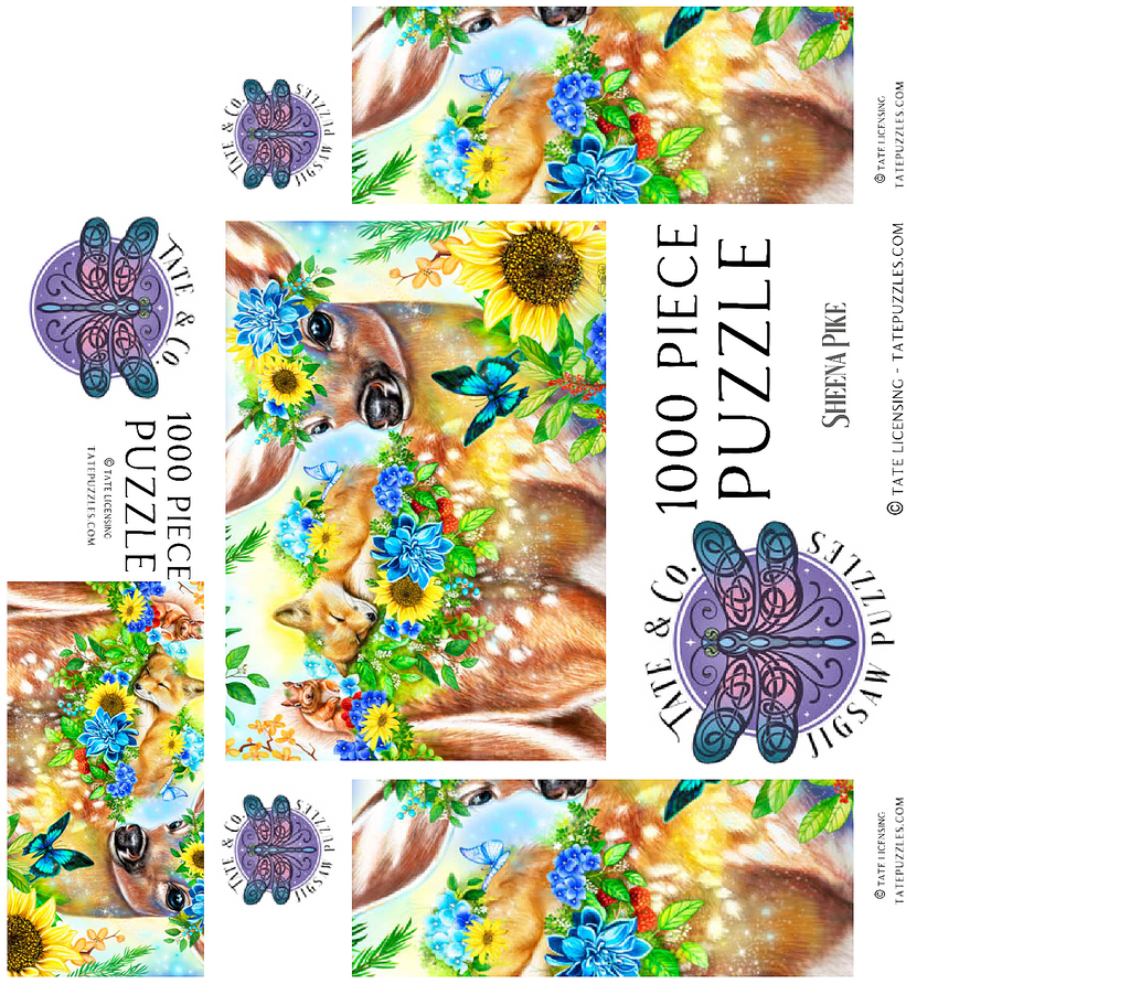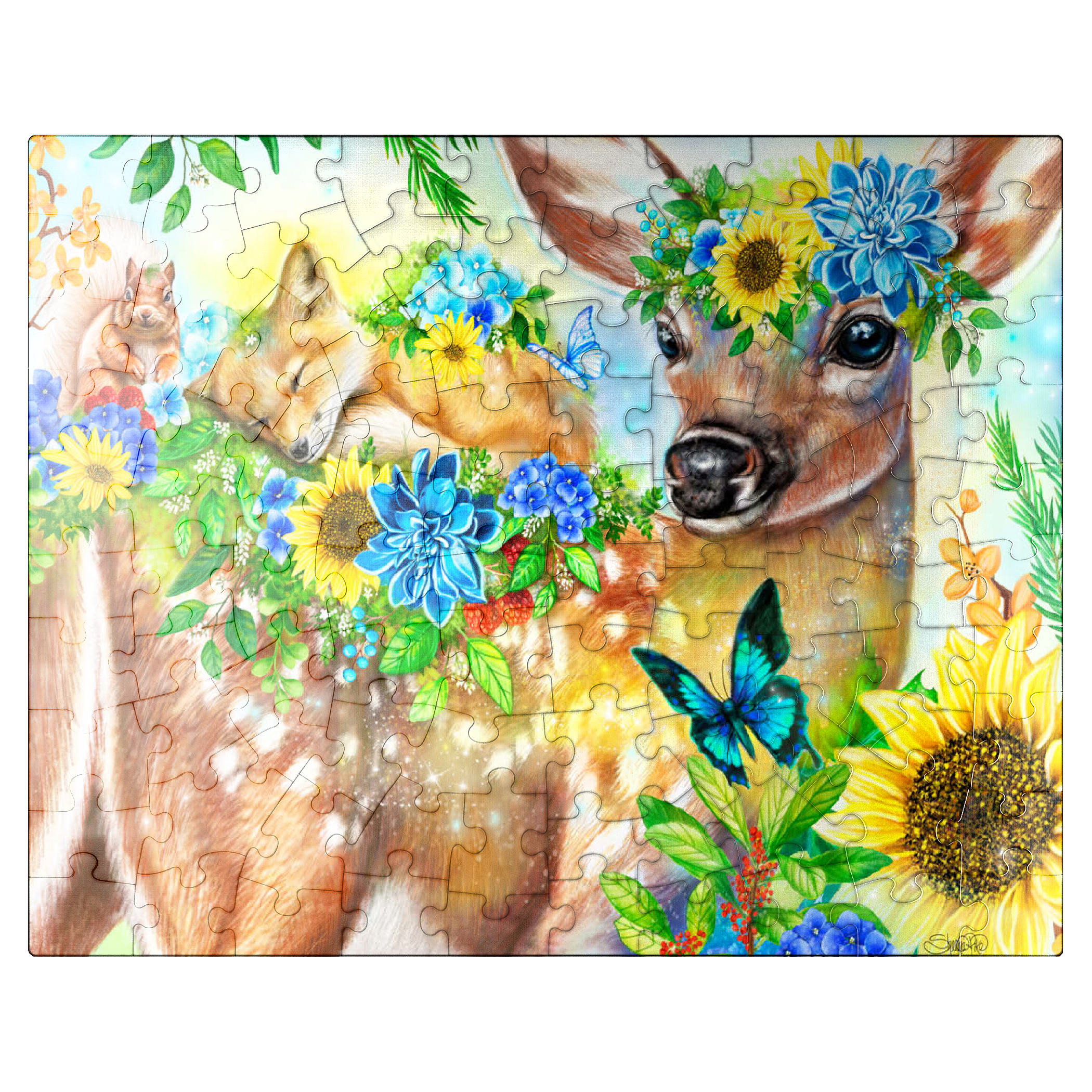 Dive into a cheerful woodland adventure with Sheena Pike's captivating artwork of a sweet fawn and its sleepy baby fox and happy squirrel friends. This vibrant nature scene, filled with colorful flowers and greenery, makes for a perfect cozy puzzle that spreads happiness.