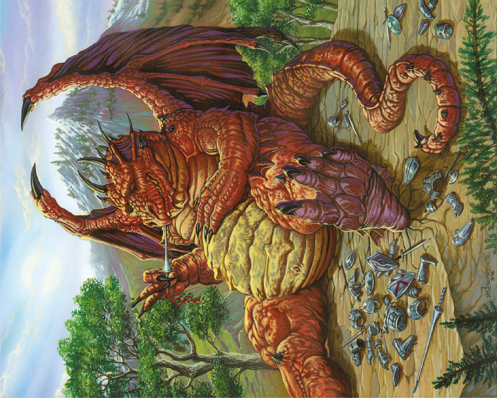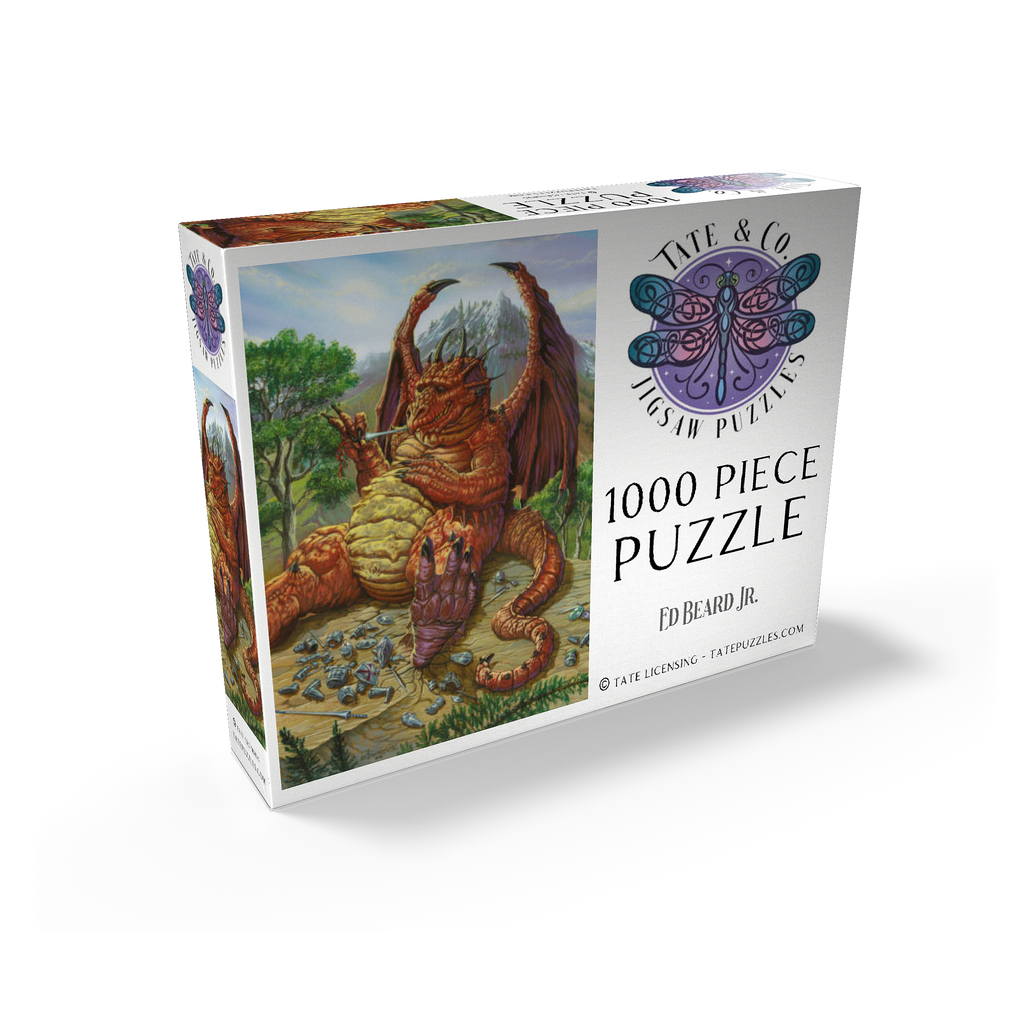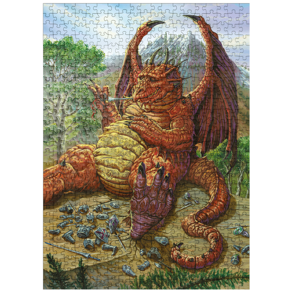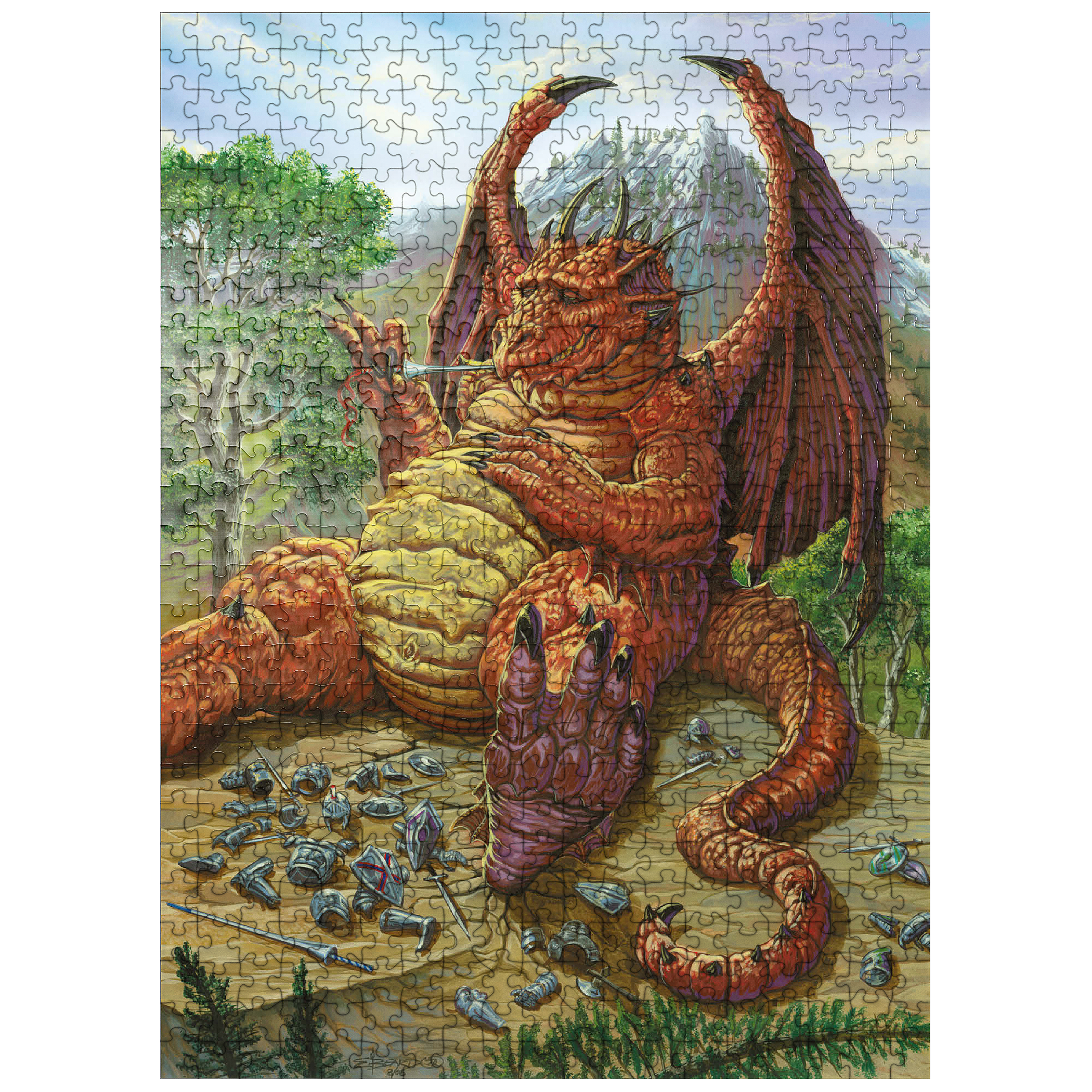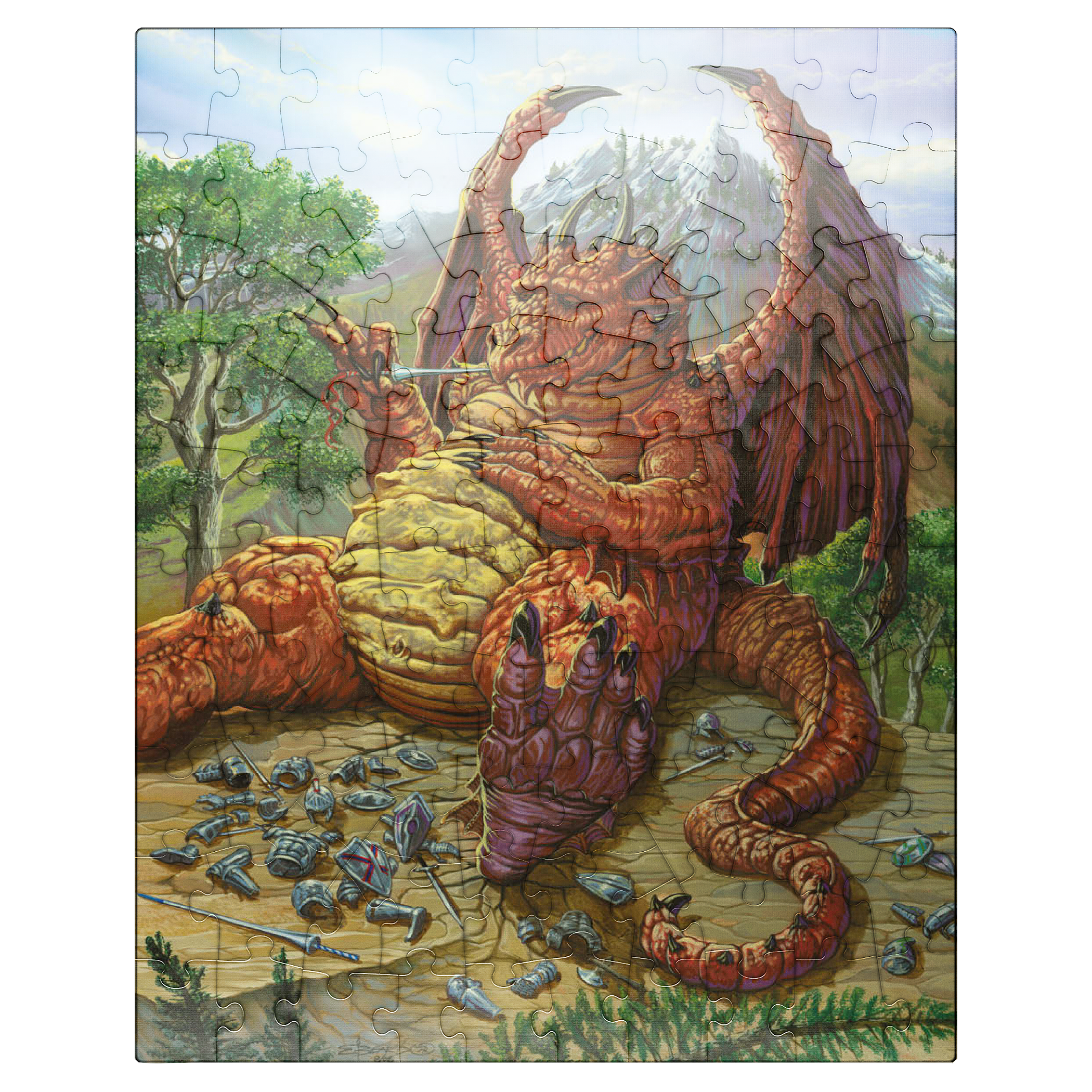 One day a tired dragon simply wanted to take a nap. His loud snoring bothered the King so much that he summoned his best knights to go investigate. The dragon was most pleased with this food delivery. Sadly, the dragon became too heavy to fly as a result -sometimes the dragon wins-. The forested cliff is an iconic setting for this comical and whimsical dragon image.