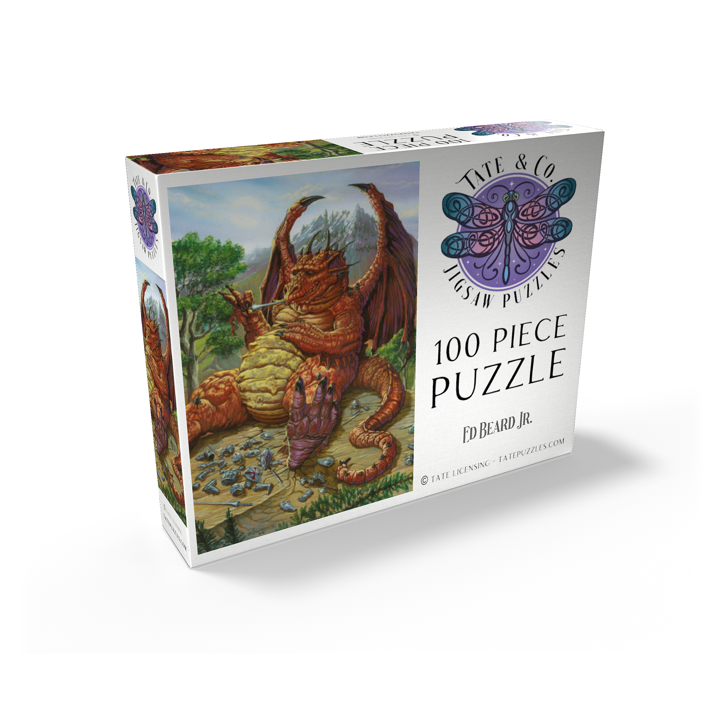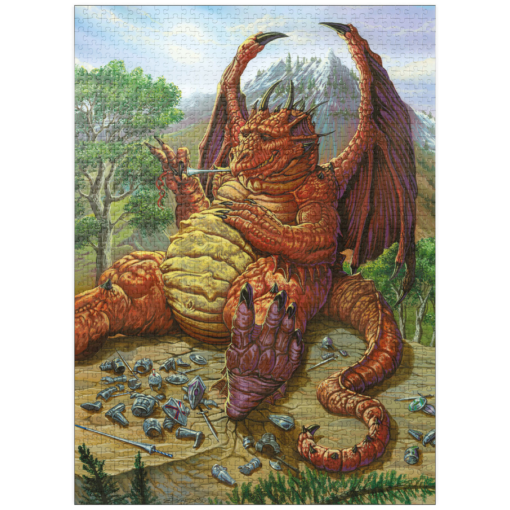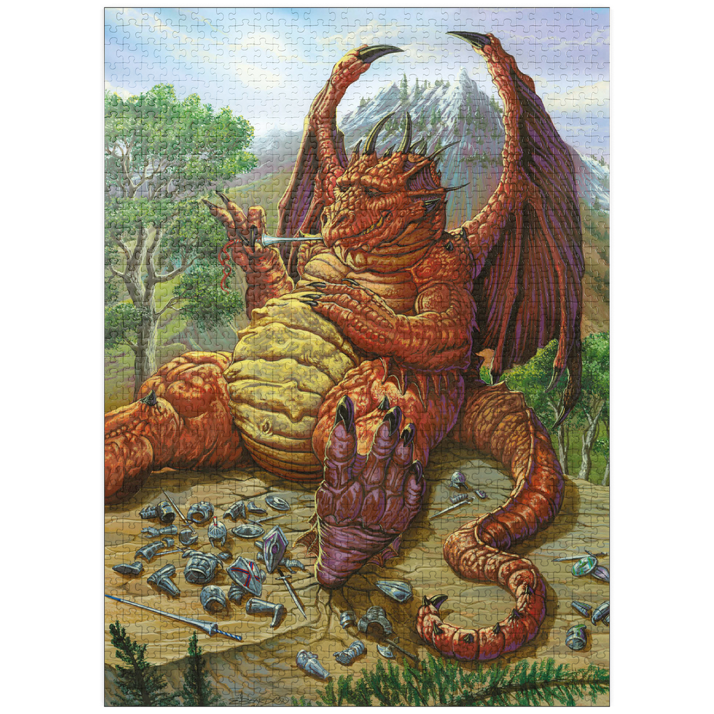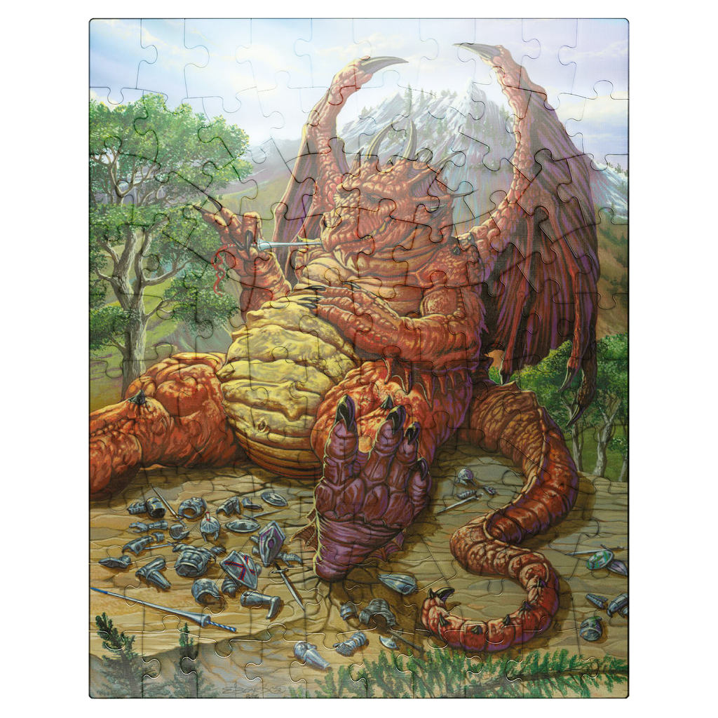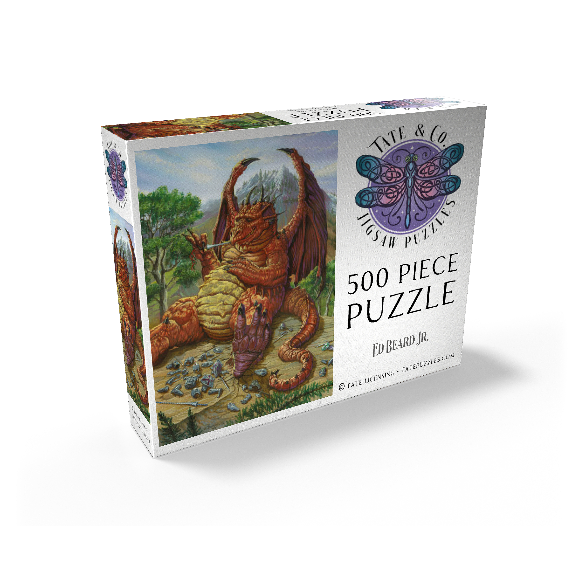 One day a tired dragon simply wanted to take a nap. His loud snoring bothered the King so much that he summoned his best knights to go investigate. The dragon was most pleased with this food delivery. Sadly, the dragon became too heavy to fly as a result -sometimes the dragon wins-. The forested cliff is an iconic setting for this comical and whimsical dragon image.