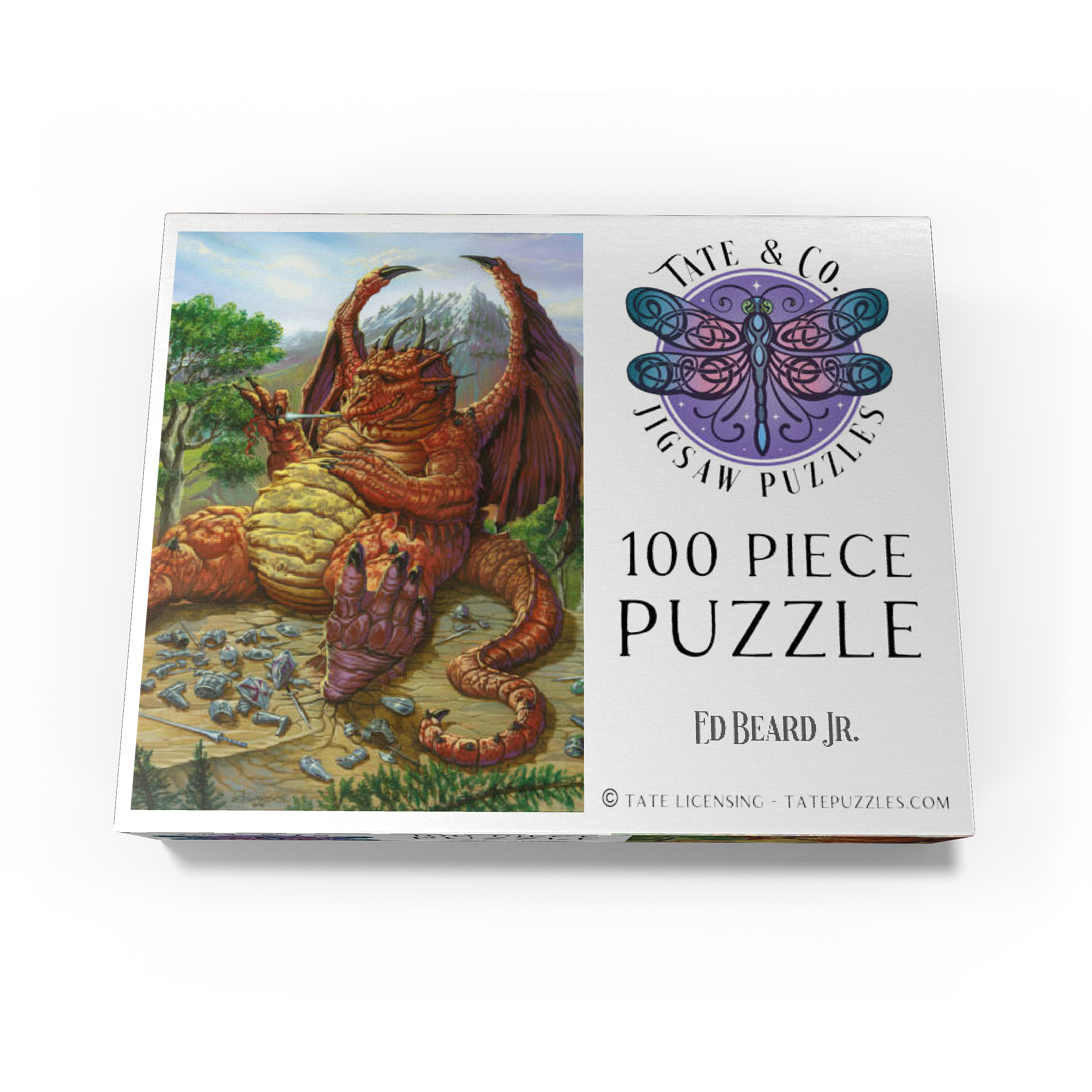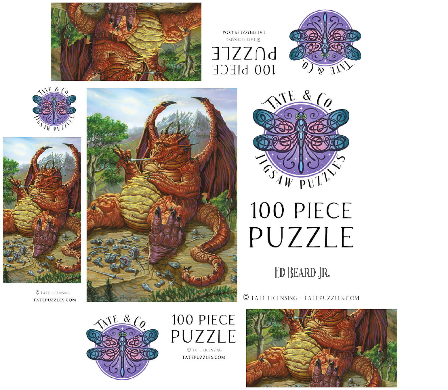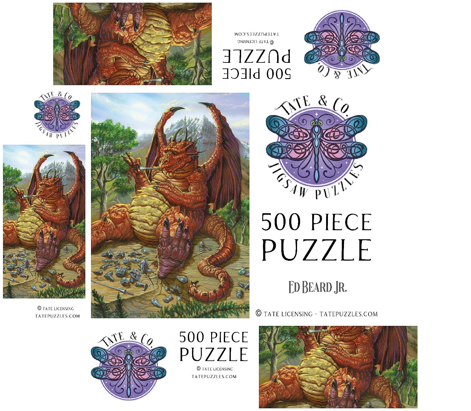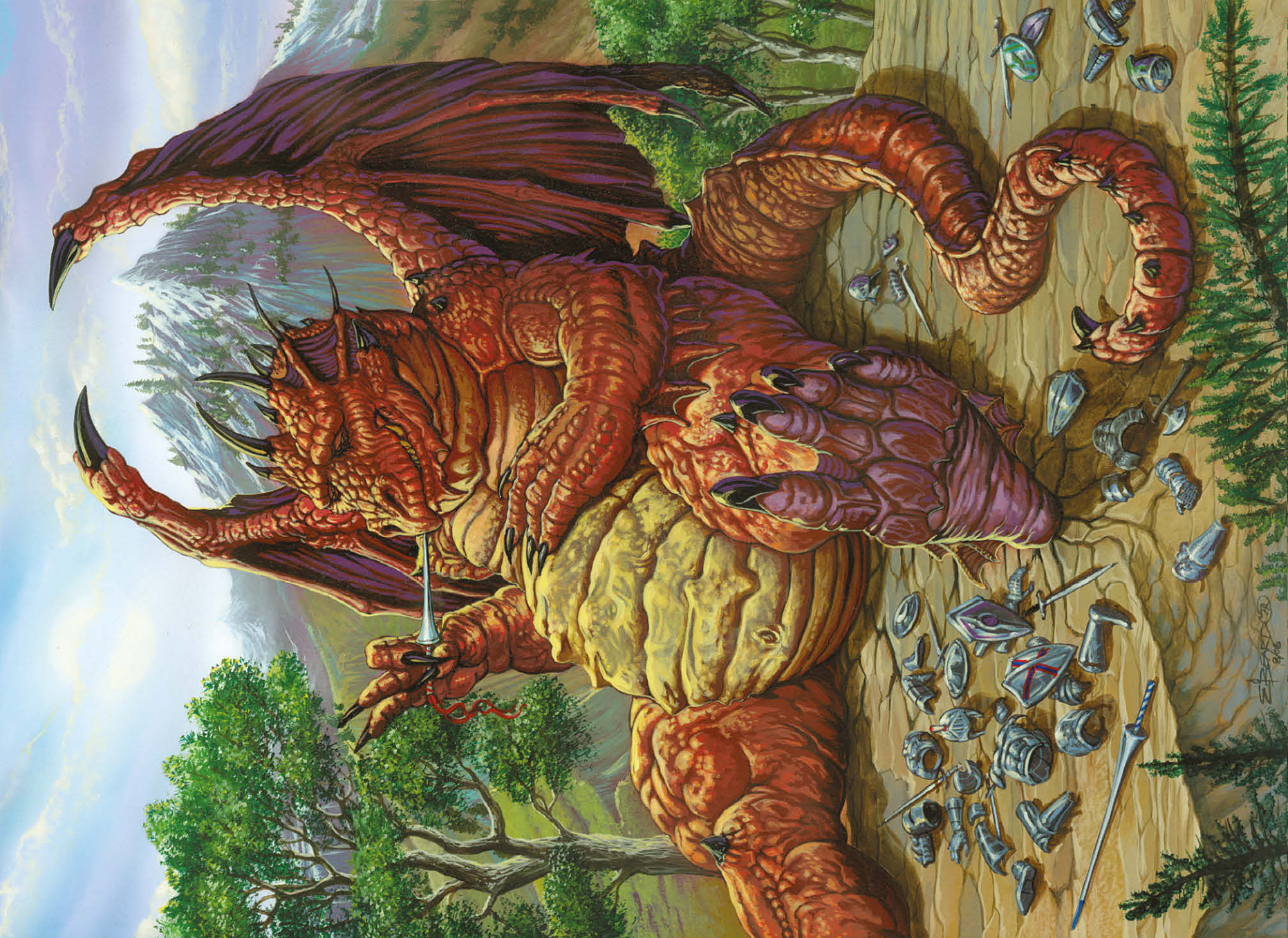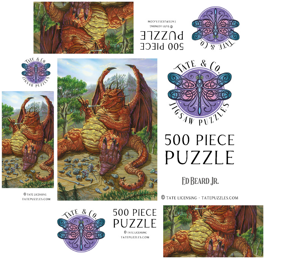 One day a tired dragon simply wanted to take a nap. His loud snoring bothered the King so much that he summoned his best knights to go investigate. The dragon was most pleased with this food delivery. Sadly, the dragon became too heavy to fly as a result -sometimes the dragon wins-. The forested cliff is an iconic setting for this comical and whimsical dragon image.