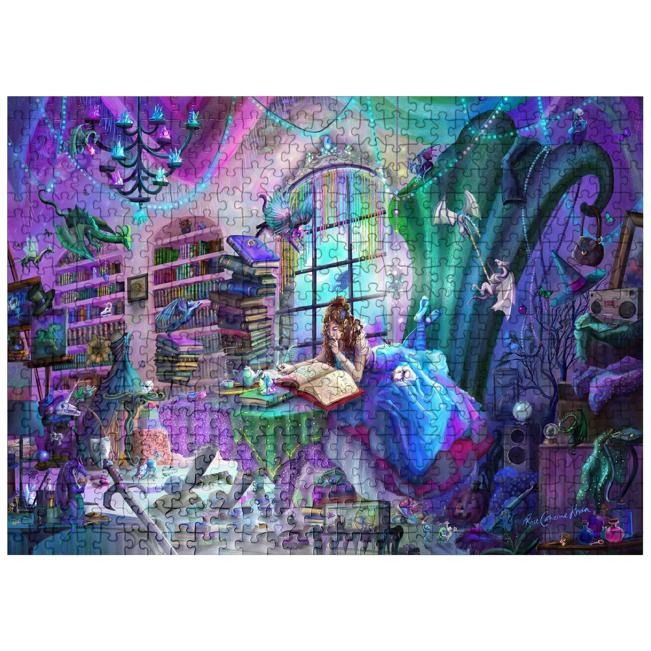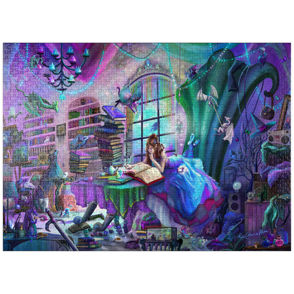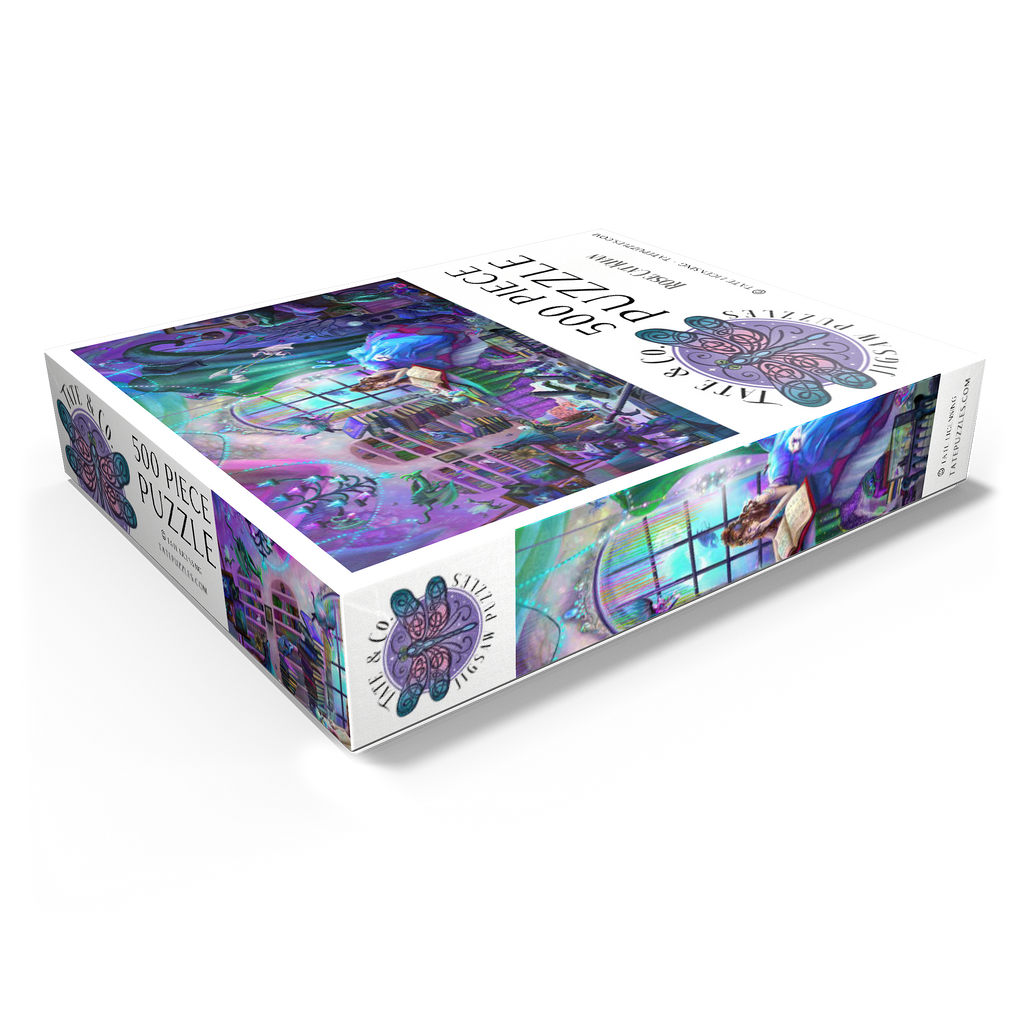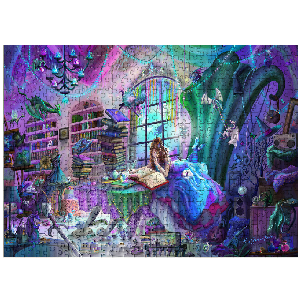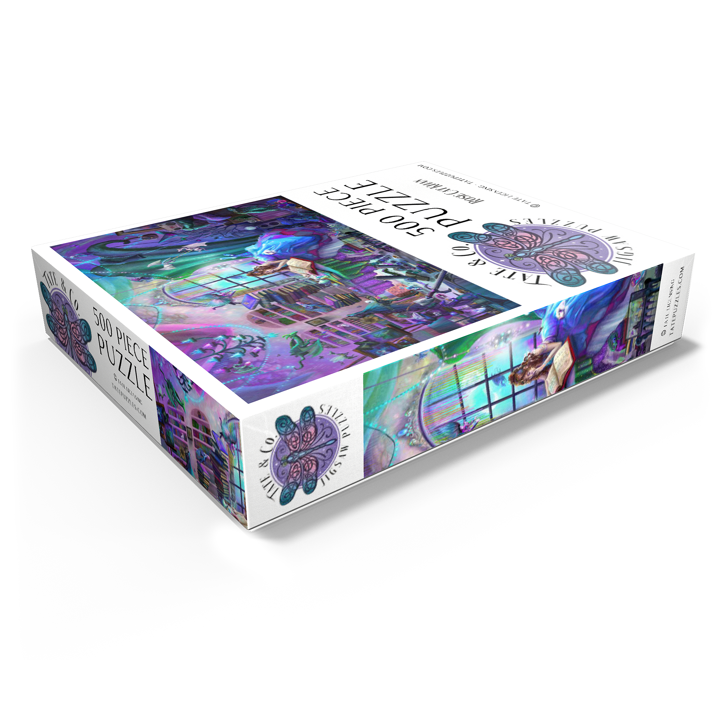 Step into the enchanted world of Centernia in this best-selling fantasy puzzlescape by Rose Cat Khan. Surrounded by glowing books, arcane scrolls, and magical creatures, Artemisa Wynter studies the mysterious Gate to Autumn Valley-her last hope of reaching her mother's world. Among the mage books and teacups lie relics from the 1980s: a cassette player, a pair of jeans, and other forgotten Earthly treasures. Crystals glimmer, winged feltraini cats fly about, and chaos blooms in every corner of this whimsical, lore-filled room. -Magic Study- bridges worlds, blending cozy academia with fantasy. This is the original dark purple version.