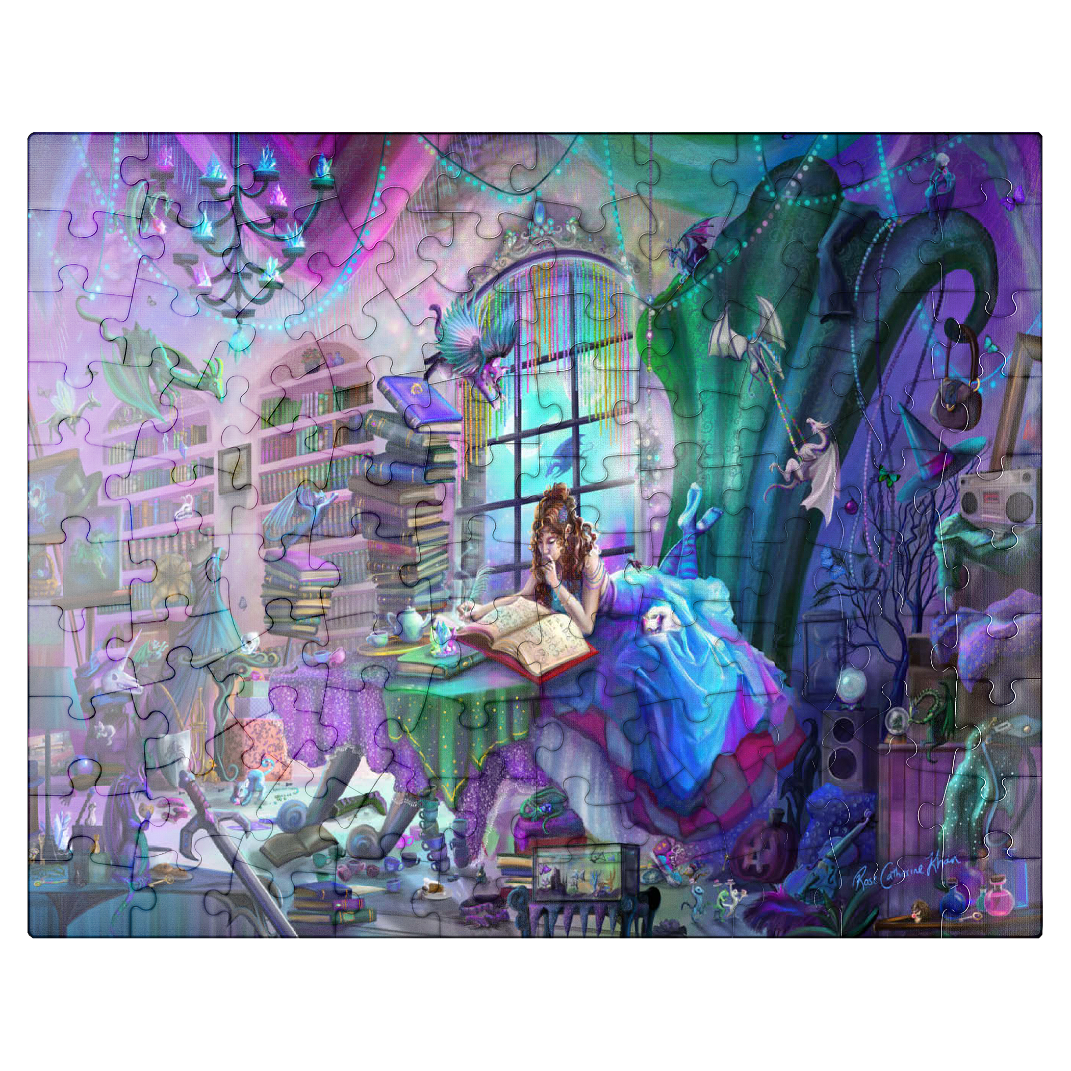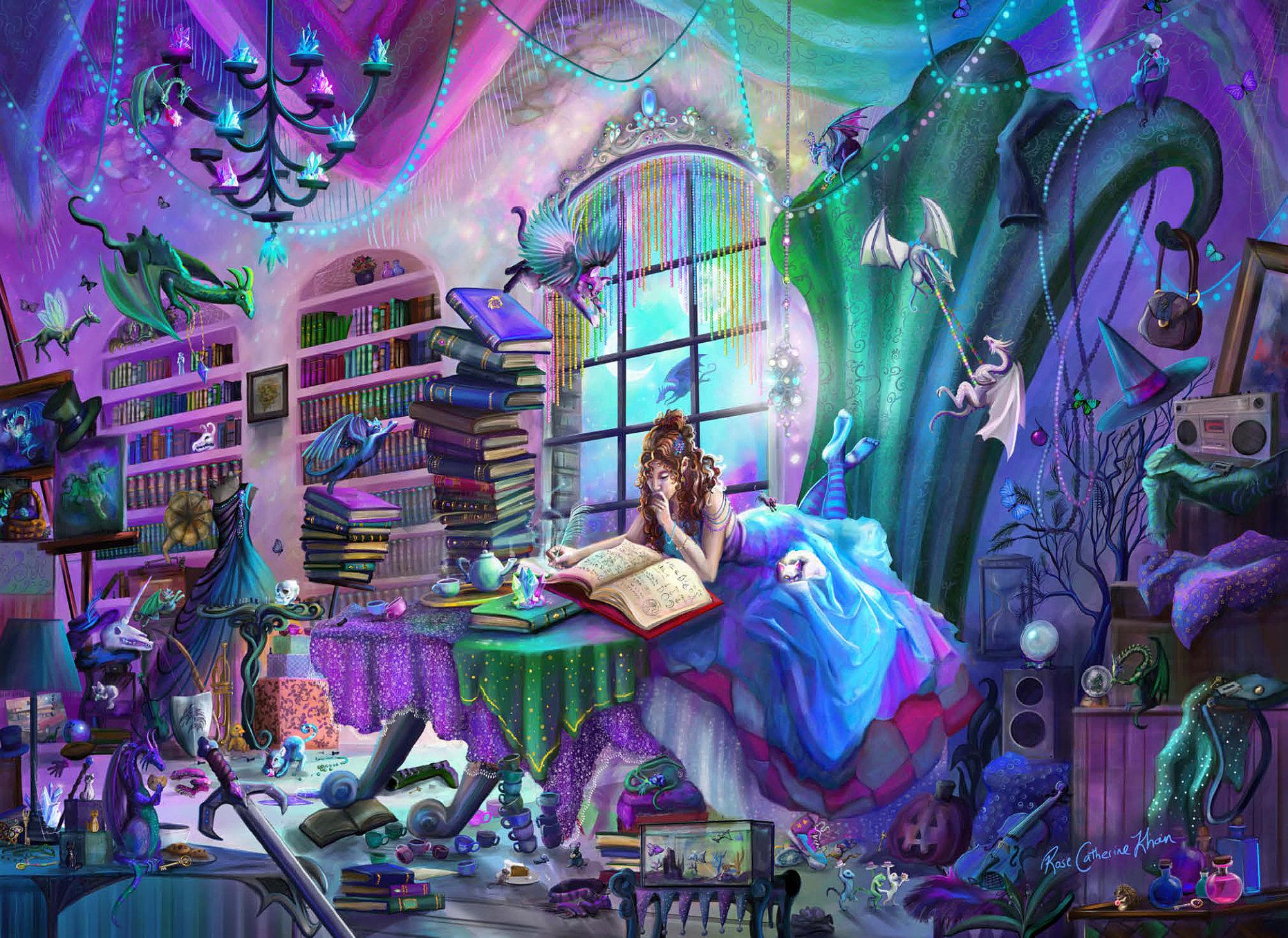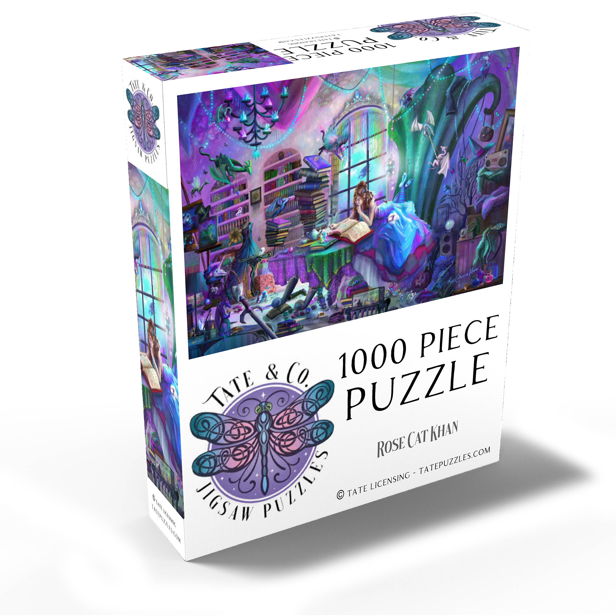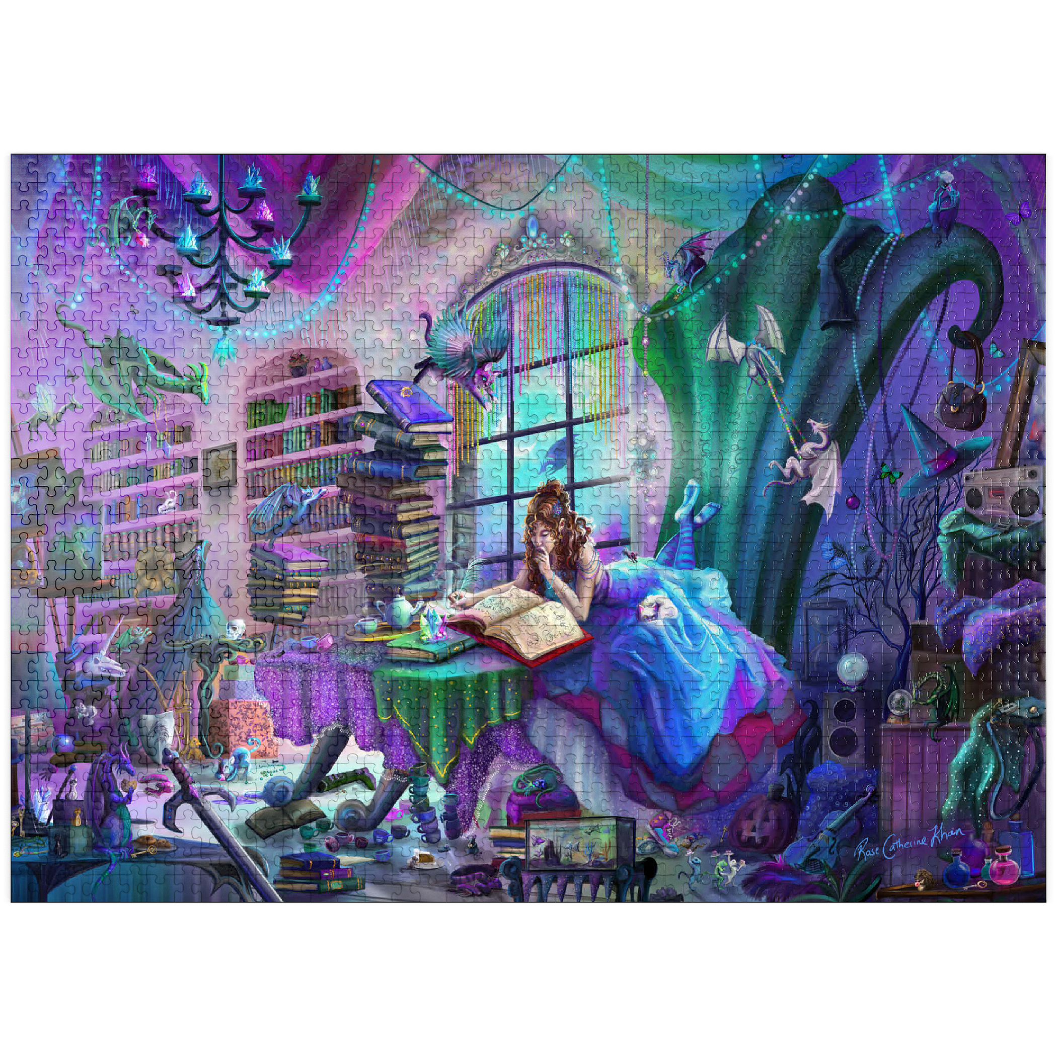 Step into the enchanted world of Centernia in this best-selling fantasy puzzlescape by Rose Cat Khan. Surrounded by glowing books, arcane scrolls, and magical creatures, Artemisa Wynter studies the mysterious Gate to Autumn Valley-her last hope of reaching her mother's world. Among the mage books and teacups lie relics from the 1980s: a cassette player, a pair of jeans, and other forgotten Earthly treasures. Crystals glimmer, winged feltraini cats fly about, and chaos blooms in every corner of this whimsical, lore-filled room. -Magic Study- bridges worlds, blending cozy academia with fantasy. This is the original dark purple version.