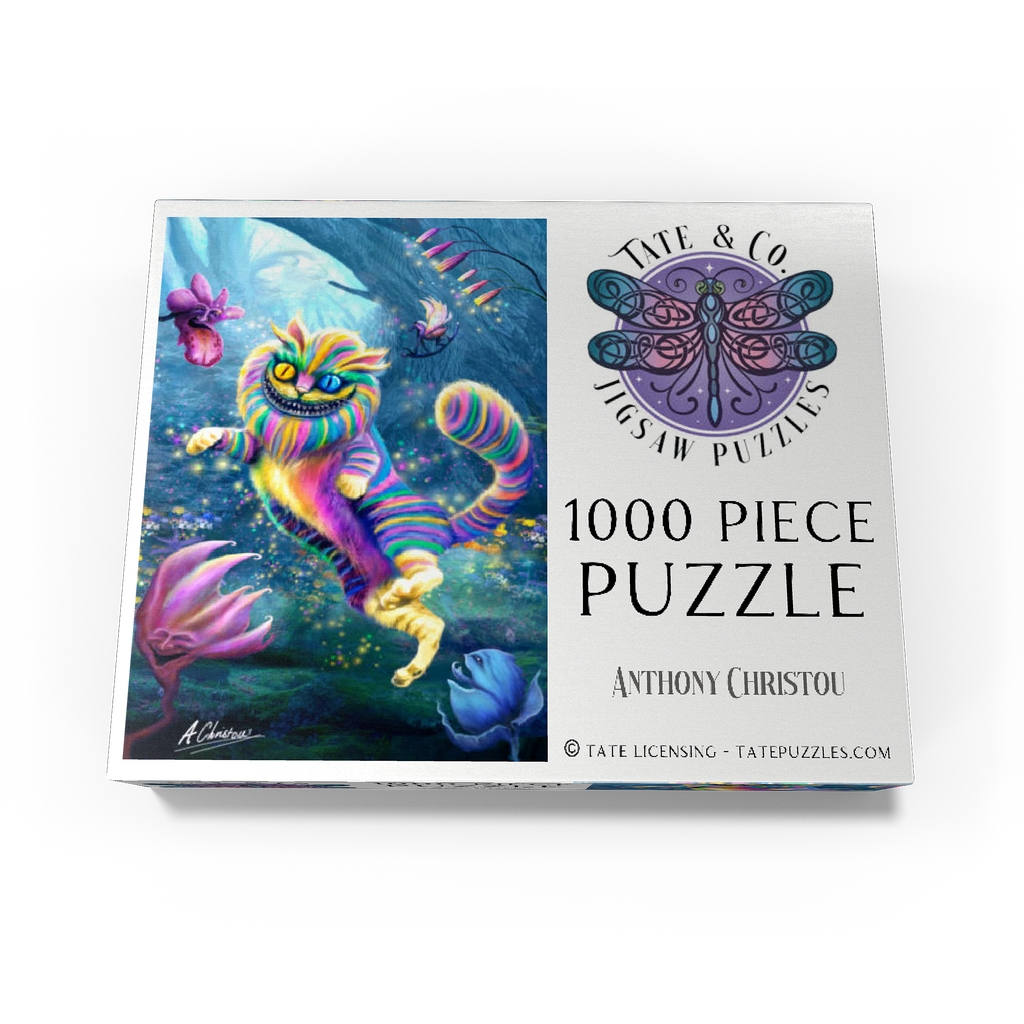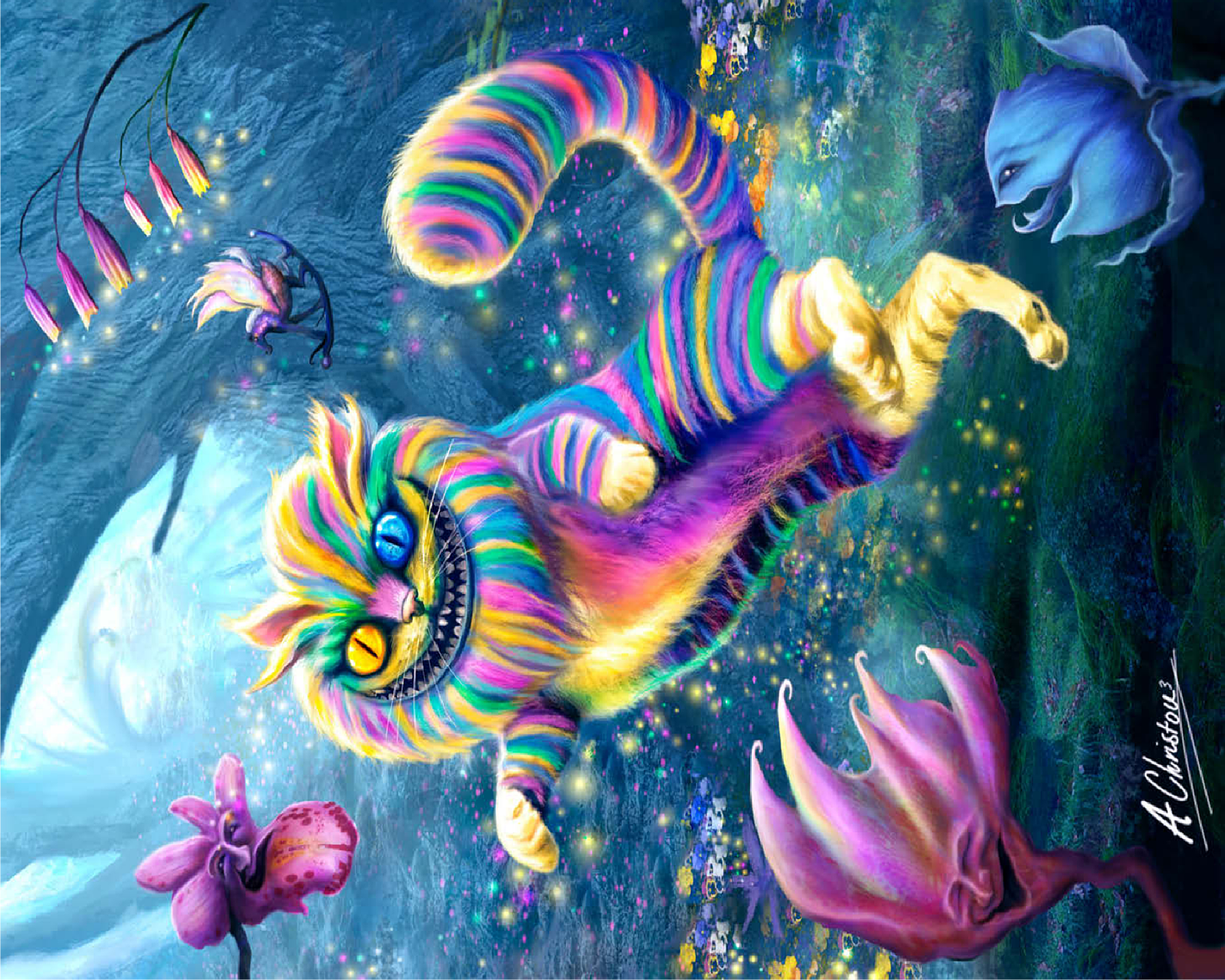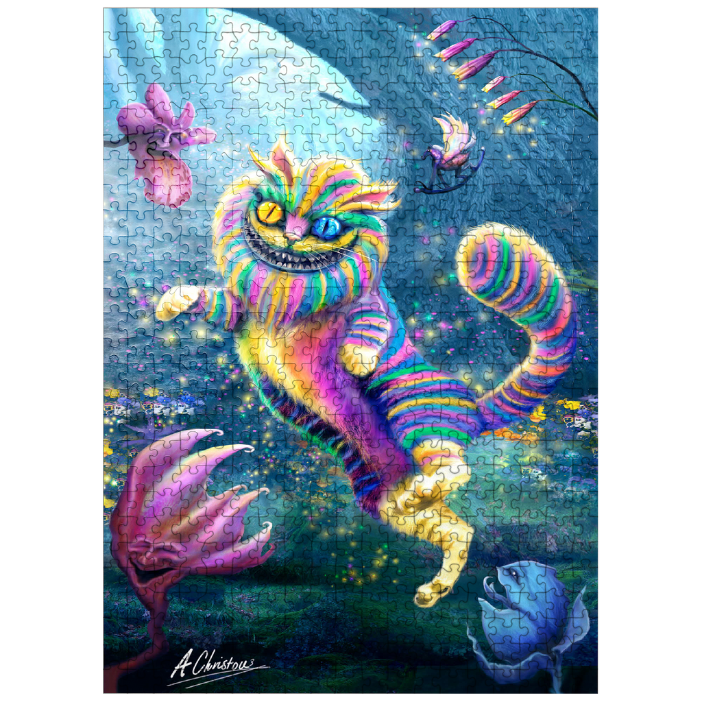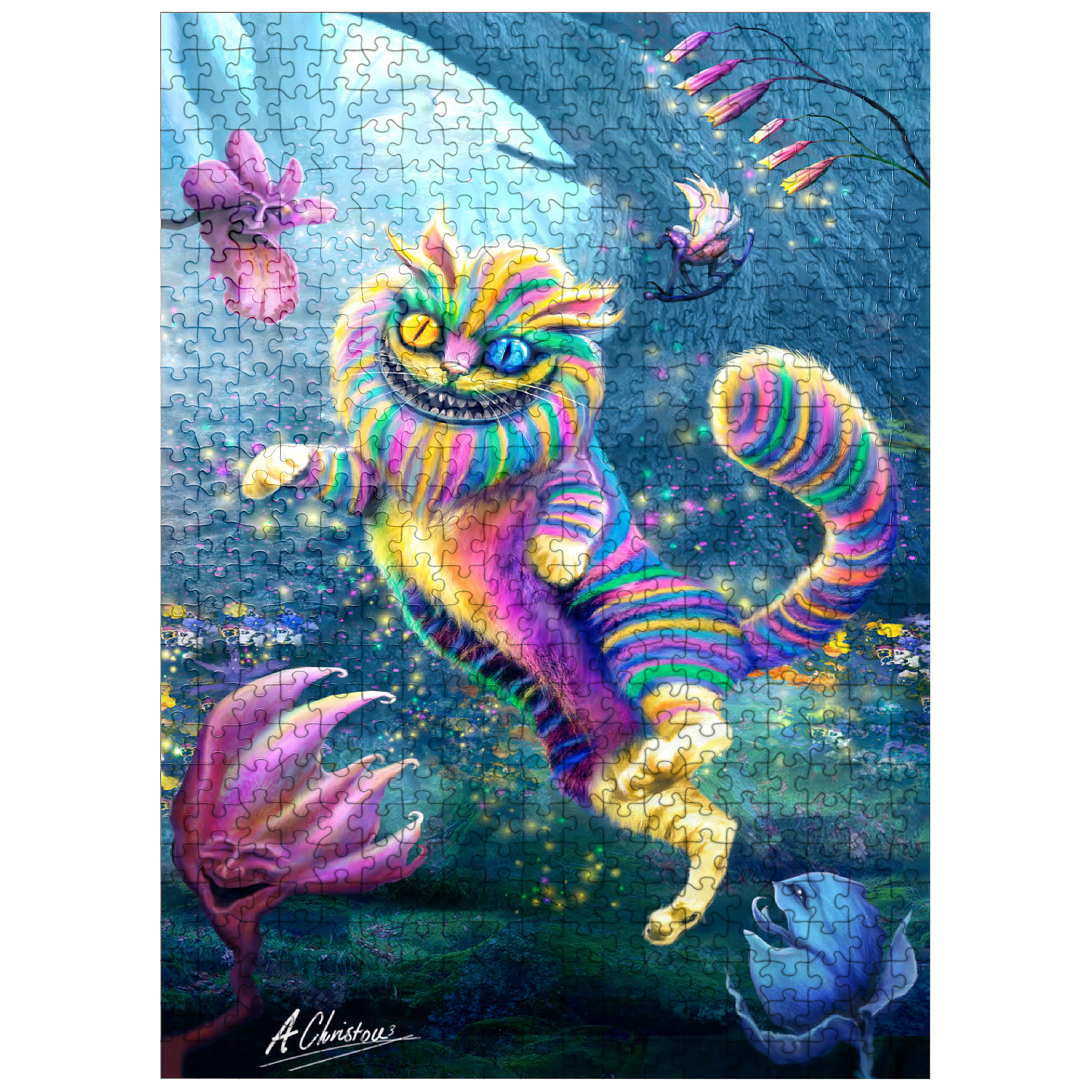 Dive into the vibrant imagination of Anthony Christou with his -Rainbow Cheshire Cat- painting. This enchanting piece features the iconic Cheshire Cat, its form playfully rendered in a cascade of rainbow hues, seemingly floating effortlessly. It resides within a magical blue-lit forest, where mischievous flowers bloom in ethereal light and tiny rocking-horseflies float, adding a touch of sparkling detail. Christou's signature blend of fantasy and surrealism creates a dreamlike atmosphere, making this a truly unique and captivating portrayal of Wonderland's most enigmatic resident. A must-have for collectors who adore vibrant fantasy art.