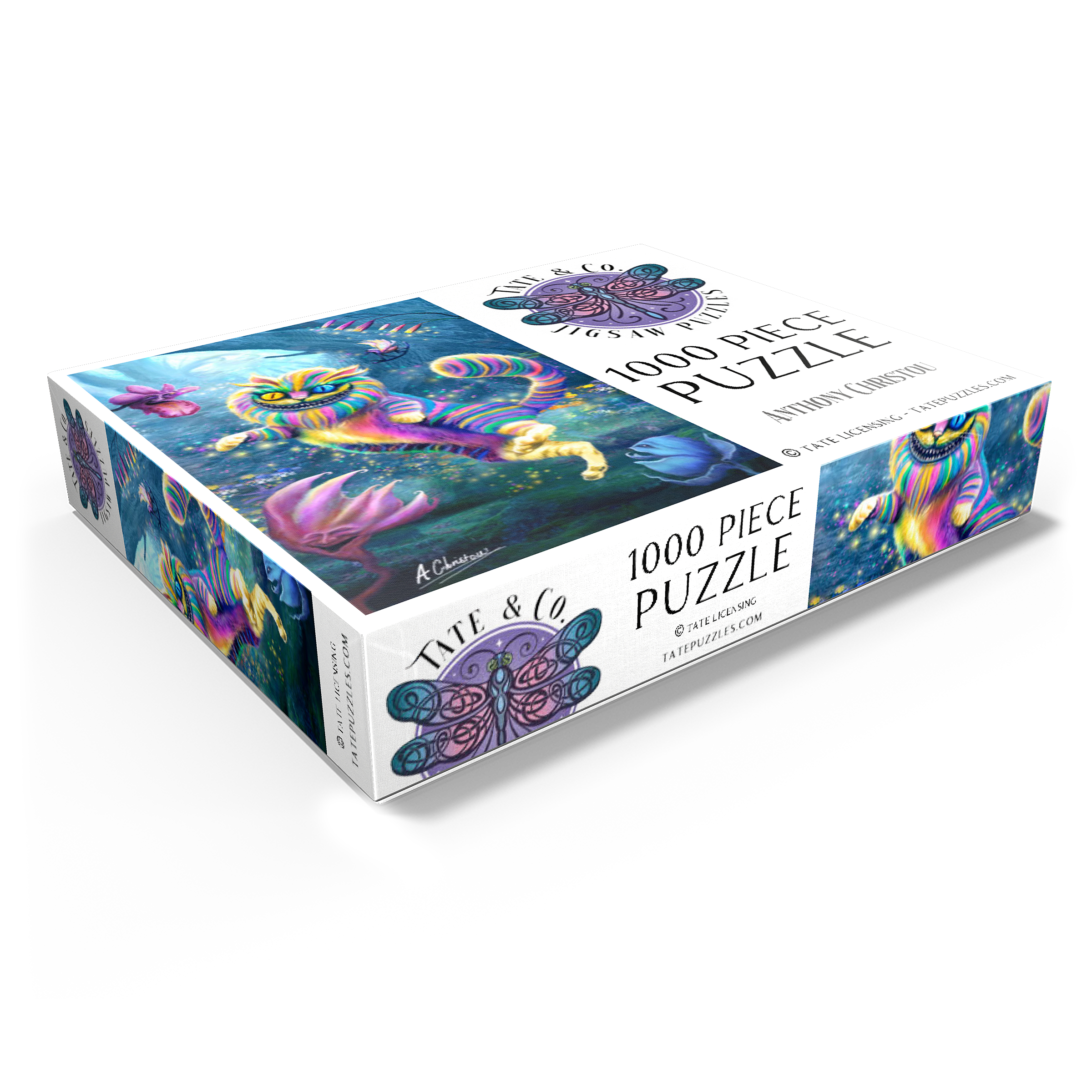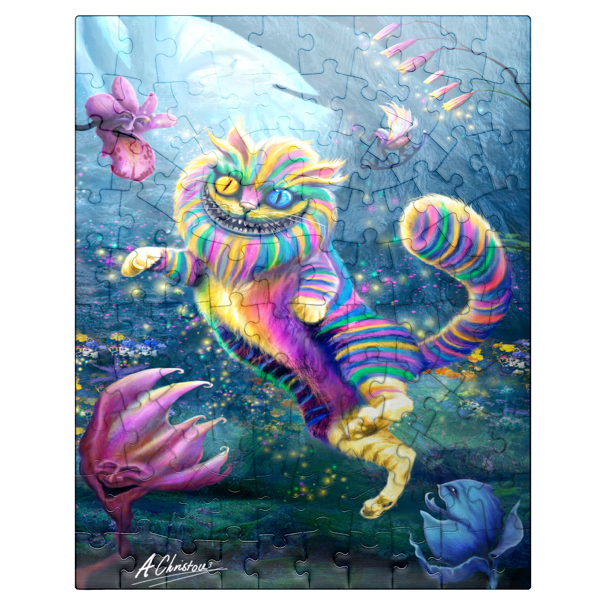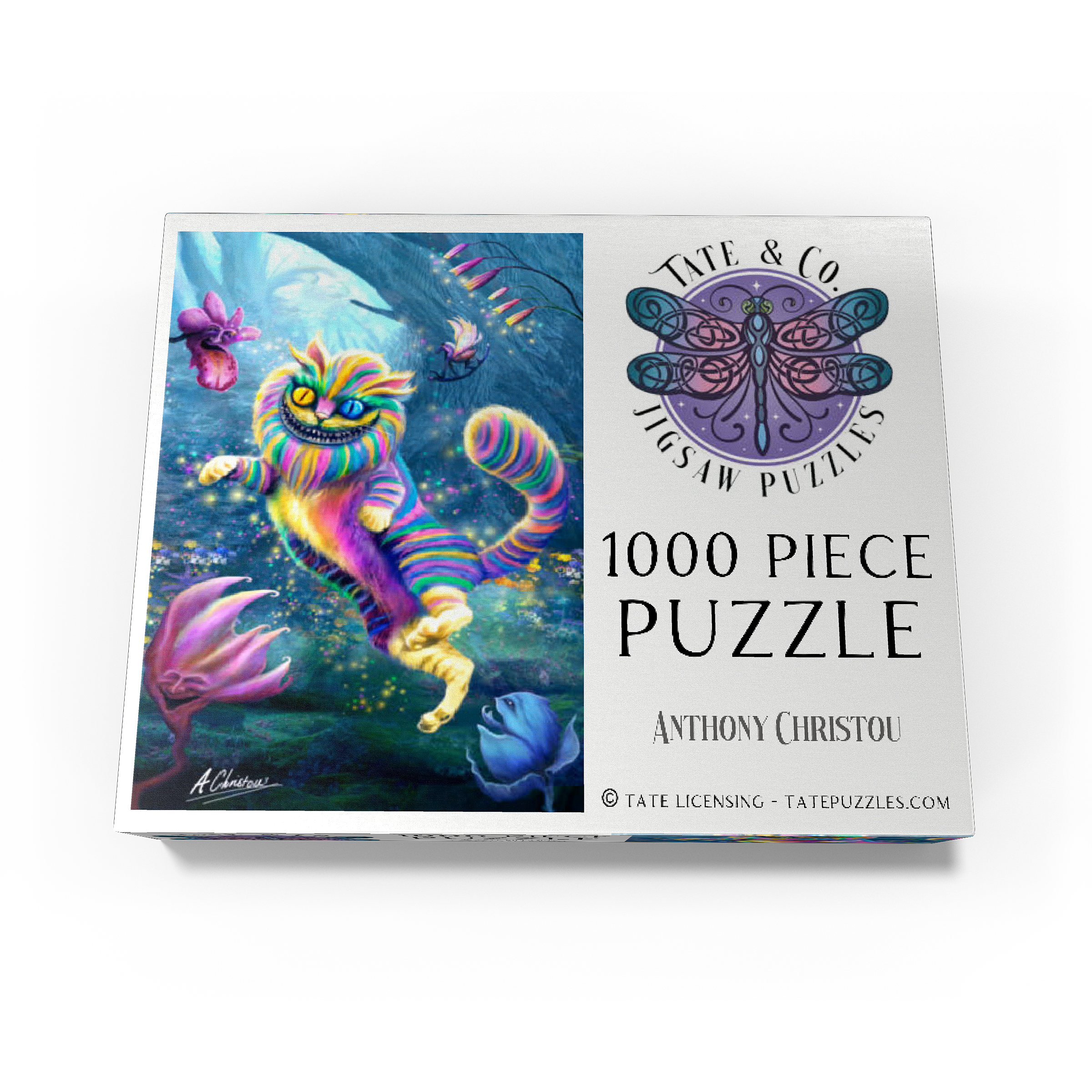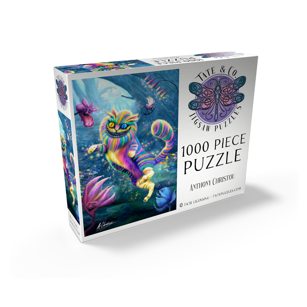Dive into the vibrant imagination of Anthony Christou with his -Rainbow Cheshire Cat- painting. This enchanting piece features the iconic Cheshire Cat, its form playfully rendered in a cascade of rainbow hues, seemingly floating effortlessly. It resides within a magical blue-lit forest, where mischievous flowers bloom in ethereal light and tiny rocking-horseflies float, adding a touch of sparkling detail. Christou's signature blend of fantasy and surrealism creates a dreamlike atmosphere, making this a truly unique and captivating portrayal of Wonderland's most enigmatic resident. A must-have for collectors who adore vibrant fantasy art.