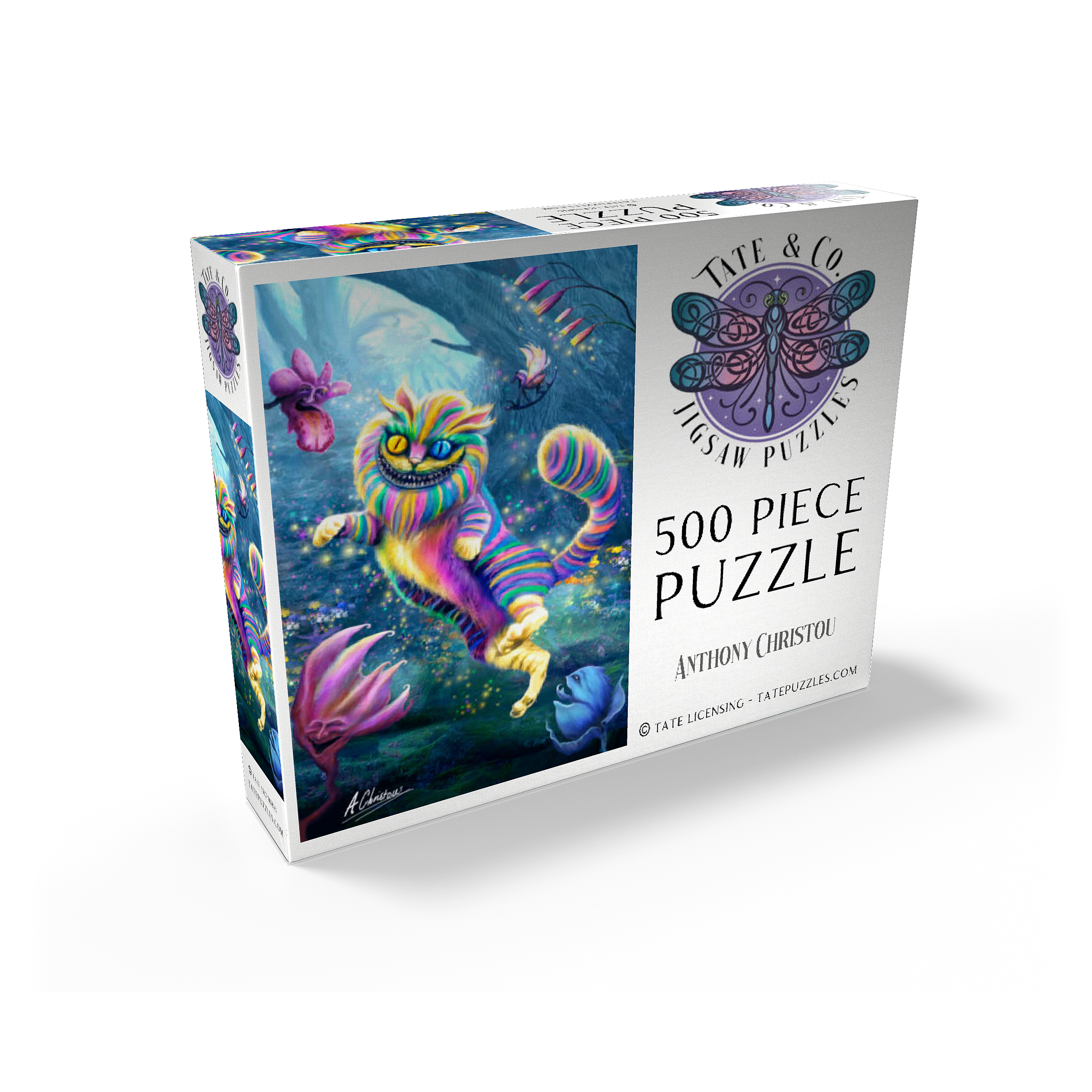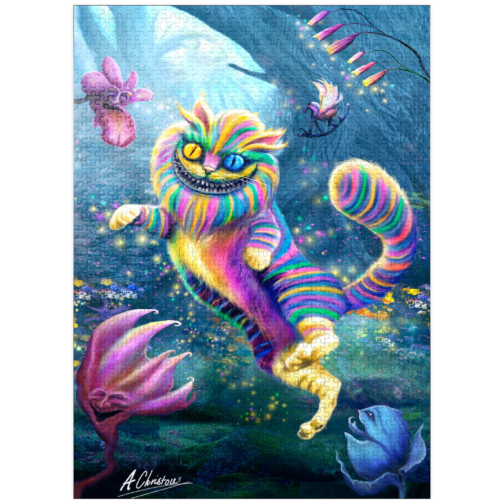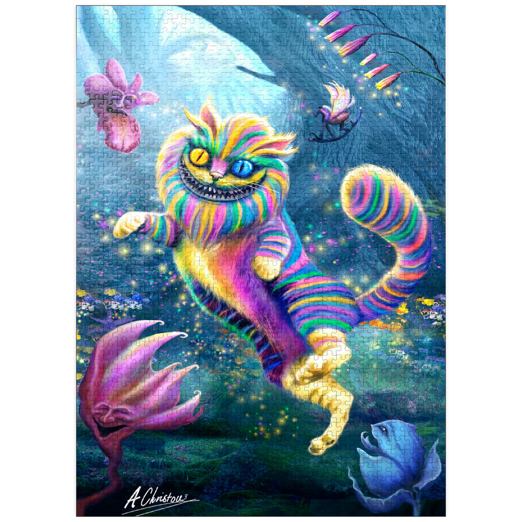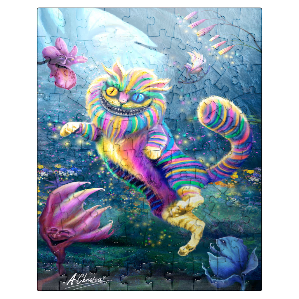 Dive into the vibrant imagination of Anthony Christou with his -Rainbow Cheshire Cat- painting. This enchanting piece features the iconic Cheshire Cat, its form playfully rendered in a cascade of rainbow hues, seemingly floating effortlessly. It resides within a magical blue-lit forest, where mischievous flowers bloom in ethereal light and tiny rocking-horseflies float, adding a touch of sparkling detail. Christou's signature blend of fantasy and surrealism creates a dreamlike atmosphere, making this a truly unique and captivating portrayal of Wonderland's most enigmatic resident. A must-have for collectors who adore vibrant fantasy art.