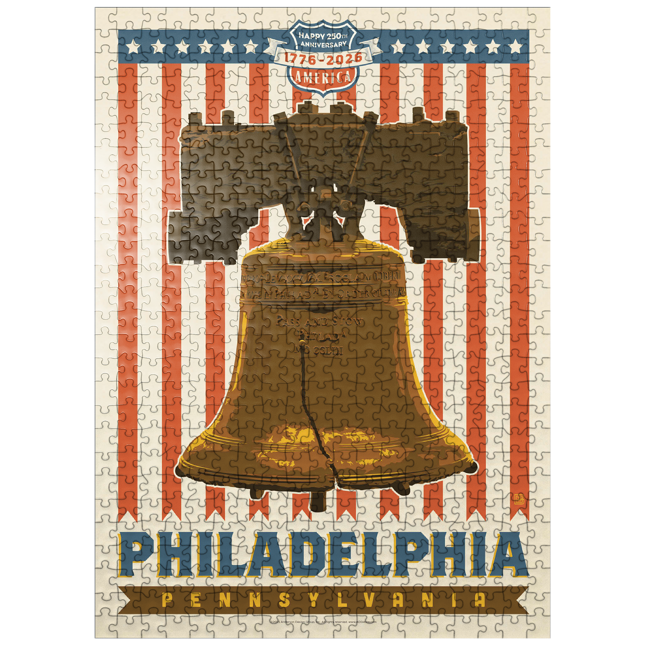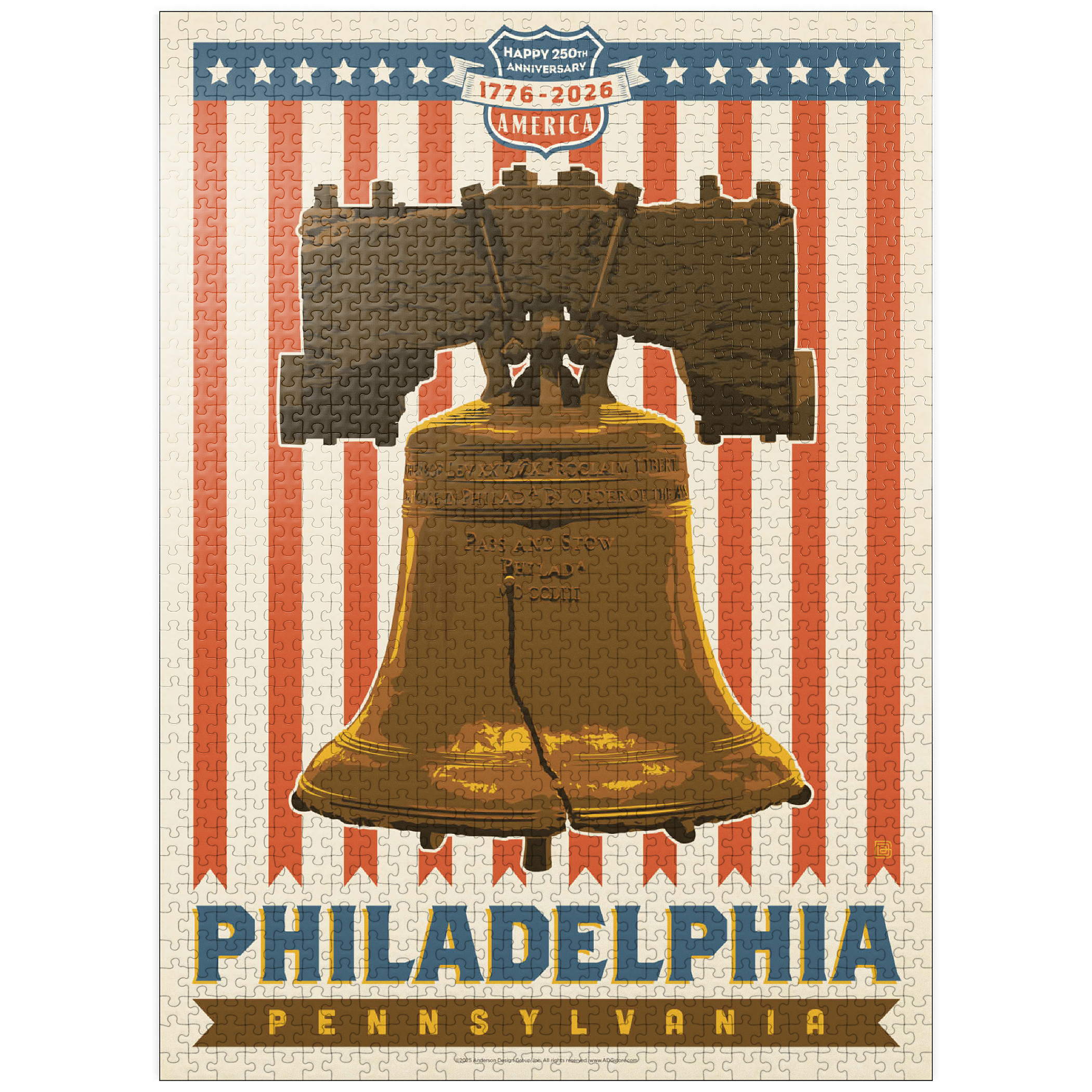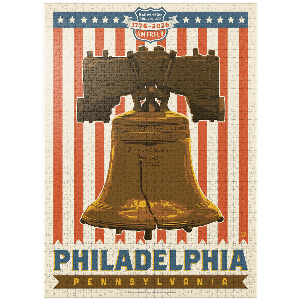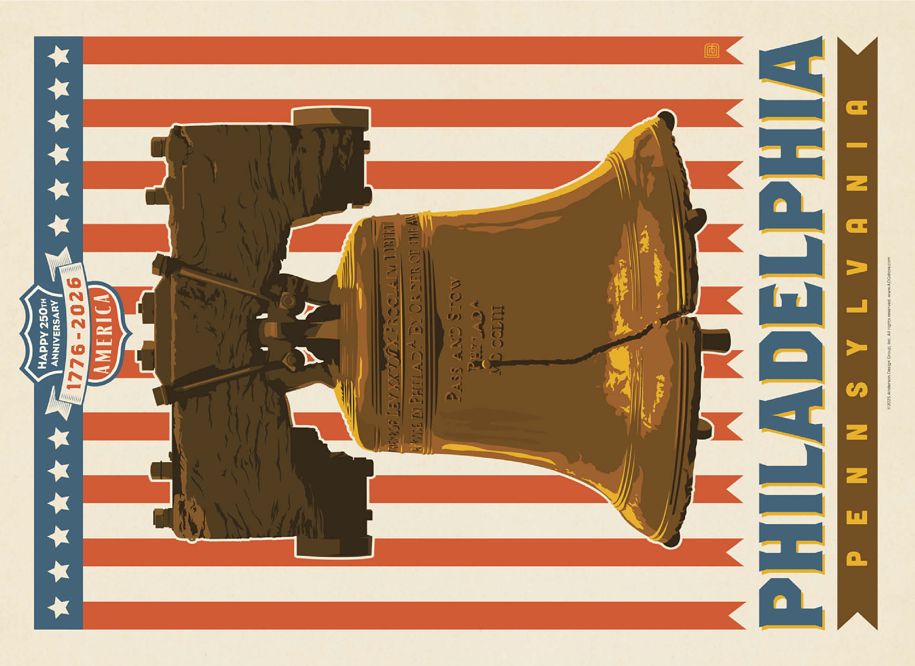 Philadelphia, Pennsylvania is powerfully illustrated with the iconic Liberty Bell set against a bold red-and-white striped background celebrating America's 250th anniversary, 1776-2026. The cracked bronze bell, a timeless symbol of freedom and independence, stands prominently as a tribute to the nation's founding spirit. The patriotic design combines vintage Americana style with historic reverence, honoring Philadelphia's legacy as the birthplace of American liberty. This depiction captures the essence of national pride and unity, showcasing one of the most recognizable landmarks in U.S. history in a vibrant commemorative design.