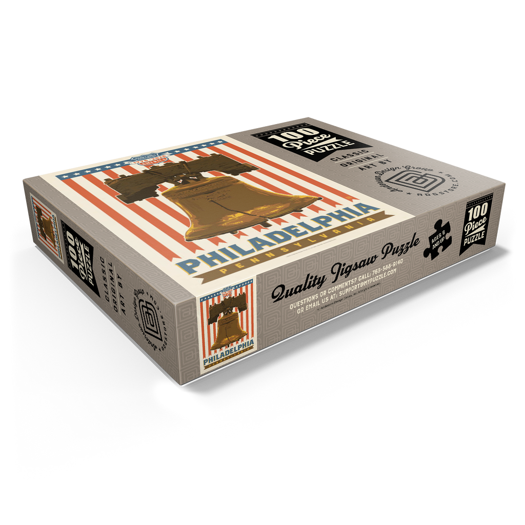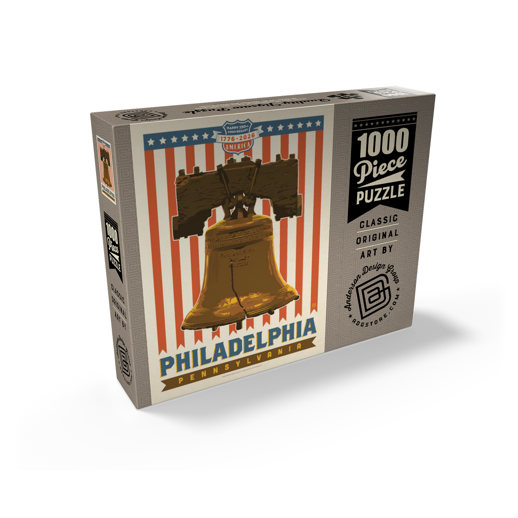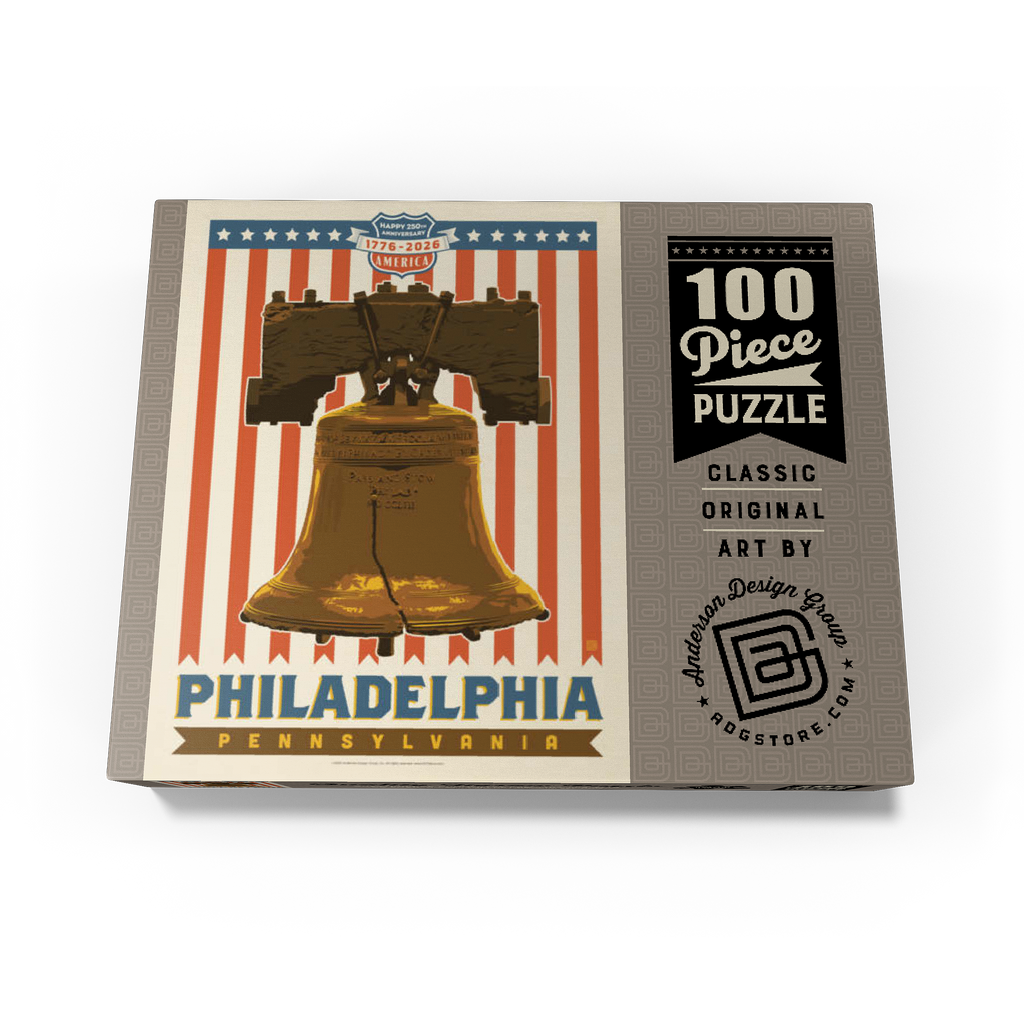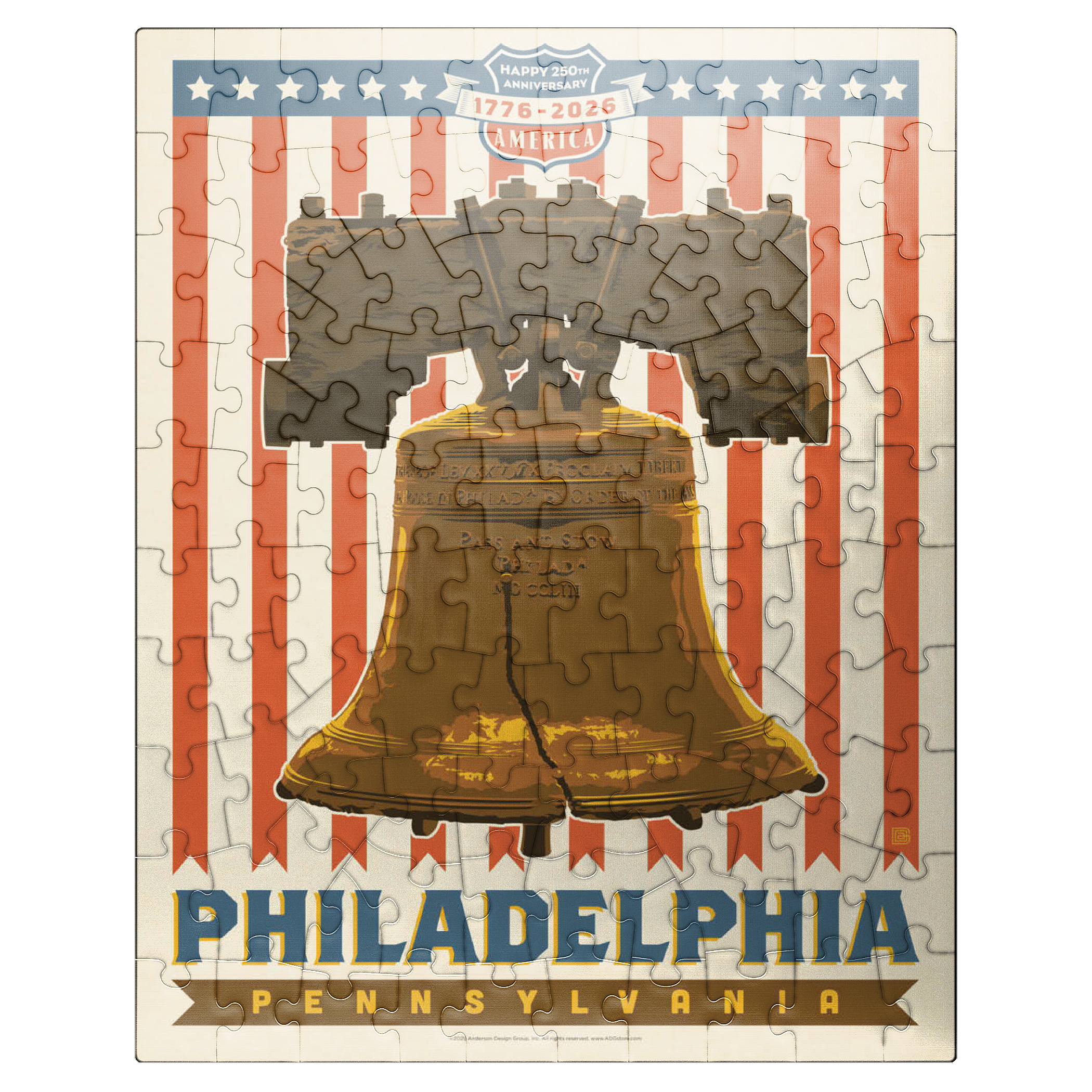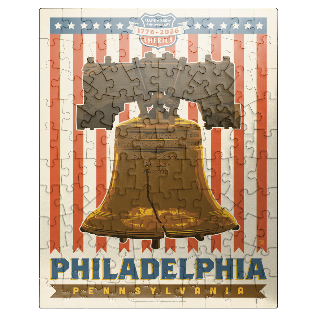Philadelphia, Pennsylvania is powerfully illustrated with the iconic Liberty Bell set against a bold red-and-white striped background celebrating America's 250th anniversary, 1776-2026. The cracked bronze bell, a timeless symbol of freedom and independence, stands prominently as a tribute to the nation's founding spirit. The patriotic design combines vintage Americana style with historic reverence, honoring Philadelphia's legacy as the birthplace of American liberty. This depiction captures the essence of national pride and unity, showcasing one of the most recognizable landmarks in U.S. history in a vibrant commemorative design.