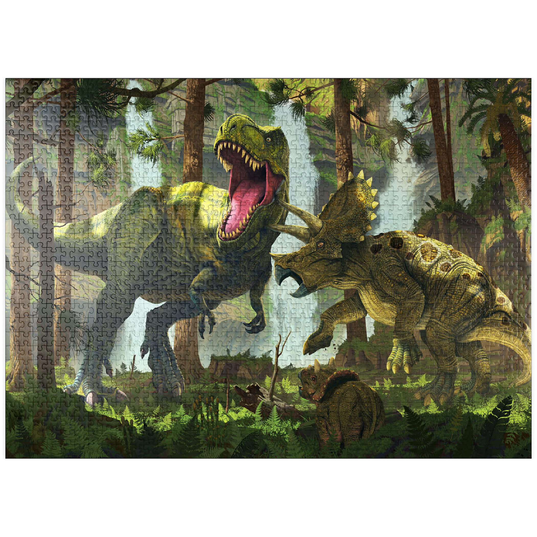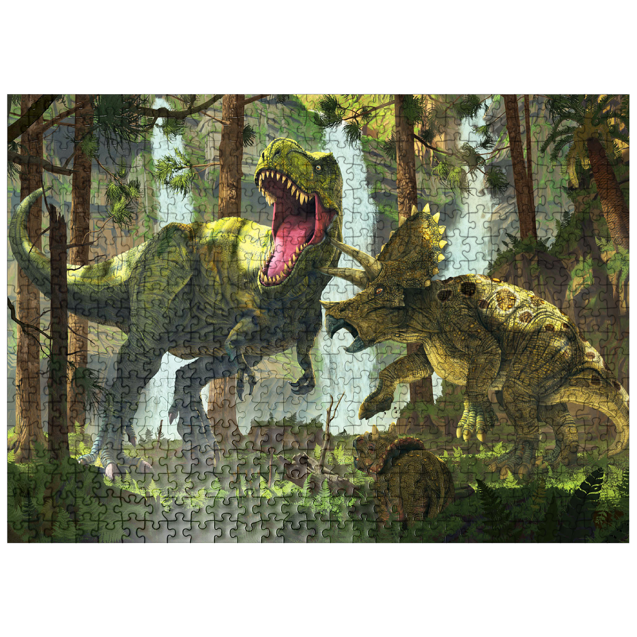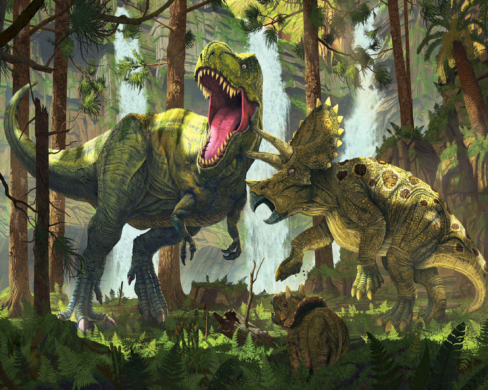 The artwork depicts a dramatic scene in a prehistoric forest. A Tyrannosaurus Rex, its jaws open in a roar, is attacked by a mother Triceratops, defending her offspring. The young Triceratops cub is visible in the lower foreground, seemingly observing the standoff. Waterfalls are visible in the background, adding to the lush and vibrant atmosphere of the prehistoric setting. The overall impression is one of primal conflict within a dense, verdant environment.
