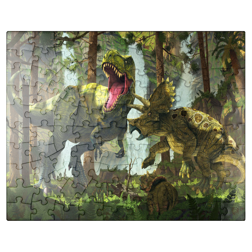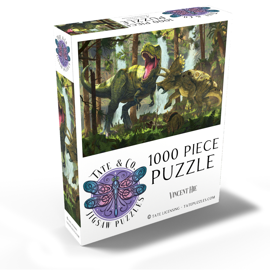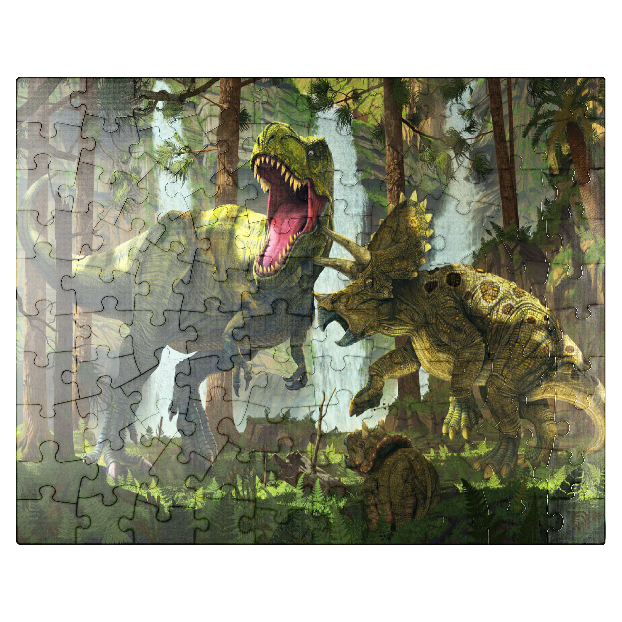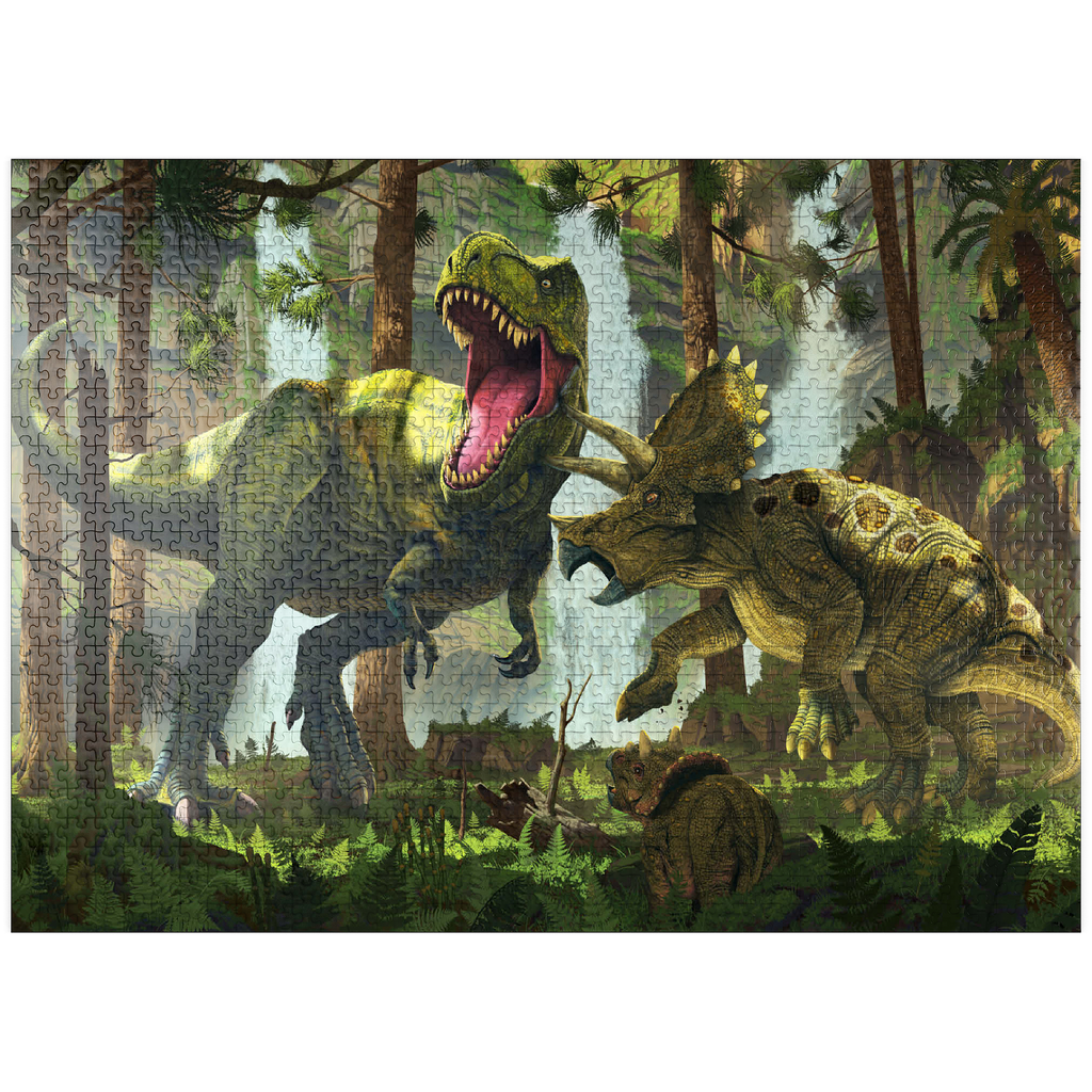 The artwork depicts a dramatic scene in a prehistoric forest. A Tyrannosaurus Rex, its jaws open in a roar, is attacked by a mother Triceratops, defending her offspring. The young Triceratops cub is visible in the lower foreground, seemingly observing the standoff. Waterfalls are visible in the background, adding to the lush and vibrant atmosphere of the prehistoric setting. The overall impression is one of primal conflict within a dense, verdant environment.
