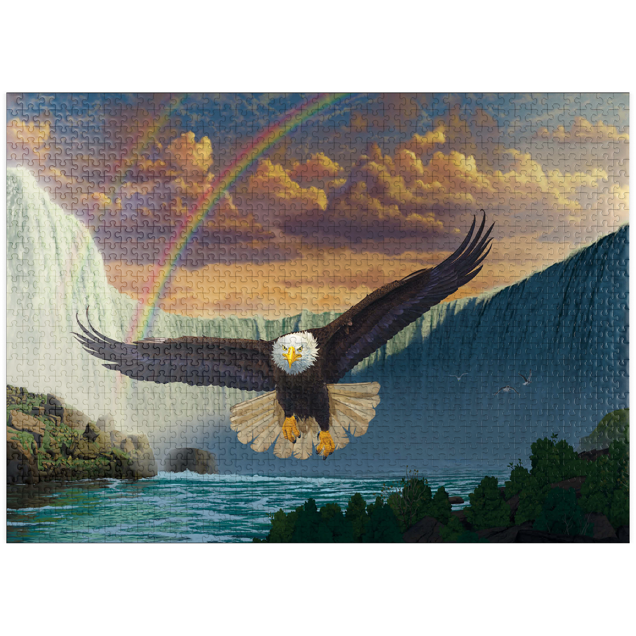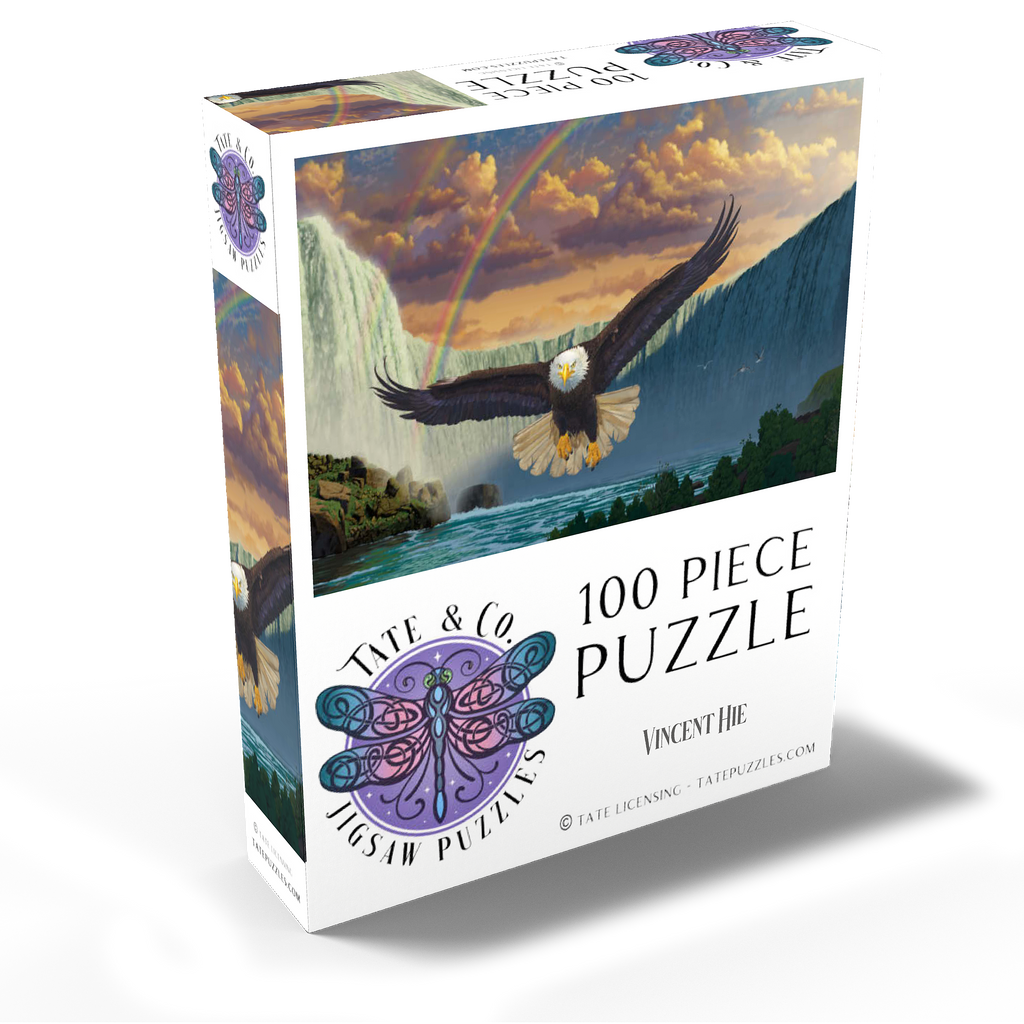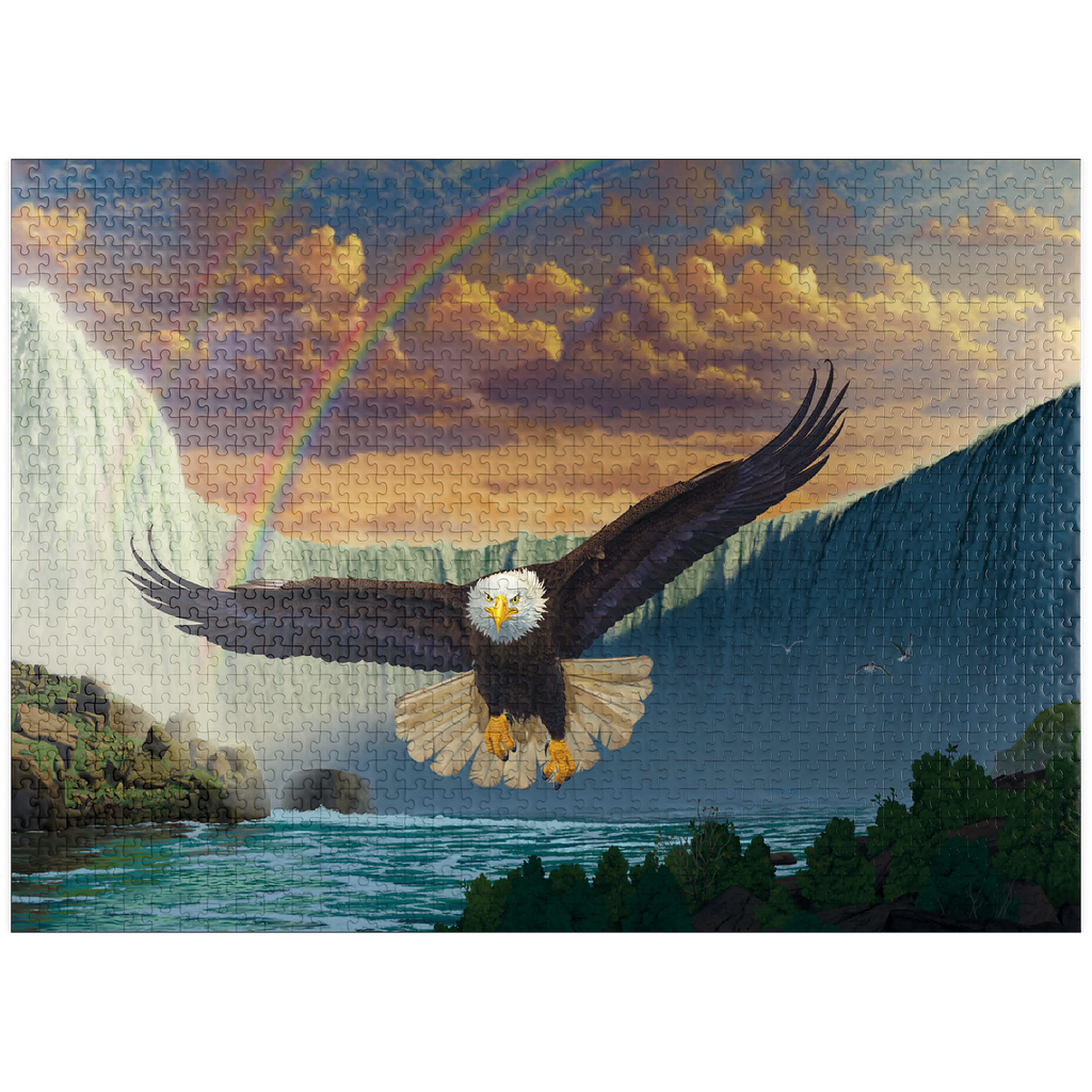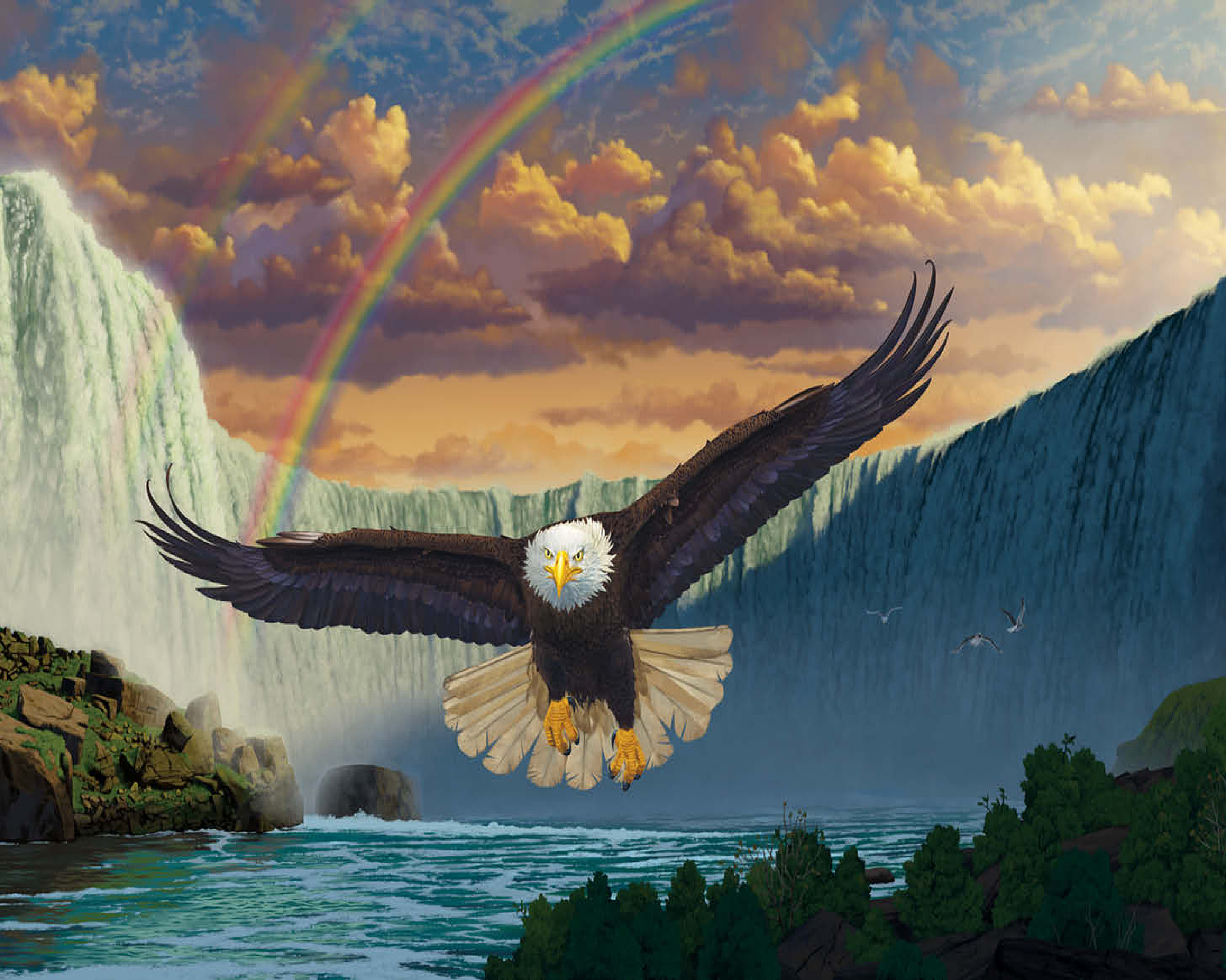 This artwork depicts a majestic bald eagle in flight, positioned in front of a breathtaking double rainbow arcing over the powerful Niagara Falls. the eagle appears strong and powerful, its gaze directed forward. the waterfall dominates the background, flanked by dramatic cliffs and lush vegetation. the overall scene evokes a sense of awe and wonder