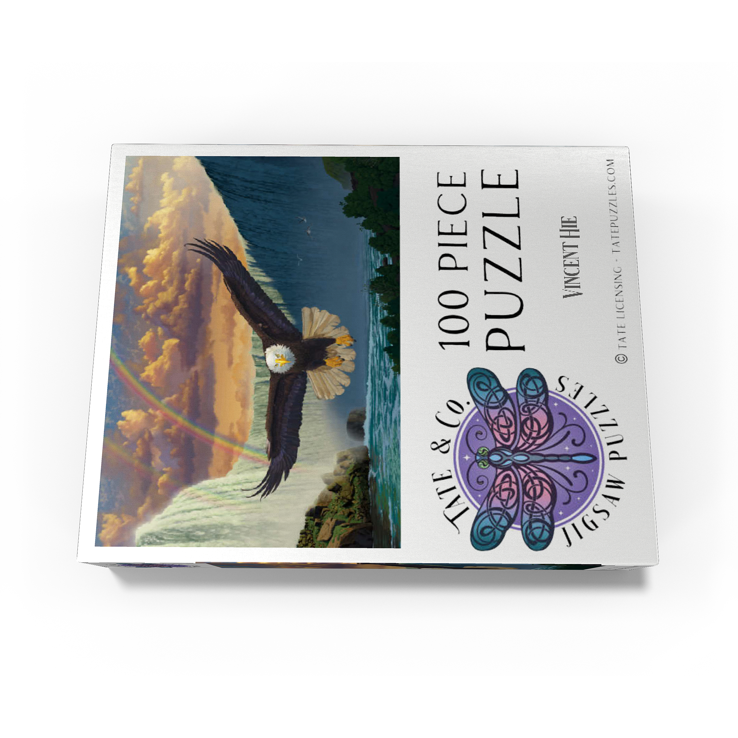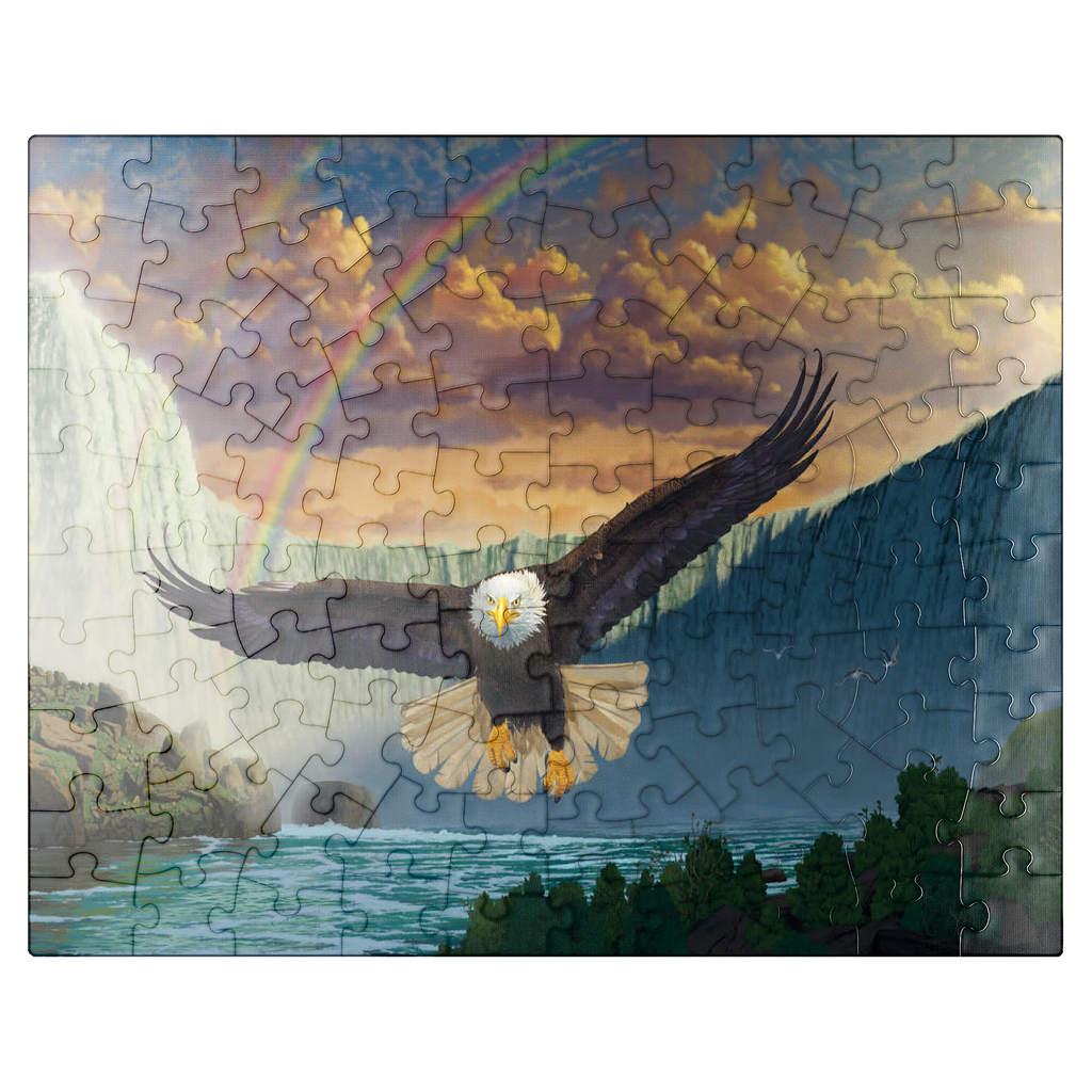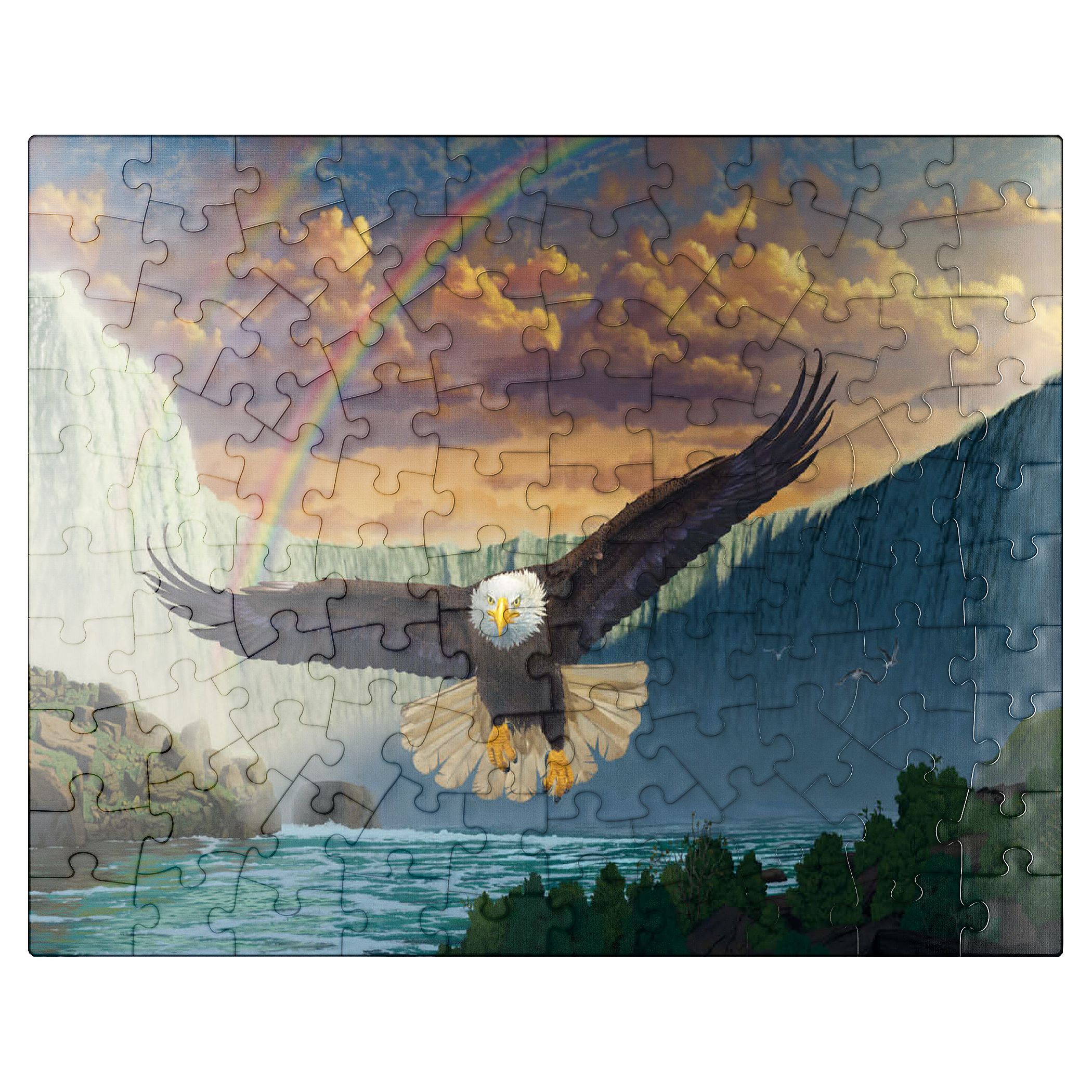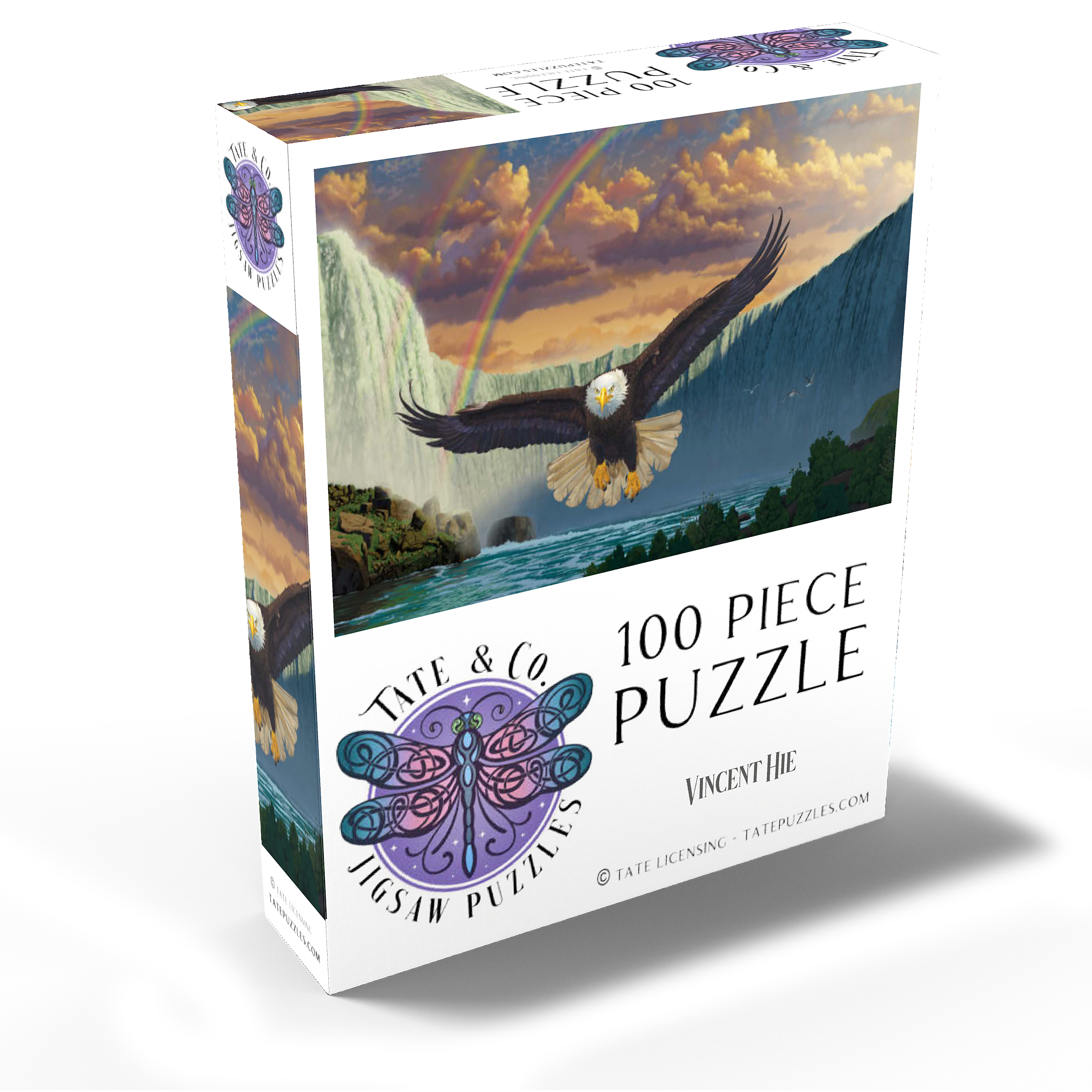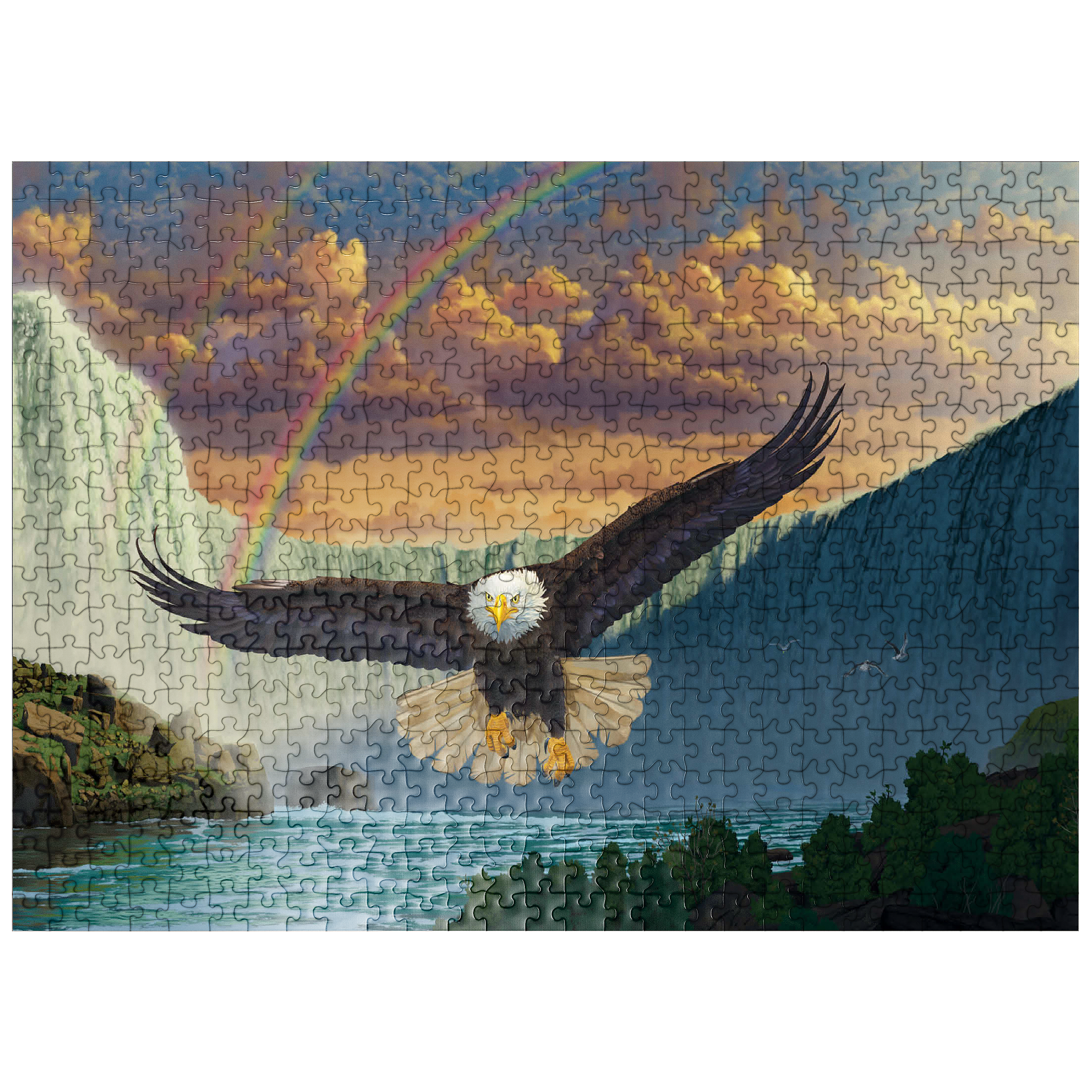 This artwork depicts a majestic bald eagle in flight, positioned in front of a breathtaking double rainbow arcing over the powerful Niagara Falls. the eagle appears strong and powerful, its gaze directed forward. the waterfall dominates the background, flanked by dramatic cliffs and lush vegetation. the overall scene evokes a sense of awe and wonder
