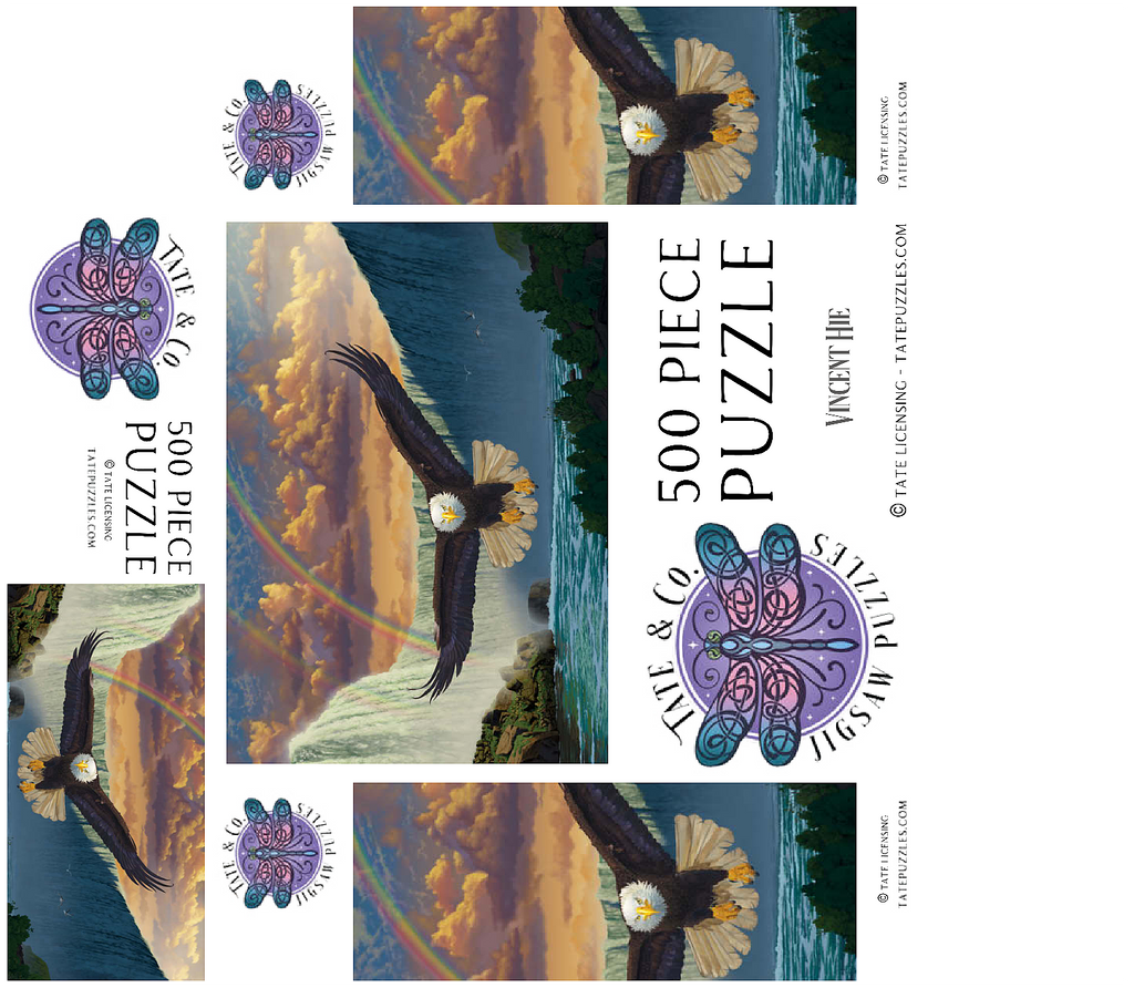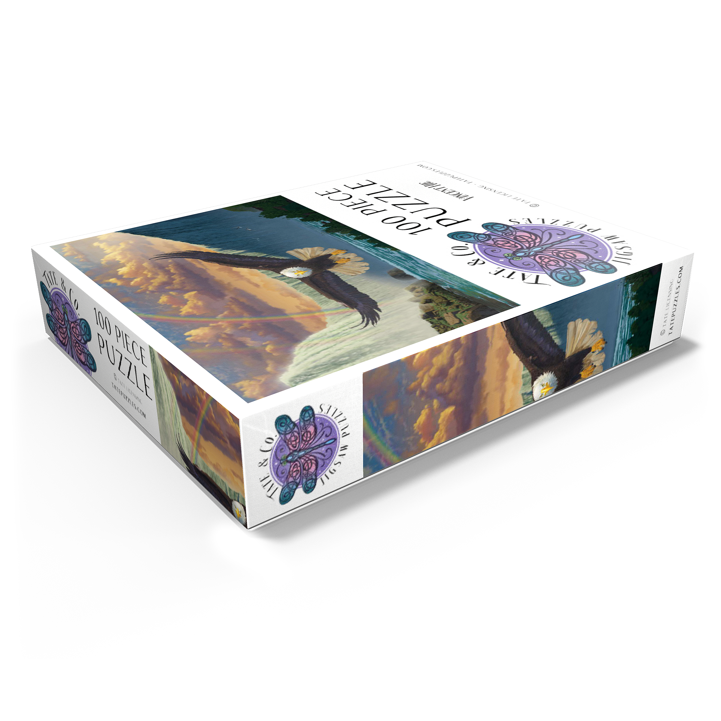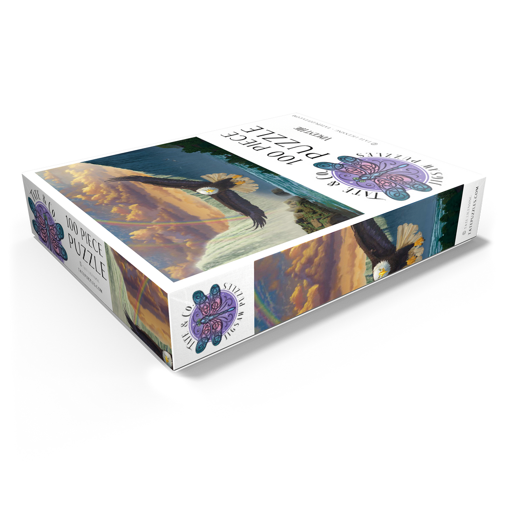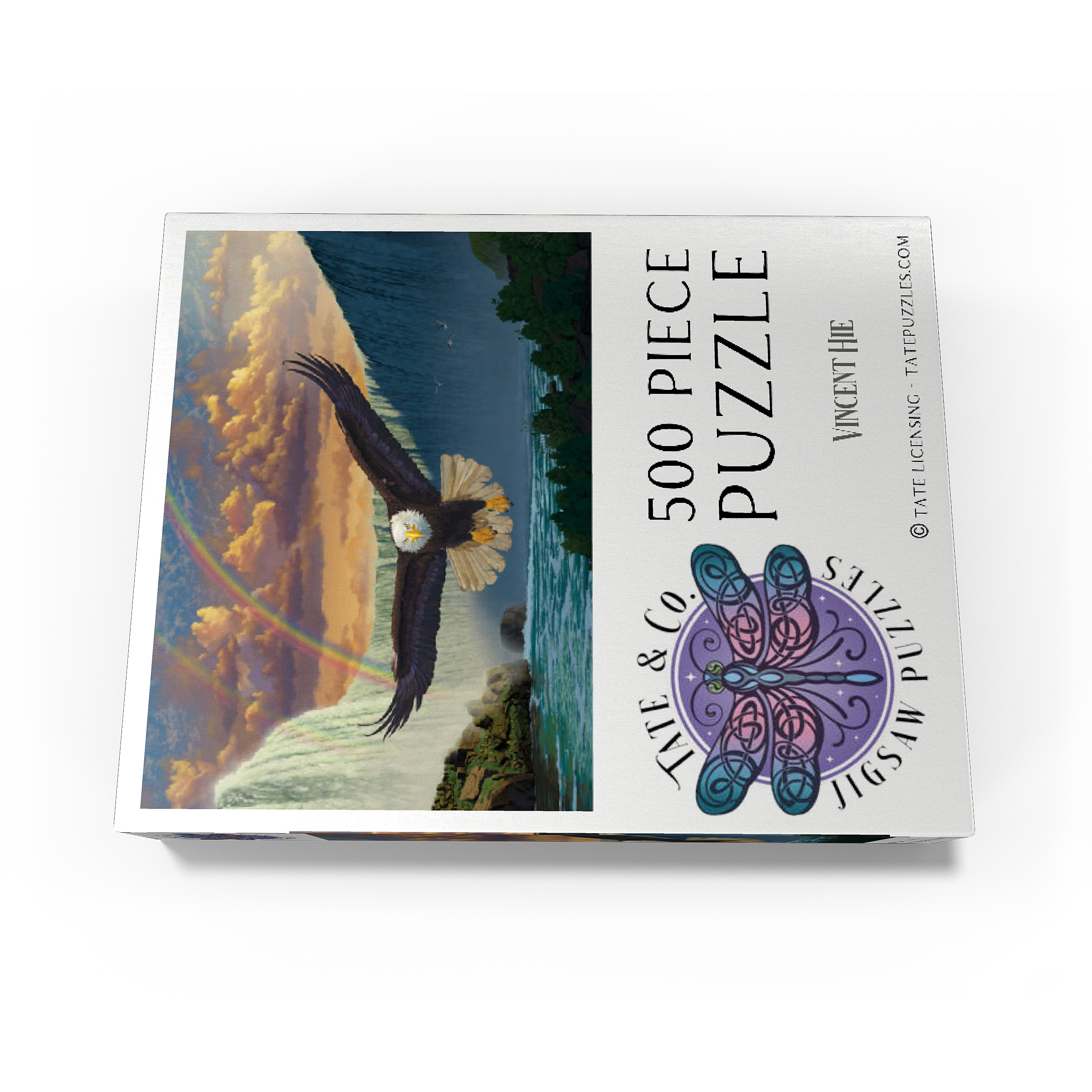 This artwork depicts a majestic bald eagle in flight, positioned in front of a breathtaking double rainbow arcing over the powerful Niagara Falls. the eagle appears strong and powerful, its gaze directed forward. the waterfall dominates the background, flanked by dramatic cliffs and lush vegetation. the overall scene evokes a sense of awe and wonder