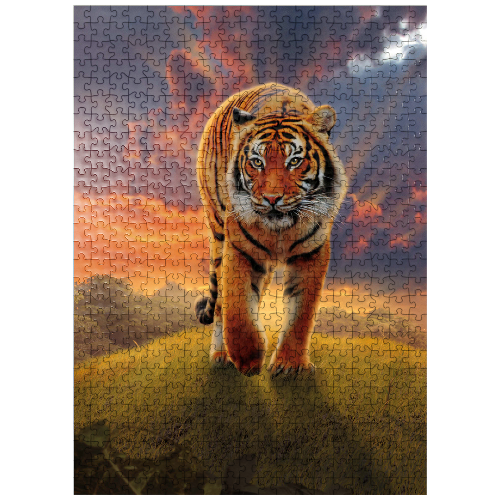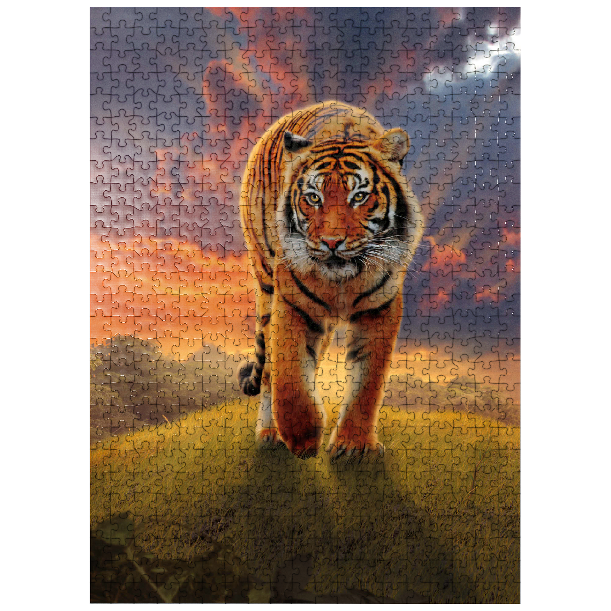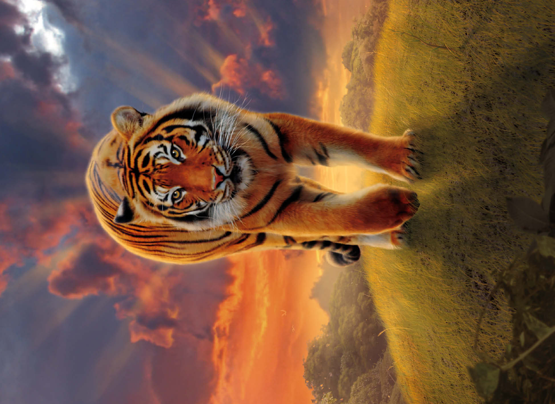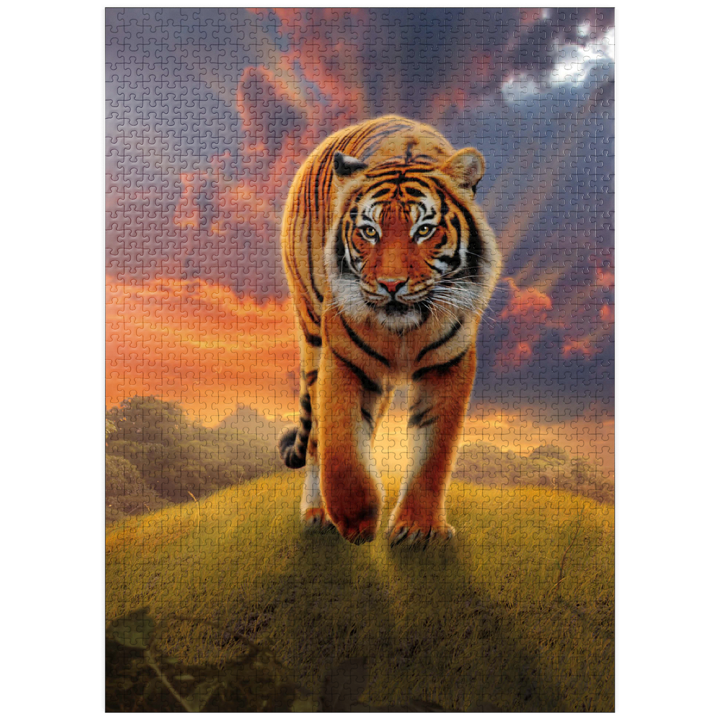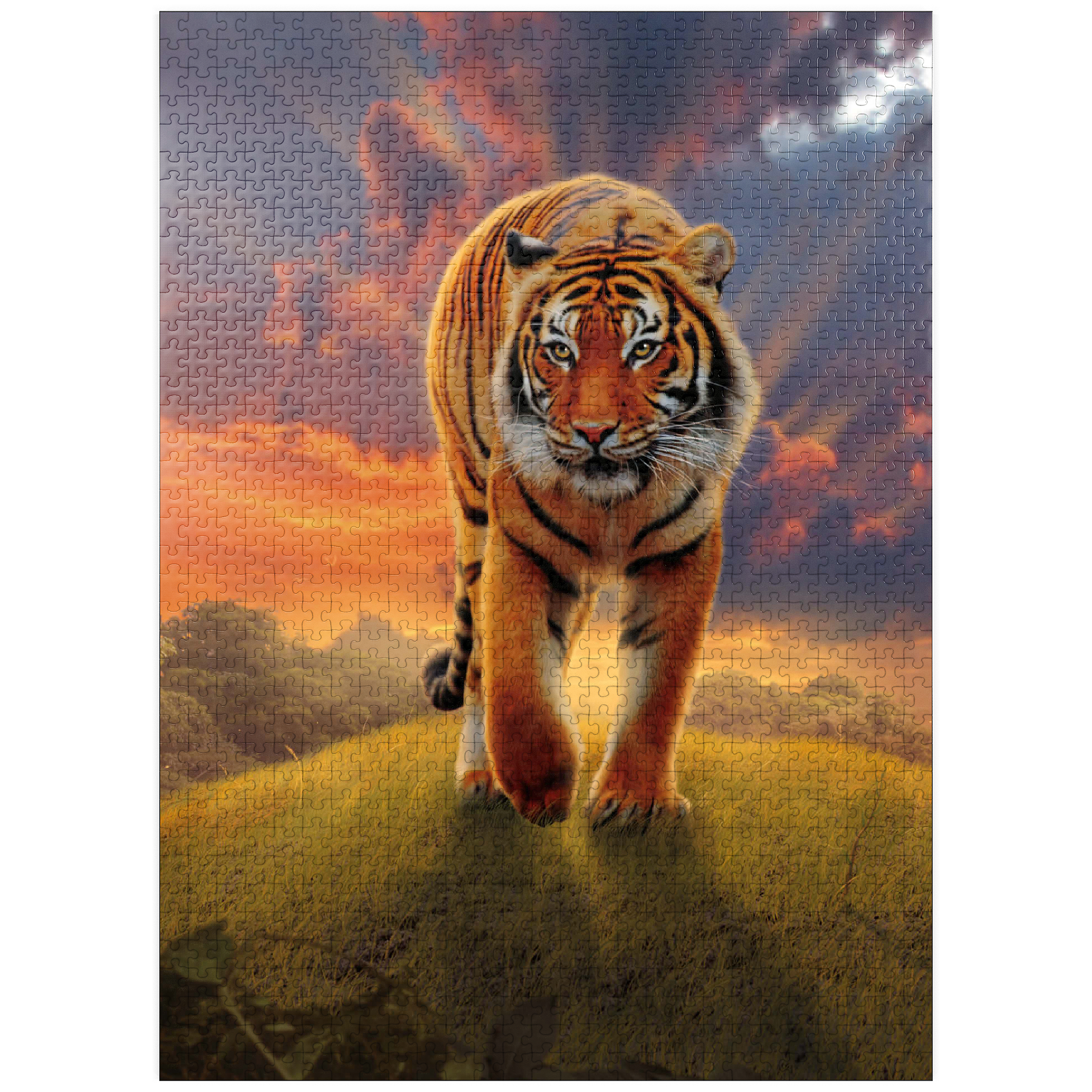 The image depicts a majestic tiger walking towards the viewer on a grassy hilltop. The background is a dramatic sunset sky with vibrant oranges, reds, and purples, creating a mood of both power and serenity. The overall composition is designed to be visually striking, emphasizing the tiger's beauty and strength against a backdrop of natural splendor.