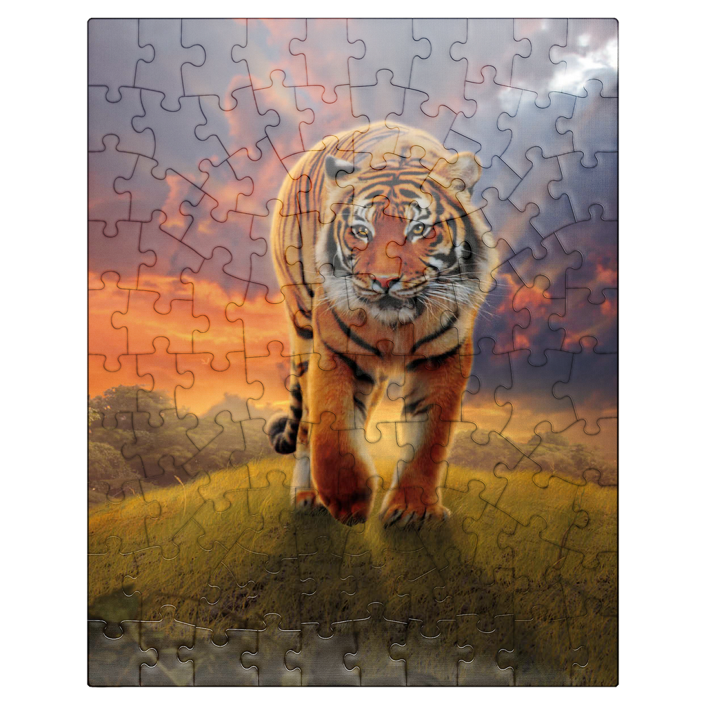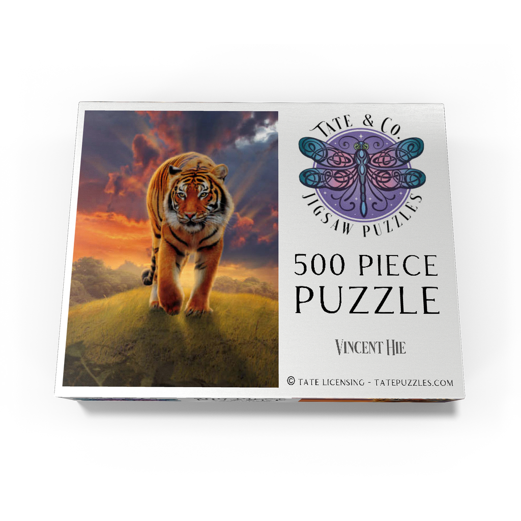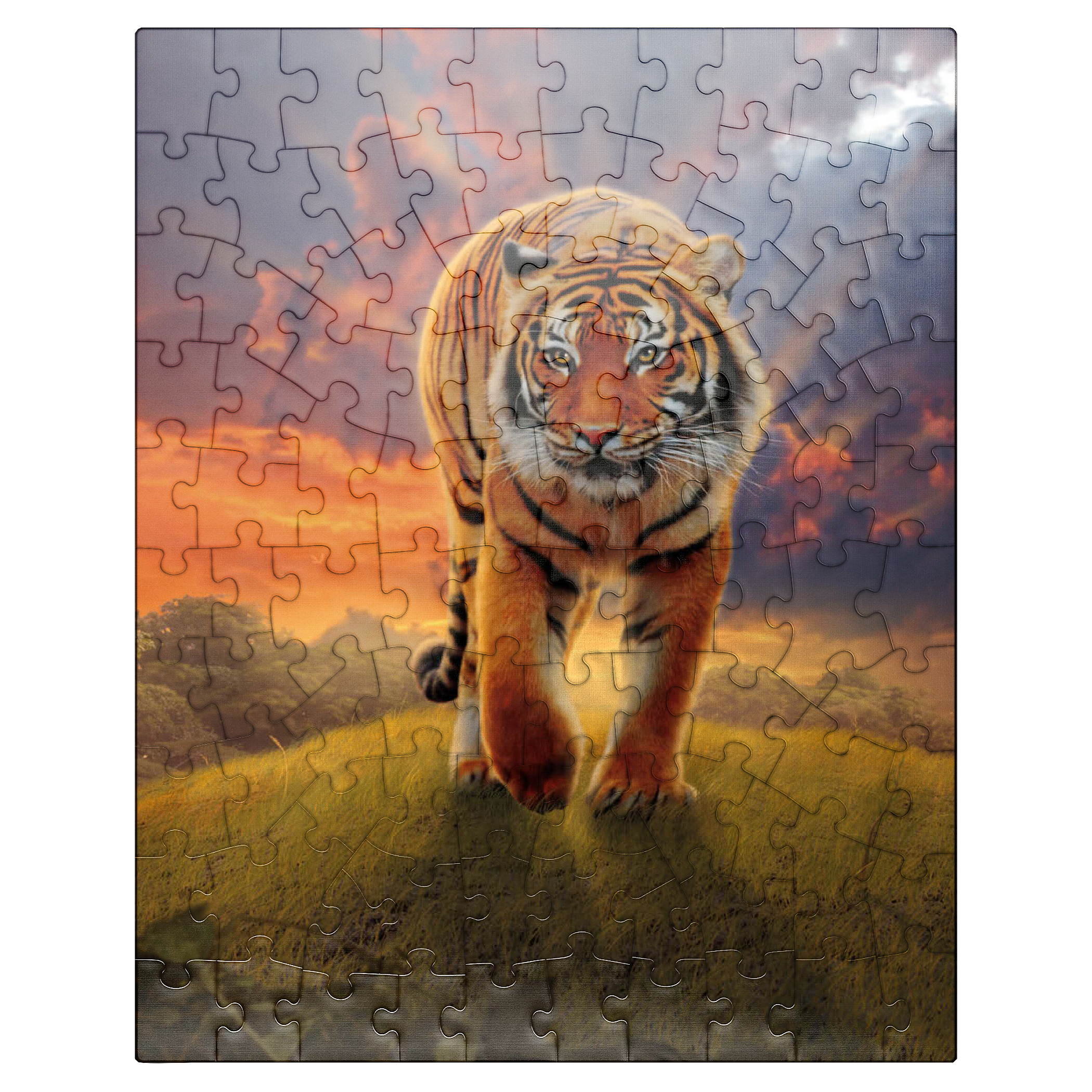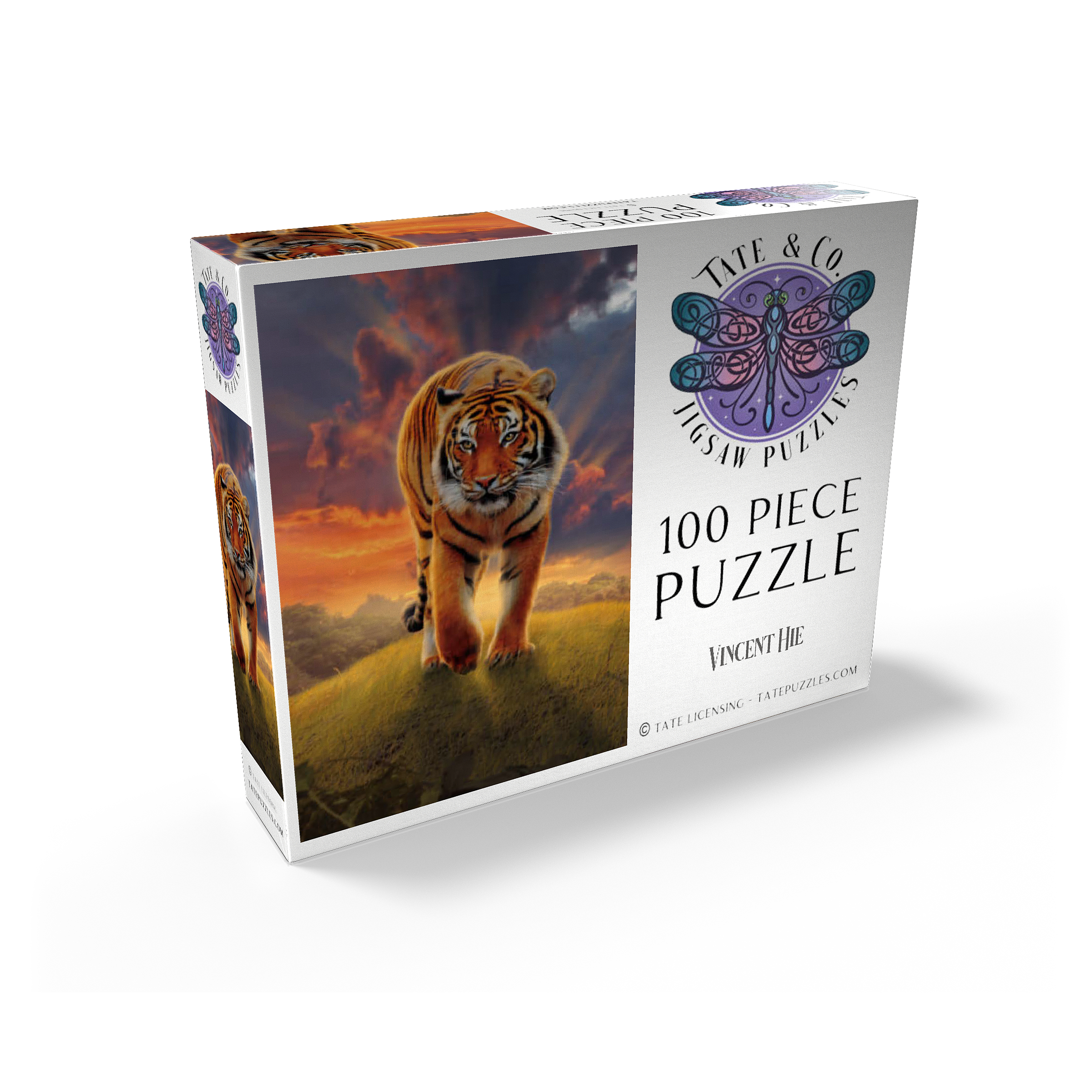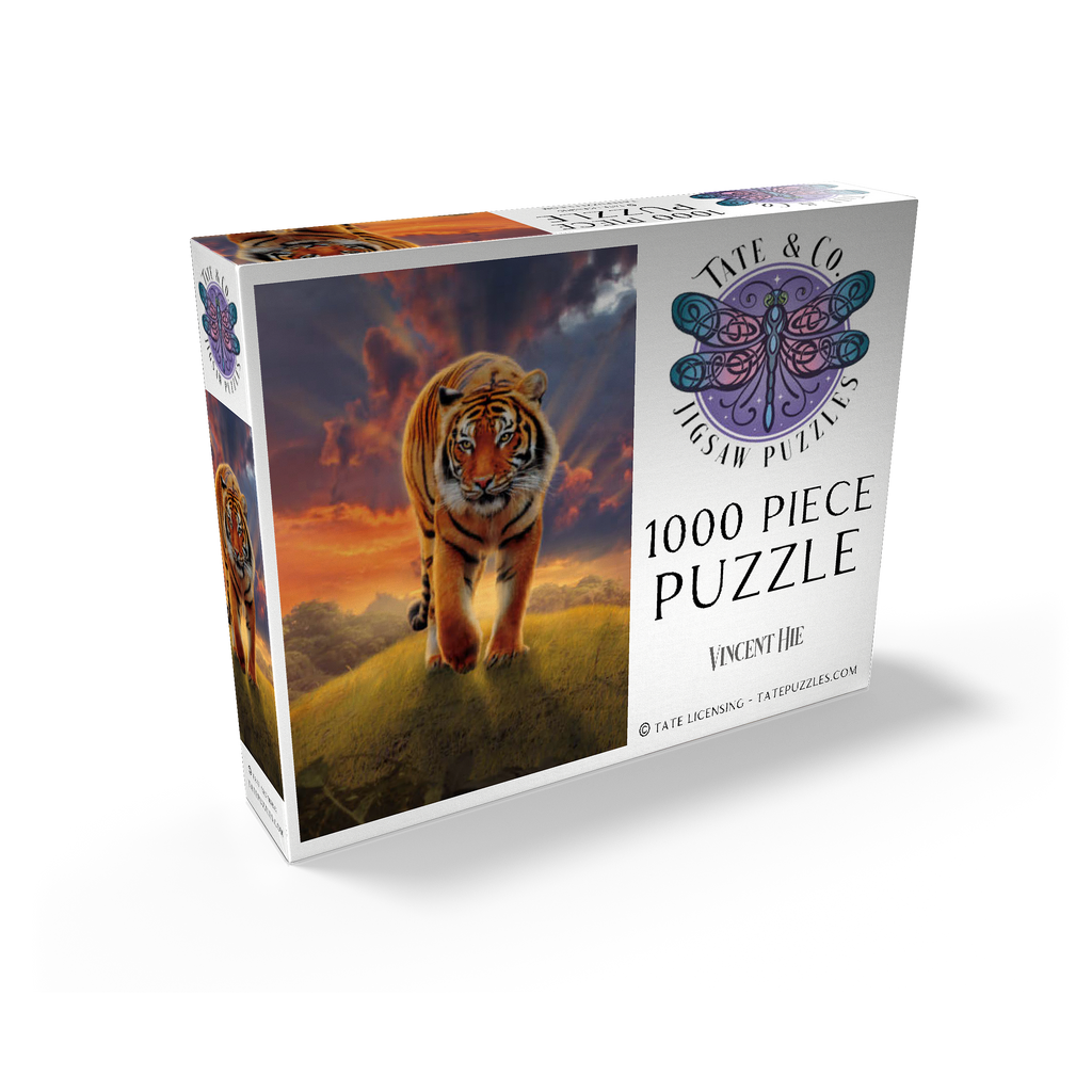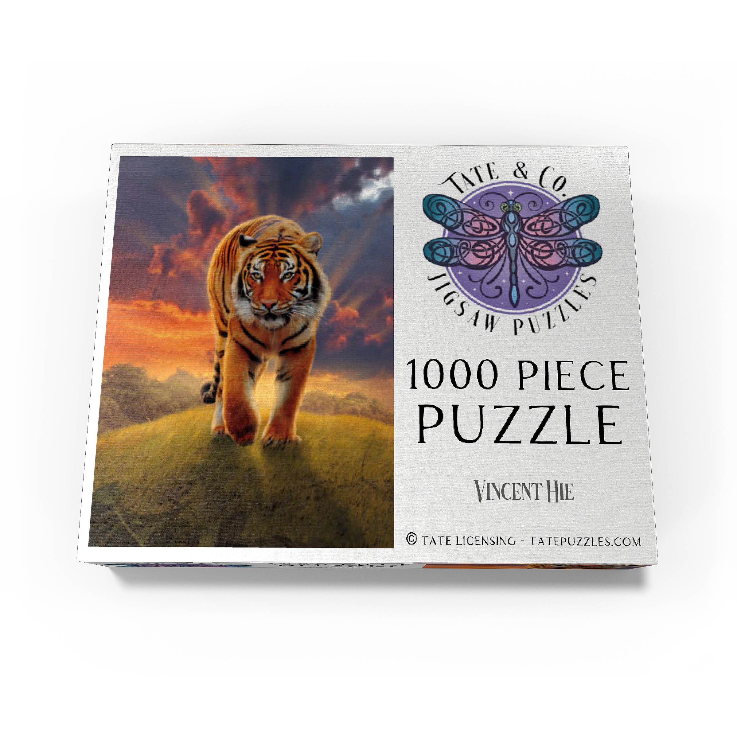 The image depicts a majestic tiger walking towards the viewer on a grassy hilltop. The background is a dramatic sunset sky with vibrant oranges, reds, and purples, creating a mood of both power and serenity. The overall composition is designed to be visually striking, emphasizing the tiger's beauty and strength against a backdrop of natural splendor.