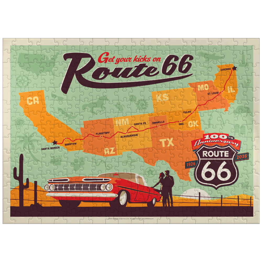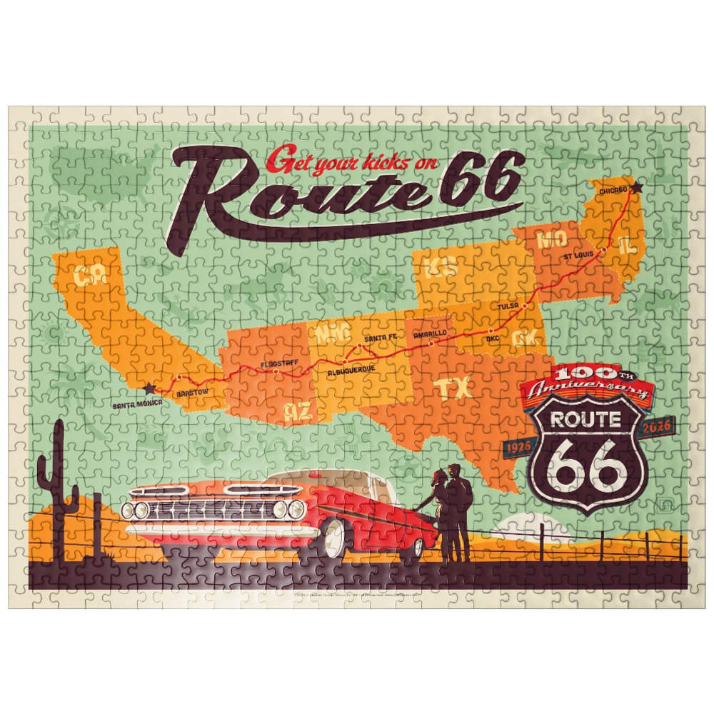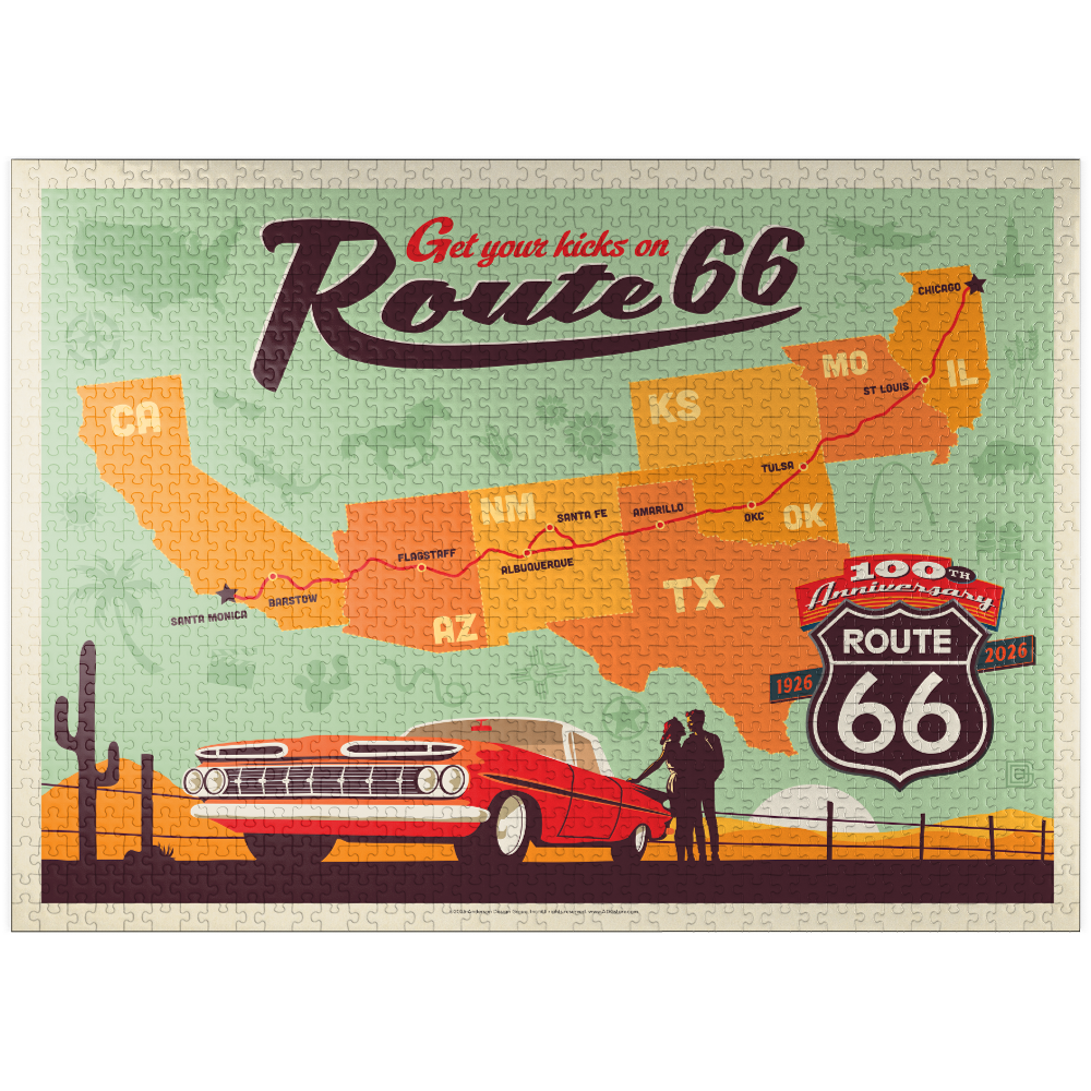Route 66 from Chicago Illinois to Santa Monica California is featured in a vintage style centennial travel map celebrating the 100th Anniversary of Americas most iconic highway, established in 1926 and honored in 2026. The design traces the classic Route 66 corridor across Illinois Missouri Kansas Oklahoma Texas New Mexico Arizona and California, highlighting famous stops such as St Louis Tulsa Oklahoma City Amarillo Albuquerque Santa Fe Flagstaff and Barstow. Warm desert tones, a classic convertible, and roadside silhouettes evoke nostalgic American road trip vibes, Southwest scenery, and historic highway culture, making it ideal for Route 66 lovers, USA travel decor, and classic Americana wall art searches.