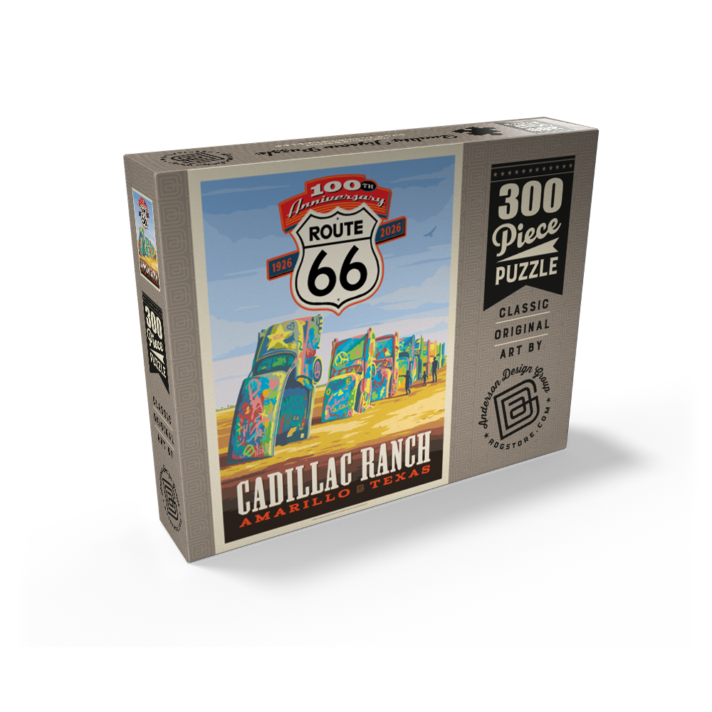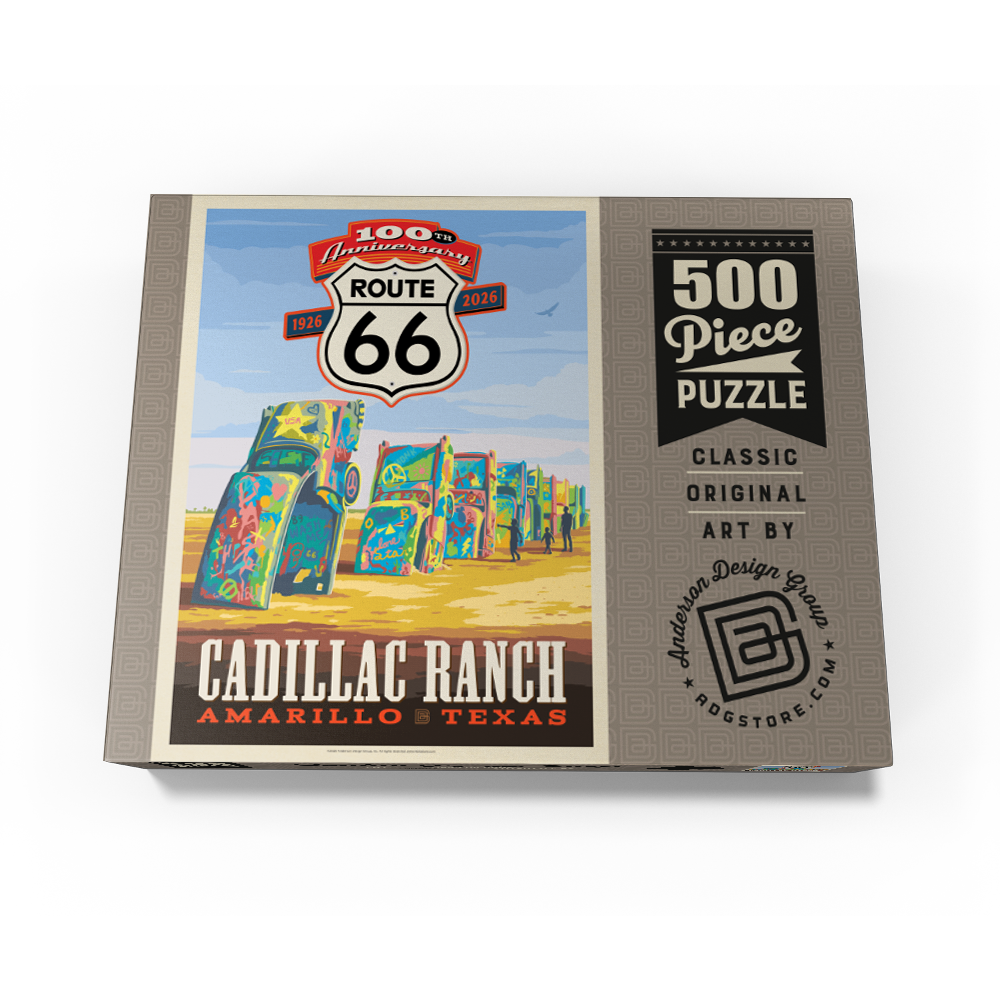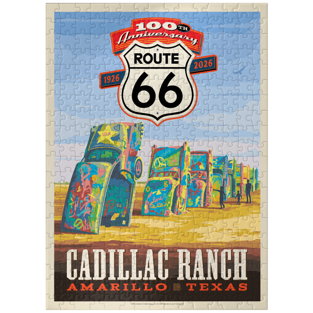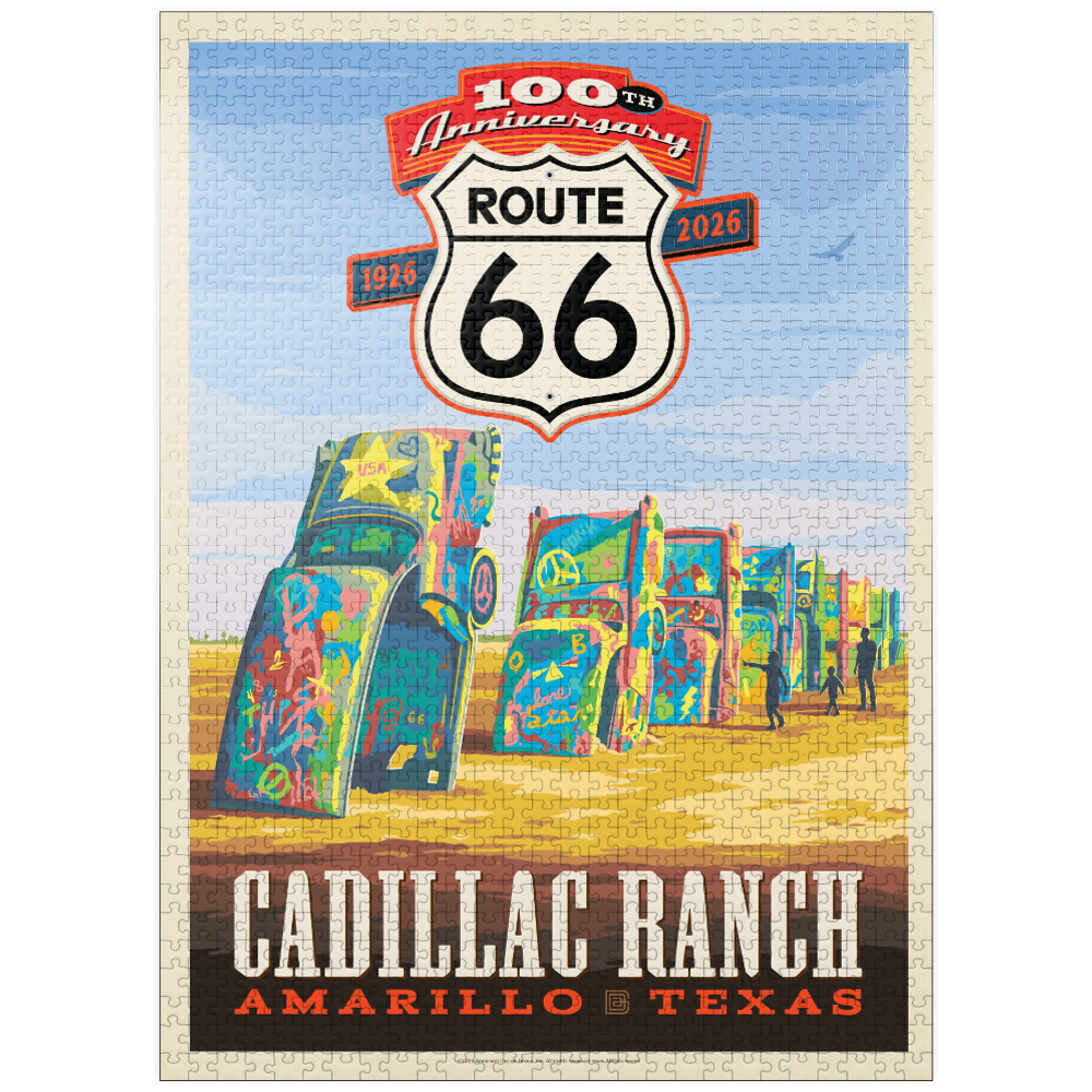 Cadillac Ranch near Amarillo Texas is an iconic US Route 66 roadside attraction, shown here in a vibrant retro travel scene celebrating the Route 66 100th Anniversary 1926 to 2026. The image features the famous row of half buried classic Cadillacs angled into the Panhandle plains, covered in colorful graffiti and pop art style paint. A wide open Texas sky and visitors walking the sandy ground emphasize the road trip atmosphere and Americana vibe. Located along historic Route 66, Cadillac Ranch is a must see stop for travelers, photographers, and classic highway culture fans exploring Amarillo and the Texas High Plains.