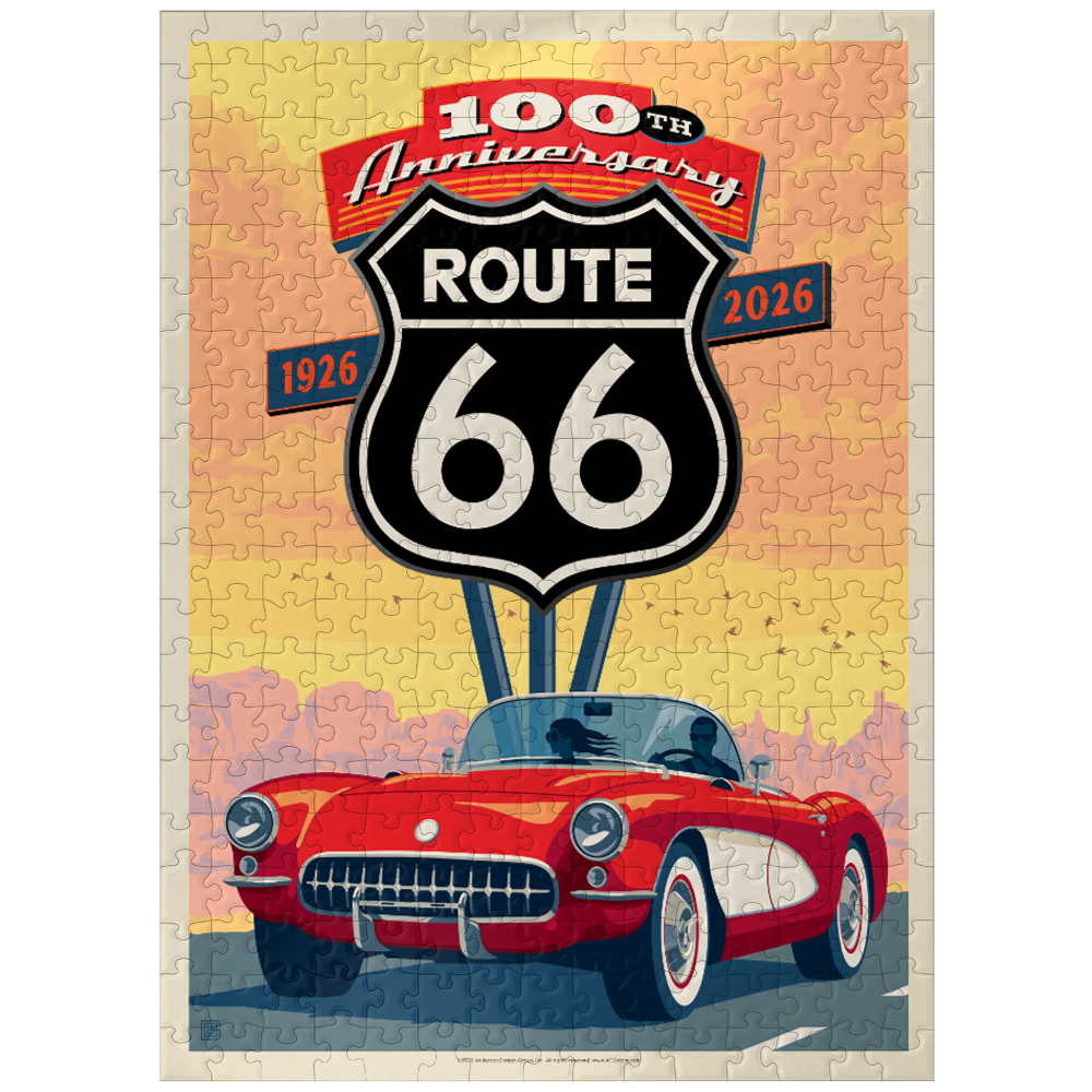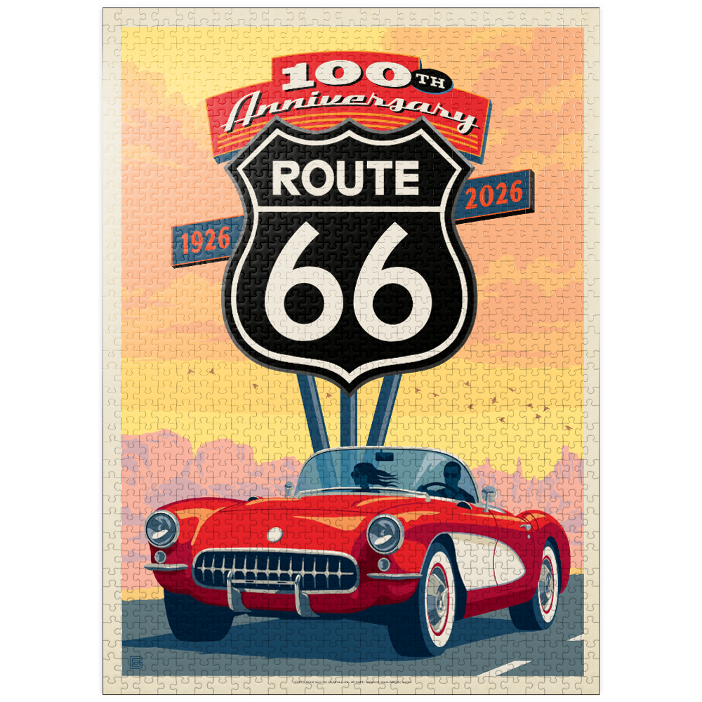Route 66 100th Anniversary 1926 to 2026 is featured in a bold retro travel style scene with the iconic Route 66 highway shield rising over a classic red convertible cruising an open American road. This Route 66 centennial themed design captures Mother Road nostalgia with warm desert sunset colors, sweeping skies, and distant mesas and buttes that evoke the Southwest landscape. The composition highlights vintage Americana, classic car culture, and the spirit of a USA road trip from the Midwest toward the desert states. With its timeless roadside heritage and freedom and adventure vibe, it fits searches for historic US highways, Route 66 travel memorabilia, desert highway scenery, and centennial celebration artwork.