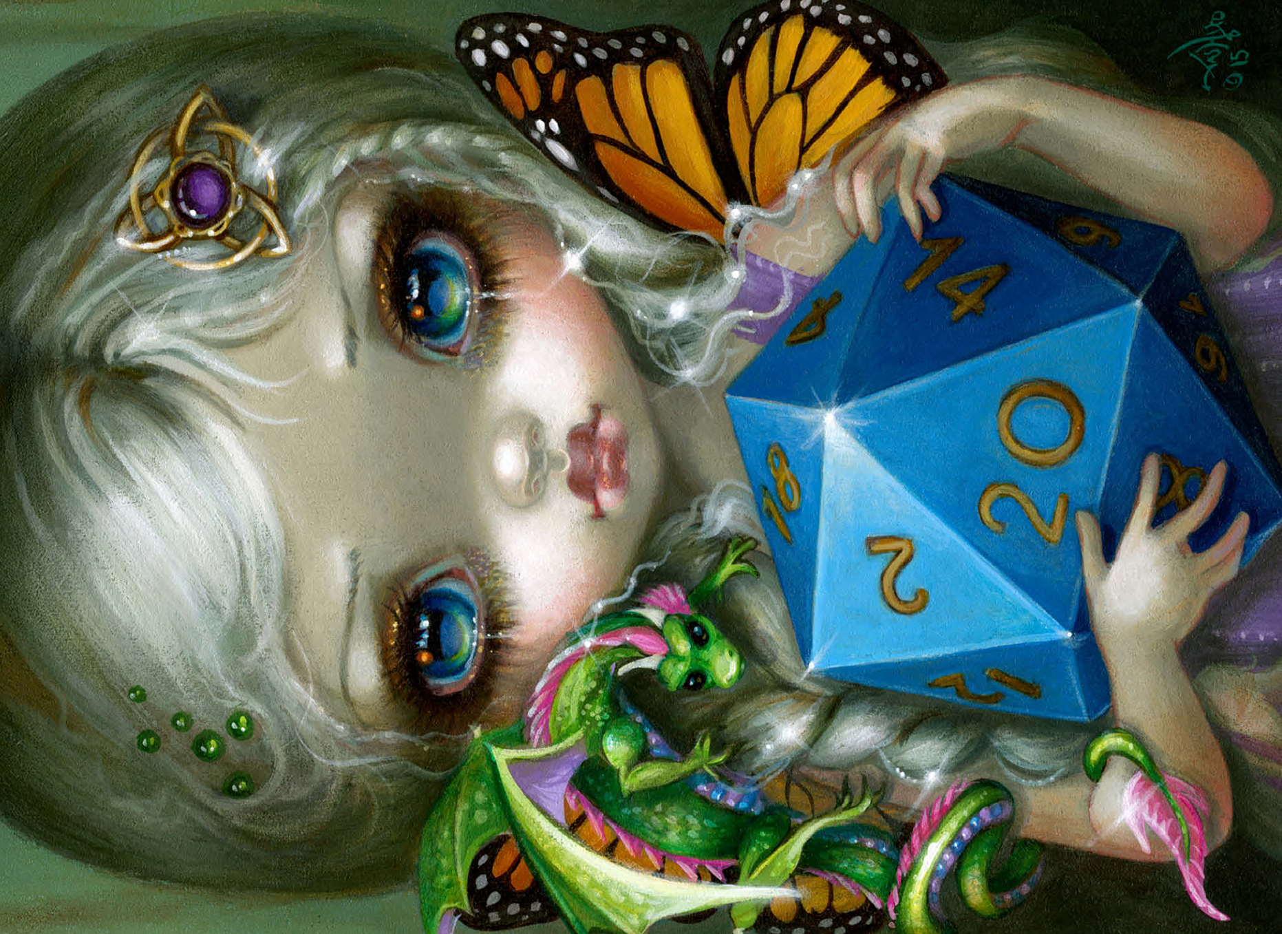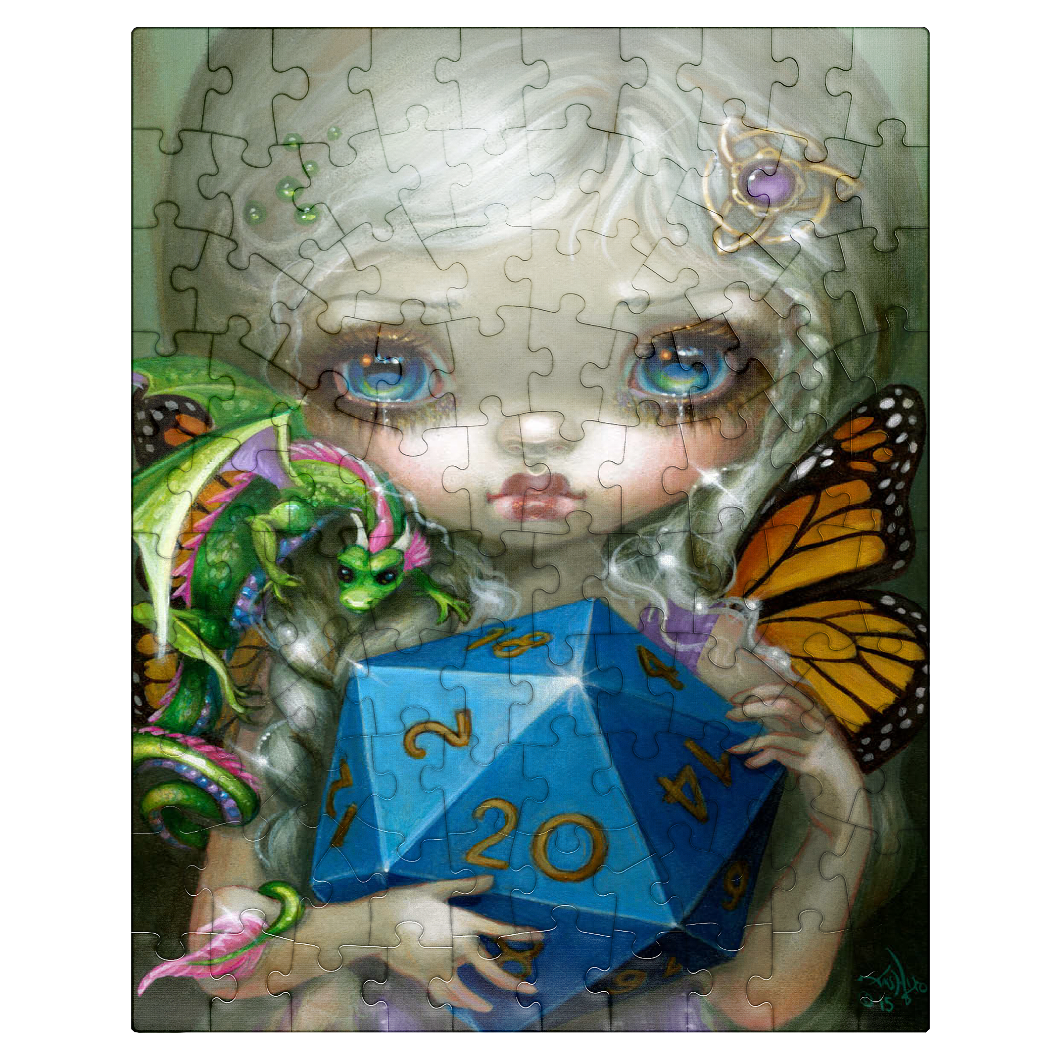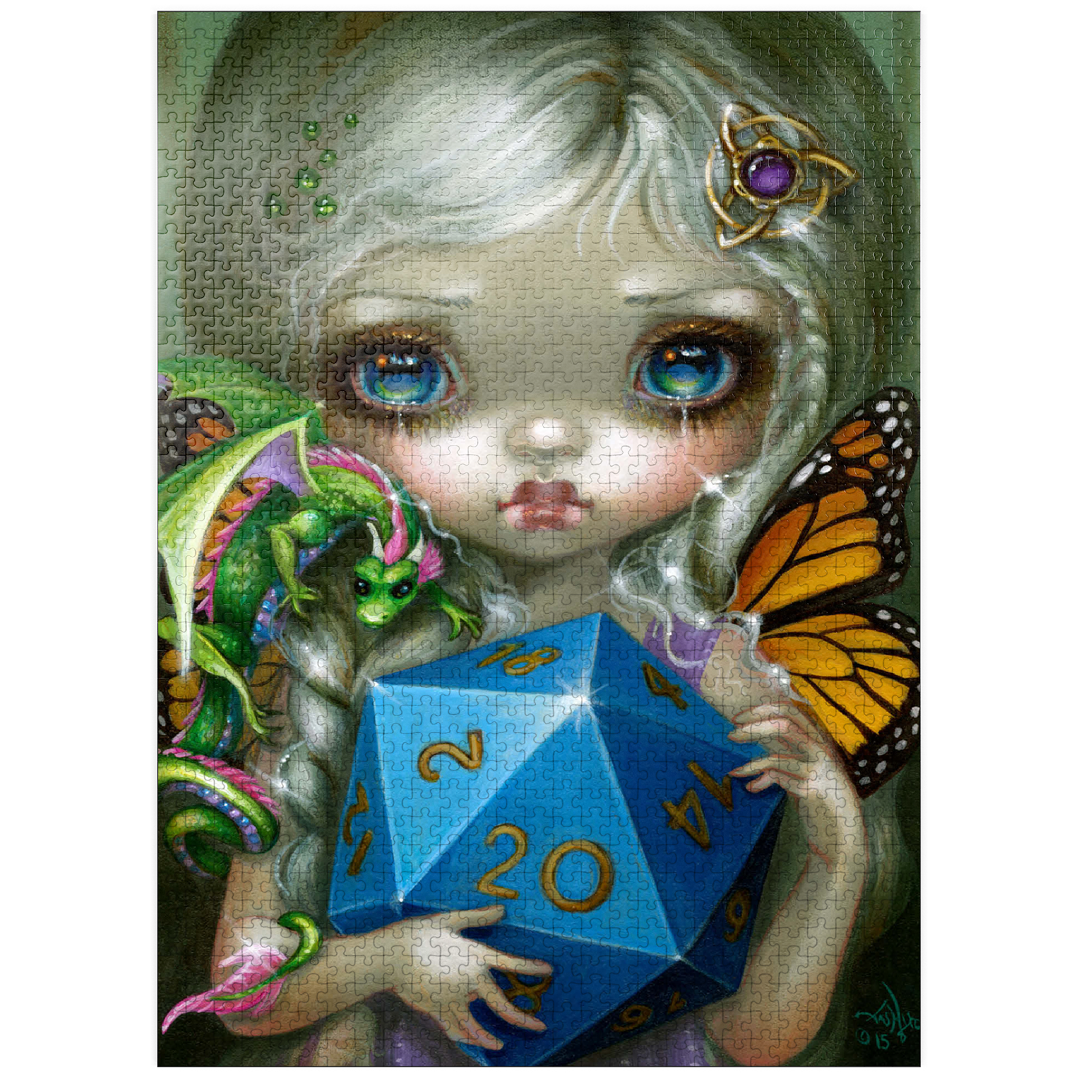 Roll the dice with the 20 Sided Dice Fairy puzzle! Heavily inspired by the iconic fantasy role-playing game Dungeons & Dragons (D&D), this artwork features a charming fairy clutching a large d20 die. A must-have, high-quality jigsaw for D&D fans, gamers, and fantasy art collectors looking for a unique tribute to the classic tabletop game. Level up your puzzle collection!