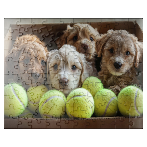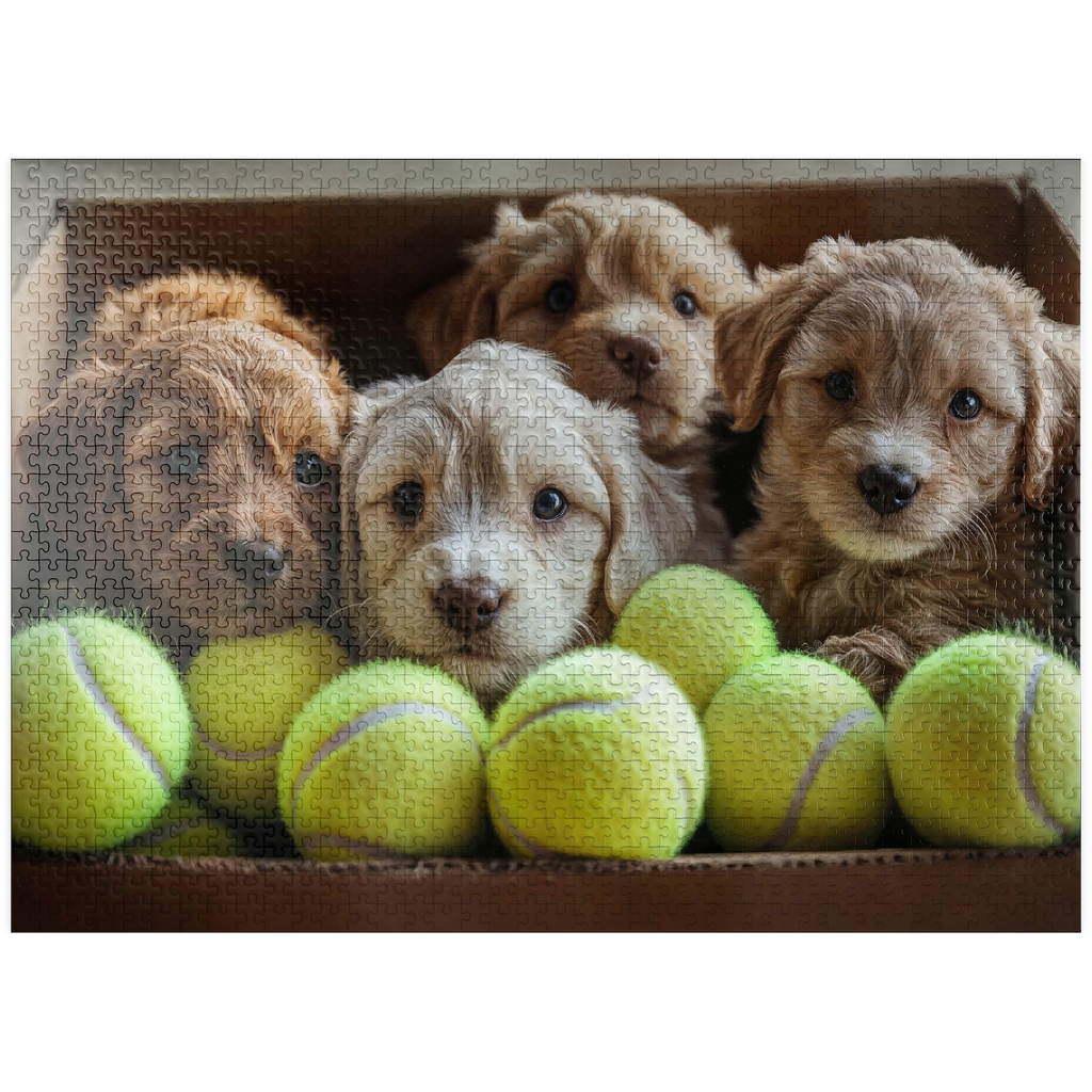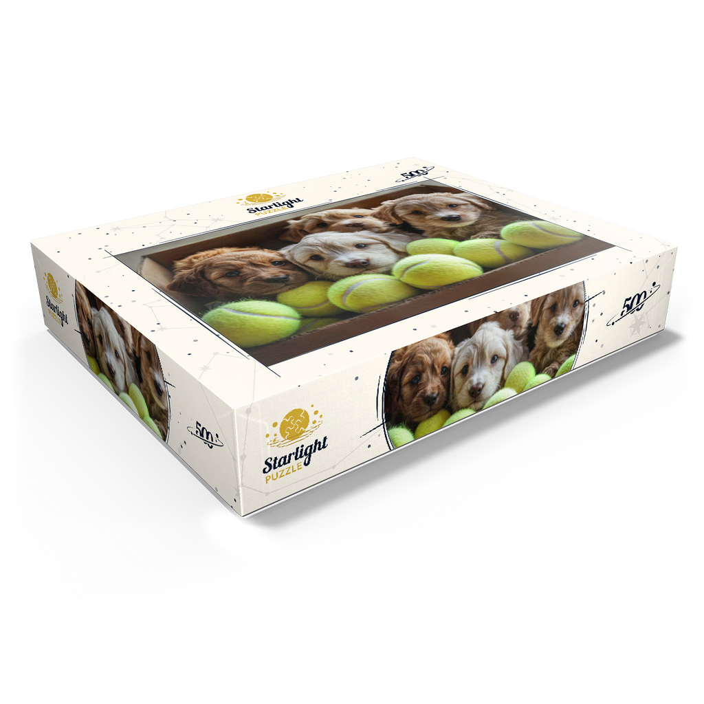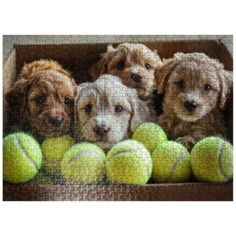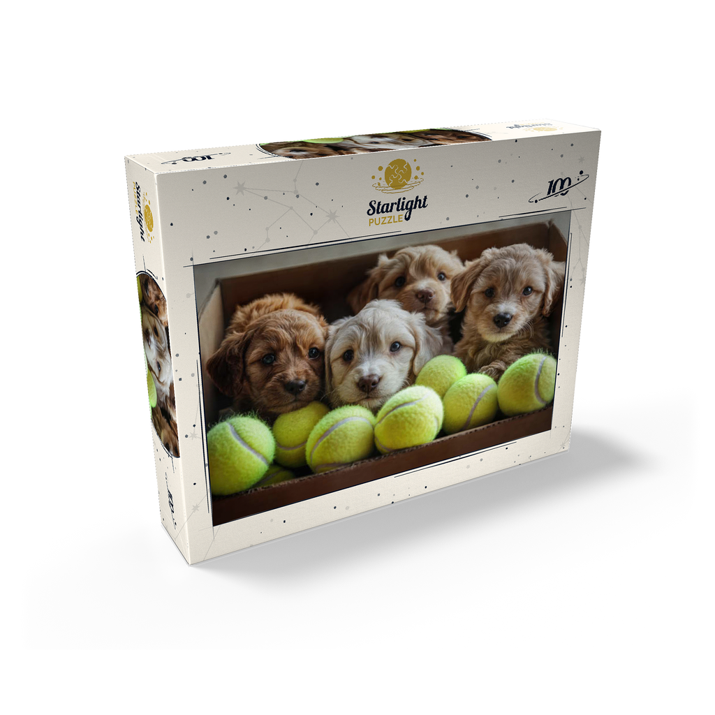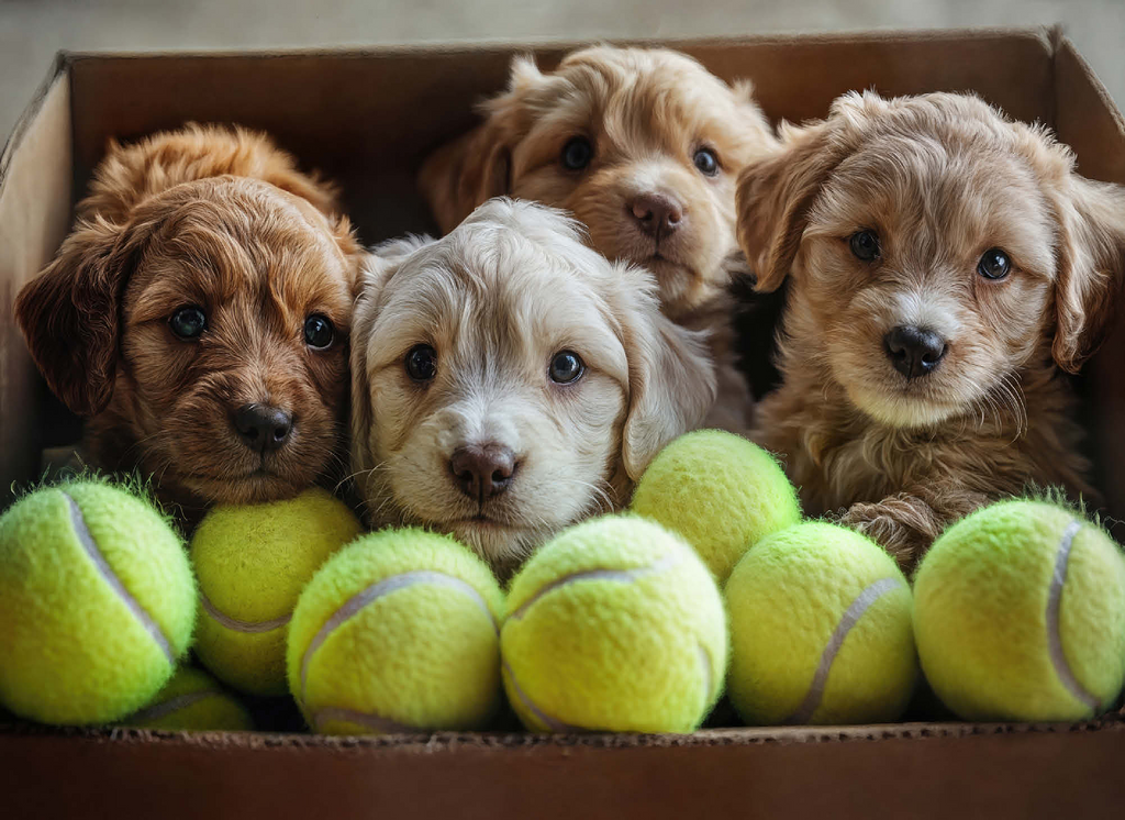 This charming image showcases four fluffy puppies snuggled together in a cardboard box, surrounded by bright yellow tennis balls. Their sweet, curious eyes and soft fur make them irresistibly adorable. The cozy and playful setting highlights the innocence and joy of these young pups, creating a heartwarming scene perfect for animal lovers and dog enthusiasts alike.