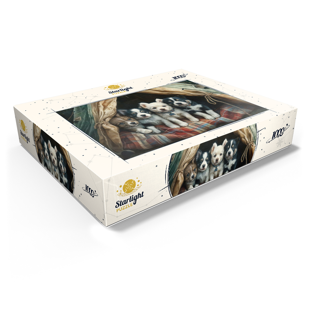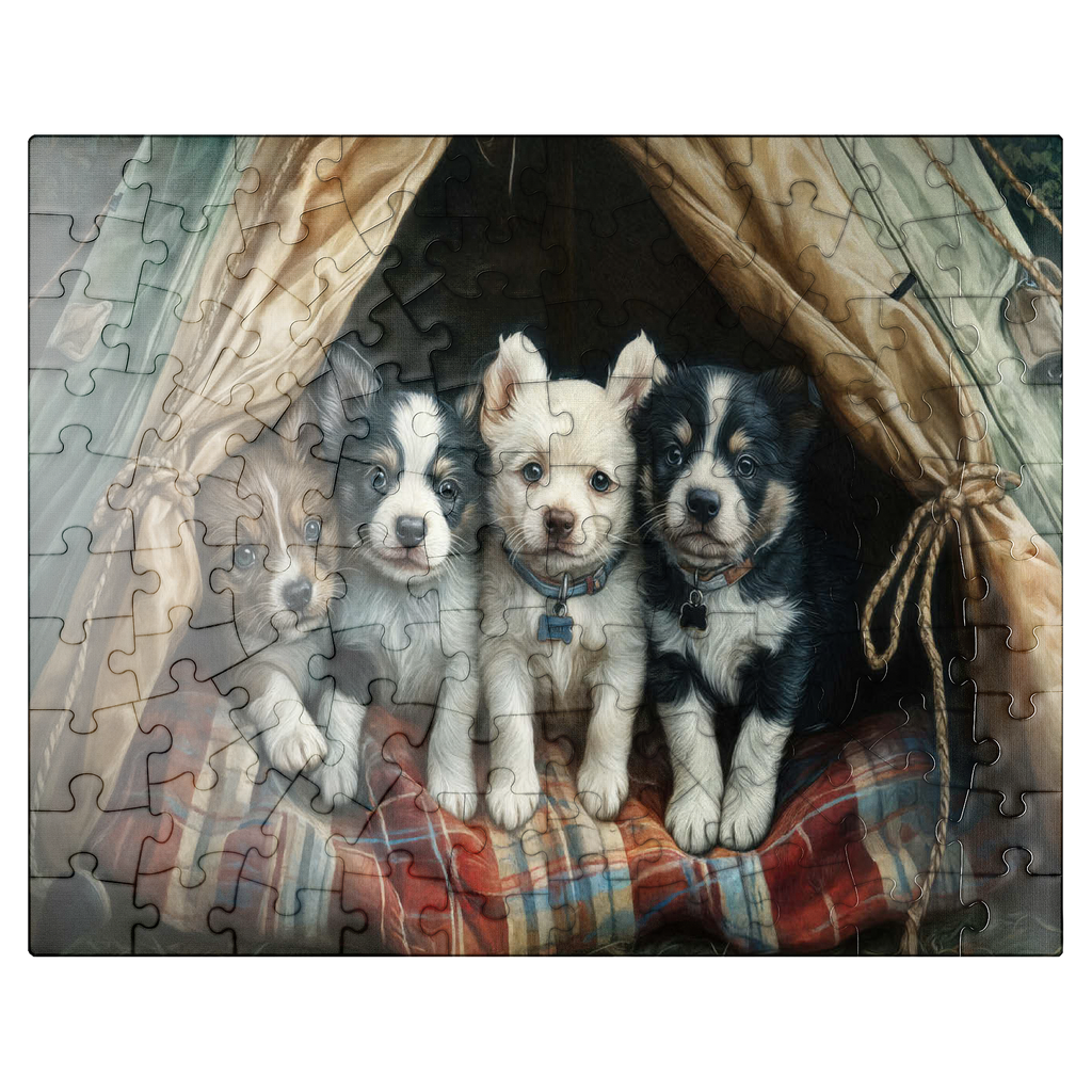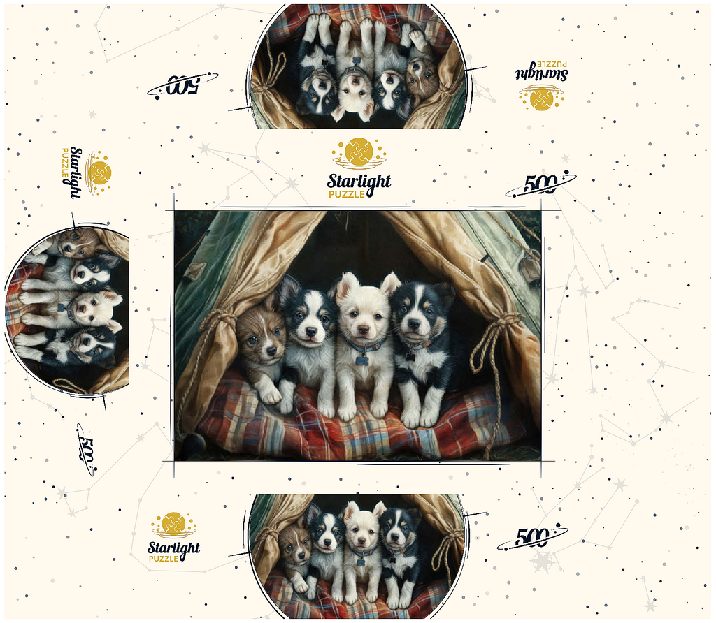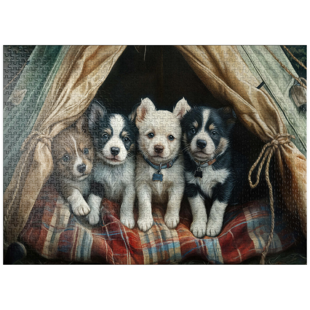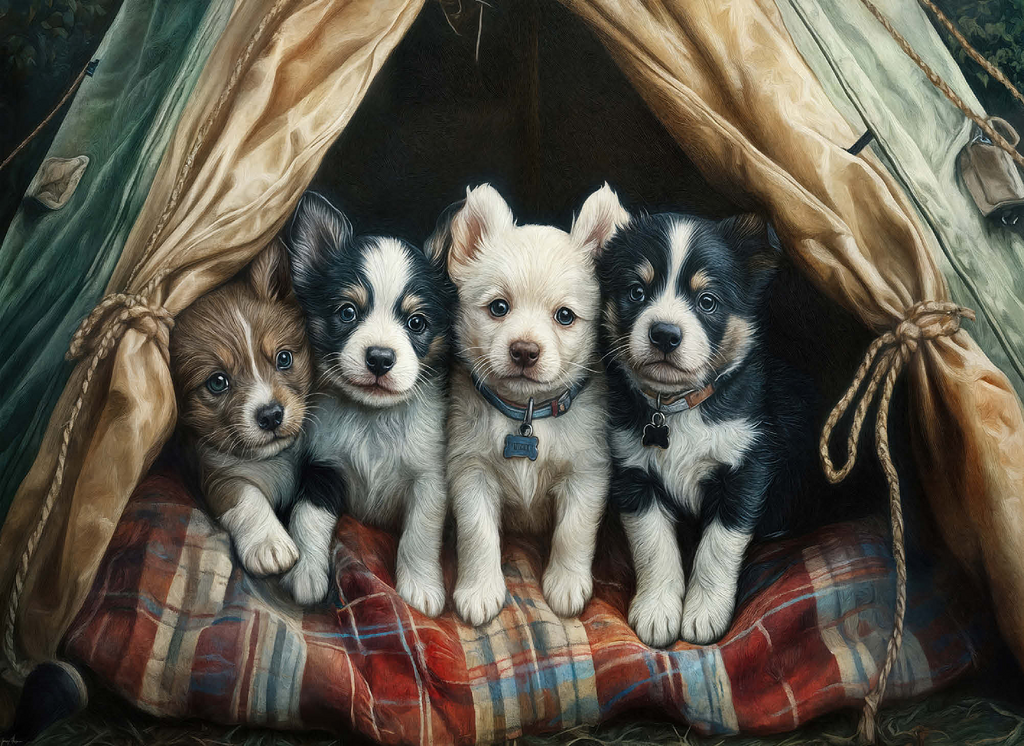 This heartwarming scene features four adorable puppies snuggled together on a plaid blanket inside a rustic canvas tent. Their bright, curious eyes and soft fur radiate warmth and charm, capturing the innocence of outdoor adventures. The earthy tones of the tent and the cozy setup suggest a peaceful camping moment, making this image a delightful blend of nature, comfort, and playful companionship.