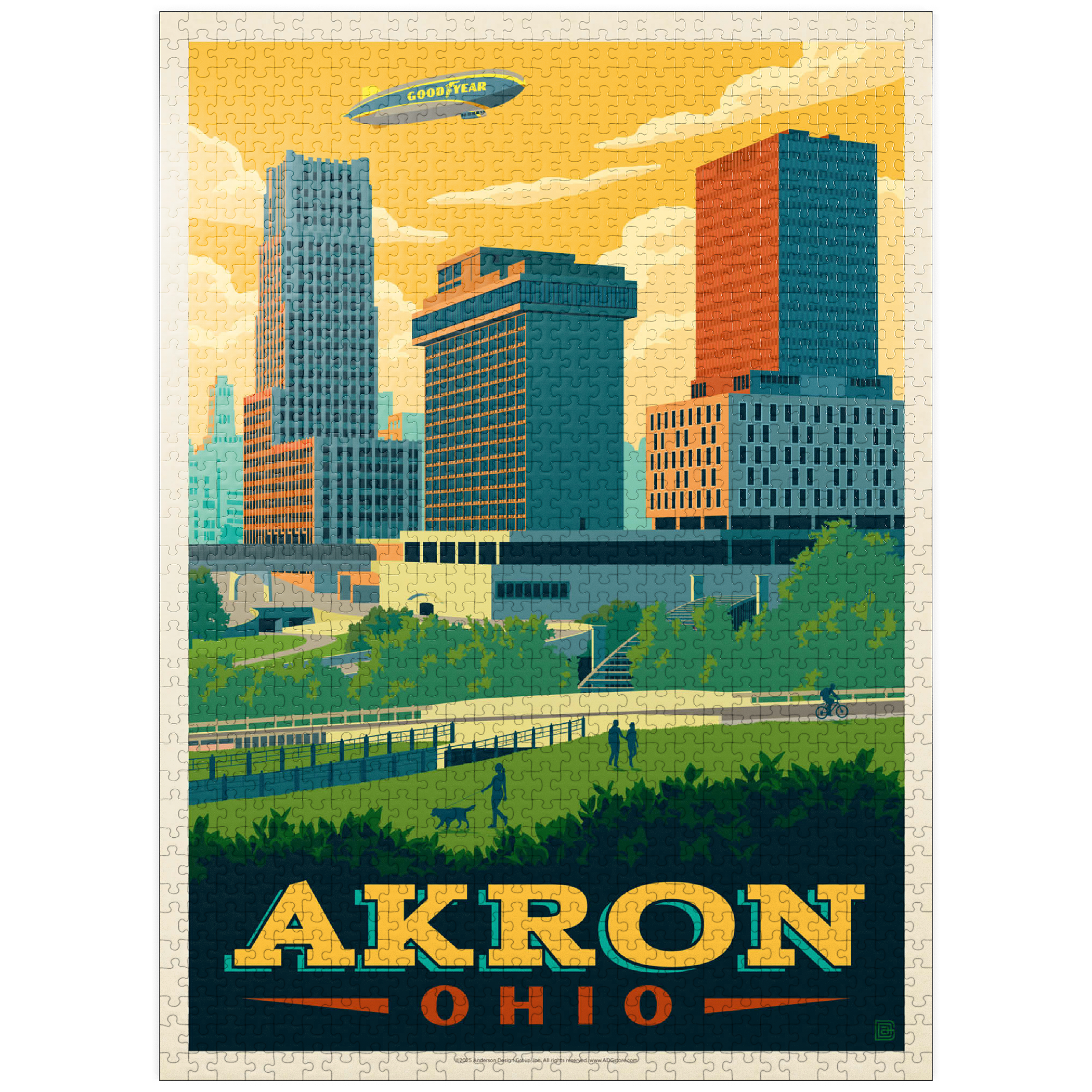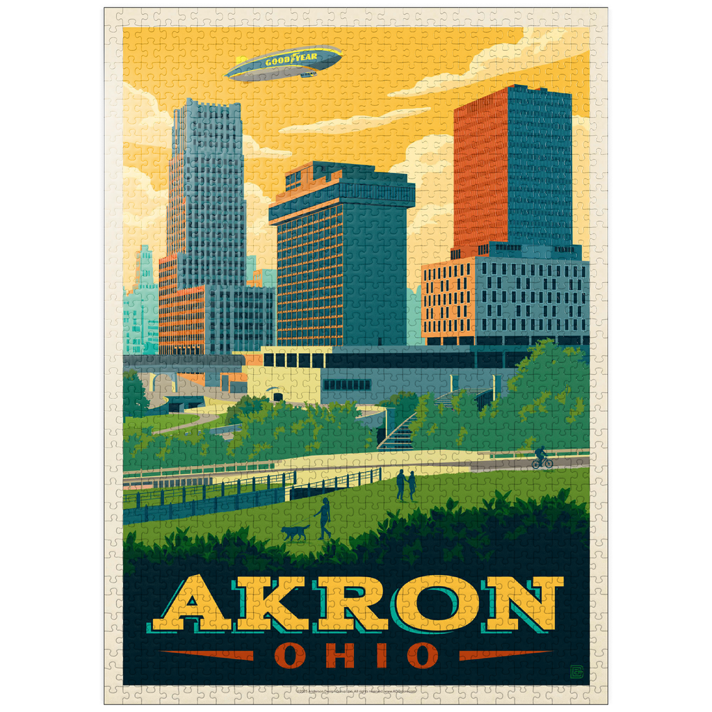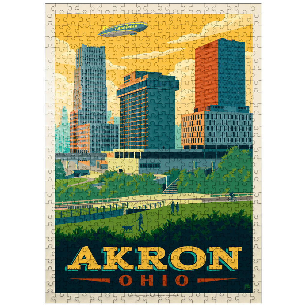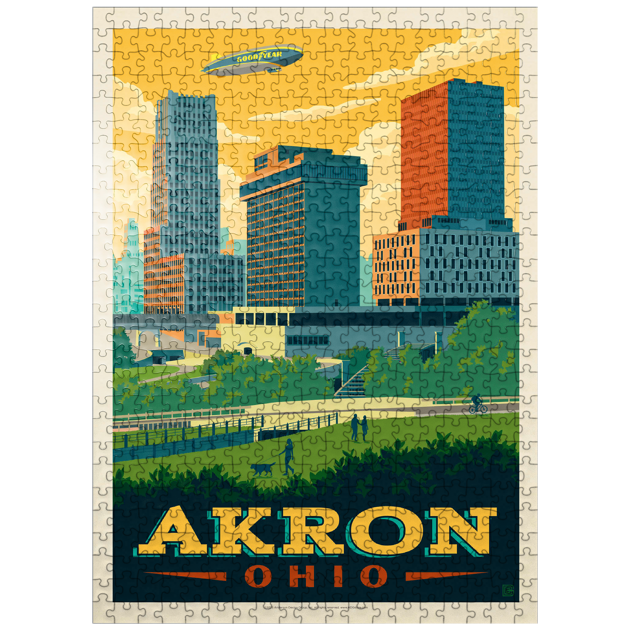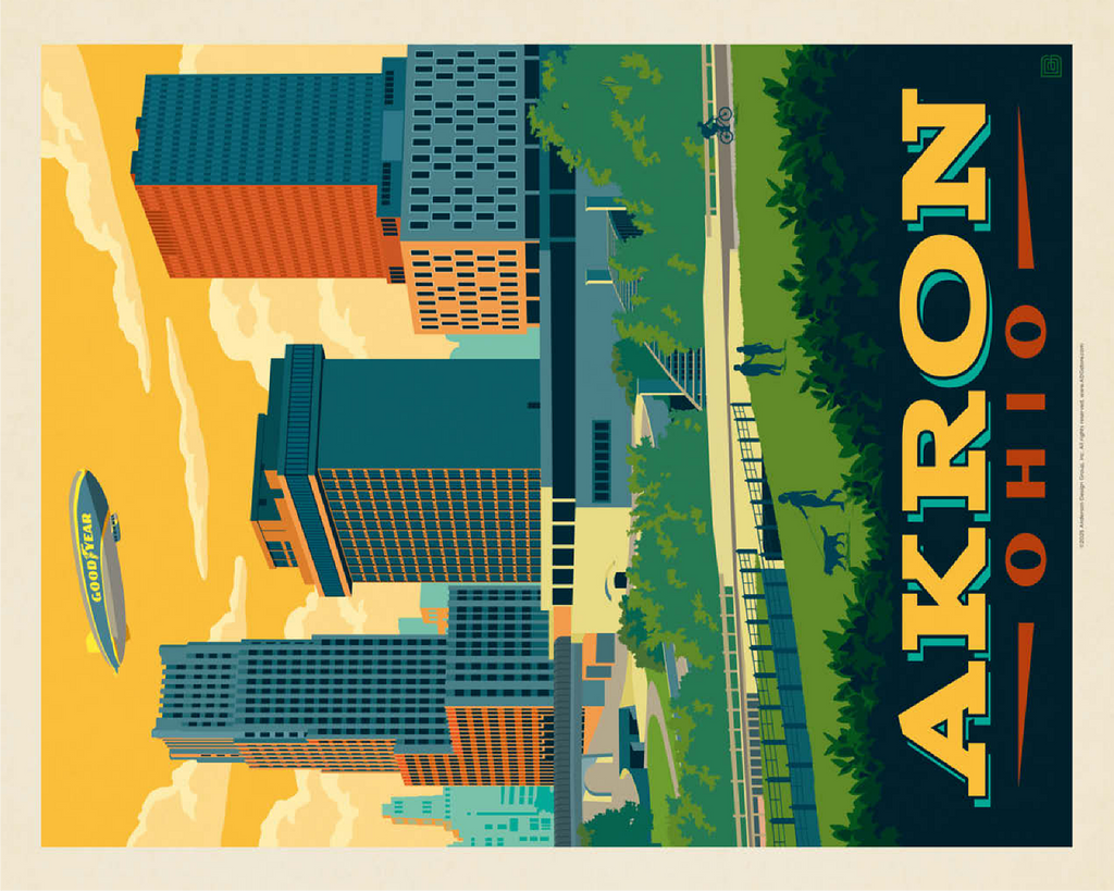 This vibrant artwork captures the skyline of Akron, Ohio, featuring its signature downtown architecture and the iconic Goodyear Blimp floating above in a golden sky. The scene includes lush greenery, a modern urban park with people walking and biking, and a balanced mix of nature and city life. Akron, historically known as the Rubber Capital of the World, is home to the Goodyear Tire & Rubber Company, symbolized here by the famous blimp. The stylized design reflects the city's industrial legacy and revitalized public spaces, making it a dynamic tribute to Akron's culture and heritage.