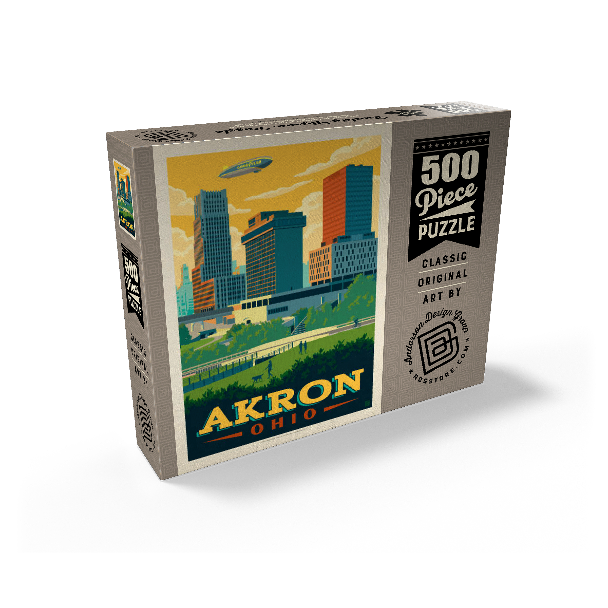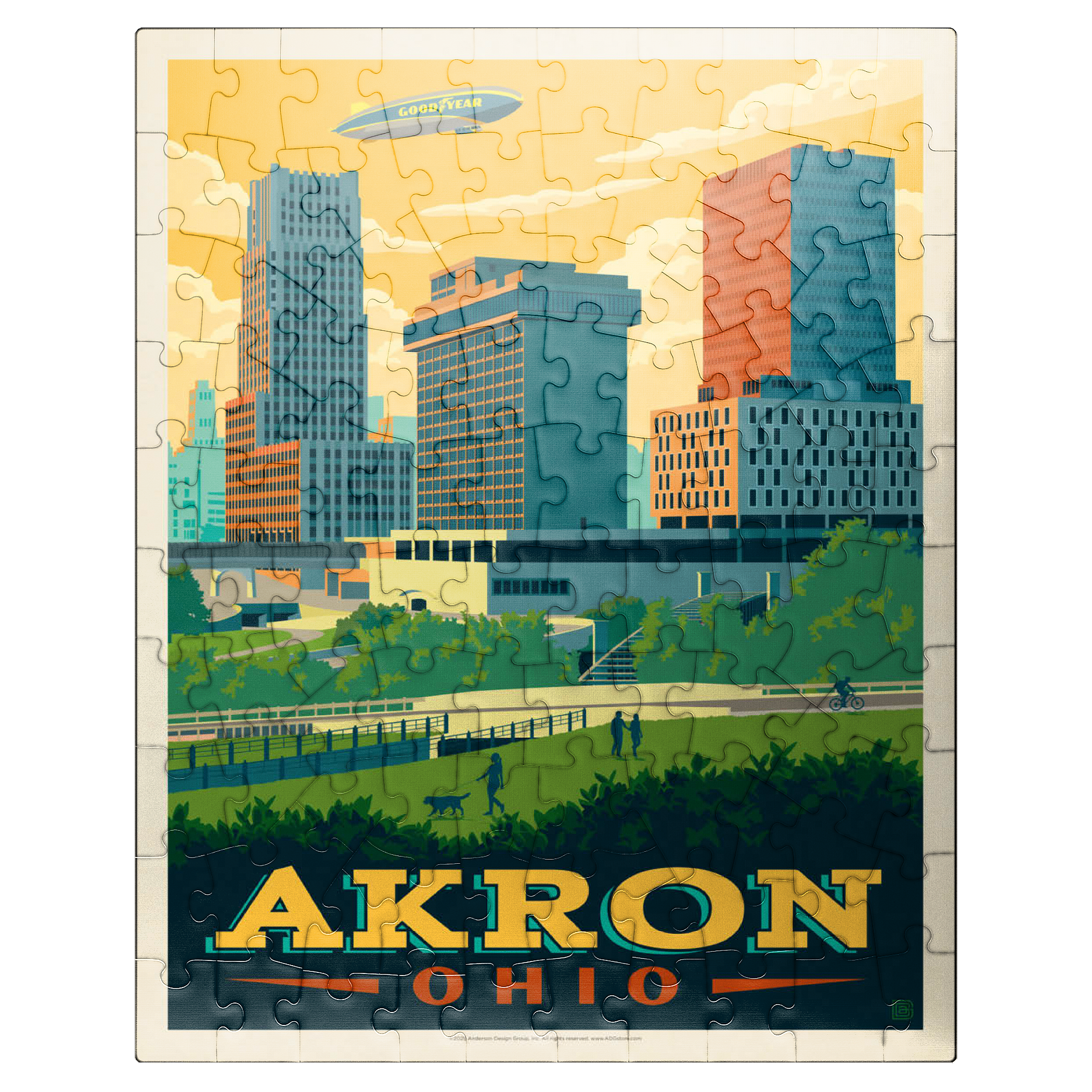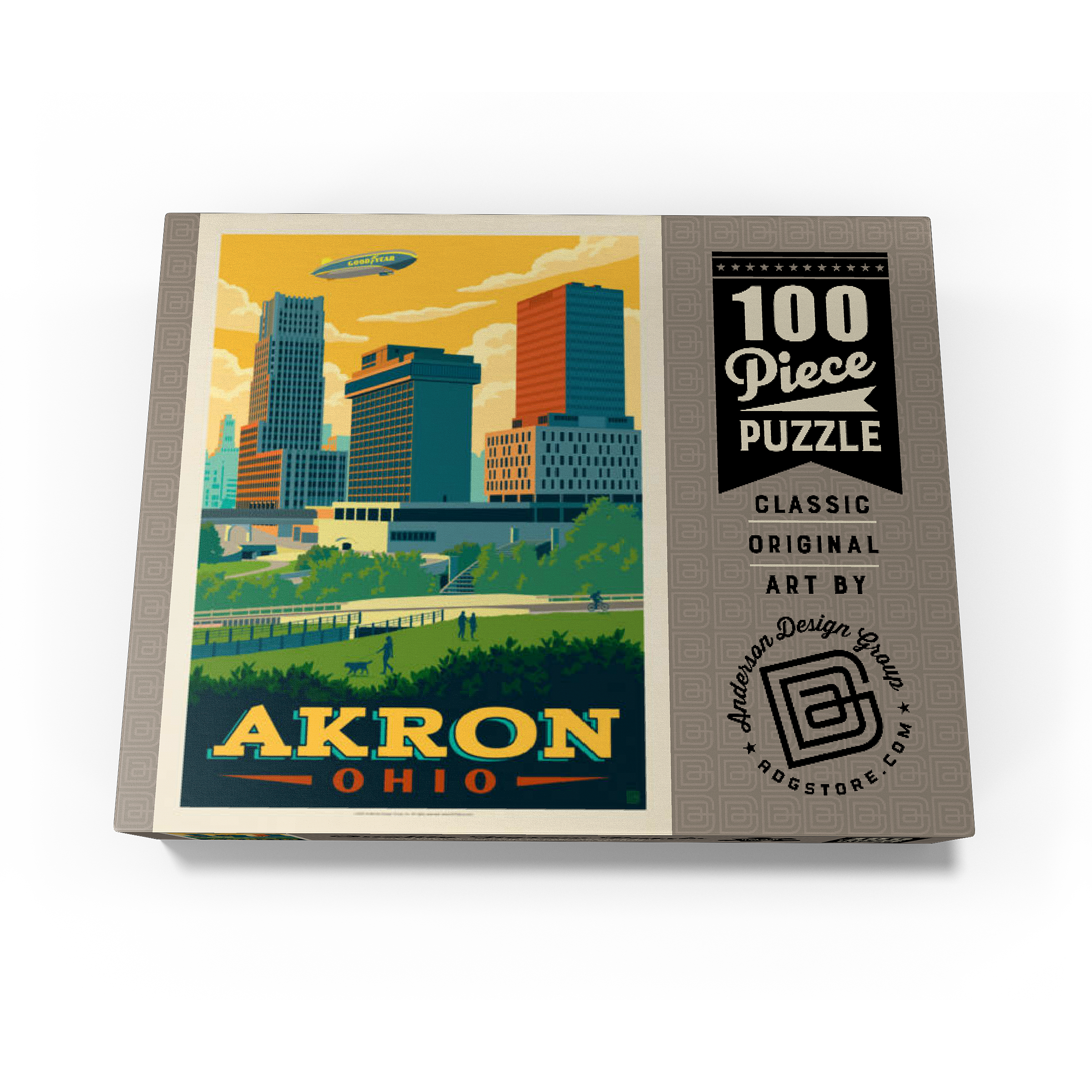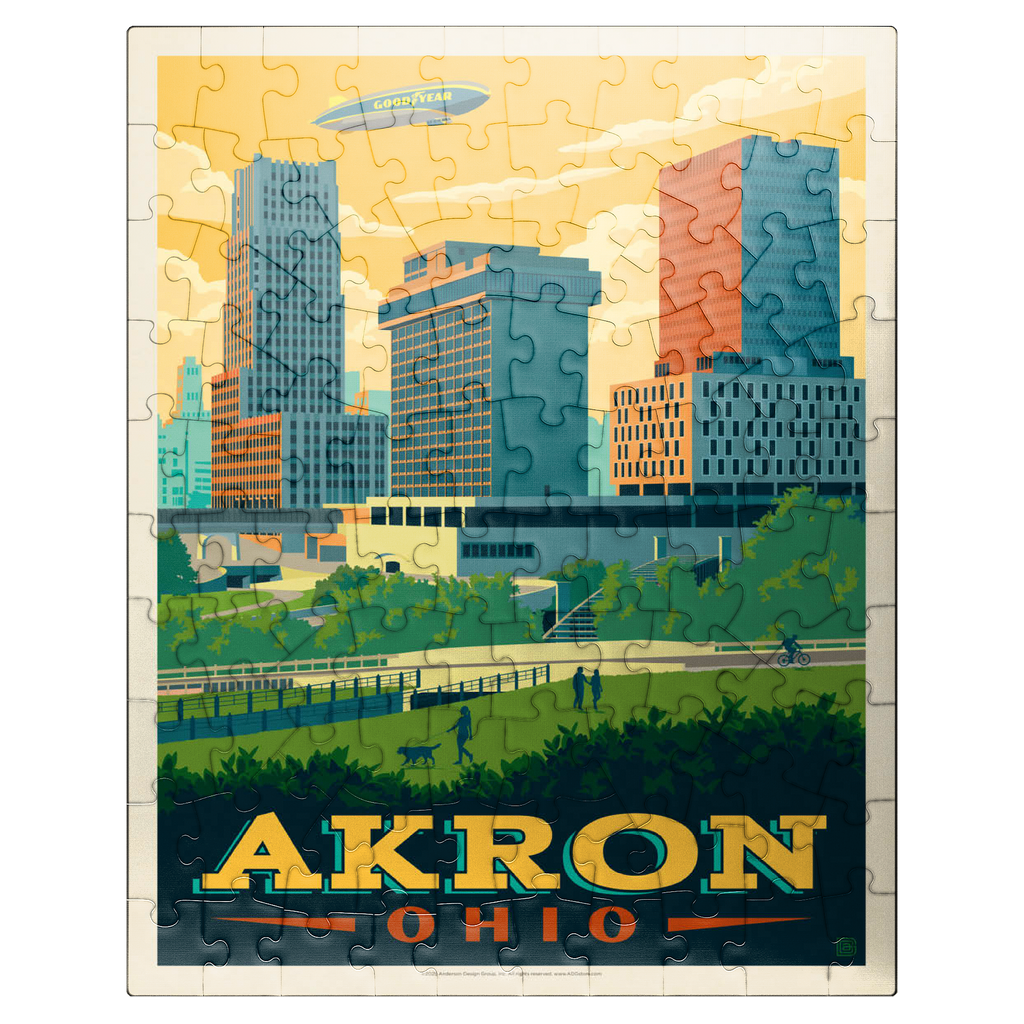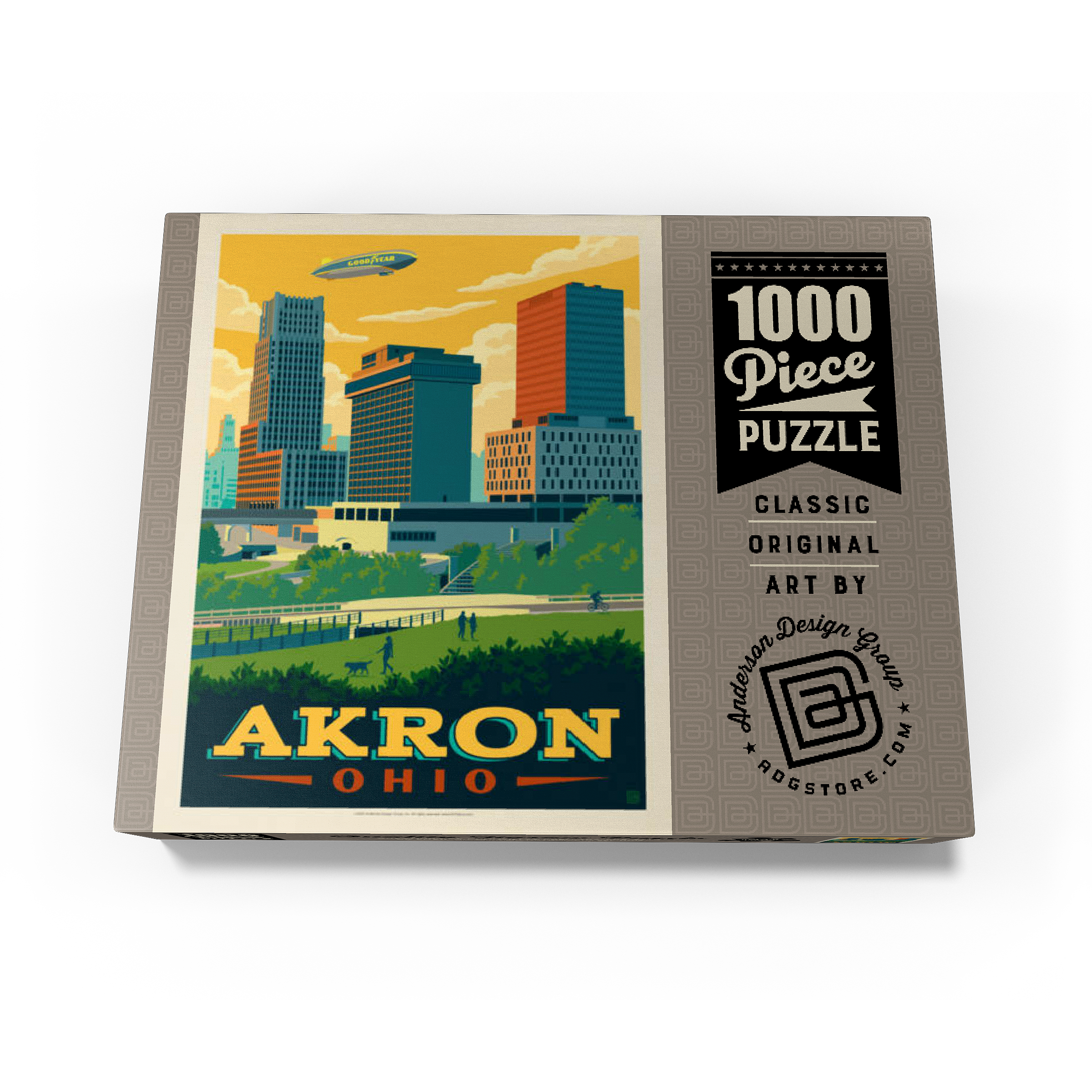 This vibrant artwork captures the skyline of Akron, Ohio, featuring its signature downtown architecture and the iconic Goodyear Blimp floating above in a golden sky. The scene includes lush greenery, a modern urban park with people walking and biking, and a balanced mix of nature and city life. Akron, historically known as the Rubber Capital of the World, is home to the Goodyear Tire & Rubber Company, symbolized here by the famous blimp. The stylized design reflects the city's industrial legacy and revitalized public spaces, making it a dynamic tribute to Akron's culture and heritage.