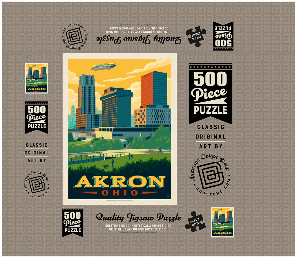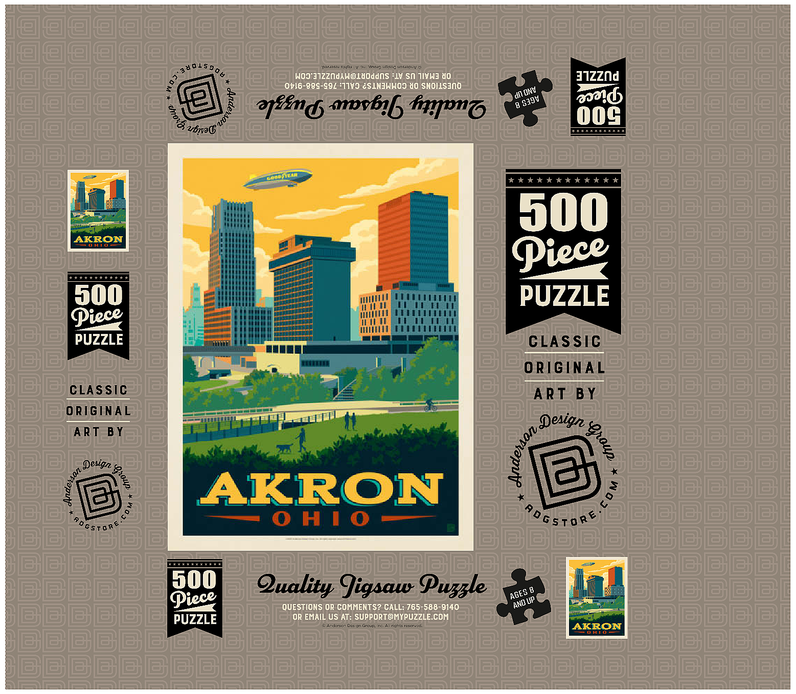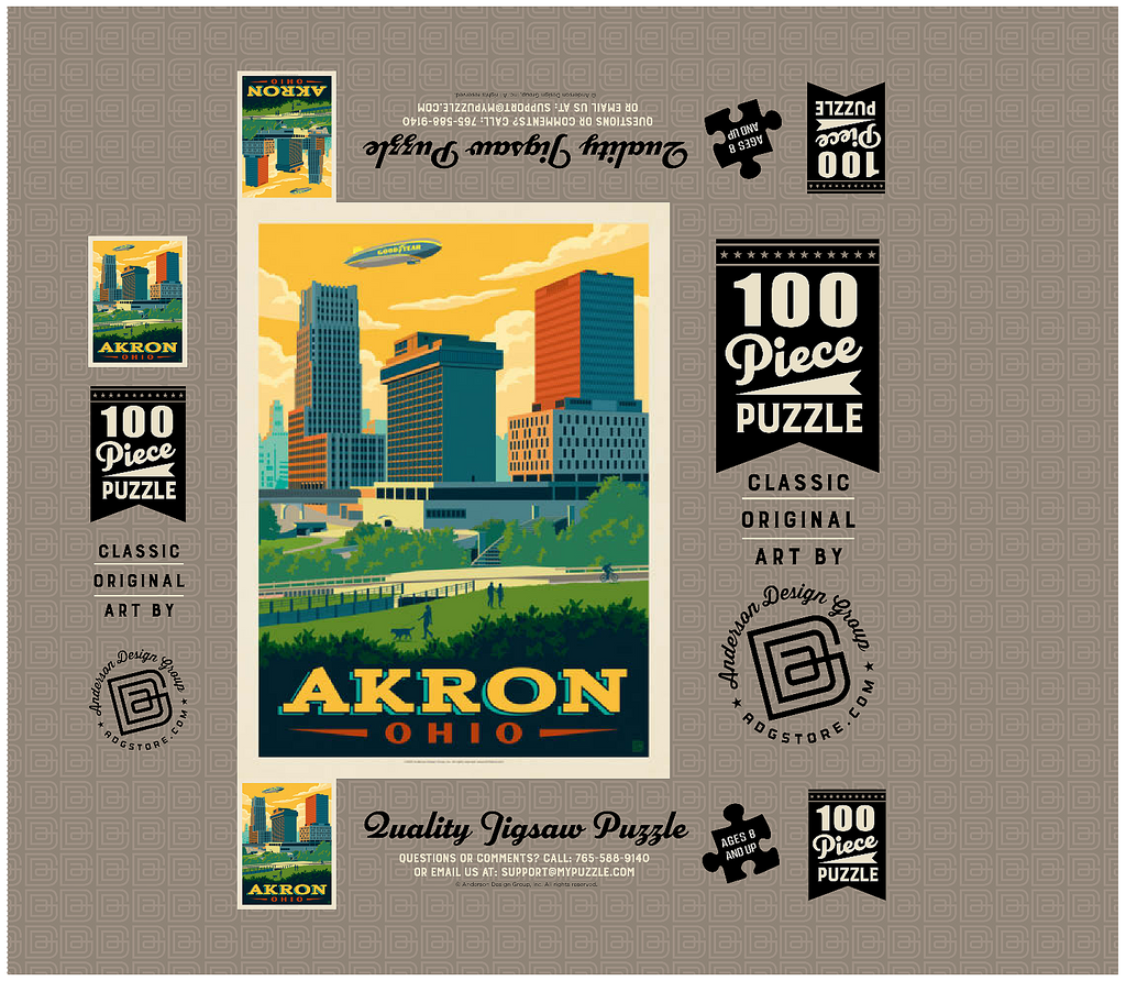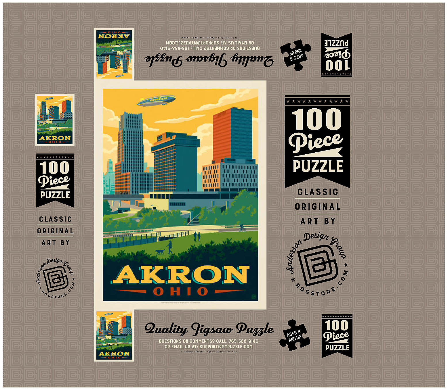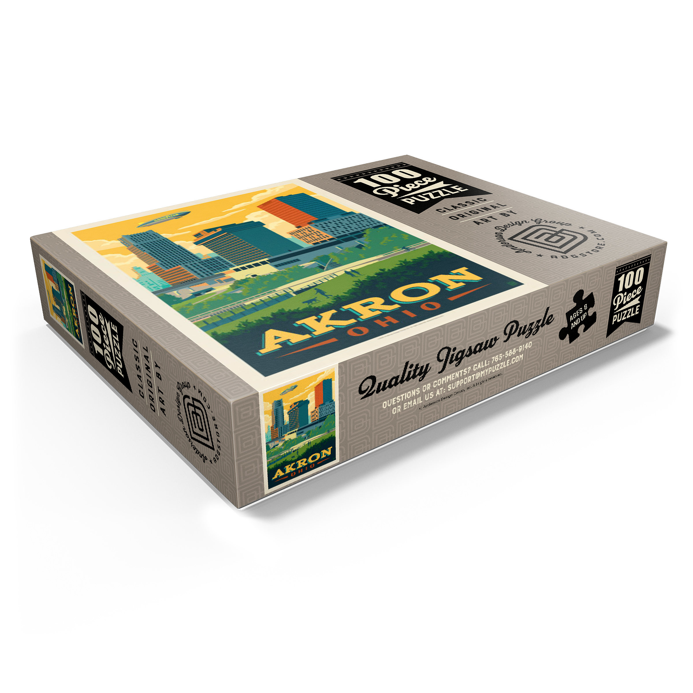 This vibrant artwork captures the skyline of Akron, Ohio, featuring its signature downtown architecture and the iconic Goodyear Blimp floating above in a golden sky. The scene includes lush greenery, a modern urban park with people walking and biking, and a balanced mix of nature and city life. Akron, historically known as the Rubber Capital of the World, is home to the Goodyear Tire & Rubber Company, symbolized here by the famous blimp. The stylized design reflects the city's industrial legacy and revitalized public spaces, making it a dynamic tribute to Akron's culture and heritage.