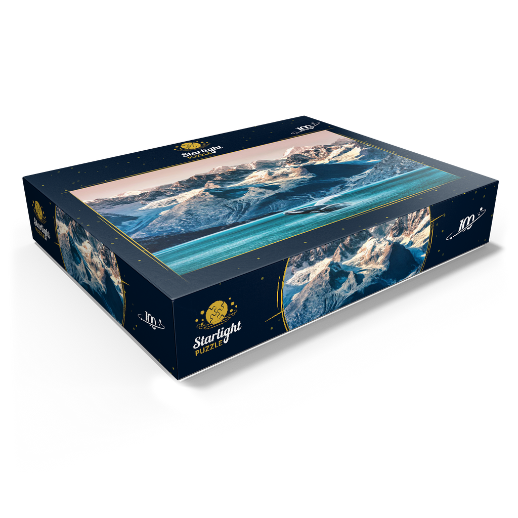 The image depicts a whale swimming off the coast of Alaska, with the majestic mountains of the state serving as a backdrop. The whale is a massive and majestic creature, its body glistening in the sunlight as it gracefully moves through the water. The water is a deep blue color, with whitecaps marking the presence of strong currents. The mountains rise up in the distance, their peaks covered in snow and ice. The slopes of the mountains are barren, with no trees or vegetation visible. The pale blue of the sky provides a stark contrast to the bright white of the snow-covered peaks. Overall, the image captures the grandeur and beauty of the Alaska coast, with its stunning natural scenery and wildlife.