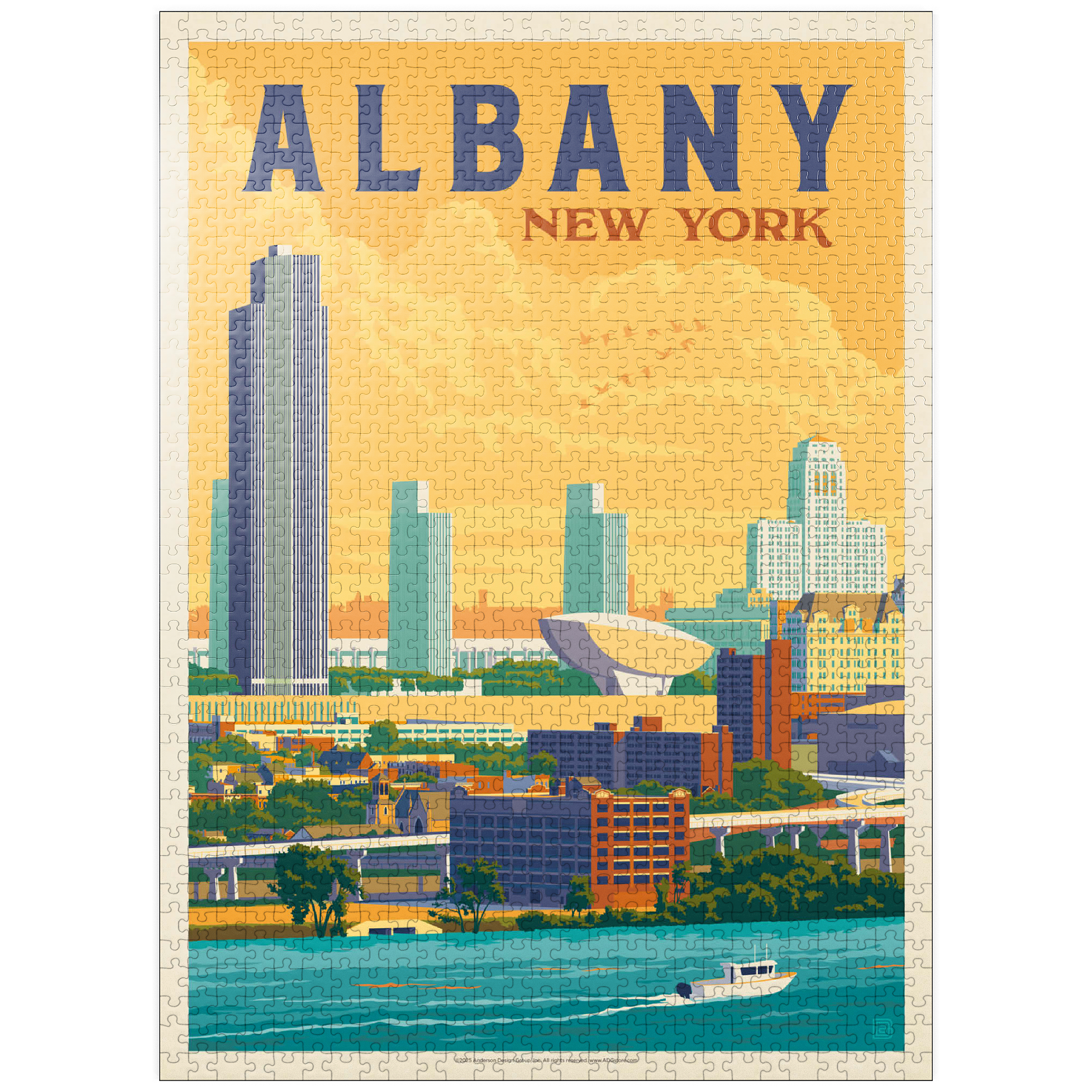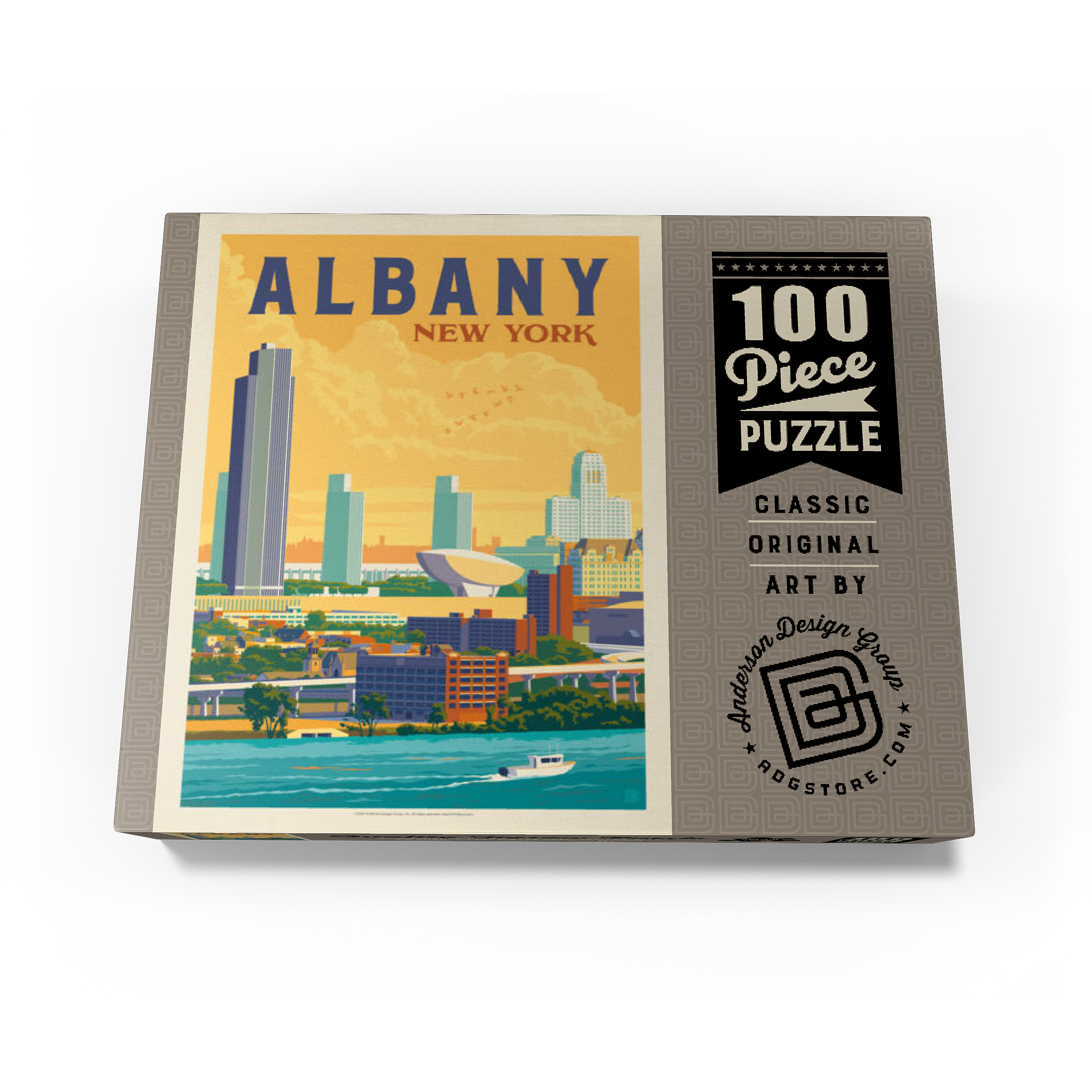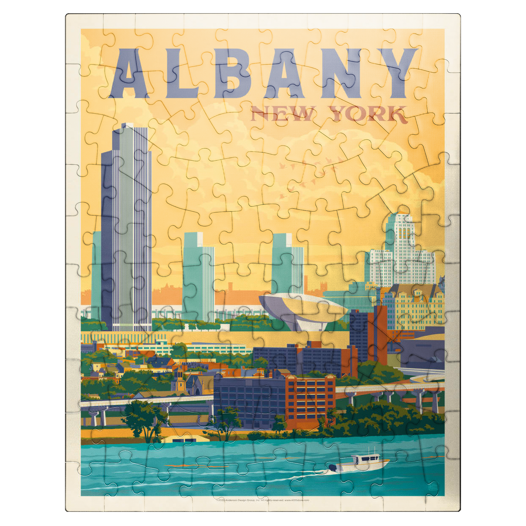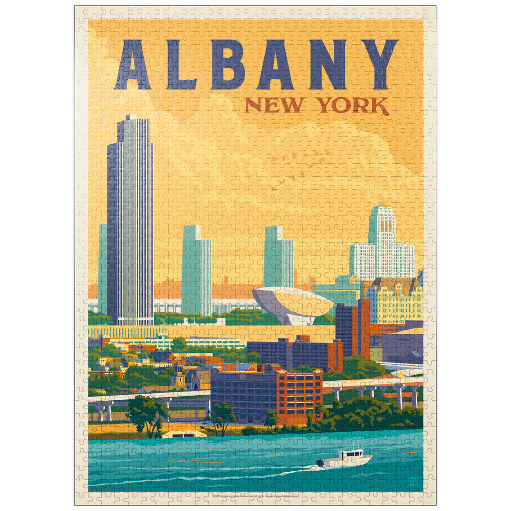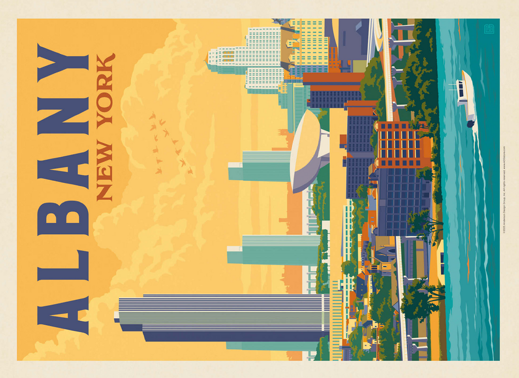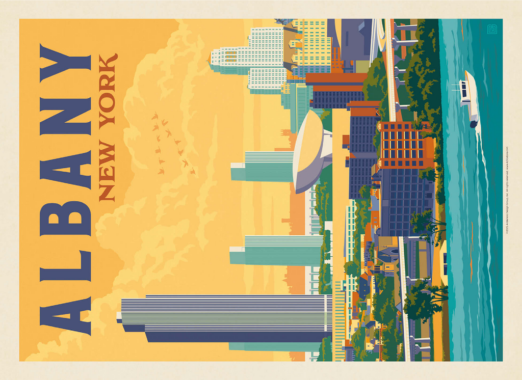 This bold artwork highlights the skyline of Albany, New York, the unique architectural landmark known as The Egg, and a vibrant downtown with historic and modern buildings. Set against a golden sky with birds in flight, the composition captures the city's location along the Hudson River, where a small boat glides across the water. Albany, the capital of New York State, blends government, culture, and history in a dynamic urban setting. The stylized riverfront scene reflects both the civic pride and architectural diversity of this historic Northeastern city.