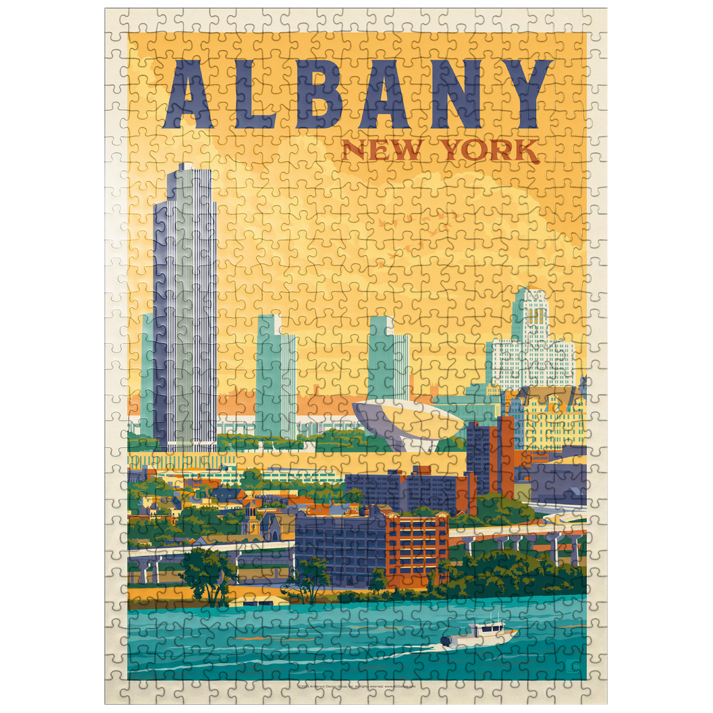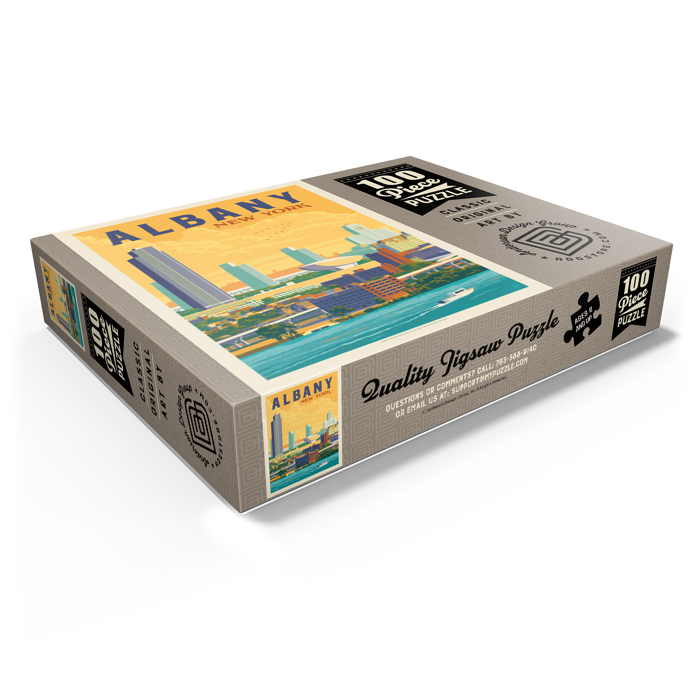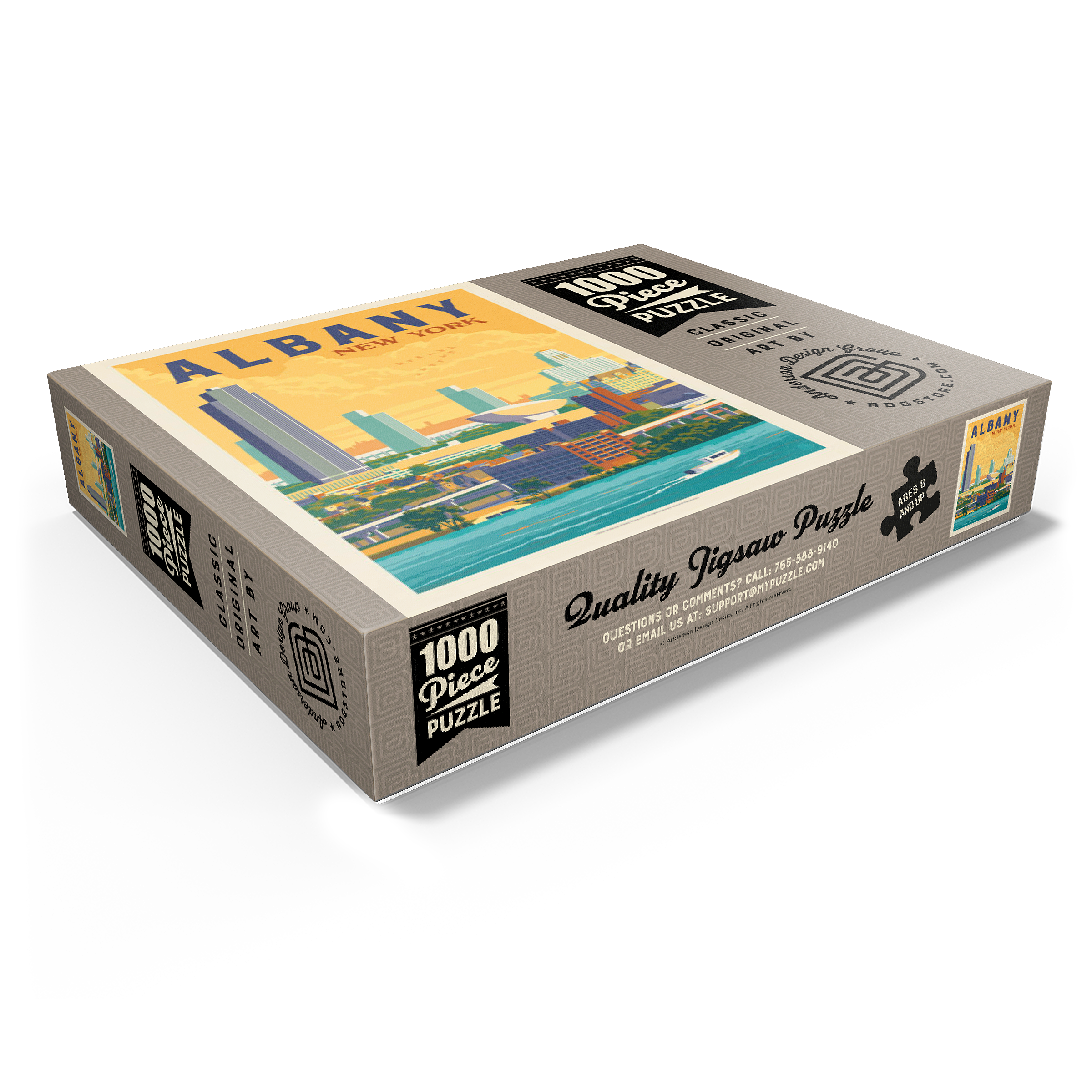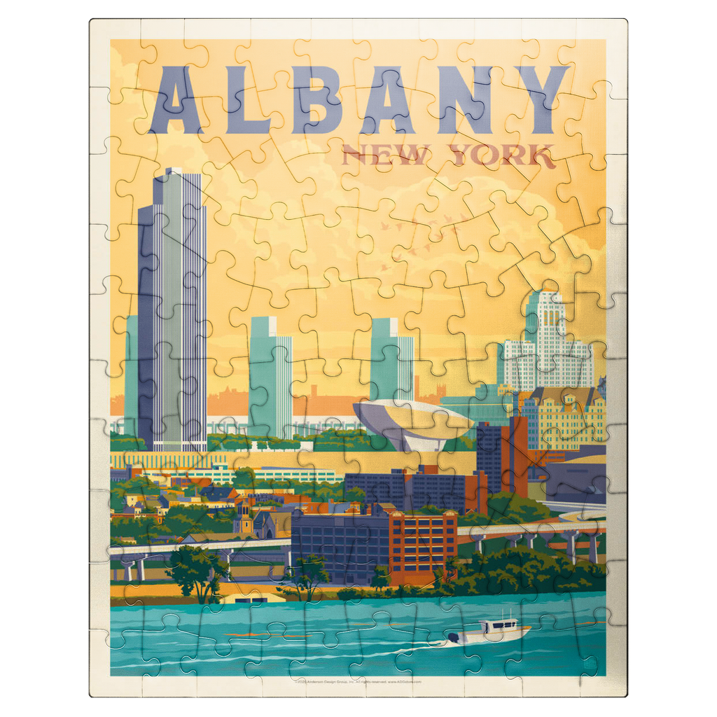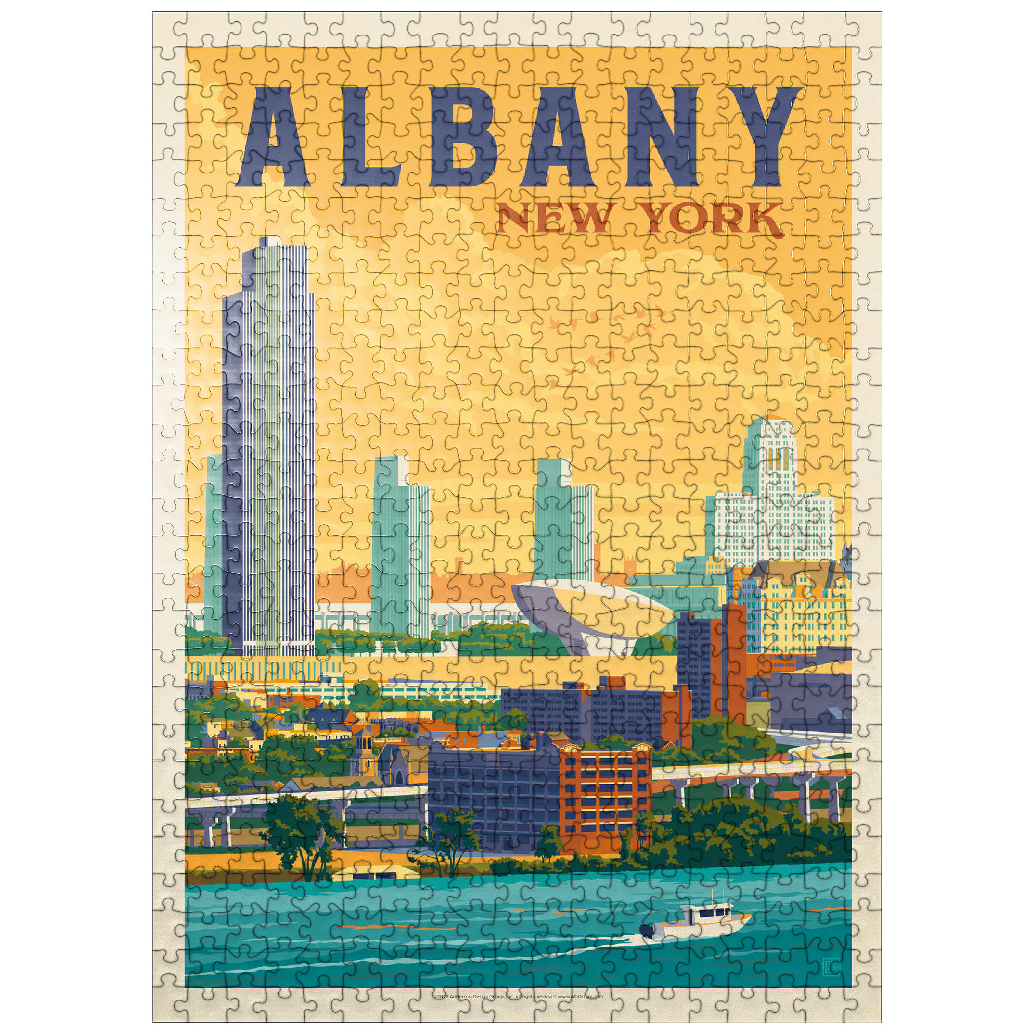 This bold artwork highlights the skyline of Albany, New York, the unique architectural landmark known as The Egg, and a vibrant downtown with historic and modern buildings. Set against a golden sky with birds in flight, the composition captures the city's location along the Hudson River, where a small boat glides across the water. Albany, the capital of New York State, blends government, culture, and history in a dynamic urban setting. The stylized riverfront scene reflects both the civic pride and architectural diversity of this historic Northeastern city.