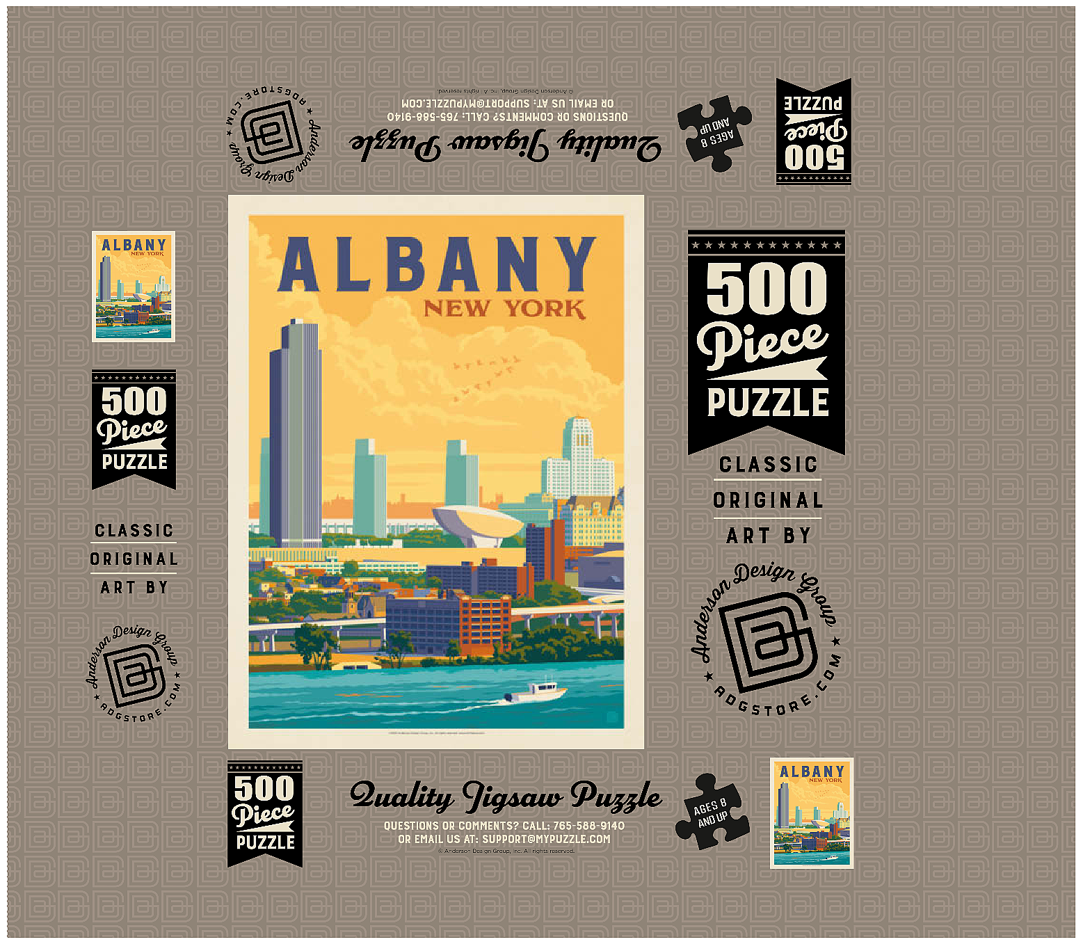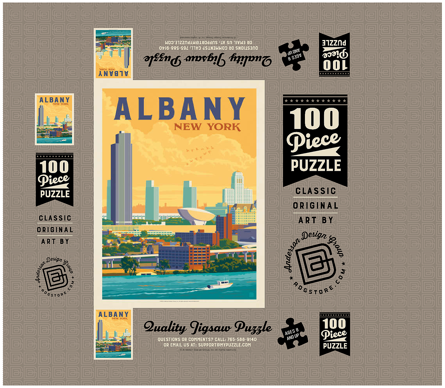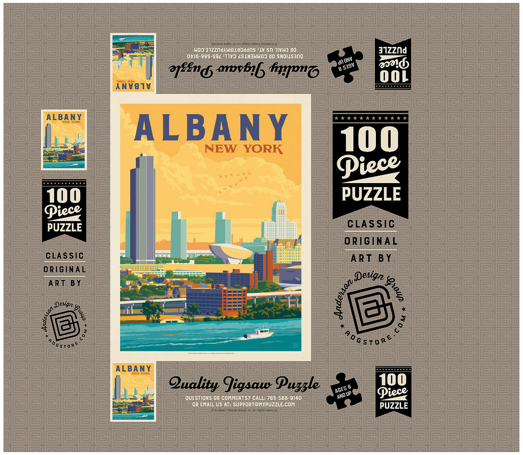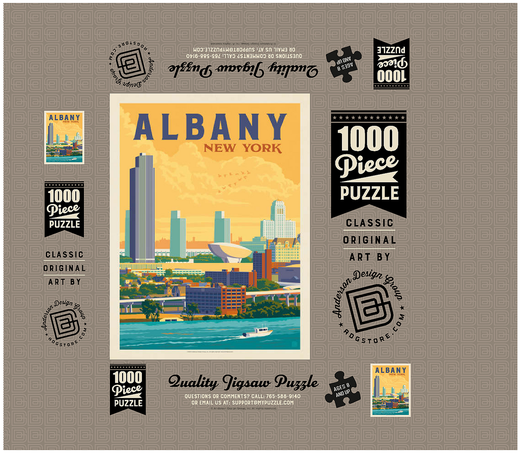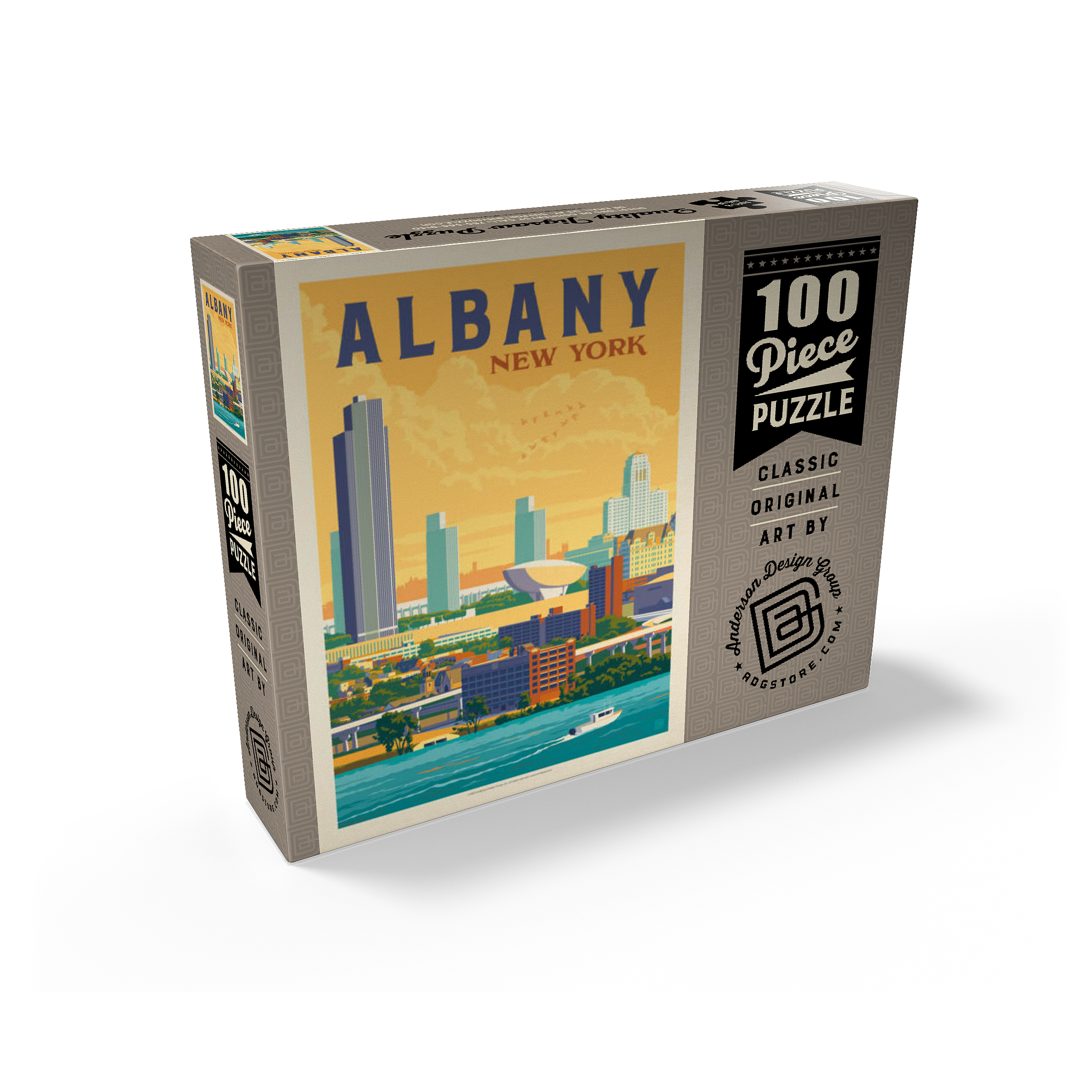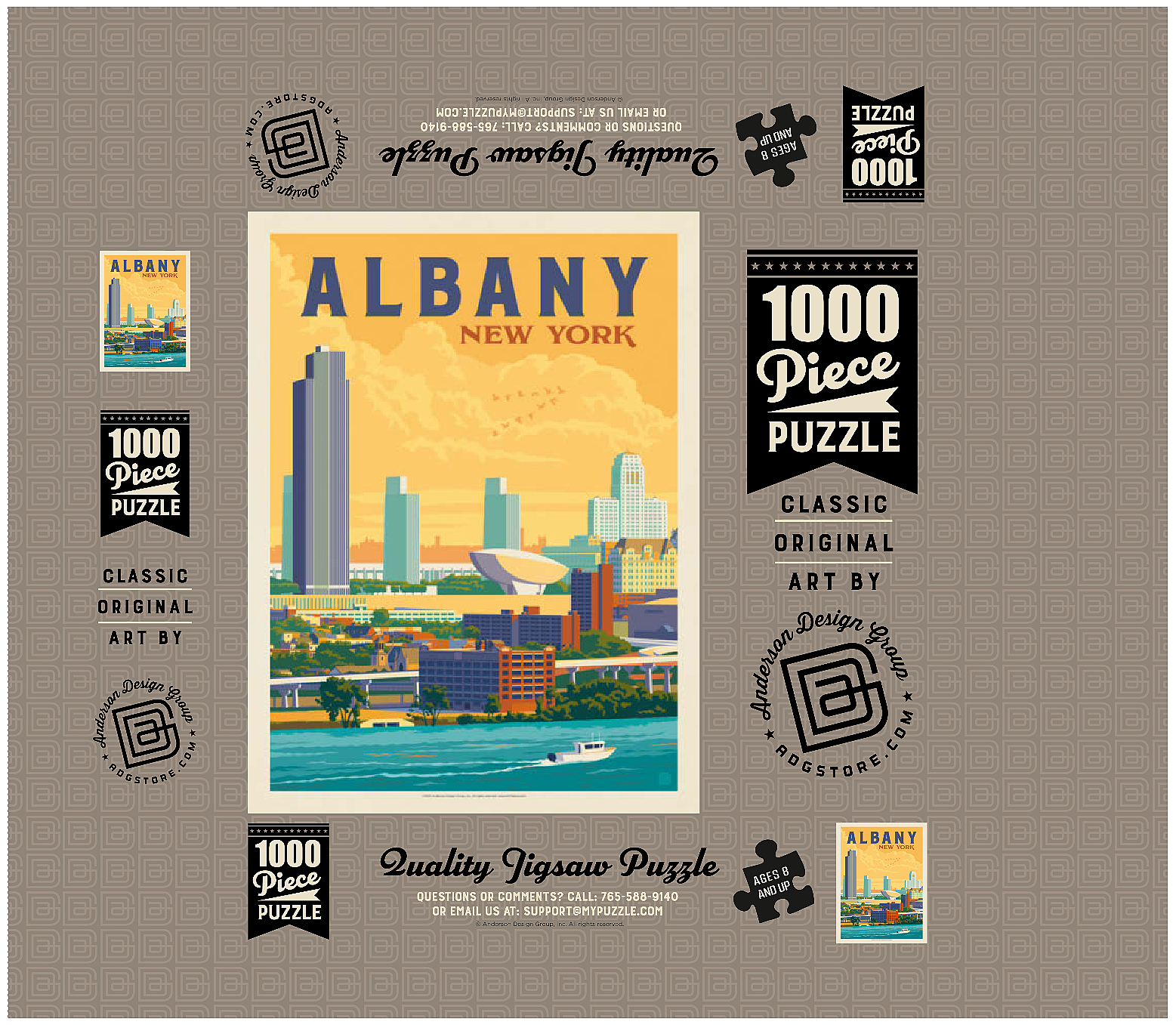 This bold artwork highlights the skyline of Albany, New York, the unique architectural landmark known as The Egg, and a vibrant downtown with historic and modern buildings. Set against a golden sky with birds in flight, the composition captures the city's location along the Hudson River, where a small boat glides across the water. Albany, the capital of New York State, blends government, culture, and history in a dynamic urban setting. The stylized riverfront scene reflects both the civic pride and architectural diversity of this historic Northeastern city.