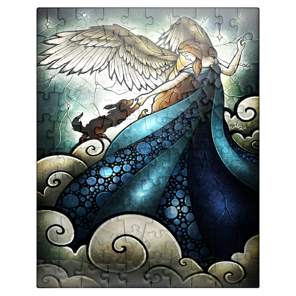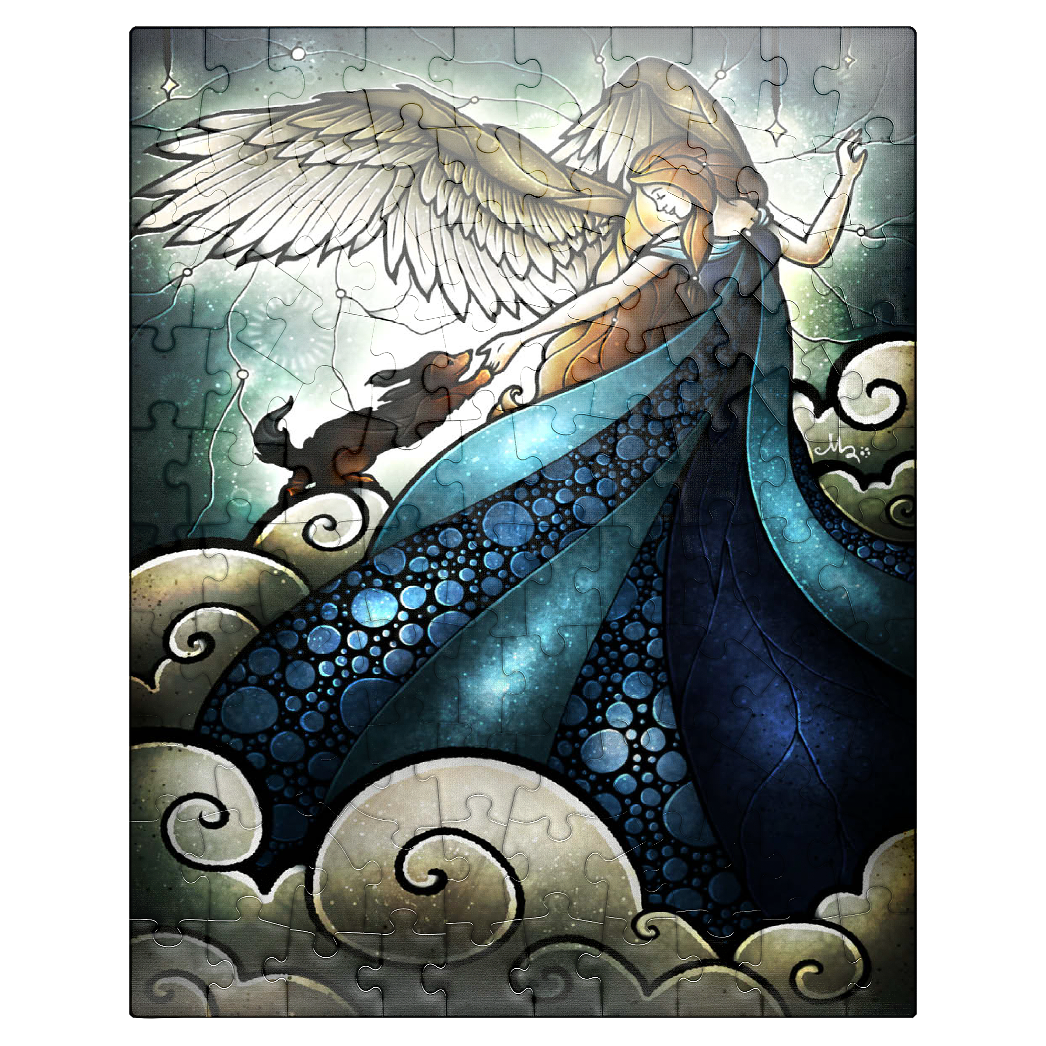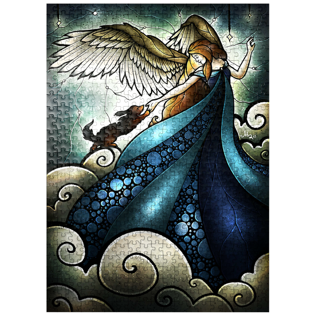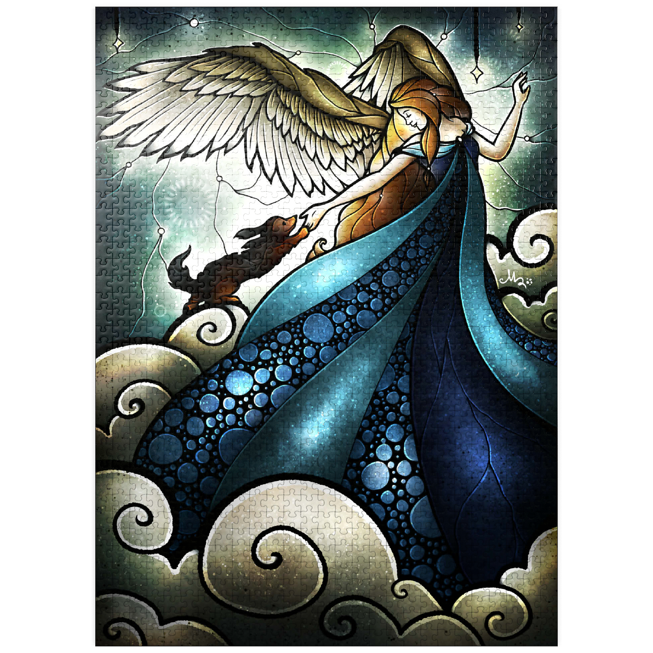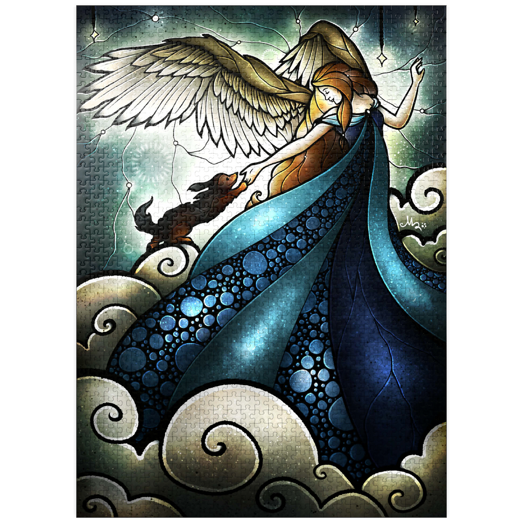 Experience this heartwarming and imaginative artwork, a tender depiction of a beloved dog's arrival in heaven, greeted by a gentle angel. This image beautifully captures the unconditional love and bond between humans and their canine companions, offering a comforting and uplifting vision of their connection transcending earthly boundaries. The overall feeling is one of peace, love, and a joyful reunion.