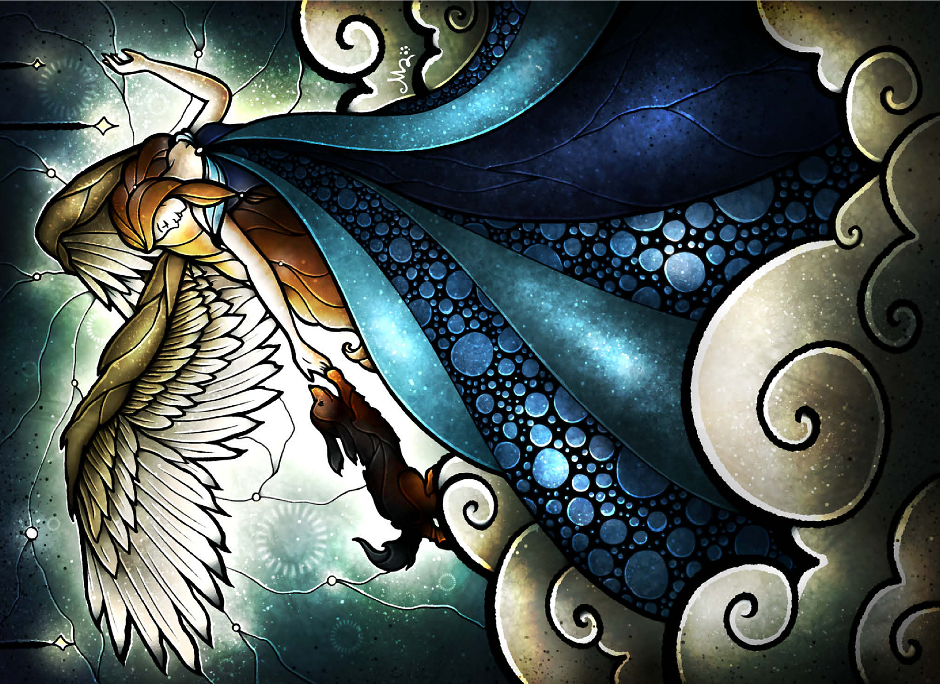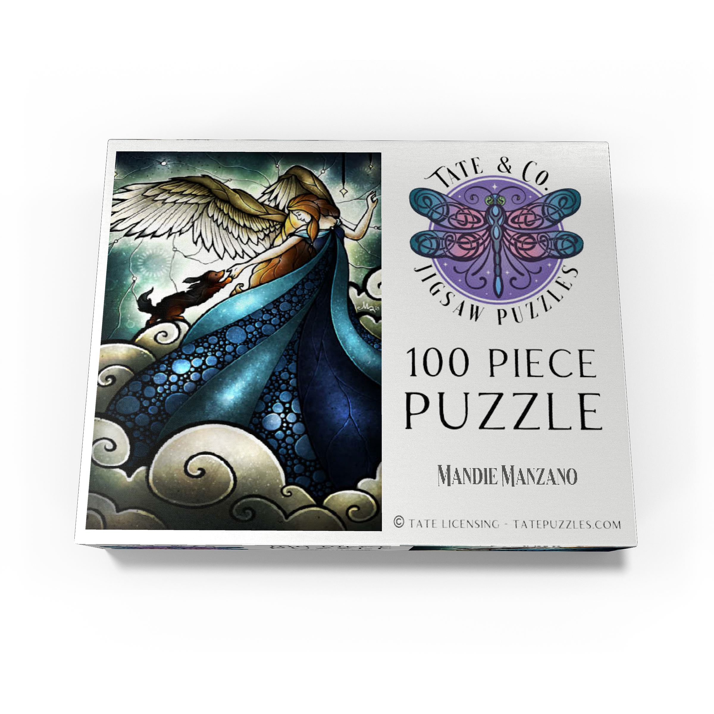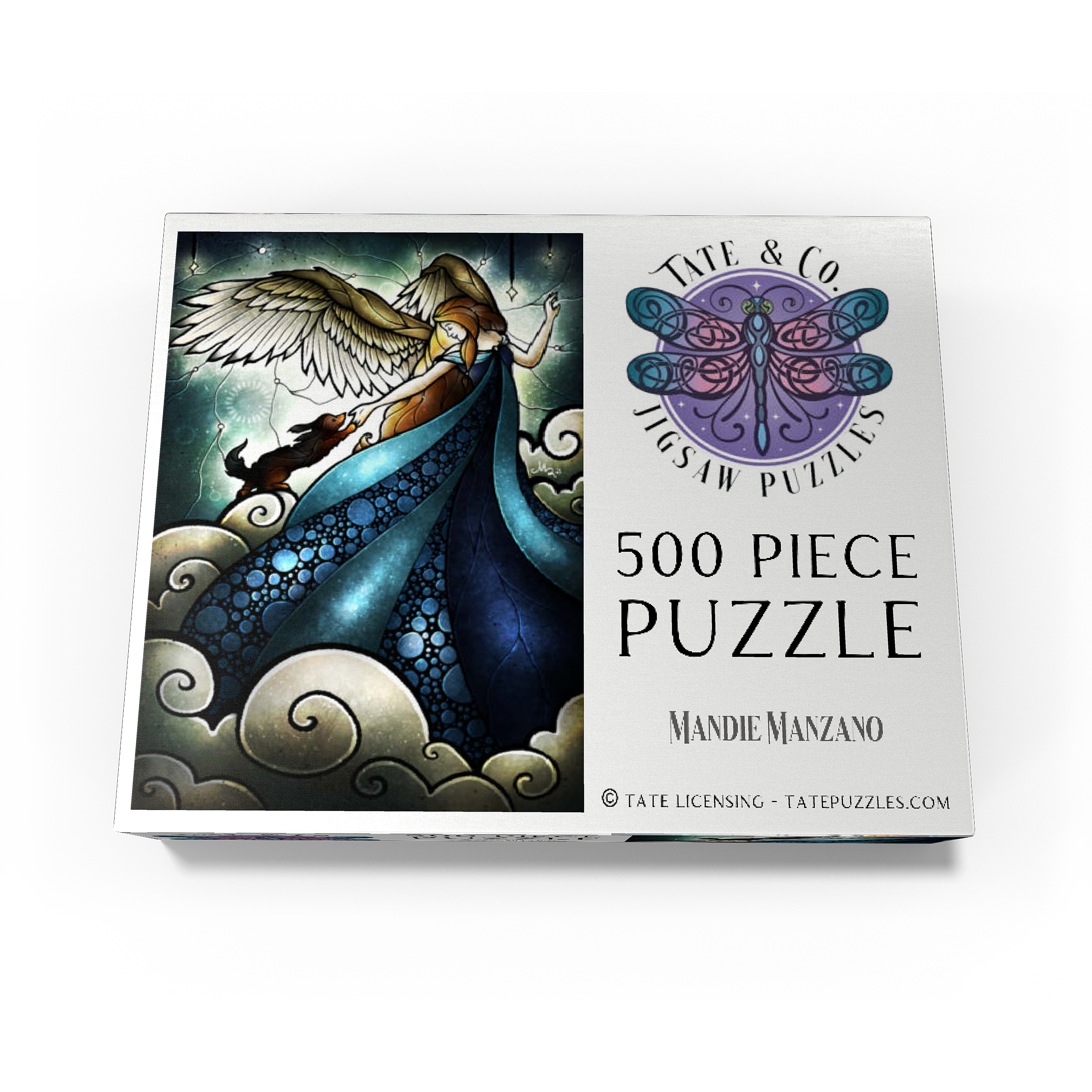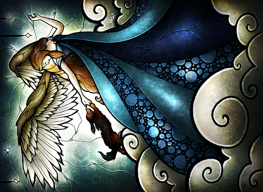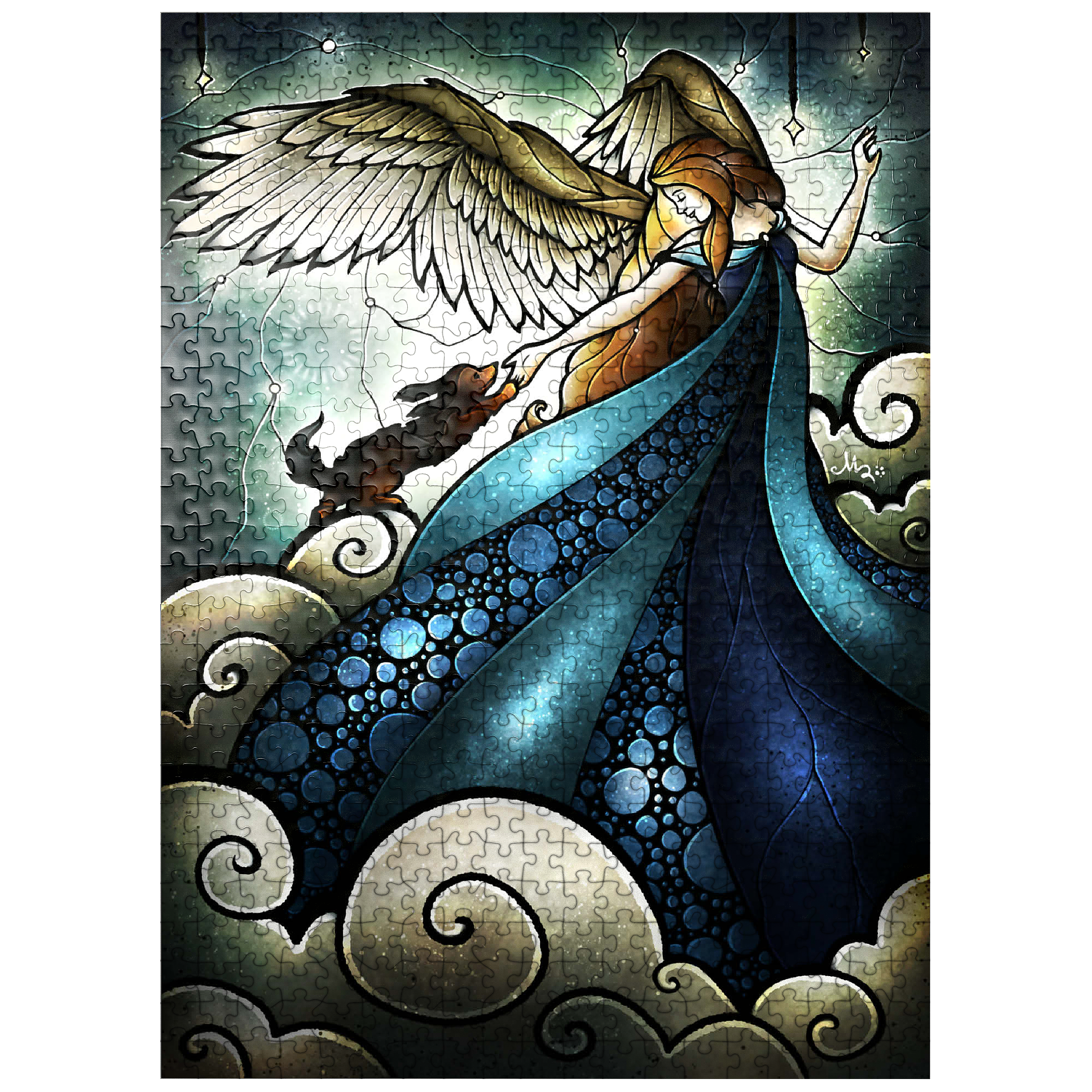 Experience this heartwarming and imaginative artwork, a tender depiction of a beloved dog's arrival in heaven, greeted by a gentle angel. This image beautifully captures the unconditional love and bond between humans and their canine companions, offering a comforting and uplifting vision of their connection transcending earthly boundaries. The overall feeling is one of peace, love, and a joyful reunion.