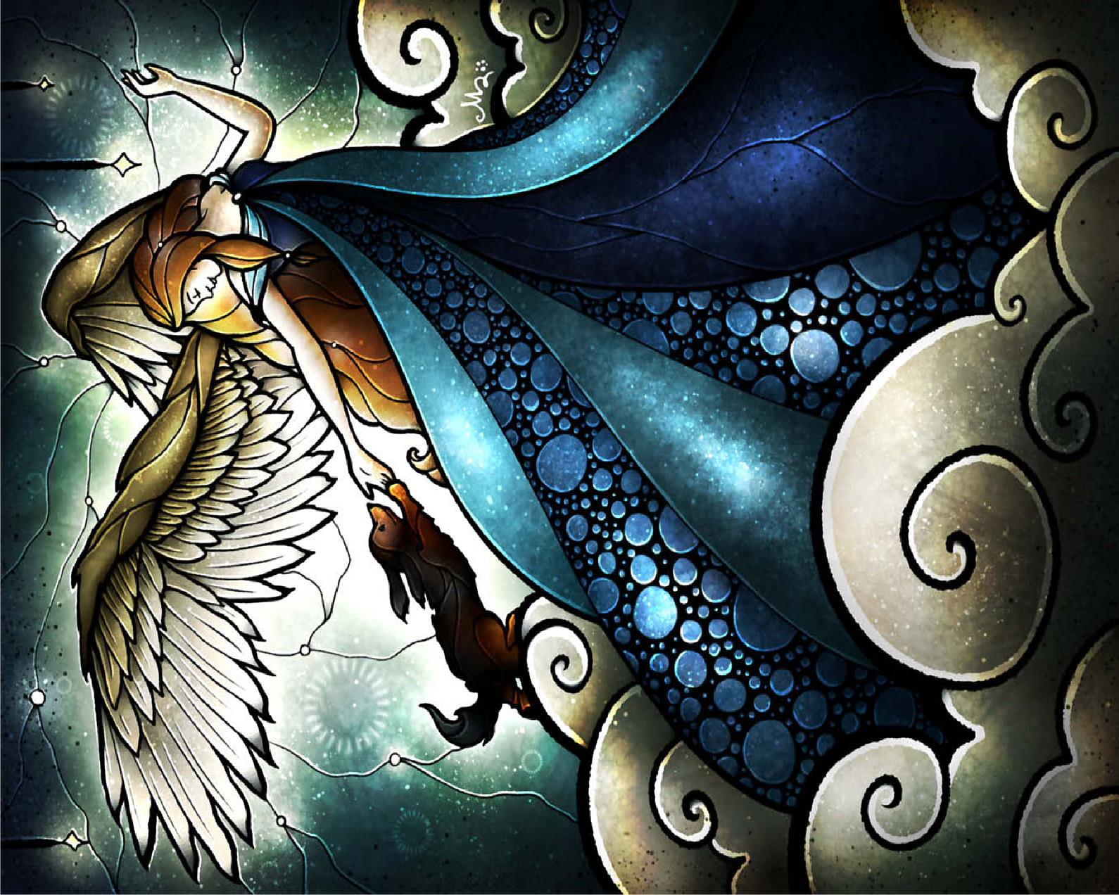 "Like panes of colored glass filtering sunlight, Mandie Manzano’s work seems fit for a Monastery or faraway castle. Gentle maidens and lush environments fill each scene, crafting a story and enchanting the eyes. Manzano builds her compositions with light as her primary medium. Rays break through, colors gradate, and warmth permeates throughout. Each is a luminous patchwork of vibrant blocks, connected by bold tendrils and patterned stripes. Capturing an ineffable beauty, Manzano’s work reminds us that our full brilliance is revealed only when our own light from within shines through."