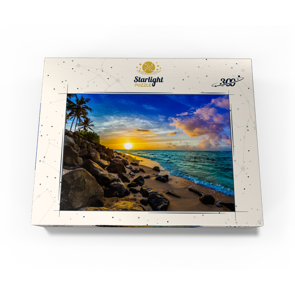 The image depicts a beautiful Hawaiian sunset on the north coast of Oahu. The sky is ablaze with vibrant hues of orange, pink, and red, as the sun sinks below the horizon. In the foreground, the waves of the ocean are calm and gentle, lapping against the sandy shore. The water is a deep blue color, with hints of green and turquoise. The scenery is framed by lush green foliage and palm trees, which sway gently in the breeze. Overall, the image captures the breathtaking beauty of a sunset in Hawaii, with its stunning colors and peaceful atmosphere.