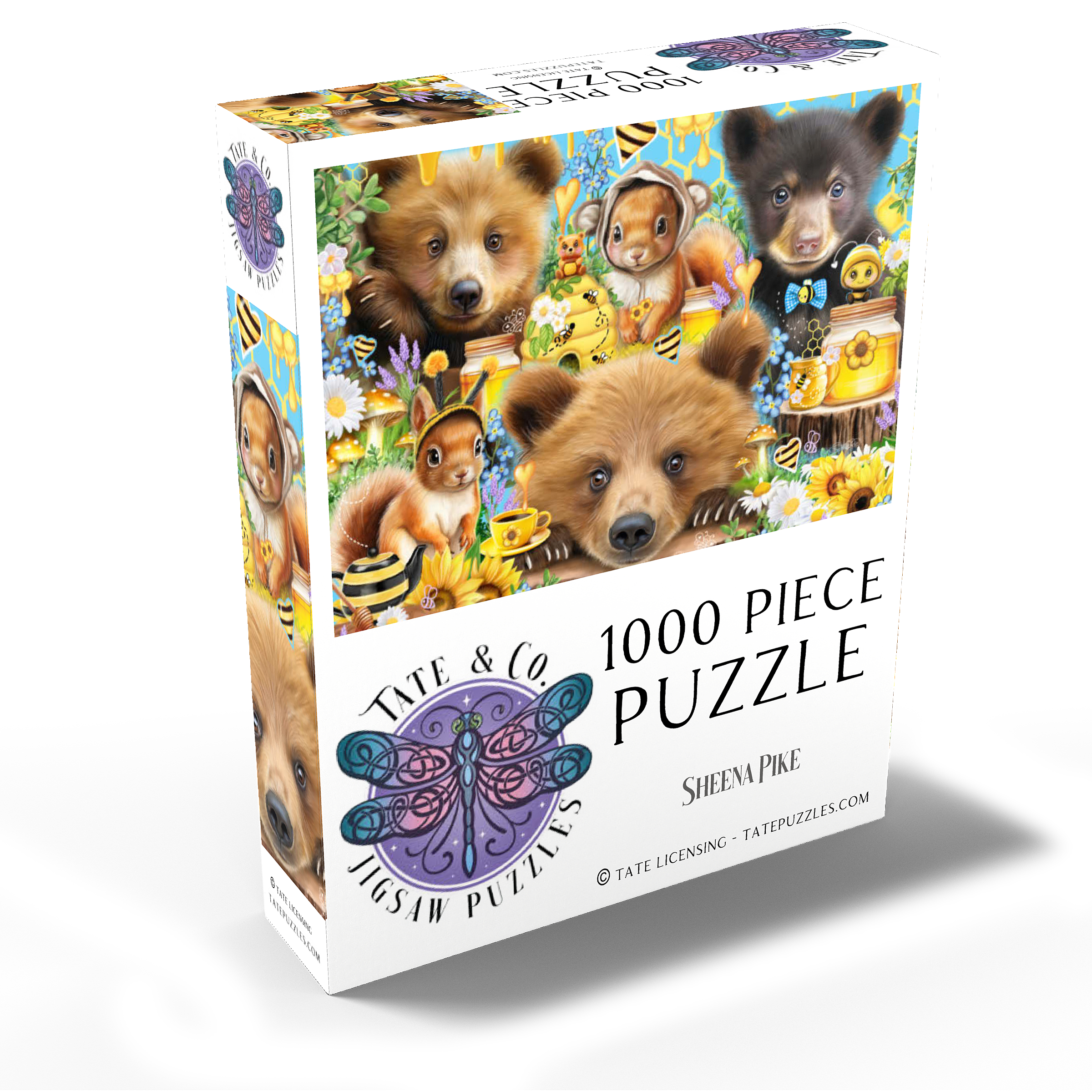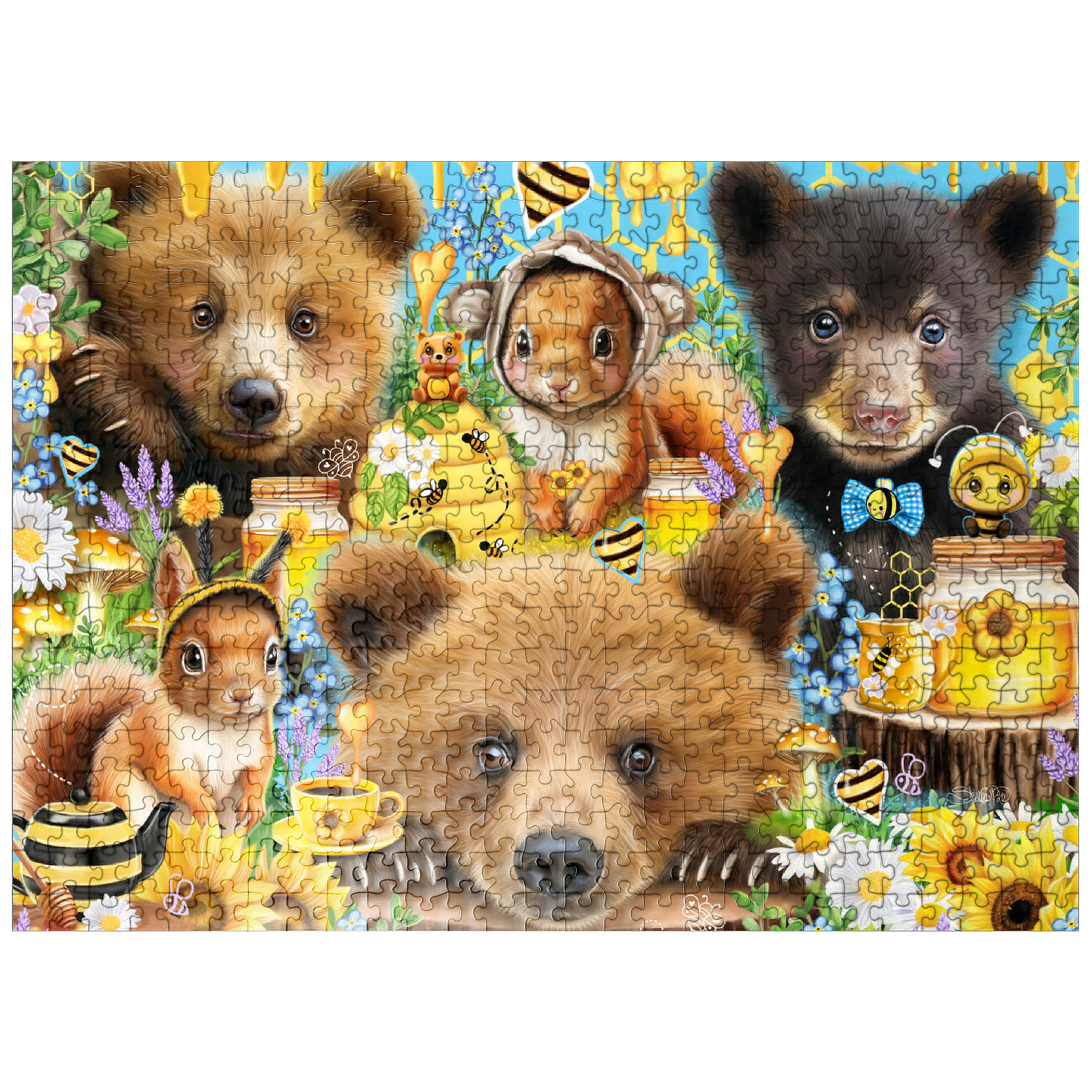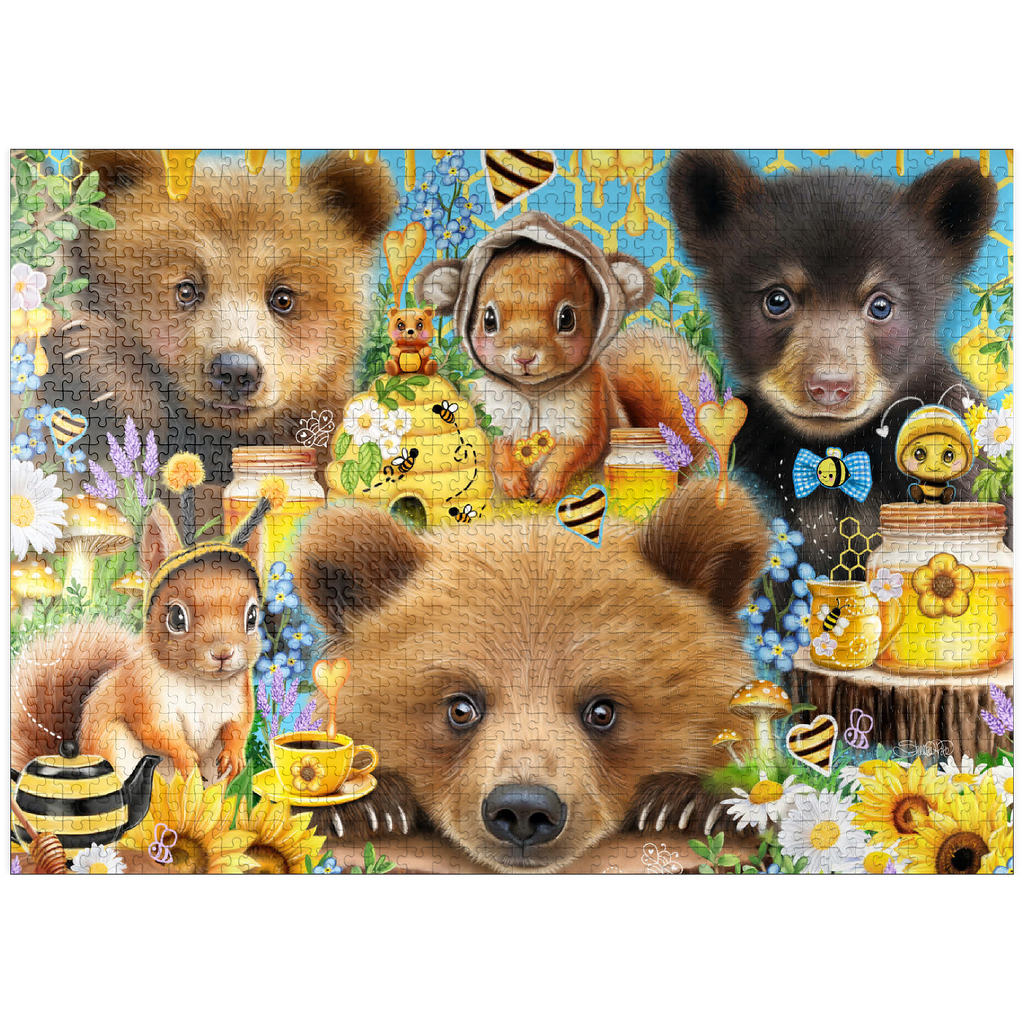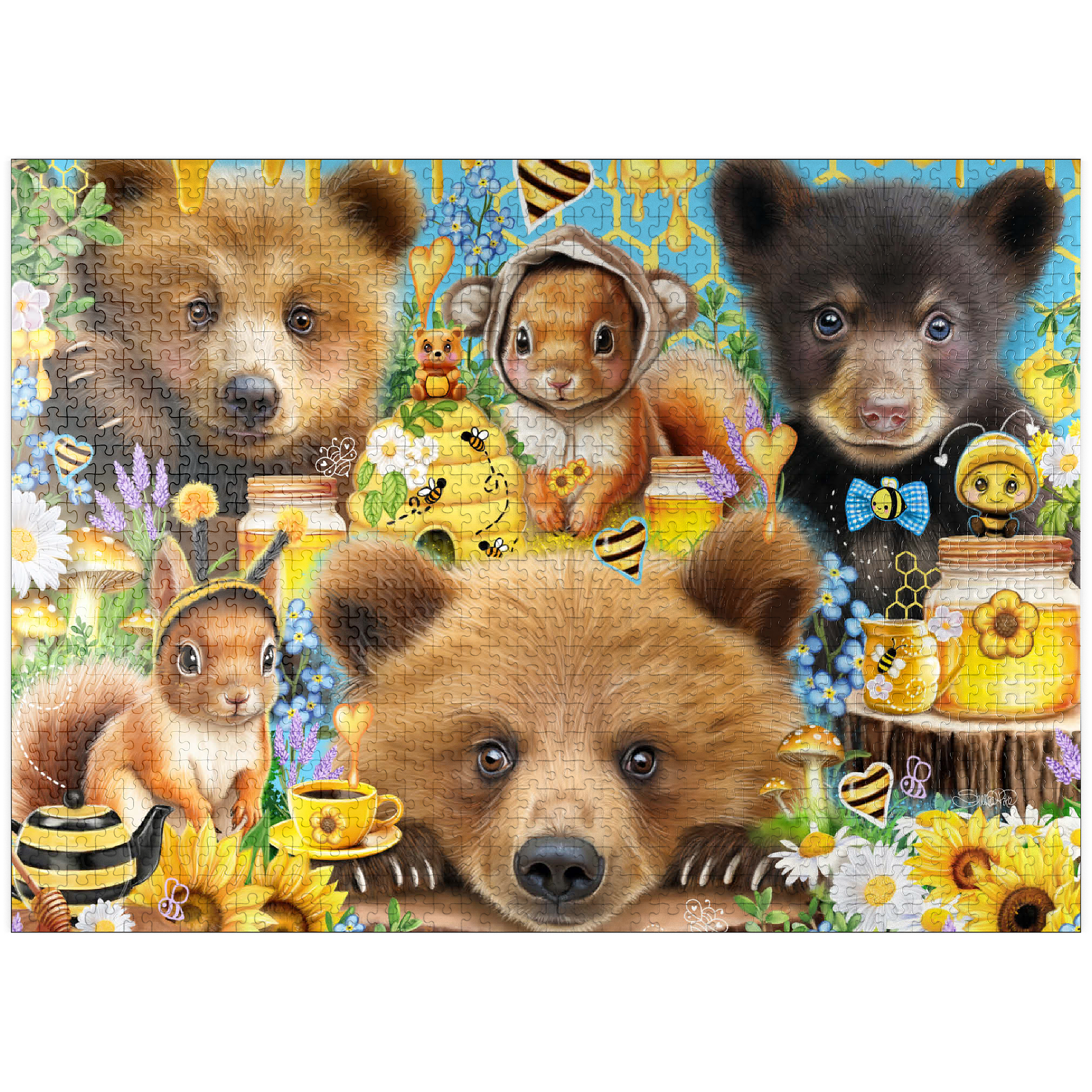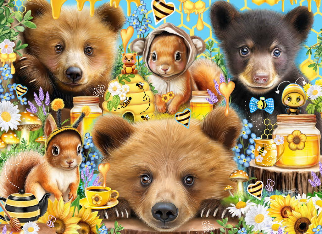 A vibrantly detailed illustration by Sheena Pike, depicting a whimsical honey-themed scene. The artwork features a group of endearing baby bears reveling in a summery tableau, harmoniously integrated with motifs of bees, honeycombs, and a charming squirrel companion. Combining illustrative techniques with adorable character designs, this piece is ideally suited for a captivating puzzle experience.