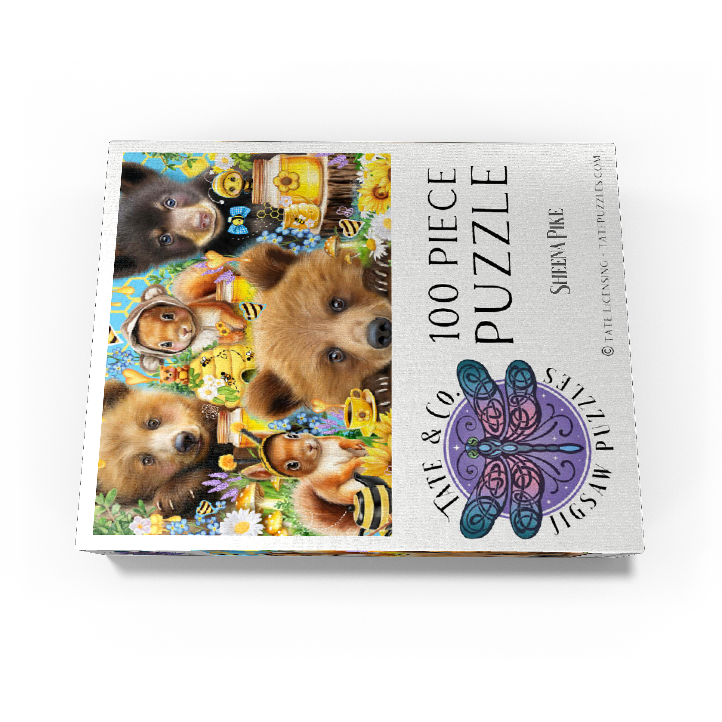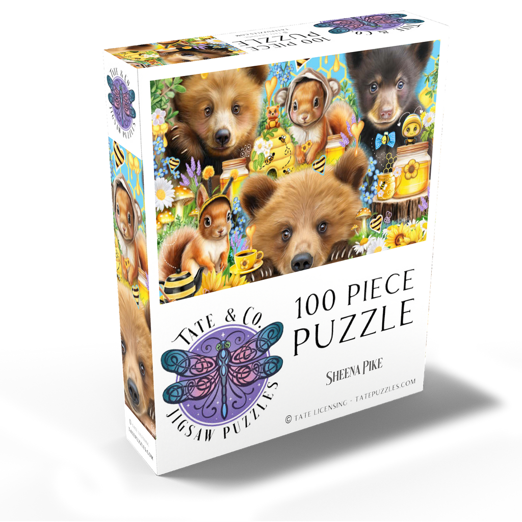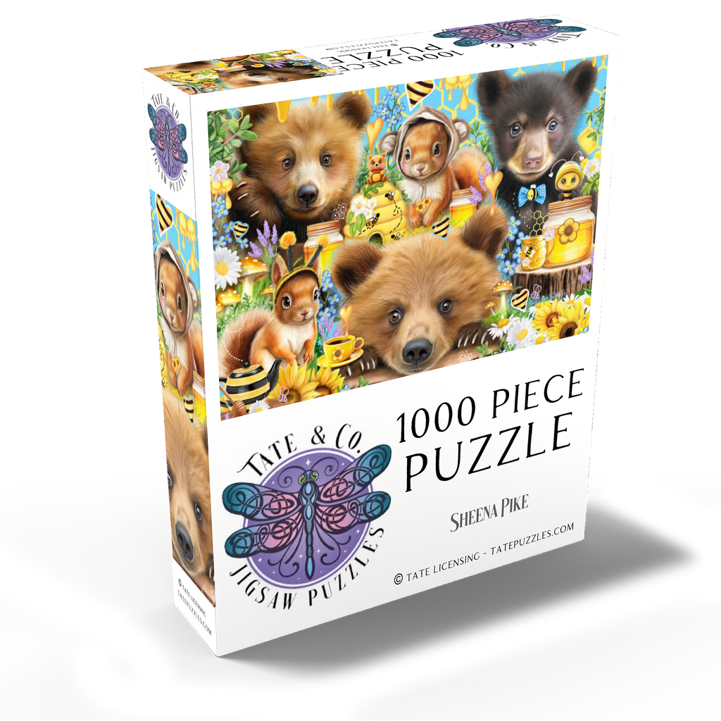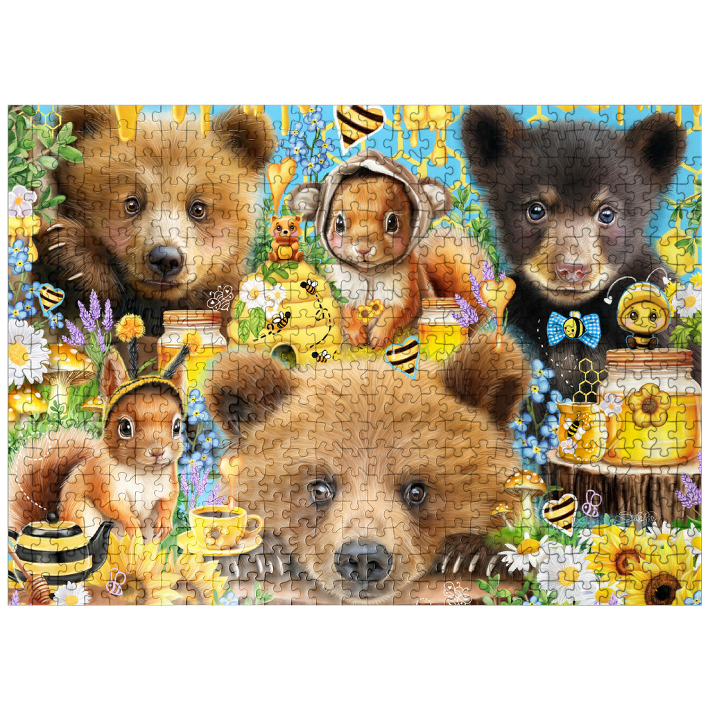 A vibrantly detailed illustration by Sheena Pike, depicting a whimsical honey-themed scene. The artwork features a group of endearing baby bears reveling in a summery tableau, harmoniously integrated with motifs of bees, honeycombs, and a charming squirrel companion. Combining illustrative techniques with adorable character designs, this piece is ideally suited for a captivating puzzle experience.