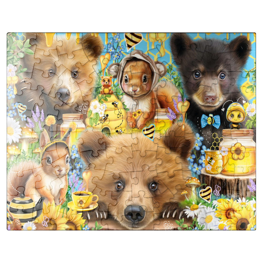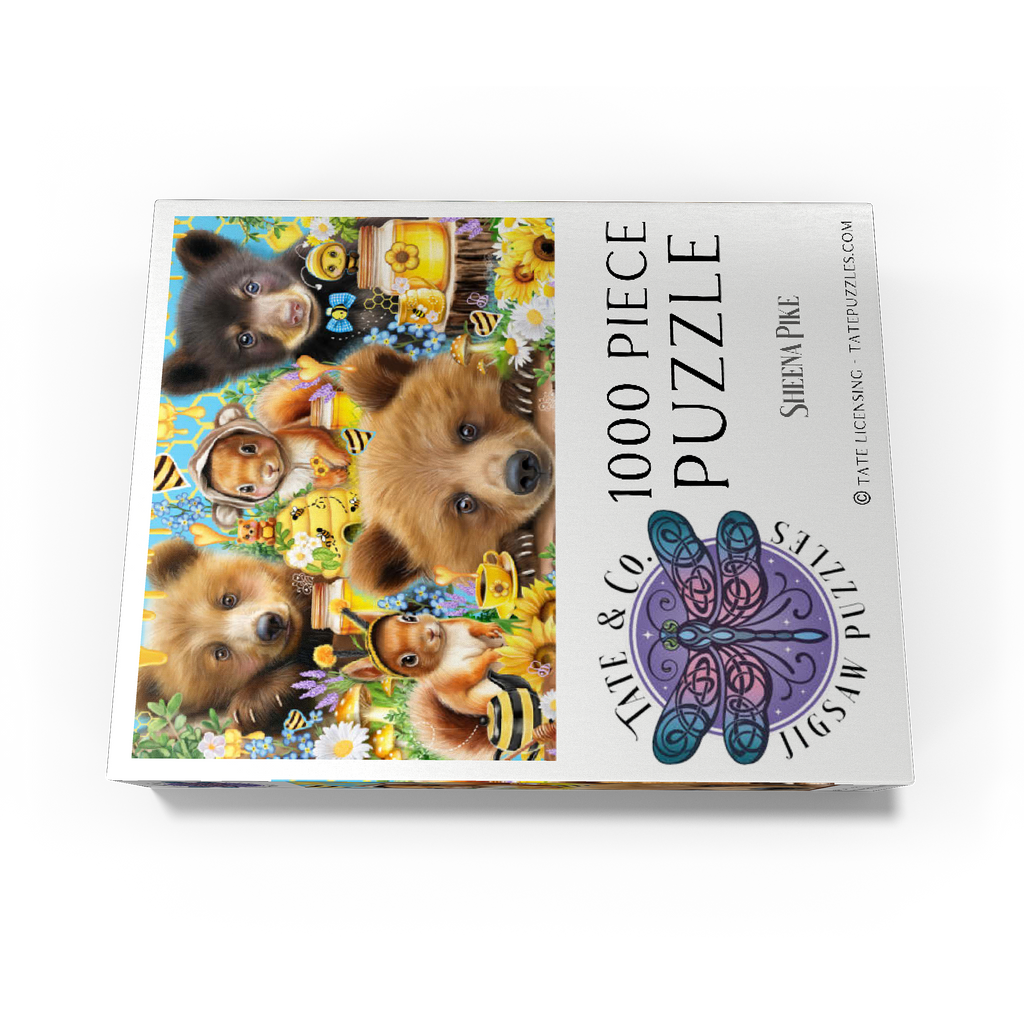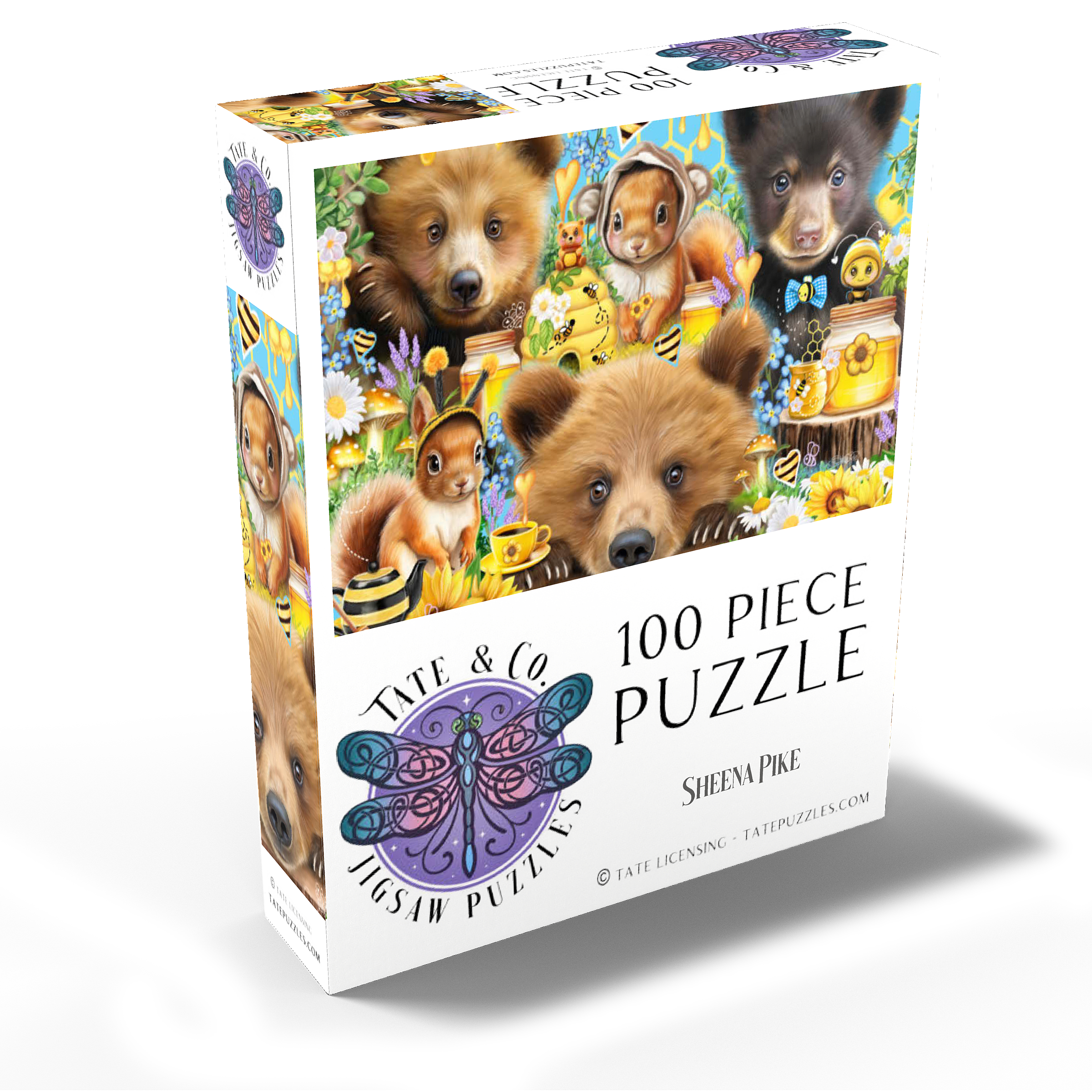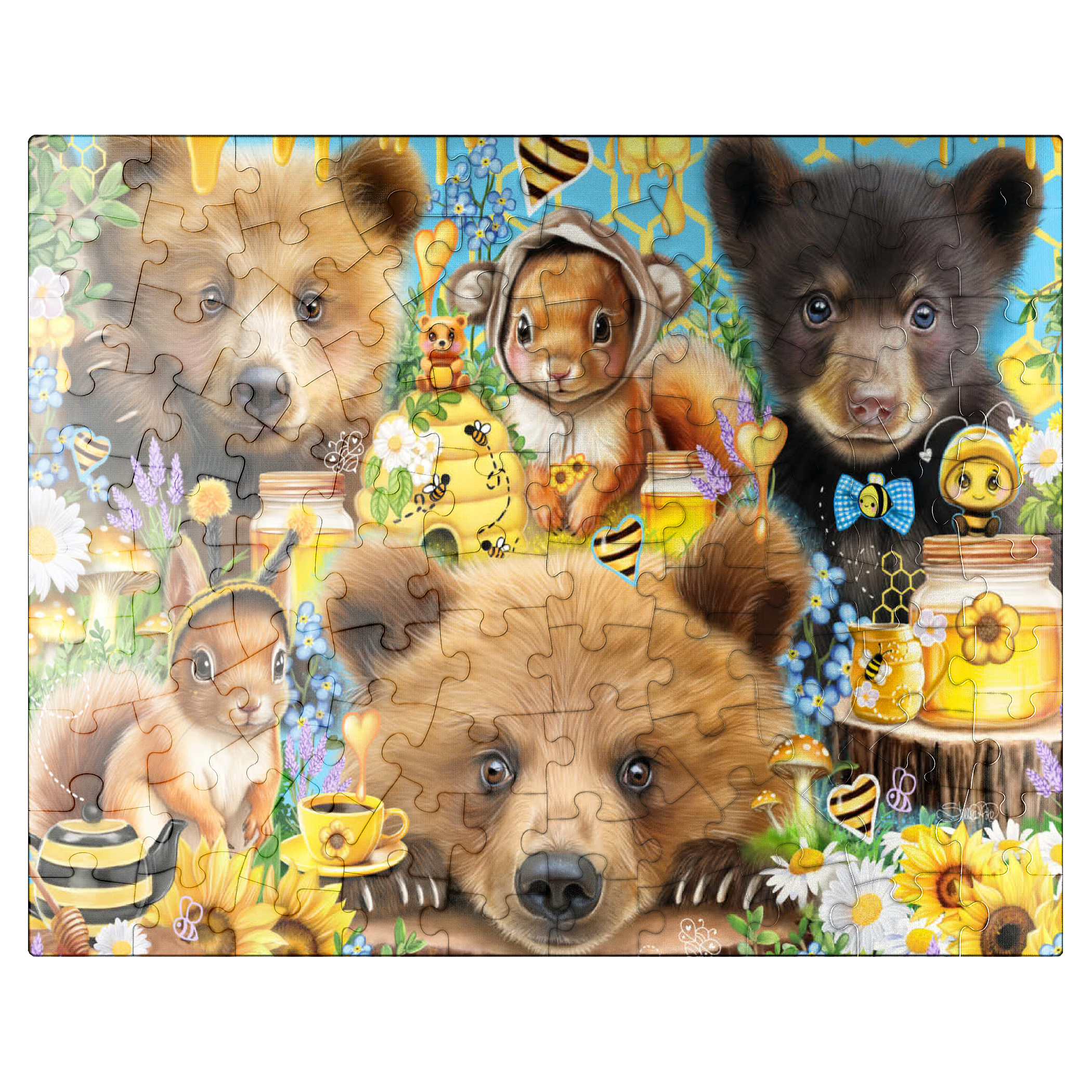 A vibrantly detailed illustration by Sheena Pike, depicting a whimsical honey-themed scene. The artwork features a group of endearing baby bears reveling in a summery tableau, harmoniously integrated with motifs of bees, honeycombs, and a charming squirrel companion. Combining illustrative techniques with adorable character designs, this piece is ideally suited for a captivating puzzle experience.