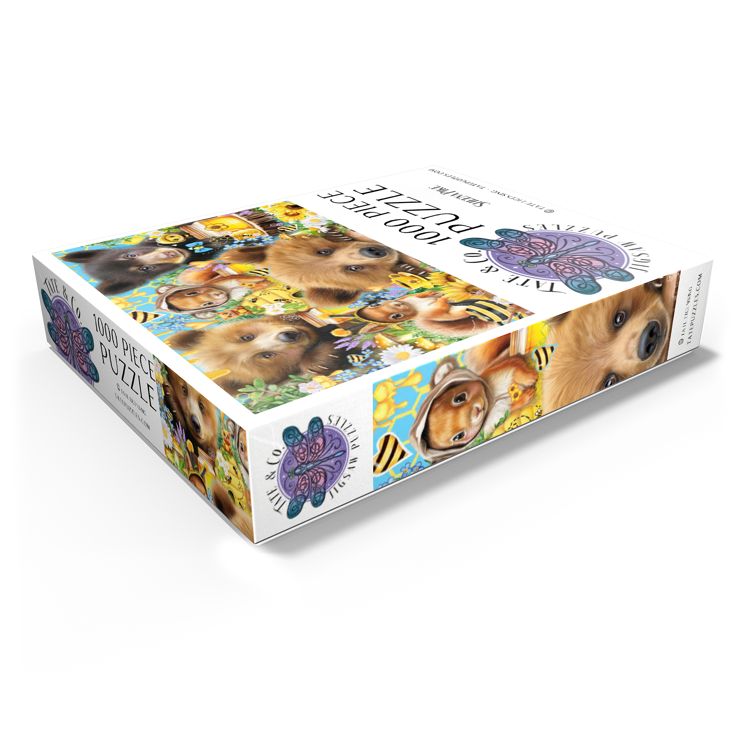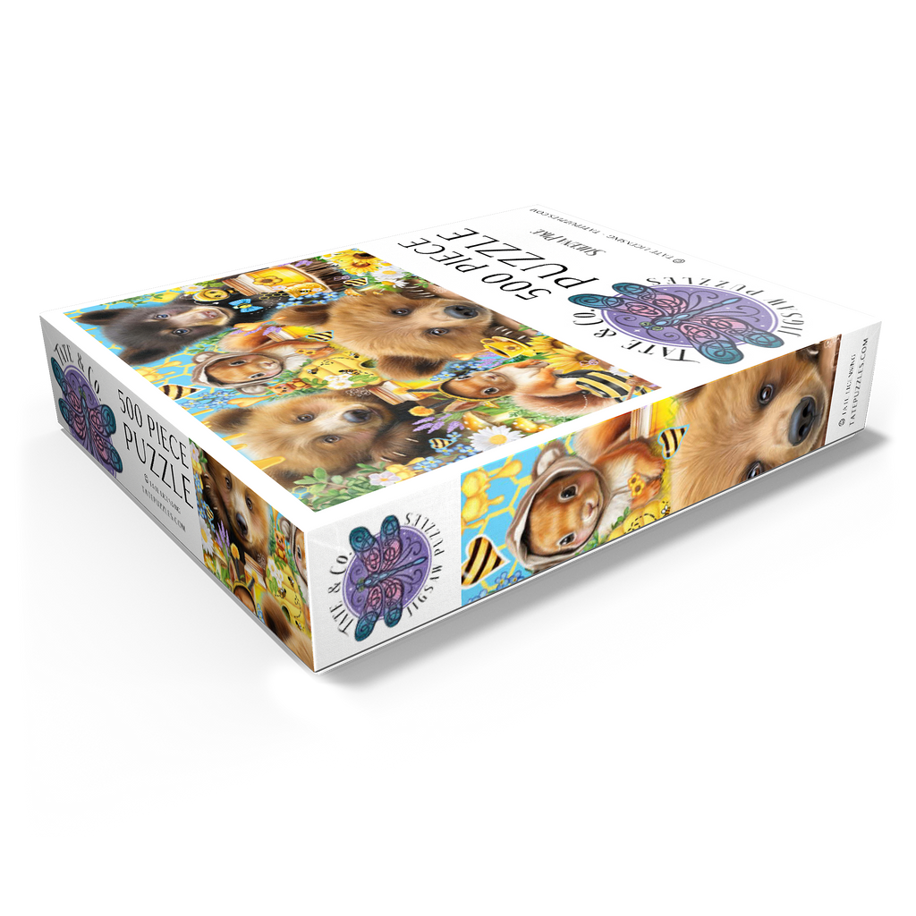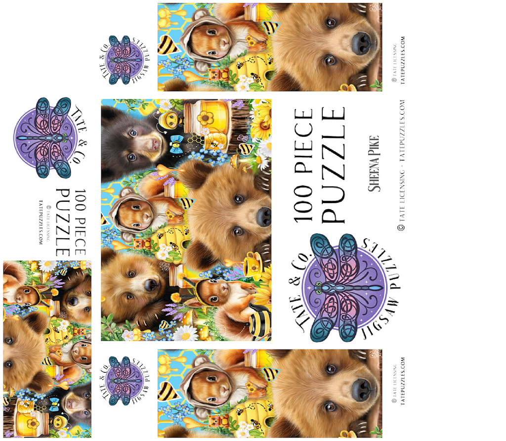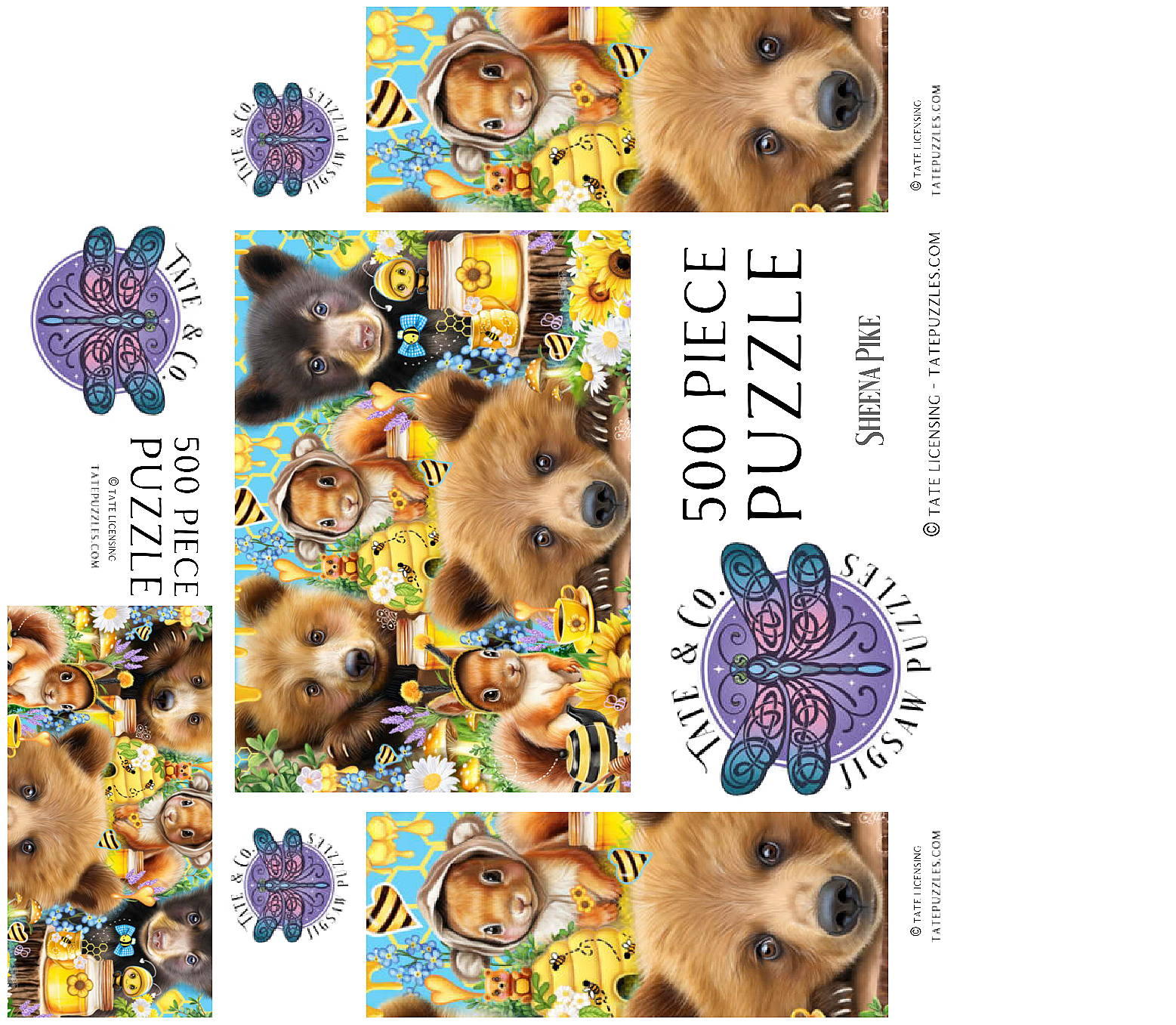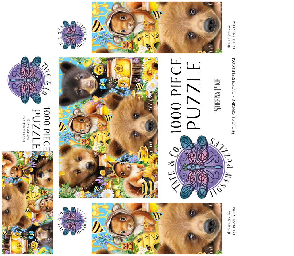 A vibrantly detailed illustration by Sheena Pike, depicting a whimsical honey-themed scene. The artwork features a group of endearing baby bears reveling in a summery tableau, harmoniously integrated with motifs of bees, honeycombs, and a charming squirrel companion. Combining illustrative techniques with adorable character designs, this piece is ideally suited for a captivating puzzle experience.