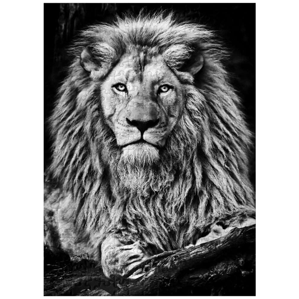 The puzzle features a stunning black and white image of a majestic lion as a portrait, with the lion's strong, powerful features rendered in shades of grey against a striking black background.